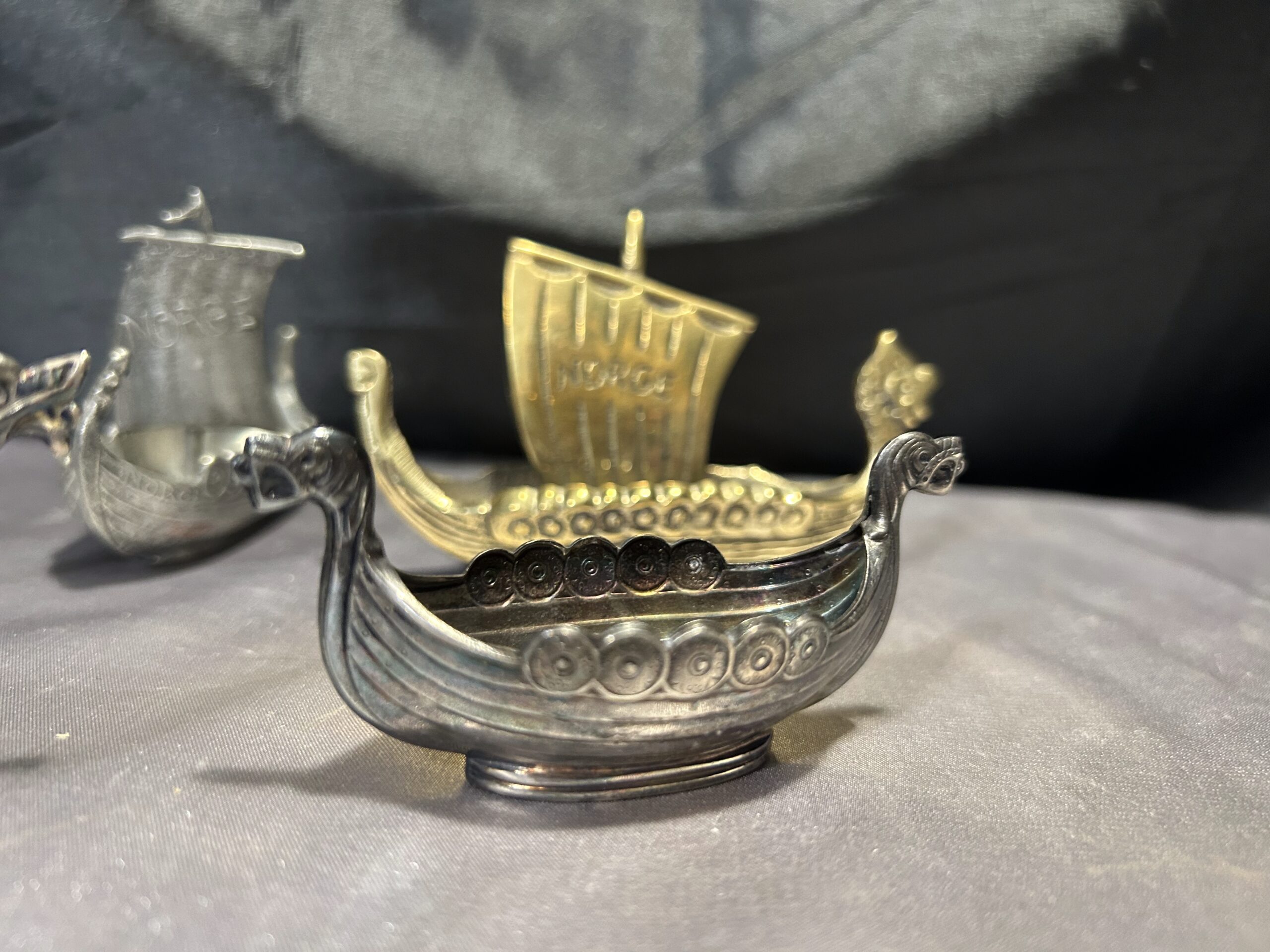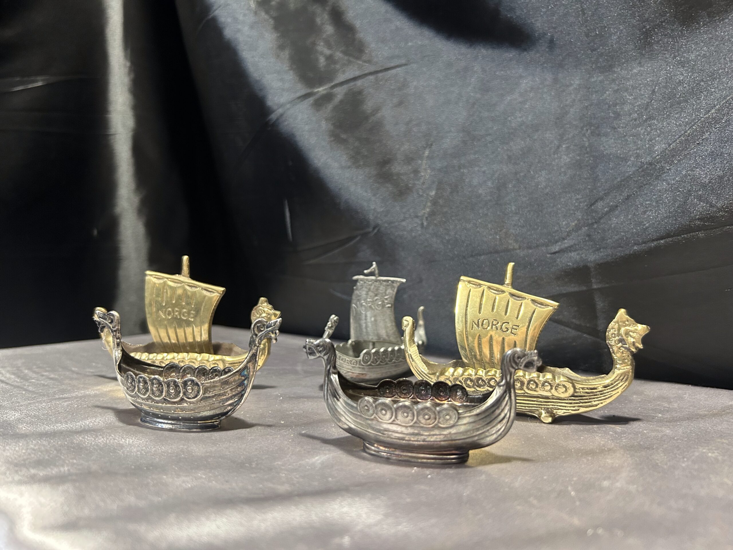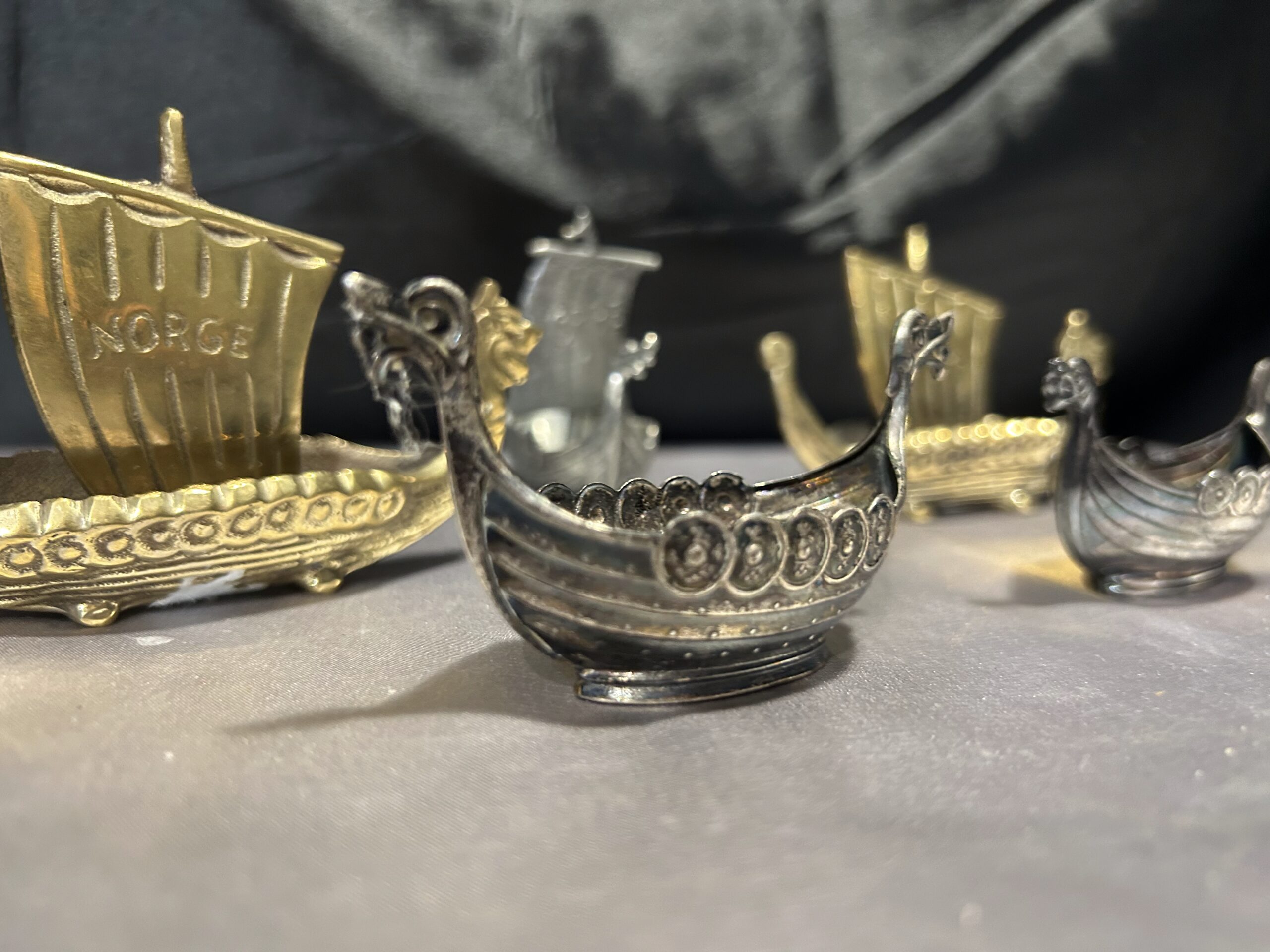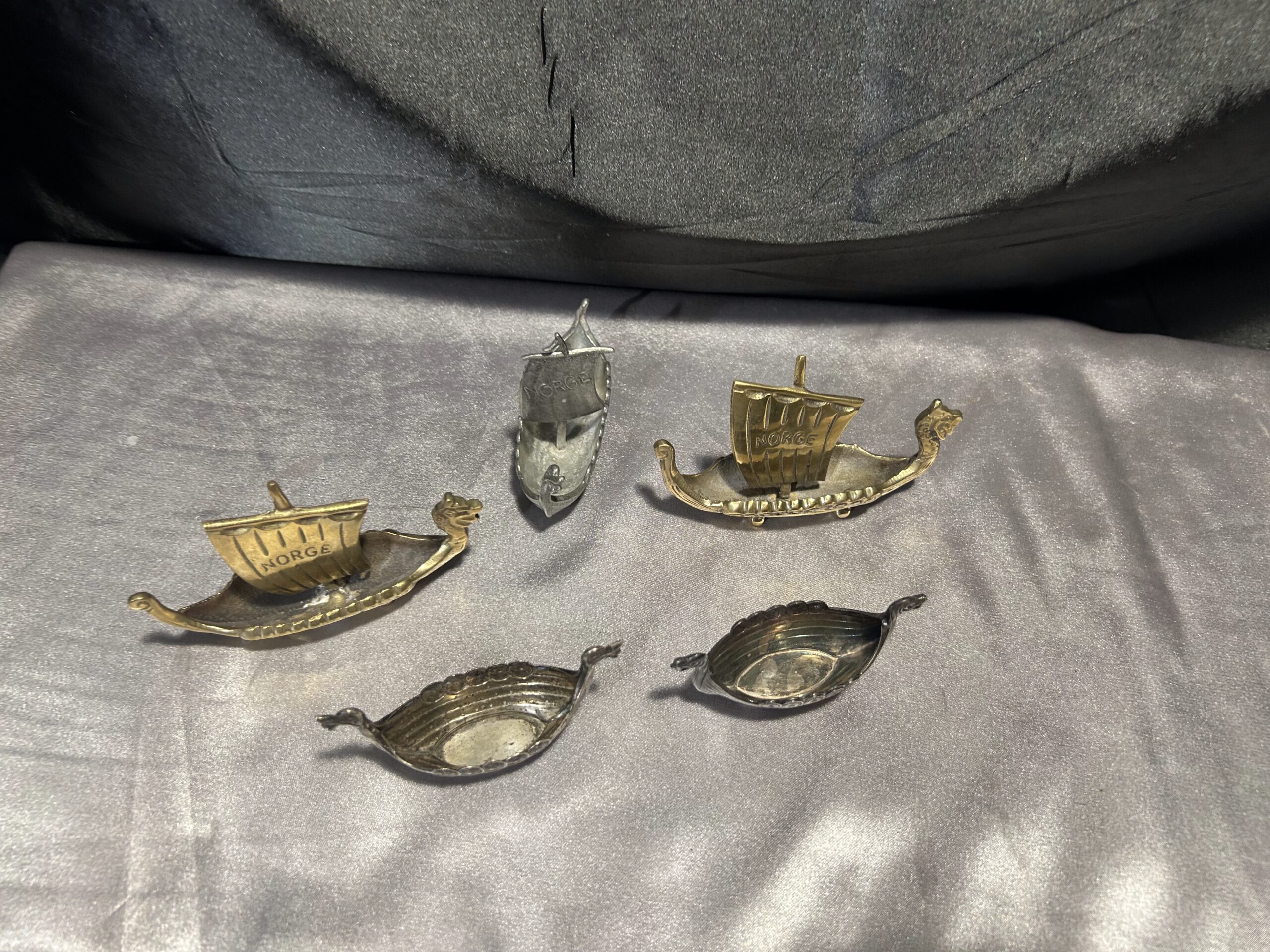 Zestaw 5 statków wikingów – mosiądz i cyna, z napisem NORGE
