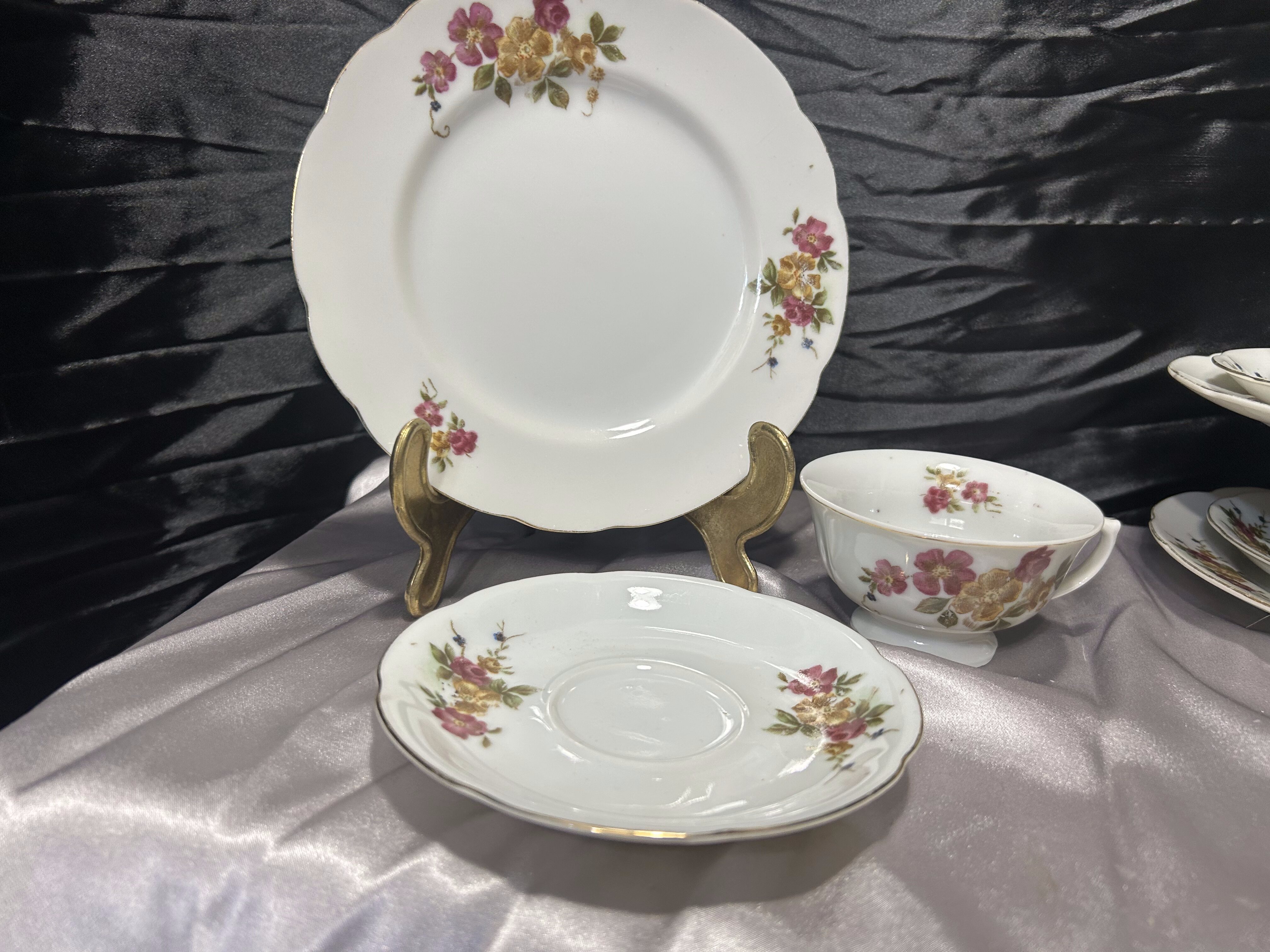 Elegancki zestaw sześciu filiżanek typu Trio, składający się z filiżanki, podstawki oraz talerzyka deserowego. Porcelana sygnowana KETO, utrzymana w subtelnej, klasycznej stylistyce z delikatnym motywem kwiatowym. Zestaw prezentuje się bardzo estetycznie i spójnie, idealny zarówno do codziennego użytku, jak i jako dekoracyjny komplet na stół.