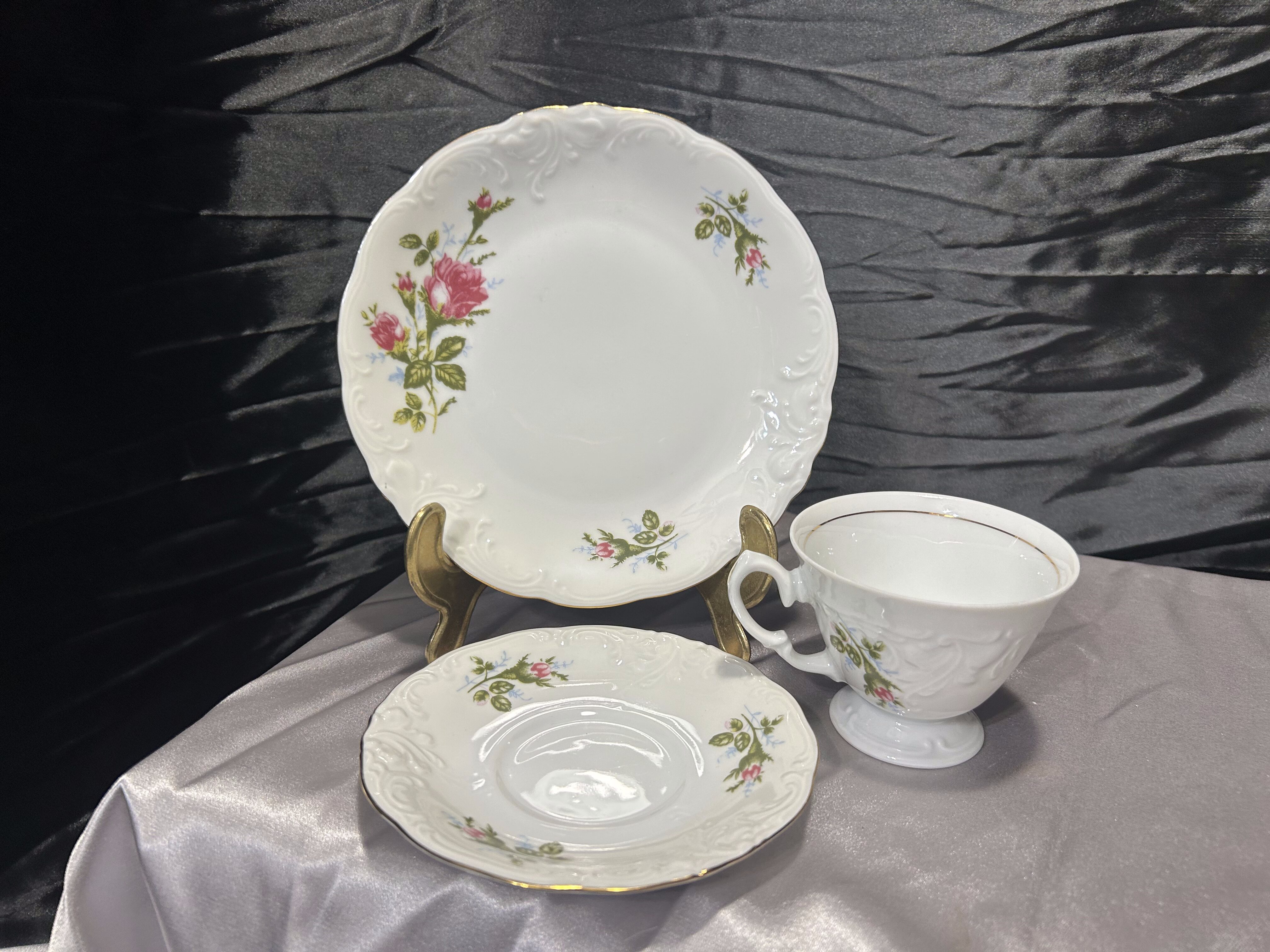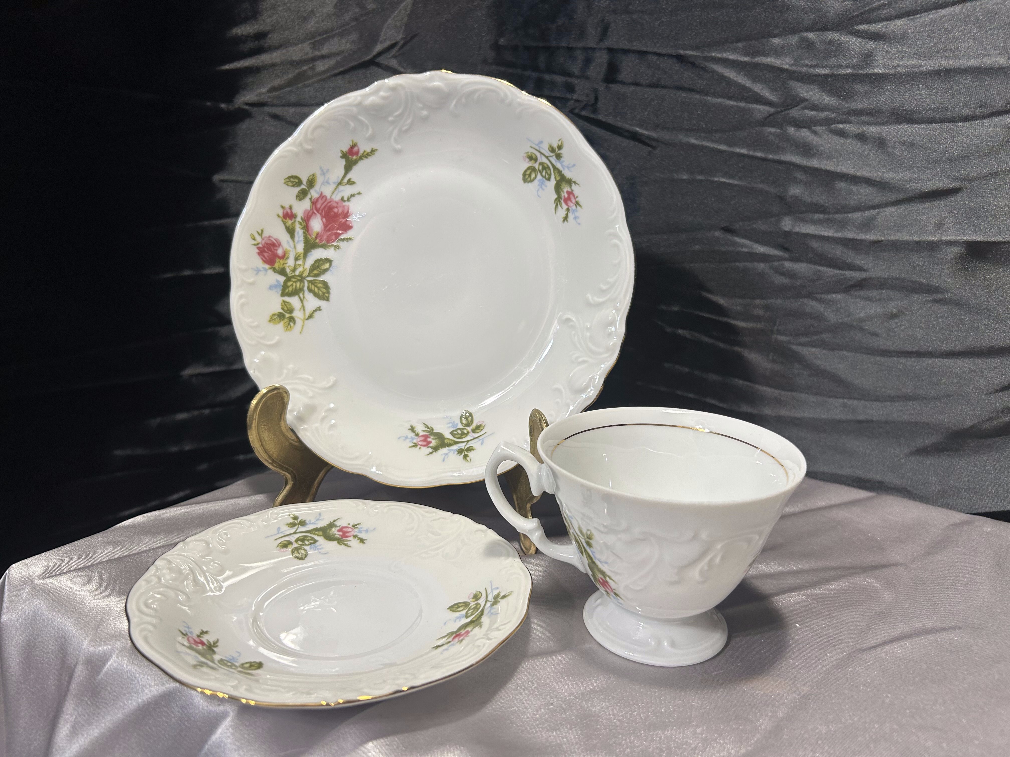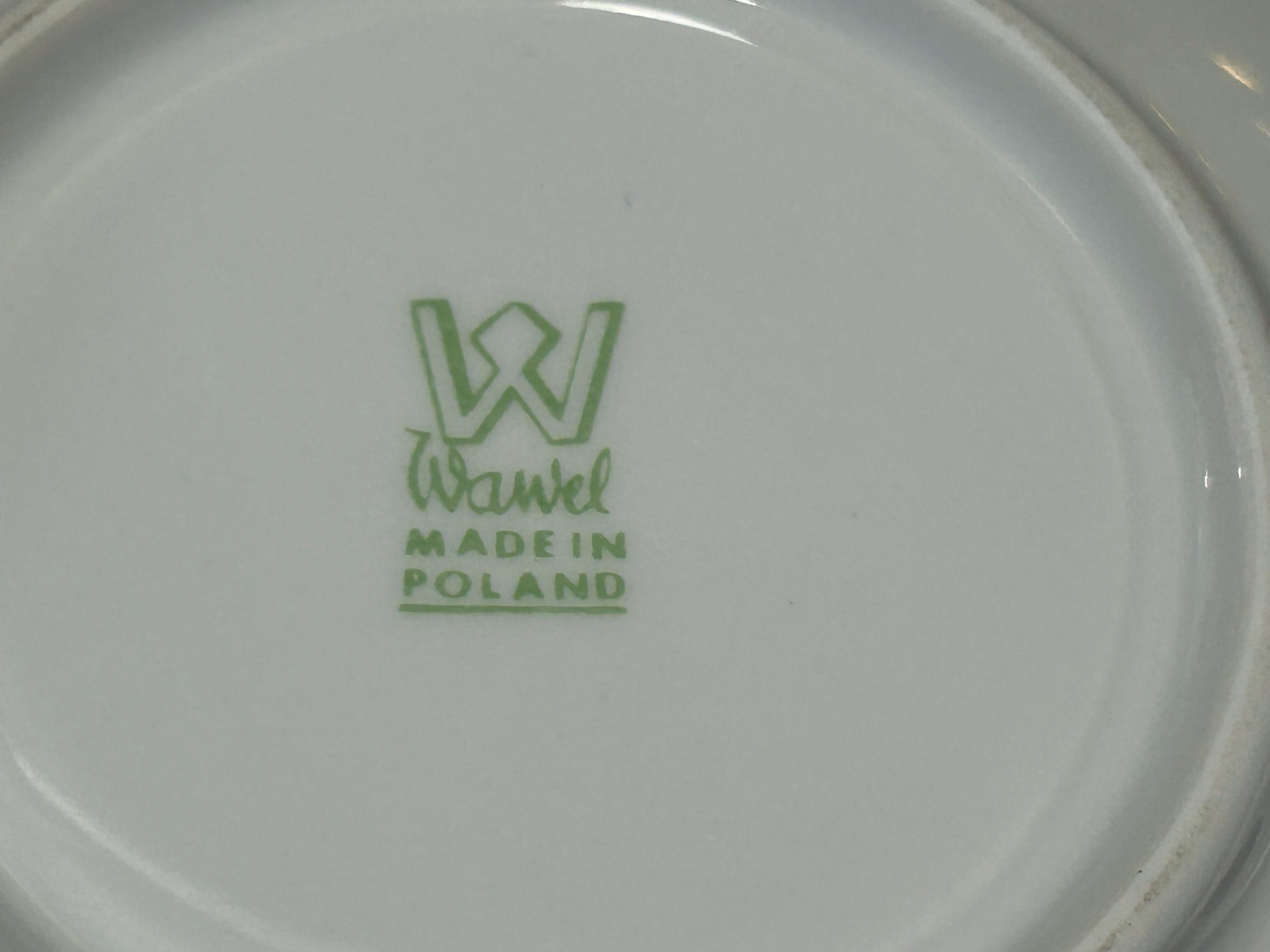 Kompletny zestaw sześciu filiżanek typu TRIO z renomowanej Fabryki Porcelany Wawel w Krakowie. Porcelana o eleganckiej, reliefowanej formie, zdobiona subtelnym motywem kwiatowym oraz delikatnym złoceniem na krawędziach. Klasyczne wzornictwo charakterystyczne dla polskiej porcelany użytkowej z drugiej połowy XX wieku.