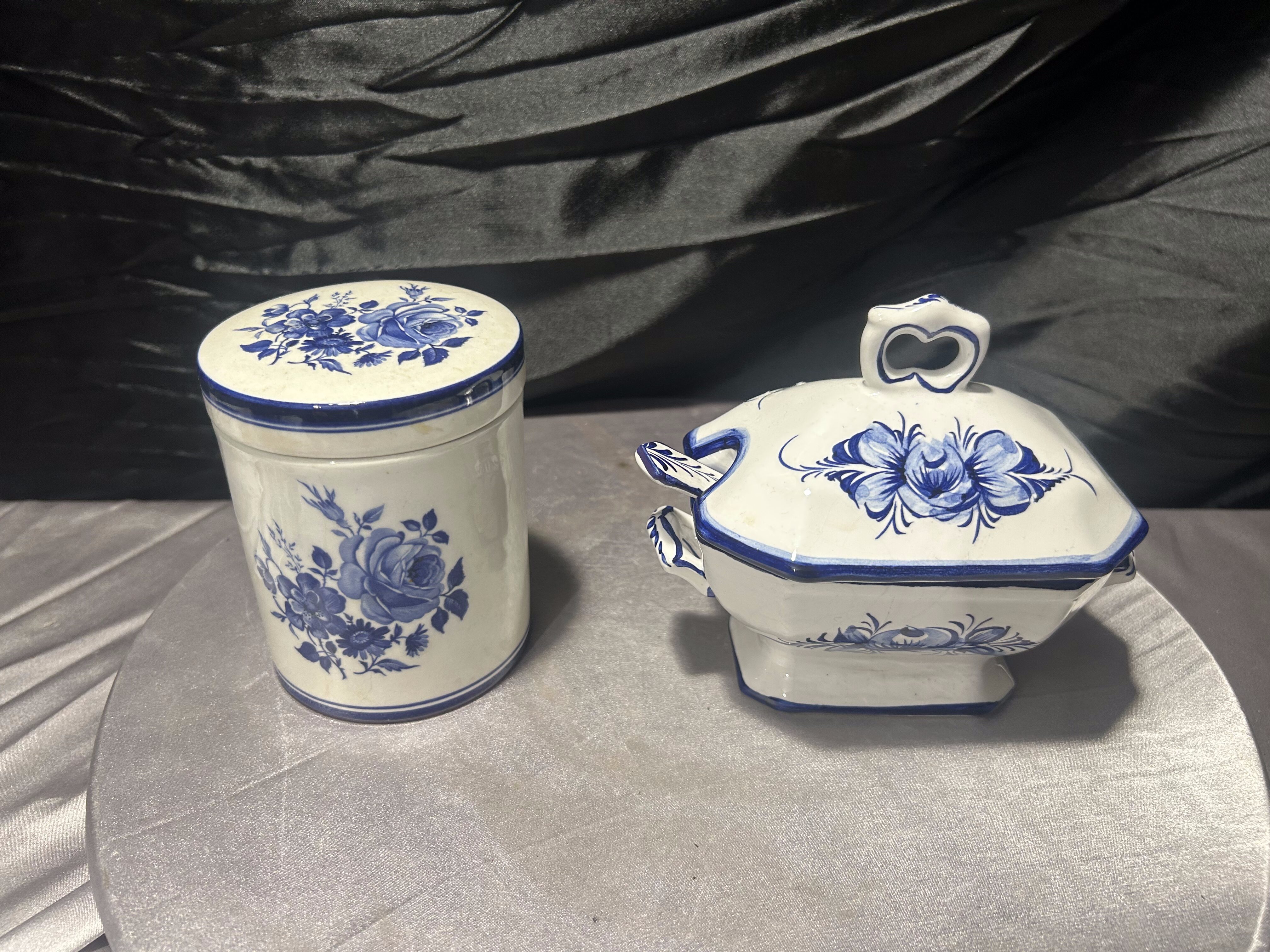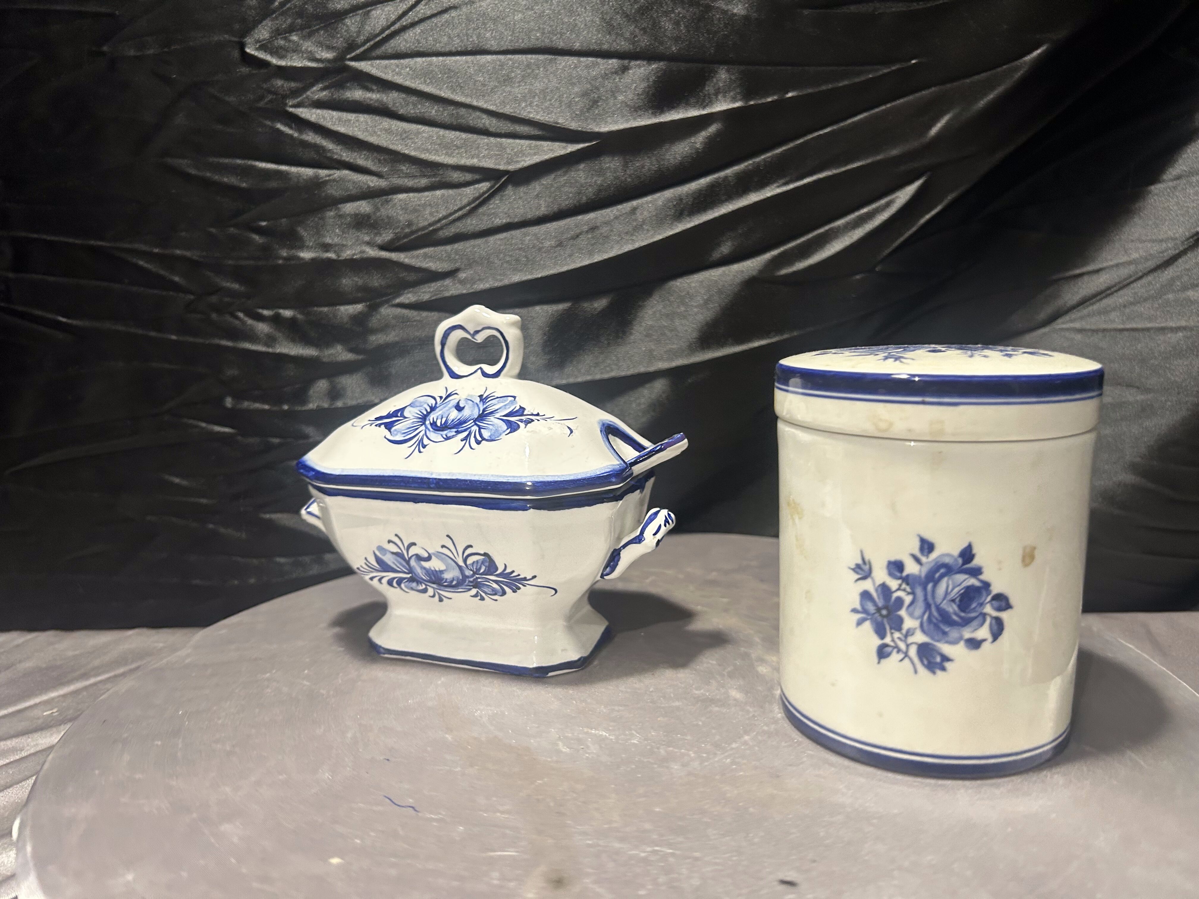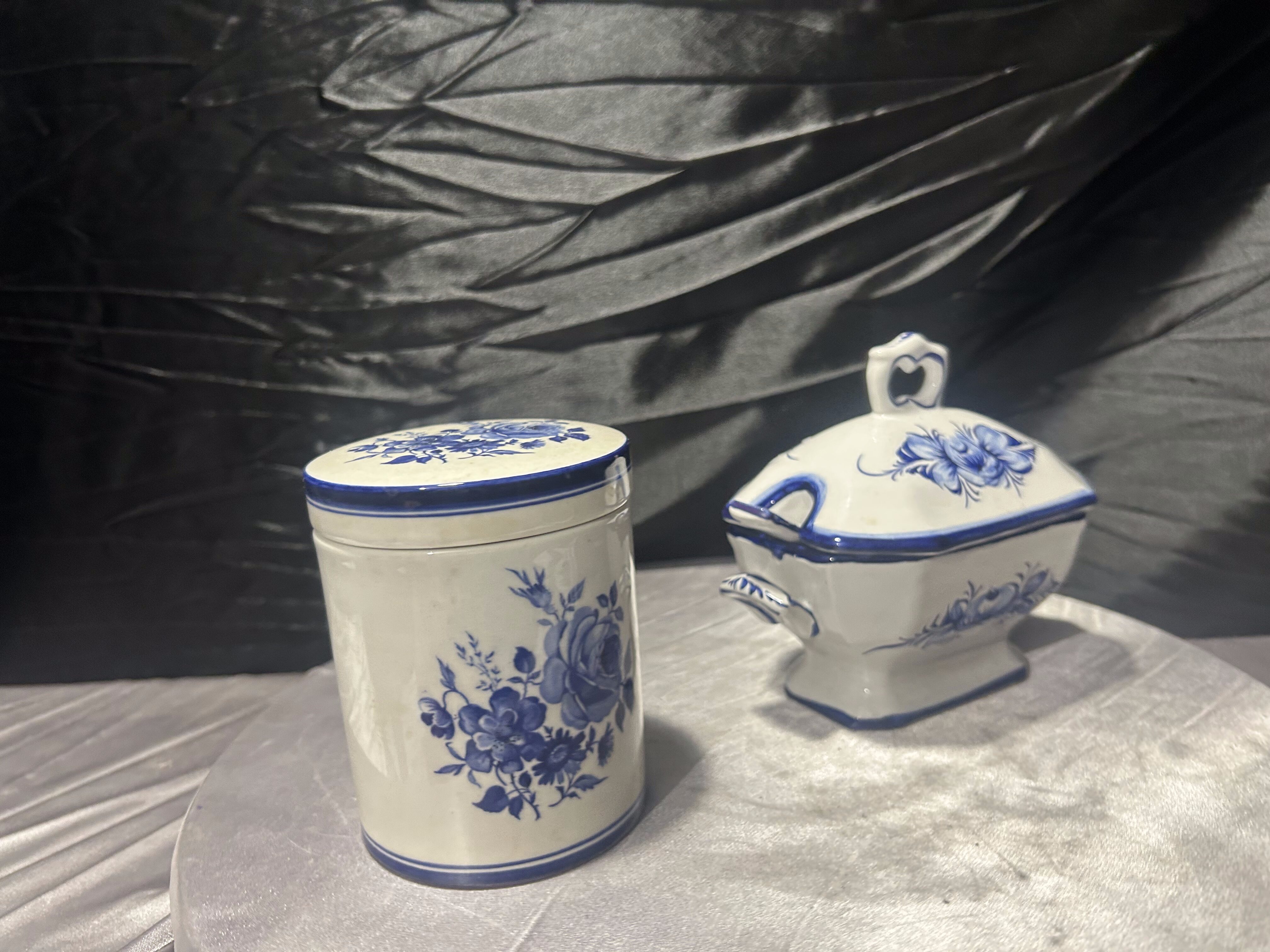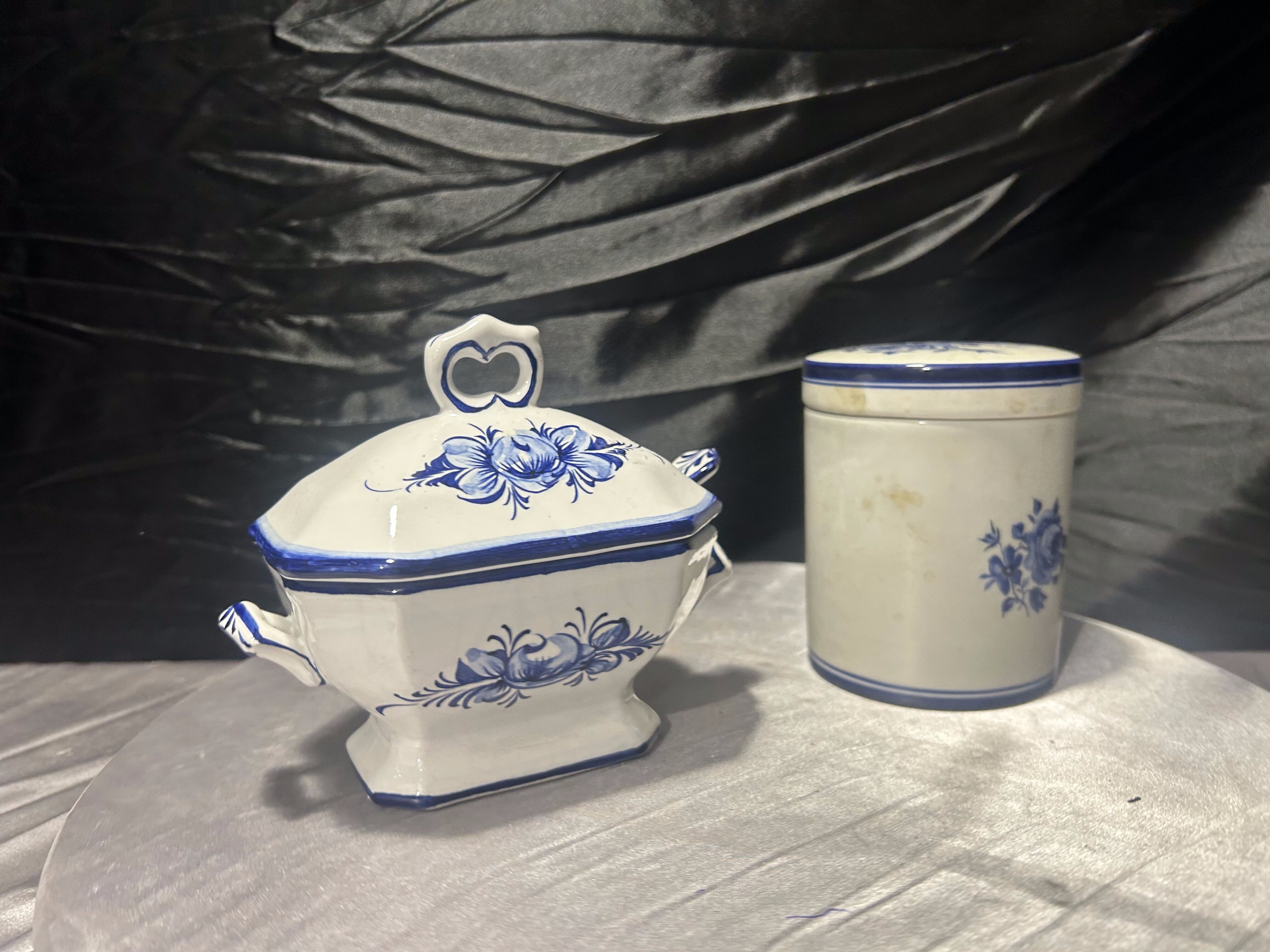 Zestaw ceramiczny cukiernica + pojemnik – dekor kobaltowy – ceramika sygnowana – styl klasyczny