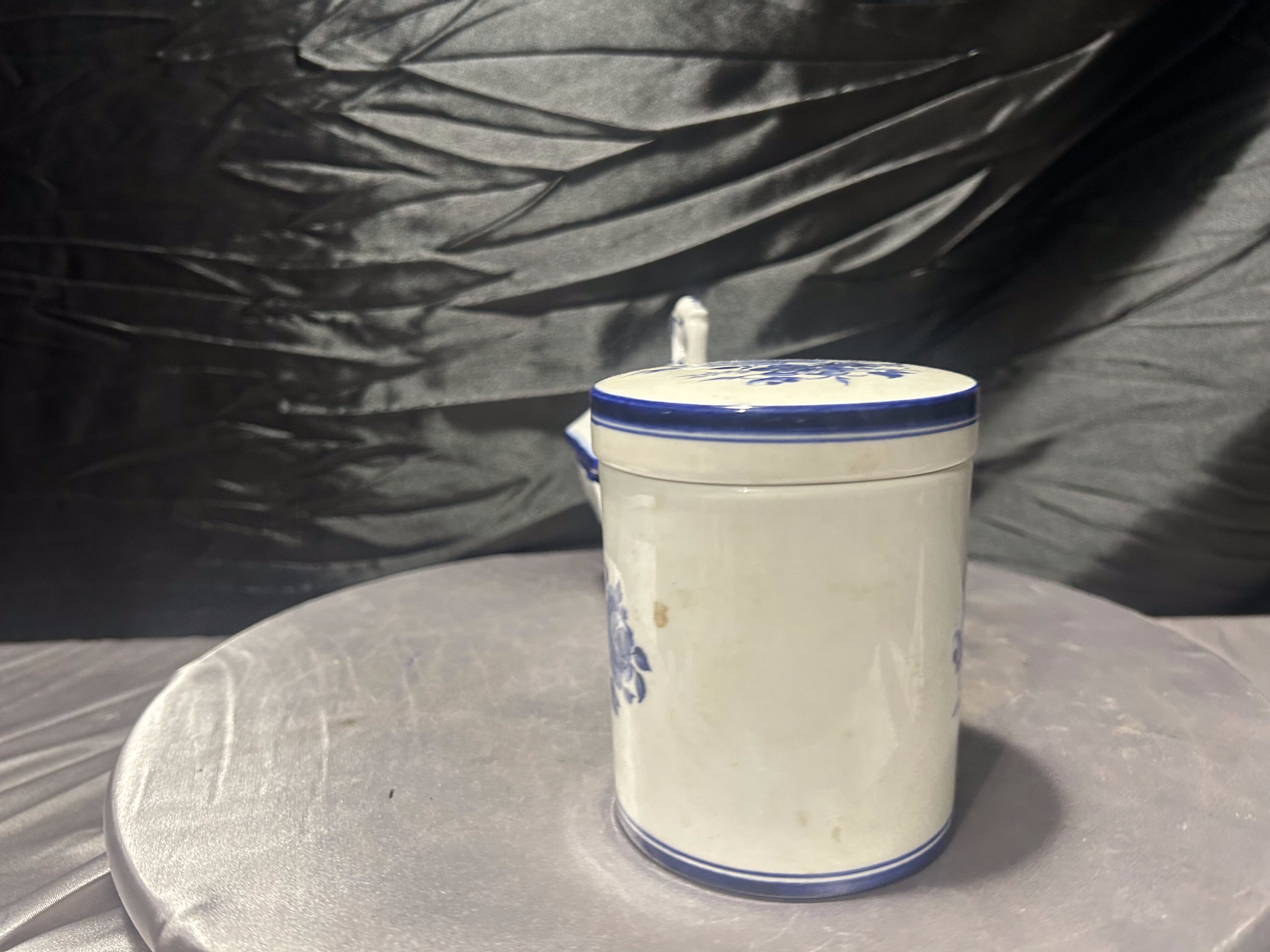 Elegancki zestaw ceramiczny składający się z cukiernicy z pokrywką i ceramiczną łyżeczką oraz dopasowanego pojemnika z pokrywą. Całość utrzymana w ponadczasowej biało-kobaltowej kolorystyce z klasycznym motywem kwiatowym, charakterystycznym dla tradycyjnej europejskiej ceramiki użytkowej.