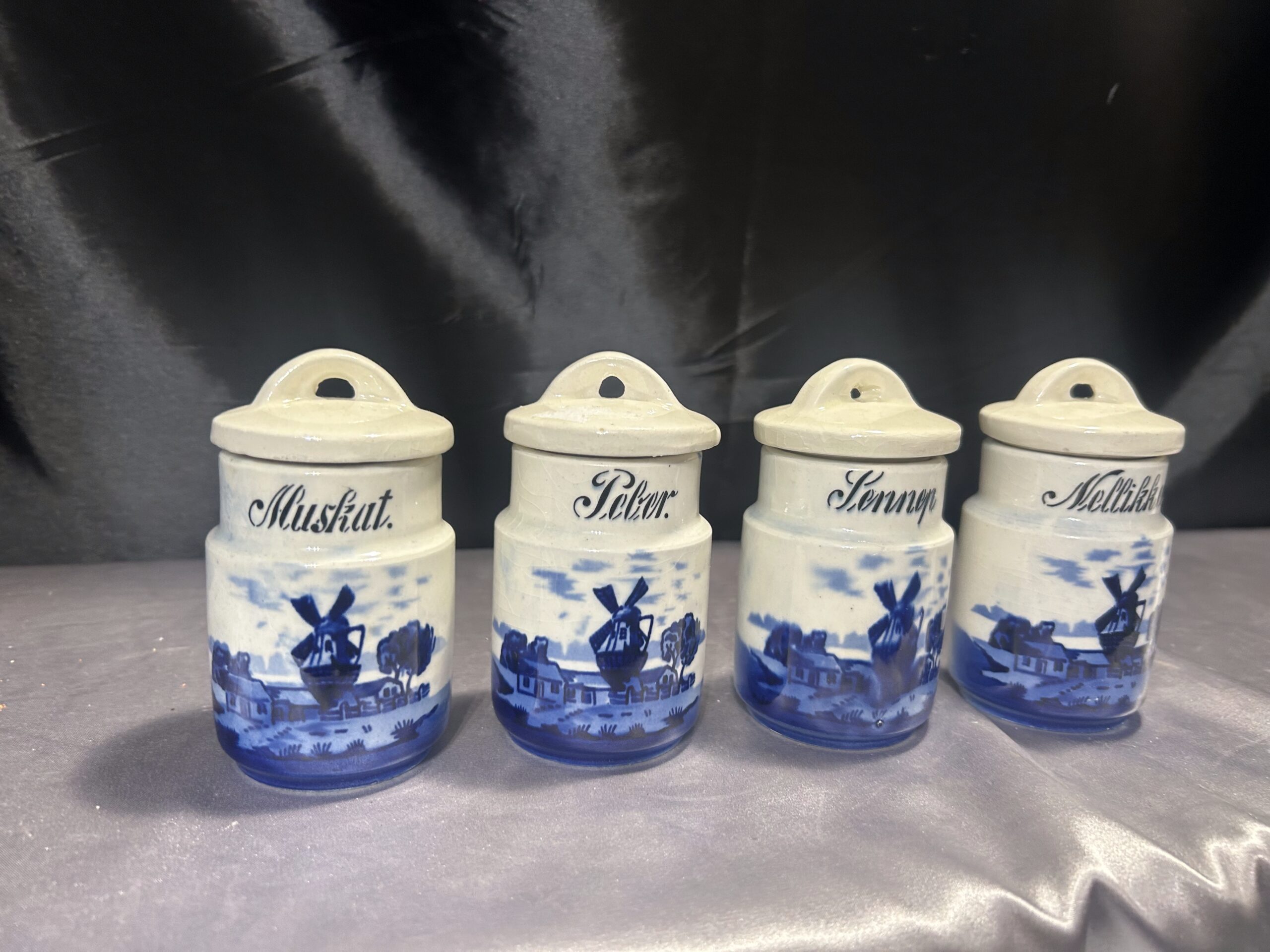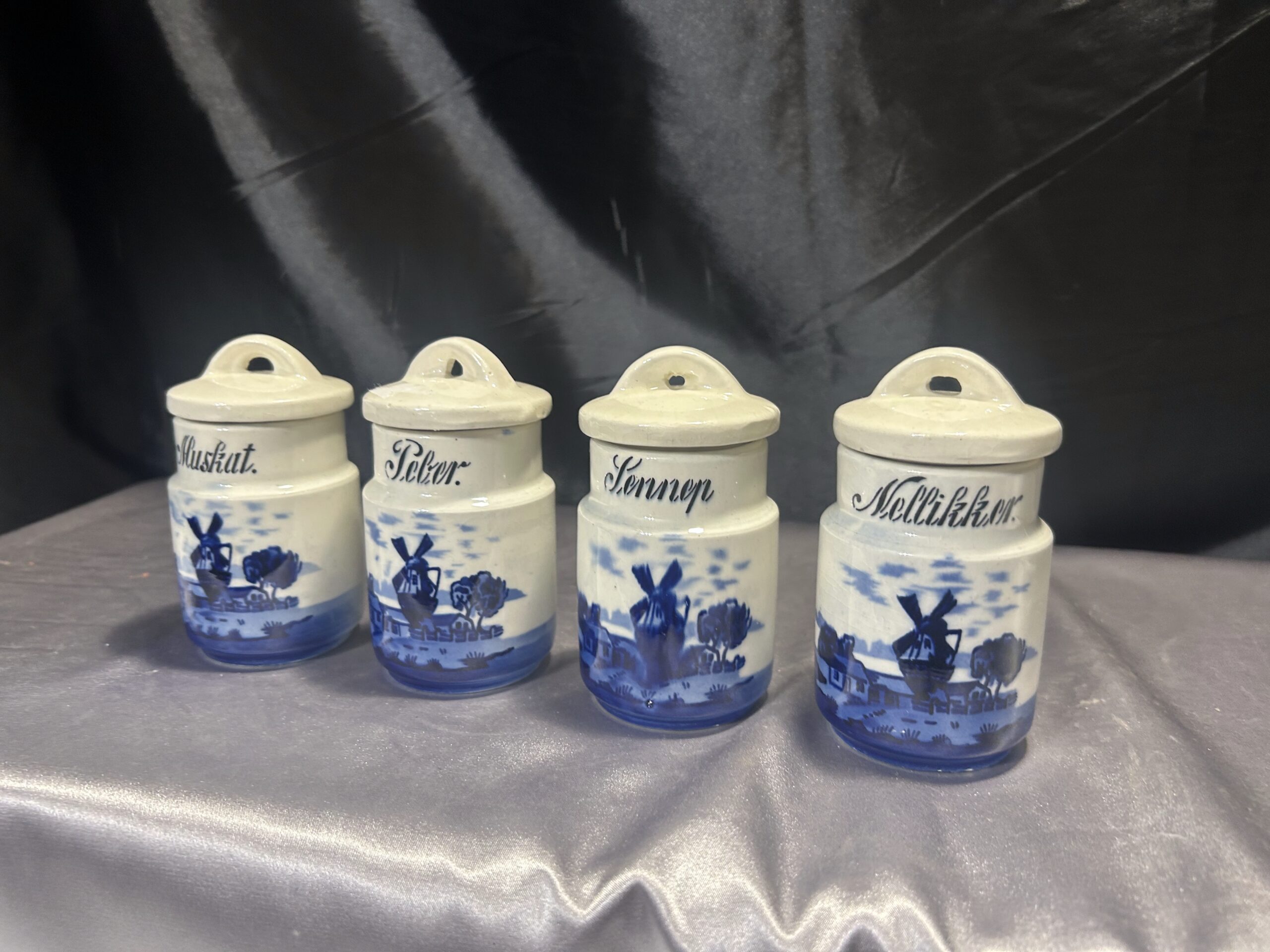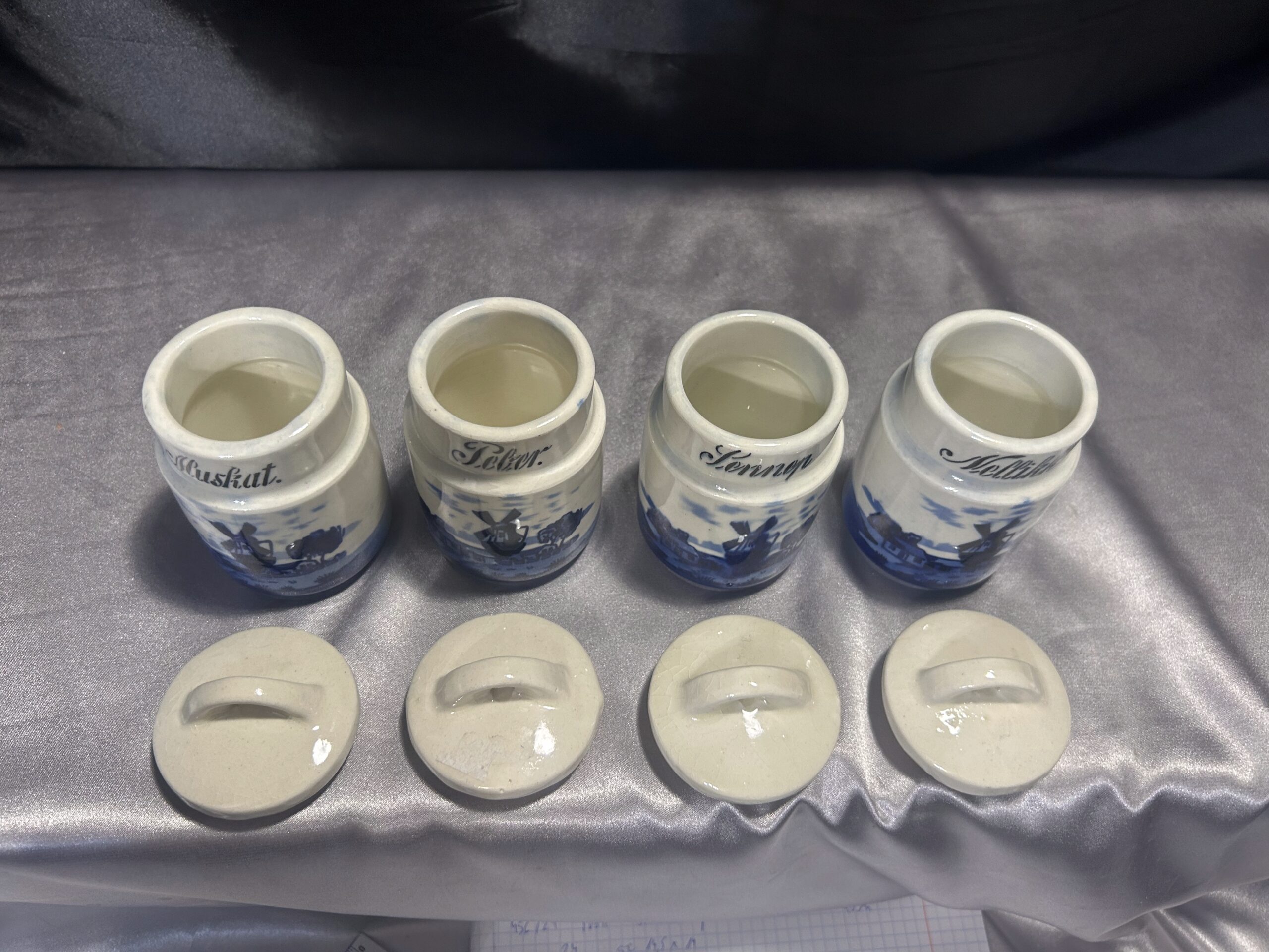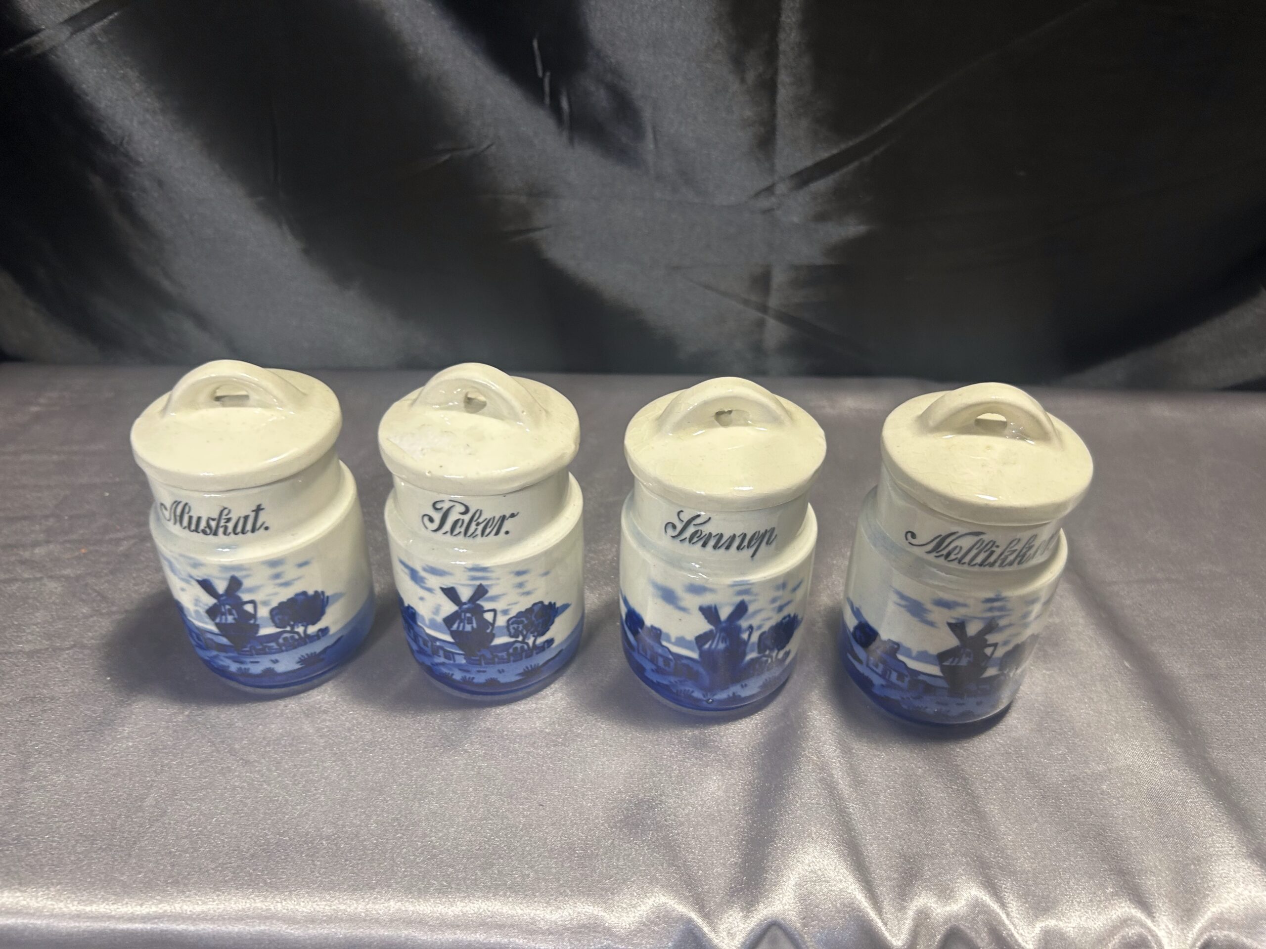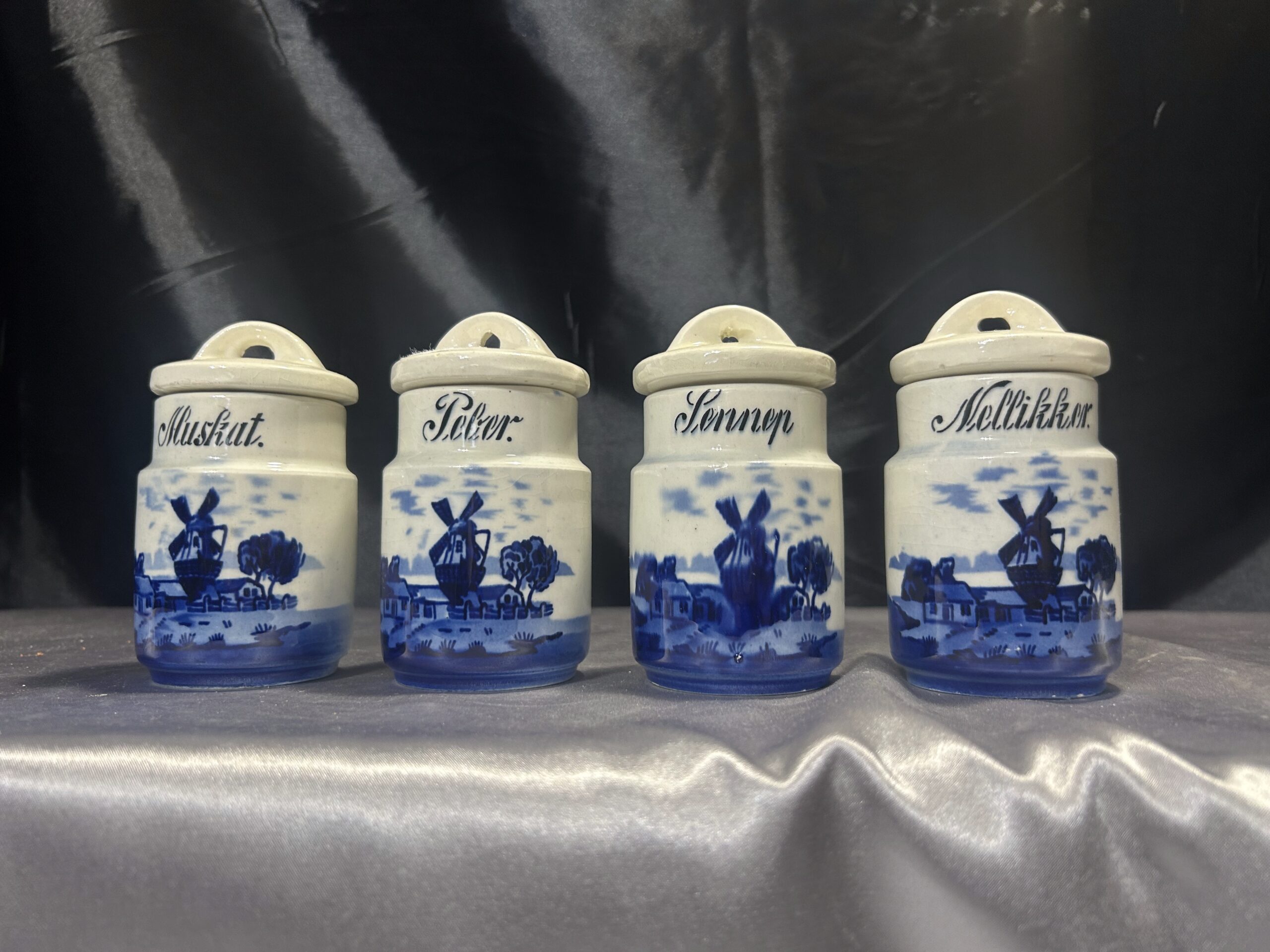 Zestaw czterech ceramicznych pojemników na przyprawy – holenderski wzór z wiatrakami