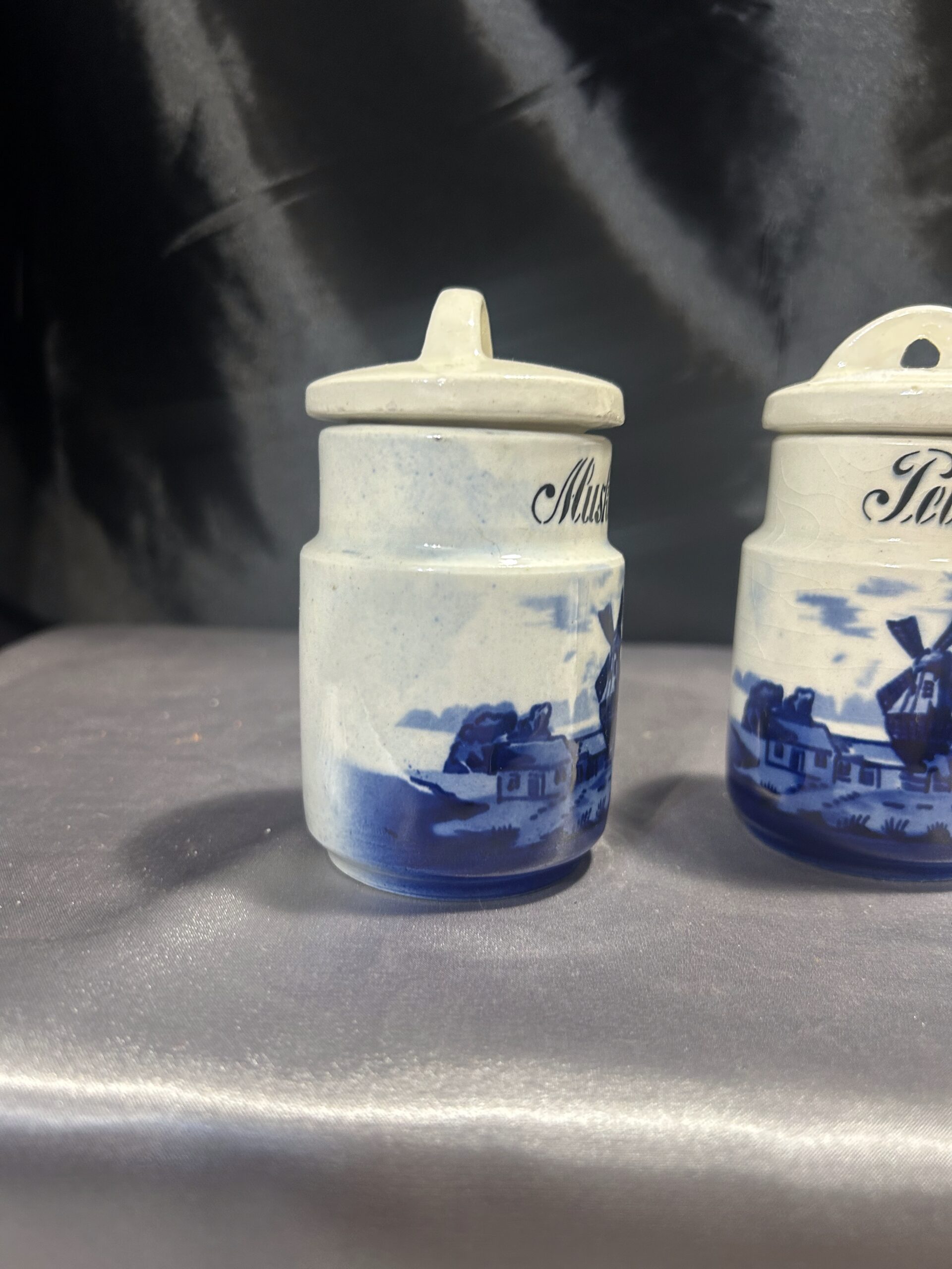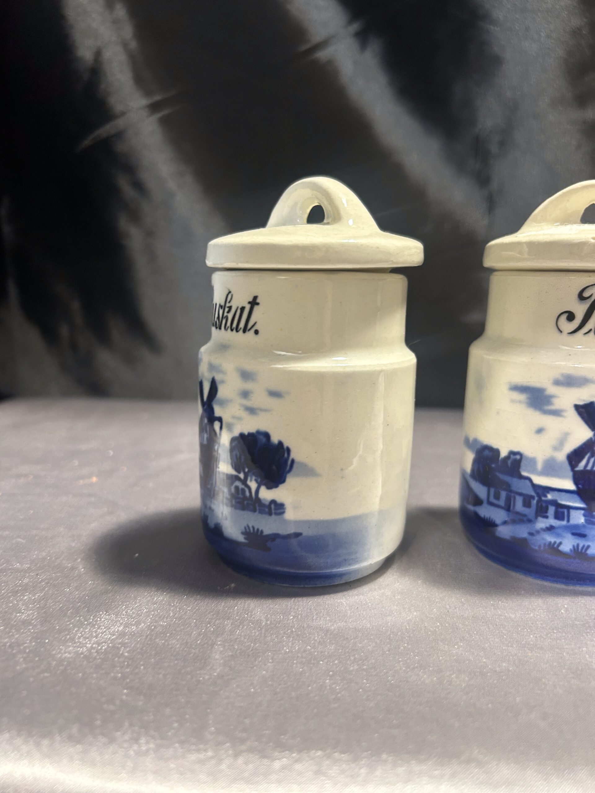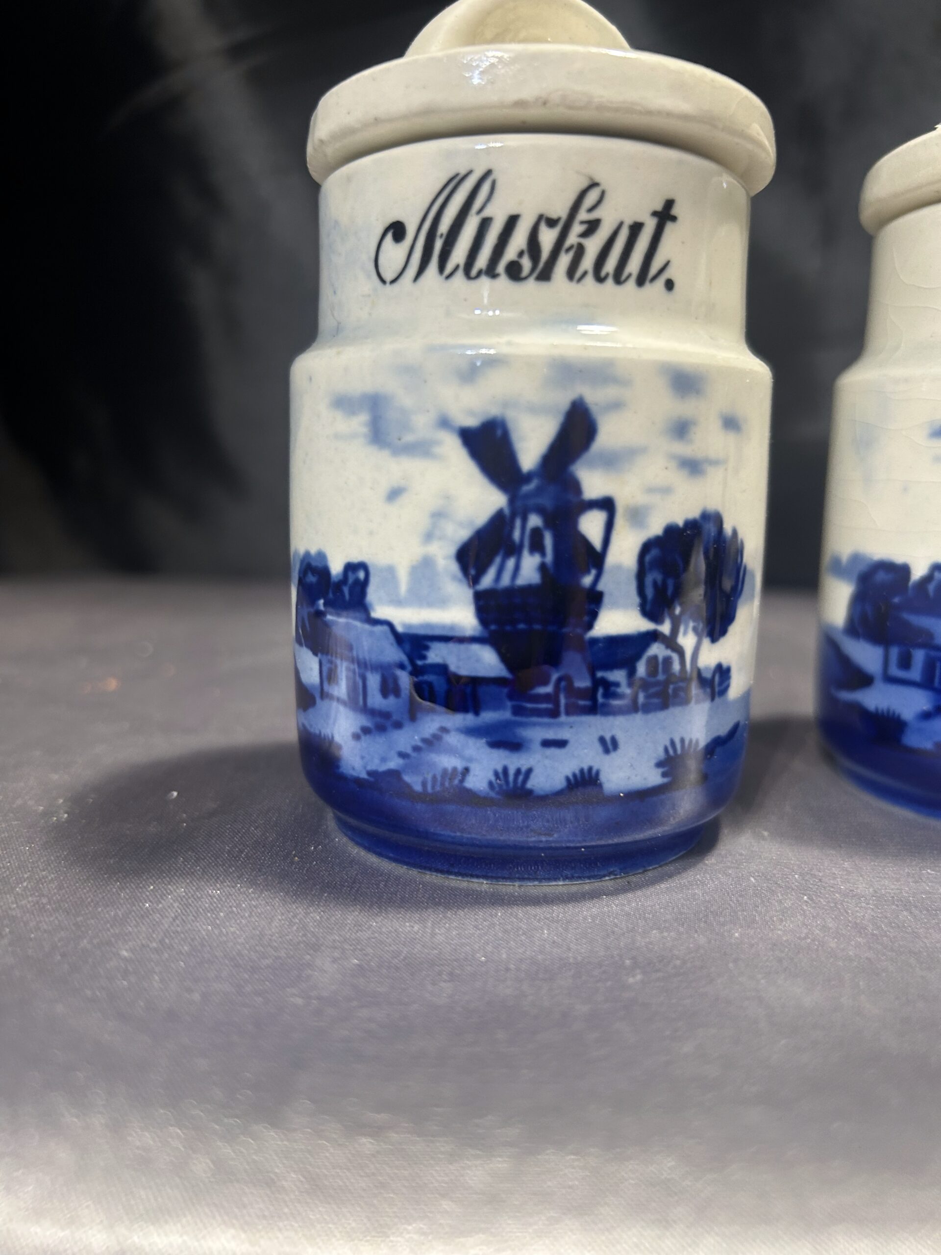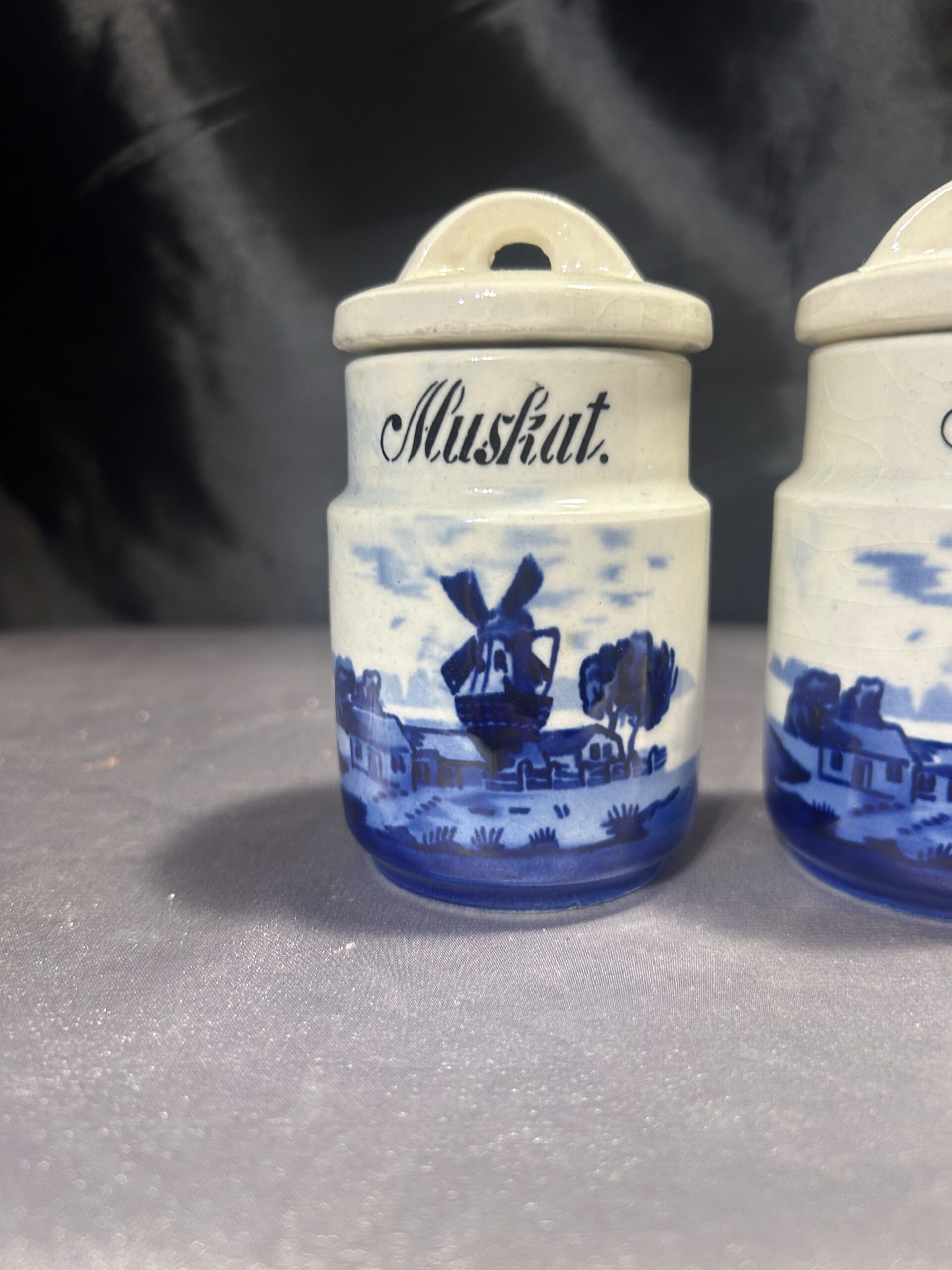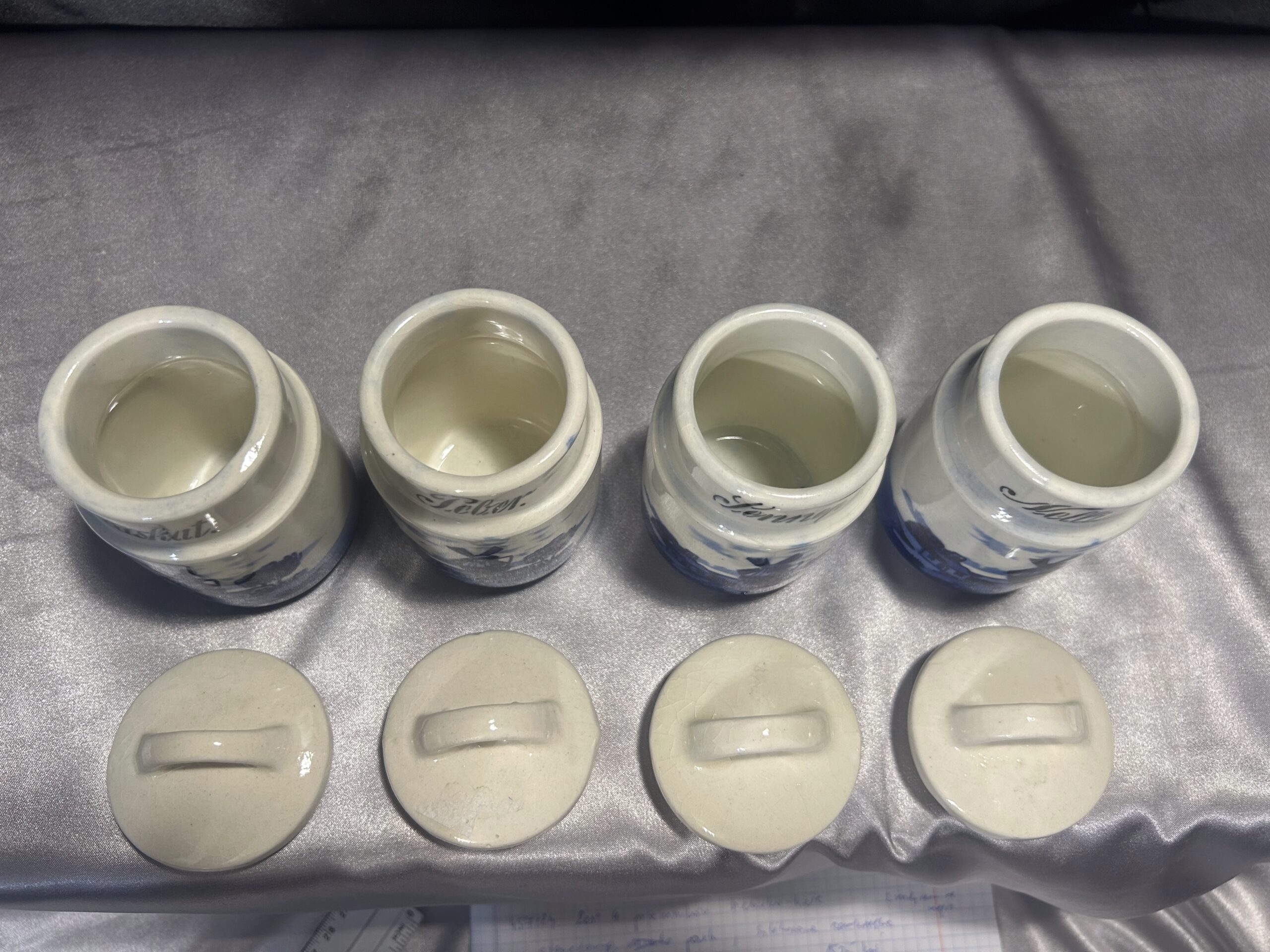 Zestaw czterech ceramicznych pojemników na przyprawy – holenderski wzór z wiatrakami