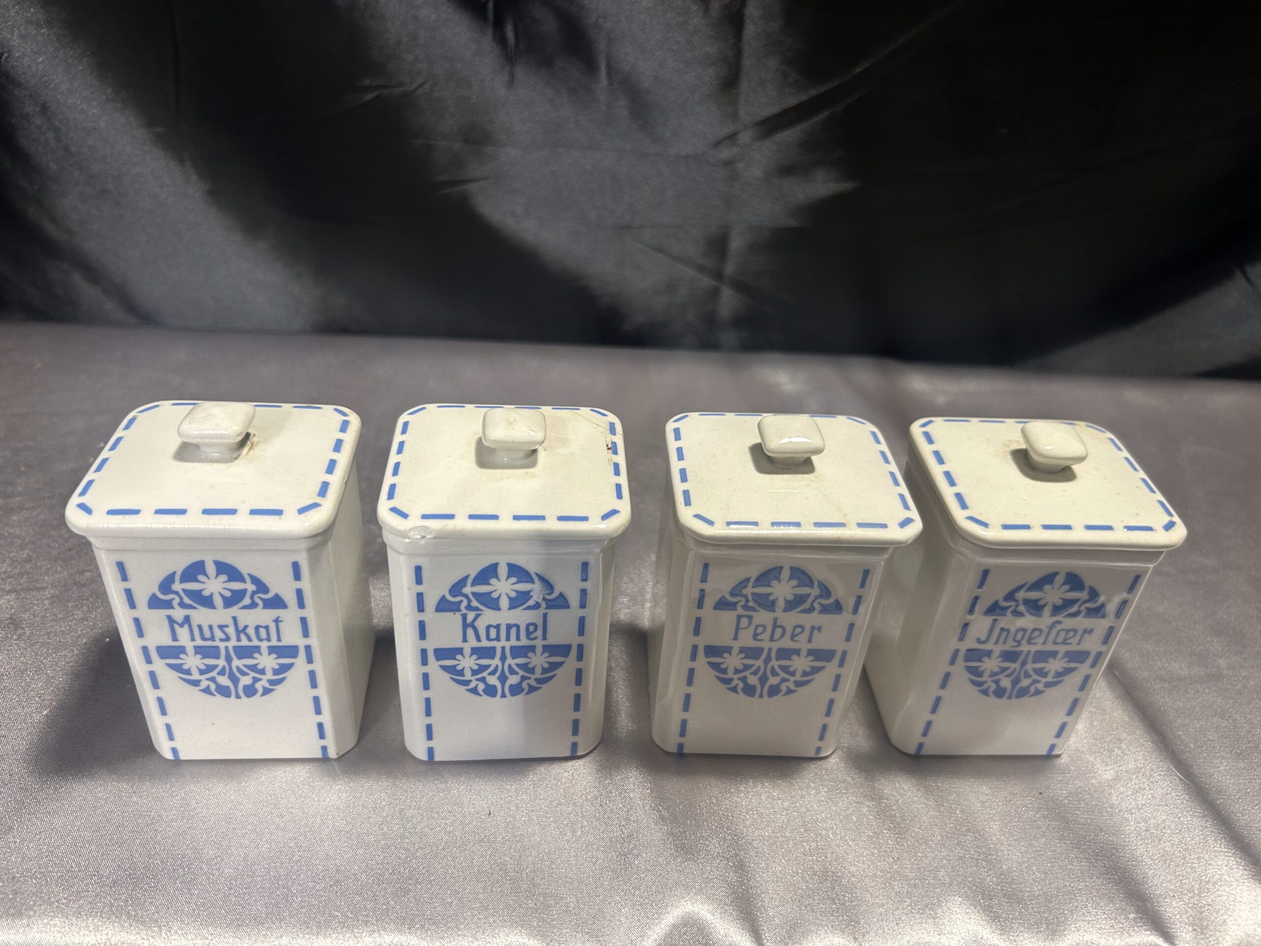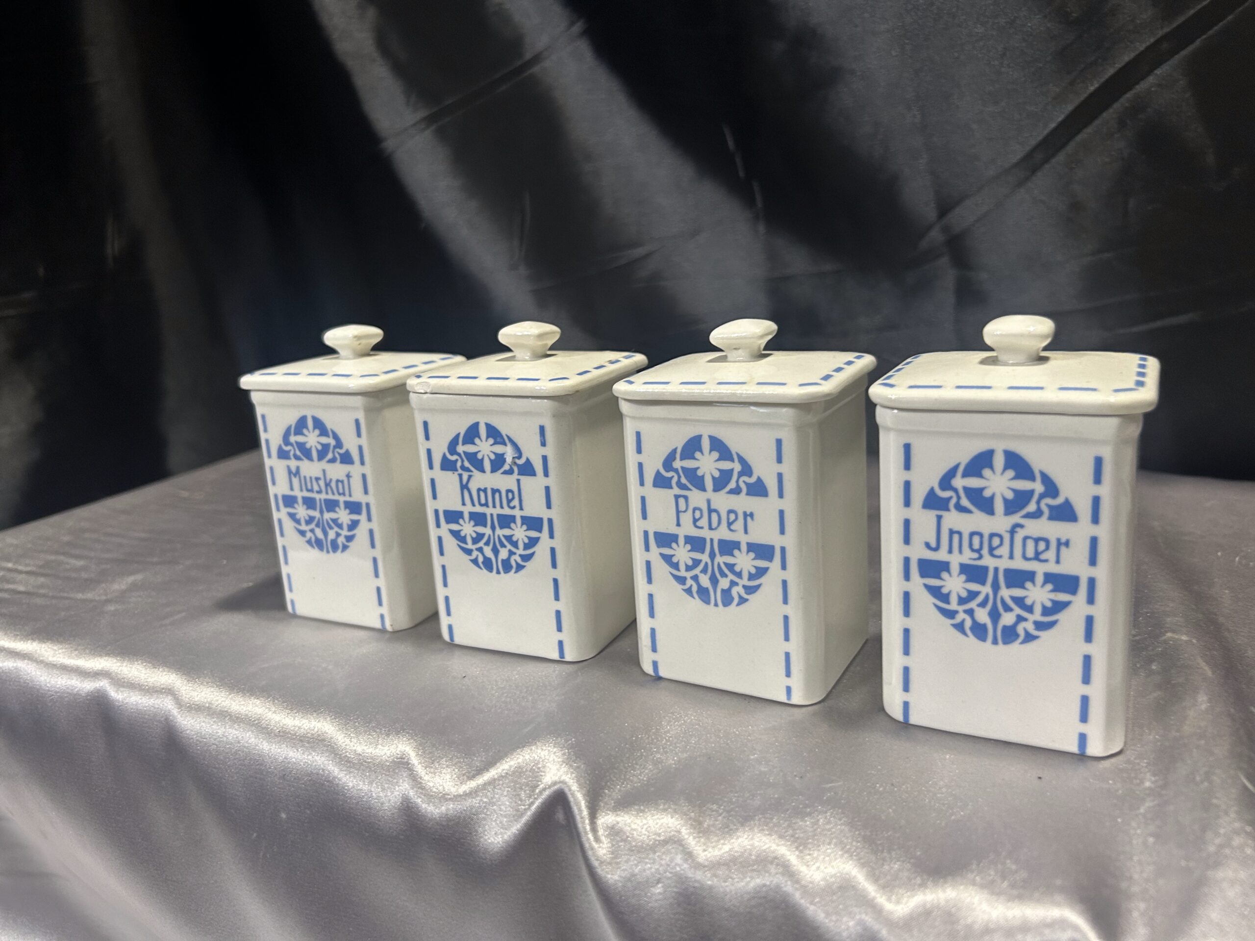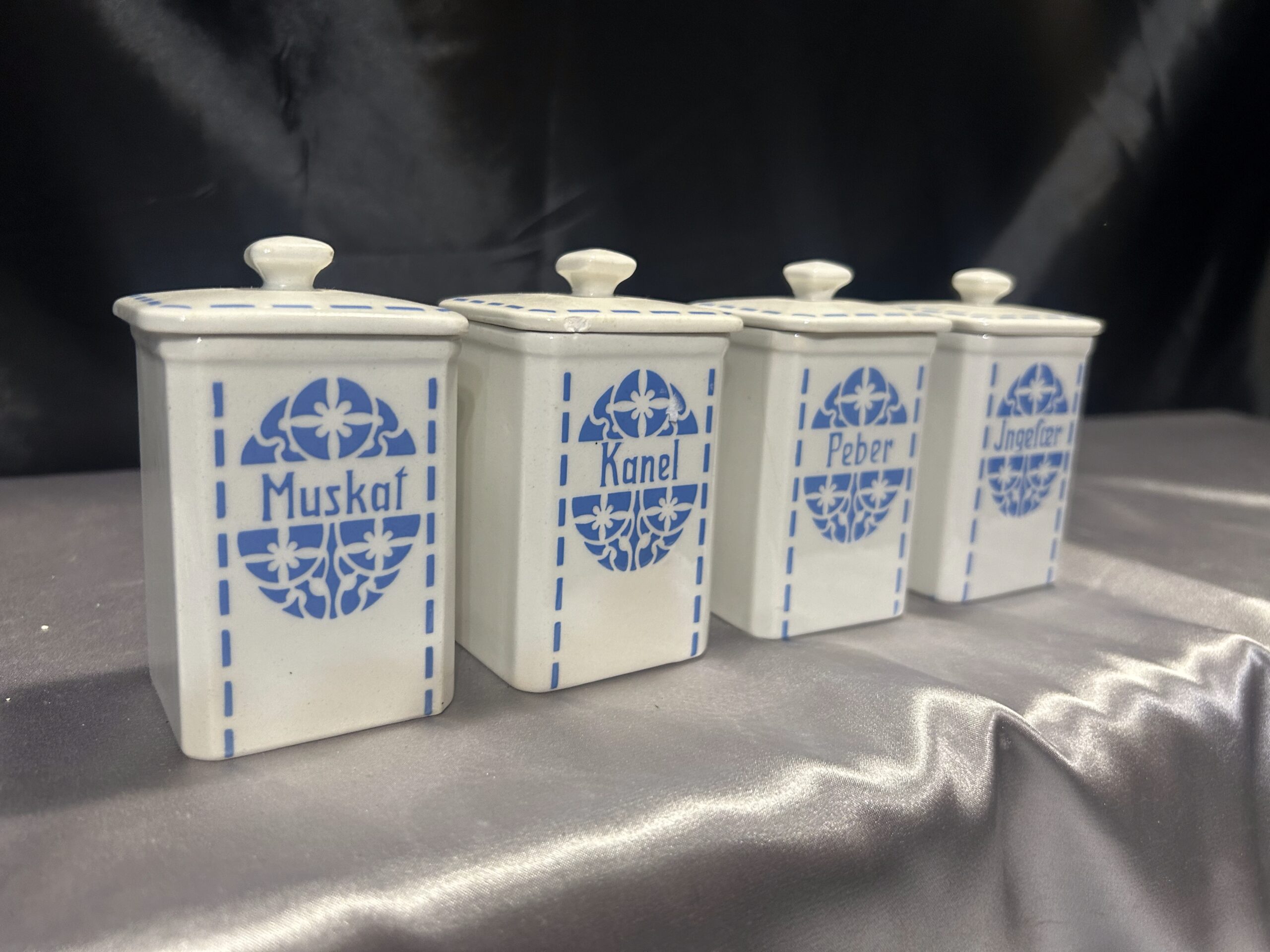 Przedstawiam zestaw czterech ceramicznych pojemników na przyprawy, który łączy funkcjonalność z ponadczasowym wzornictwem. Wykonane z białej ceramiki, ozdobione subtelnym niebieskim motywem i eleganckimi napisami MUSKAT, KANEL, PEBER, JNGEFAER, będą zarówno praktycznym, jak i dekoracyjnym elementem kuchni.