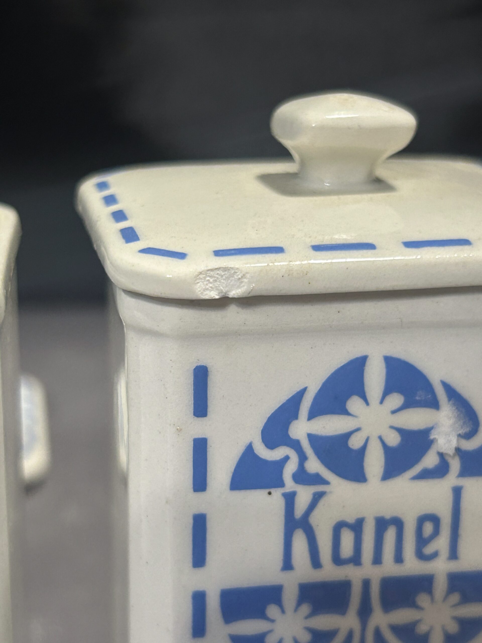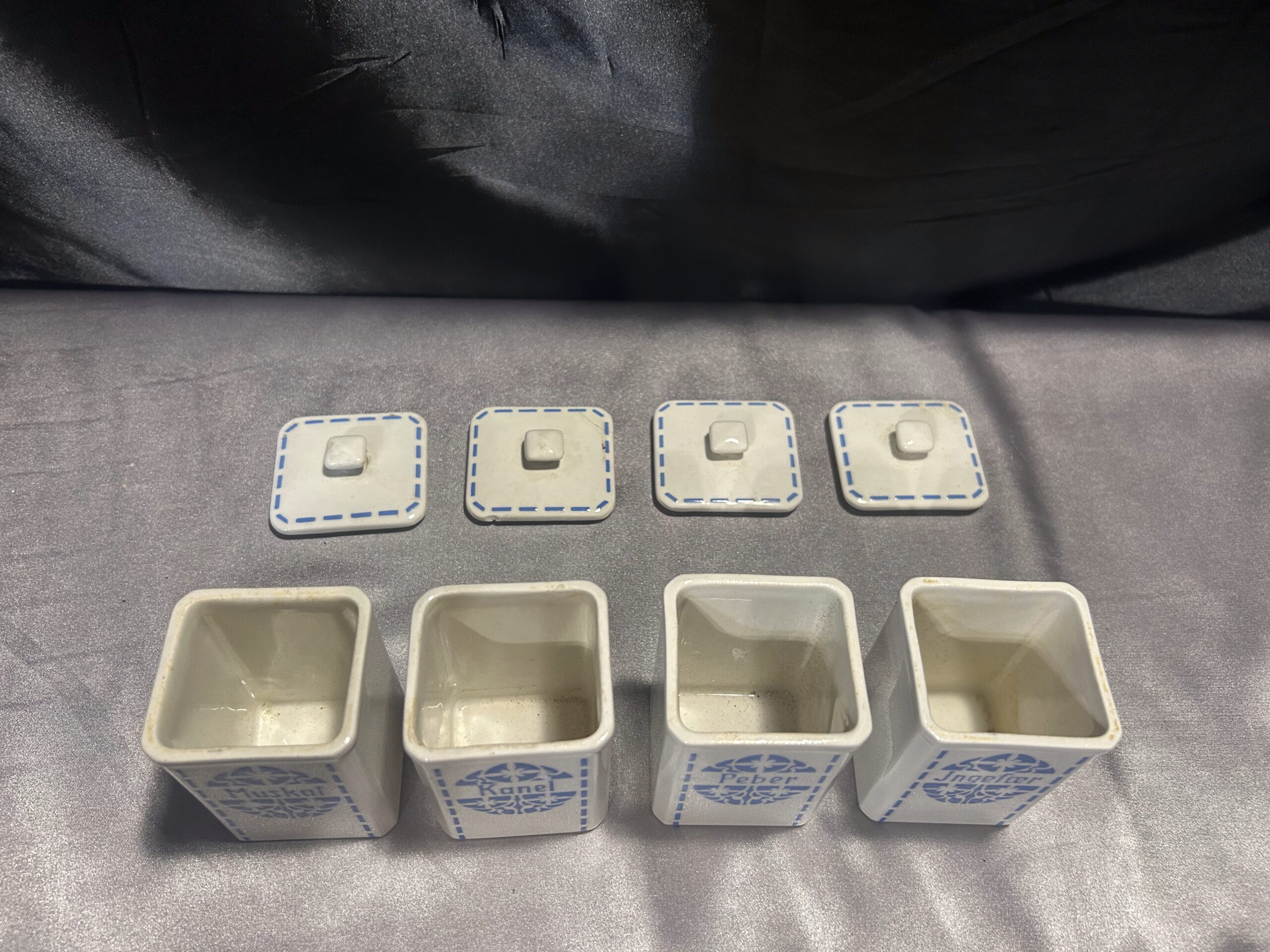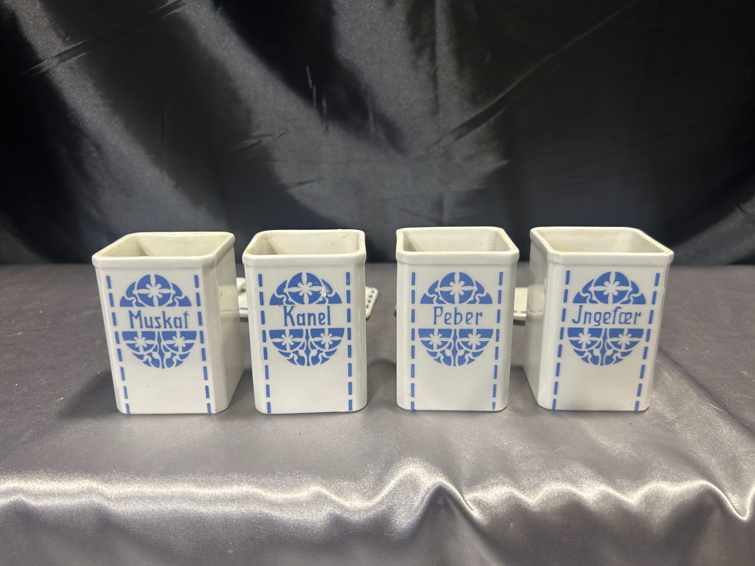 Przedstawiam zestaw czterech ceramicznych pojemników na przyprawy, który łączy funkcjonalność z ponadczasowym wzornictwem. Wykonane z białej ceramiki, ozdobione subtelnym niebieskim motywem i eleganckimi napisami MUSKAT, KANEL, PEBER, JNGEFAER, będą zarówno praktycznym, jak i dekoracyjnym elementem kuchni.