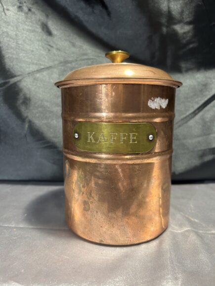 Miedziany pojemnik kuchenny z pokrywką – Napis KAFFE – Styl vintage