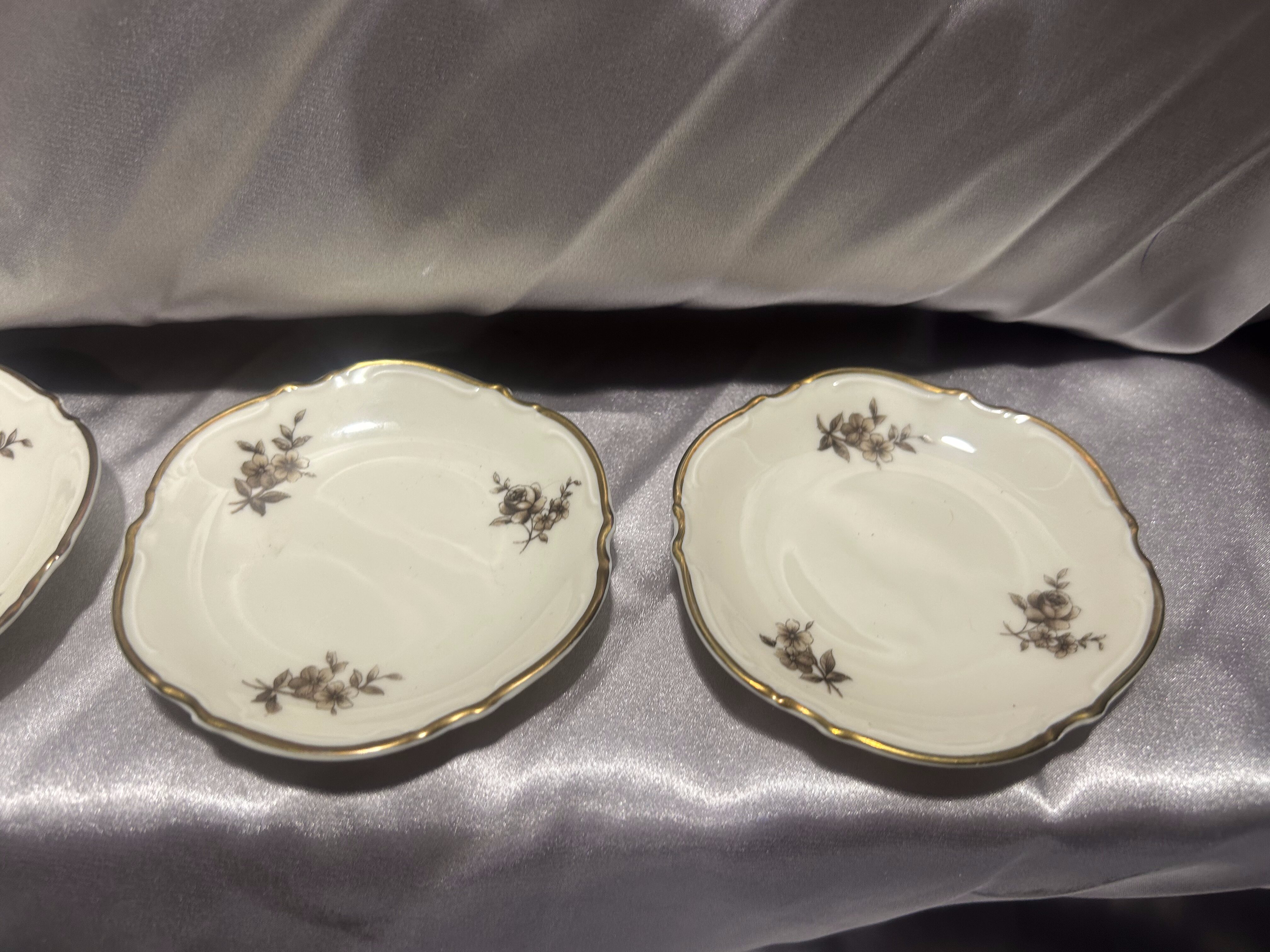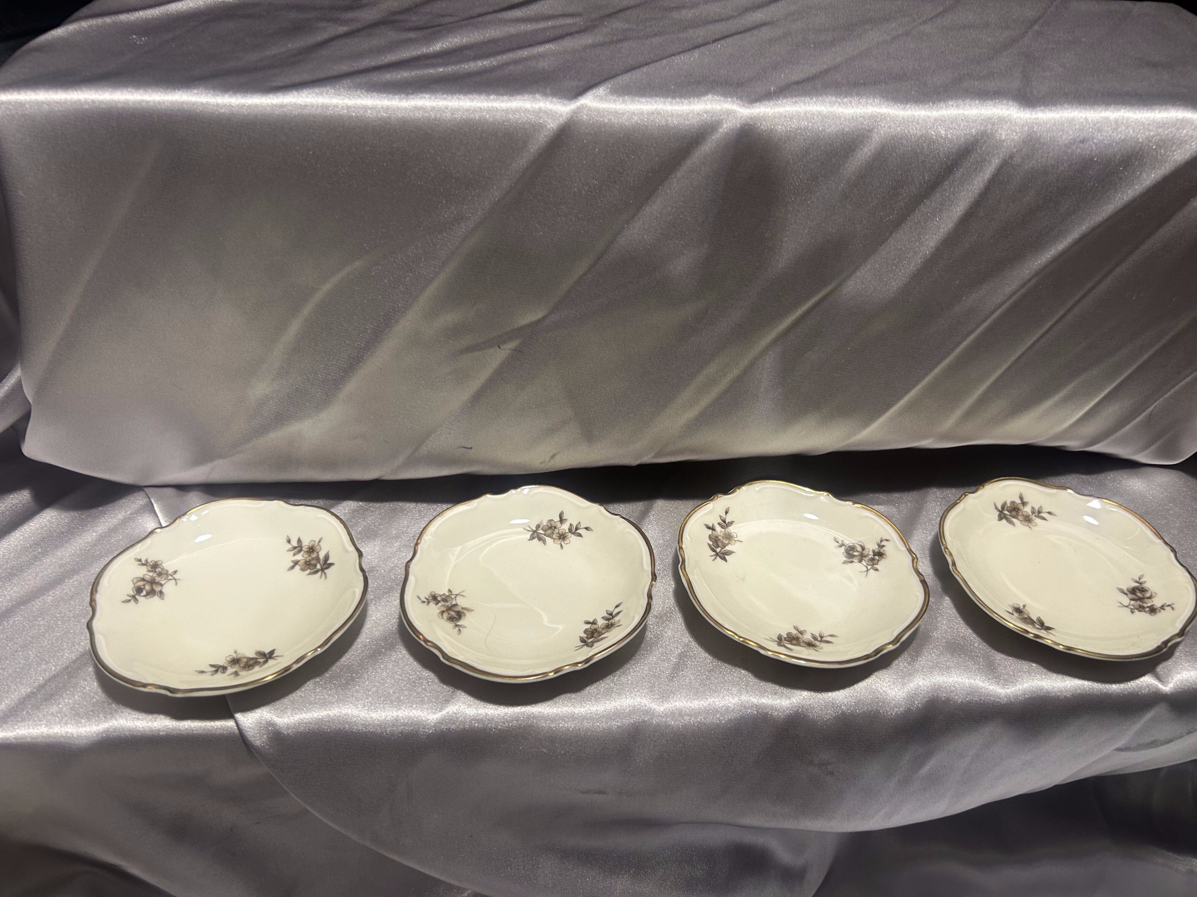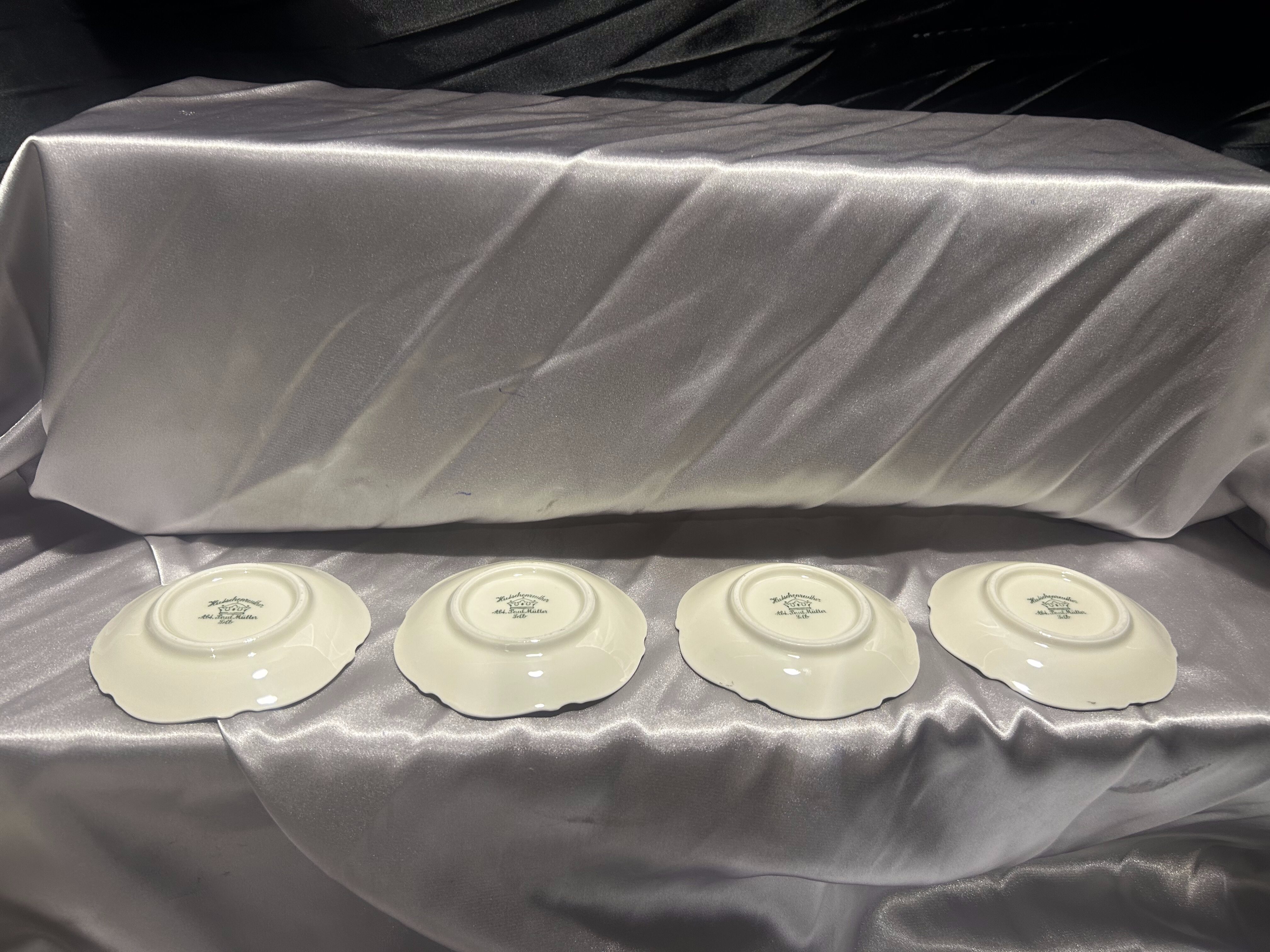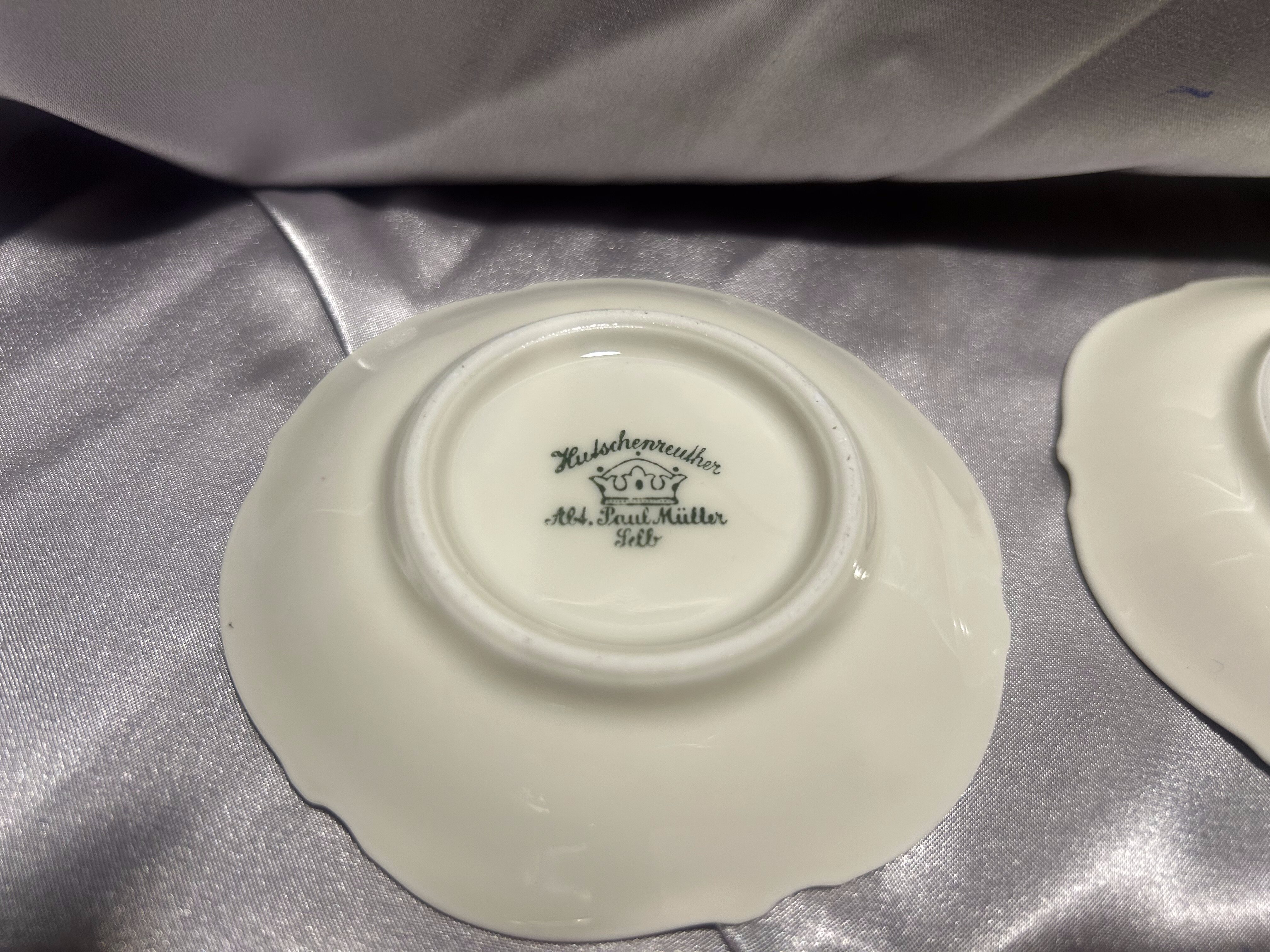 Komplet czterech eleganckich podstawek pod filiżanki, wykonanych z porcelany Hutschenreuther – Abteilung Paul Müller, Selb (Bawaria, Niemcy). Manufaktura Hutschenreuther została założona w 1814 roku przez Carolusa Magnusa Hutschenreuthera i przez kolejne dekady wypracowała renomę jednej z najważniejszych niemieckich wytwórni porcelany. Oddział Paul Müller w Selb dołączył do grupy Hutschenreuther w 1917 roku, specjalizując się w porcelanie stołowej najwyższej jakości.
