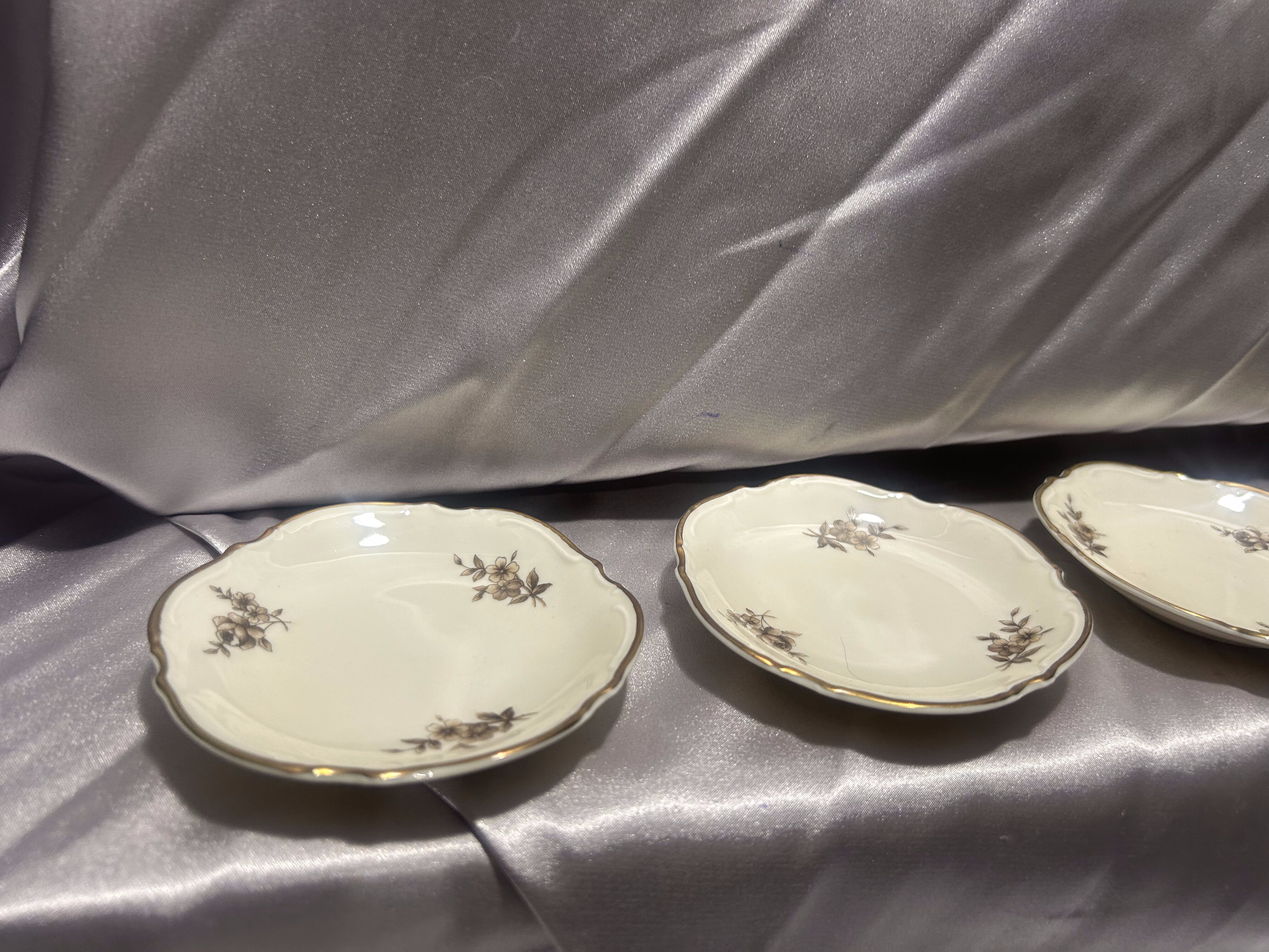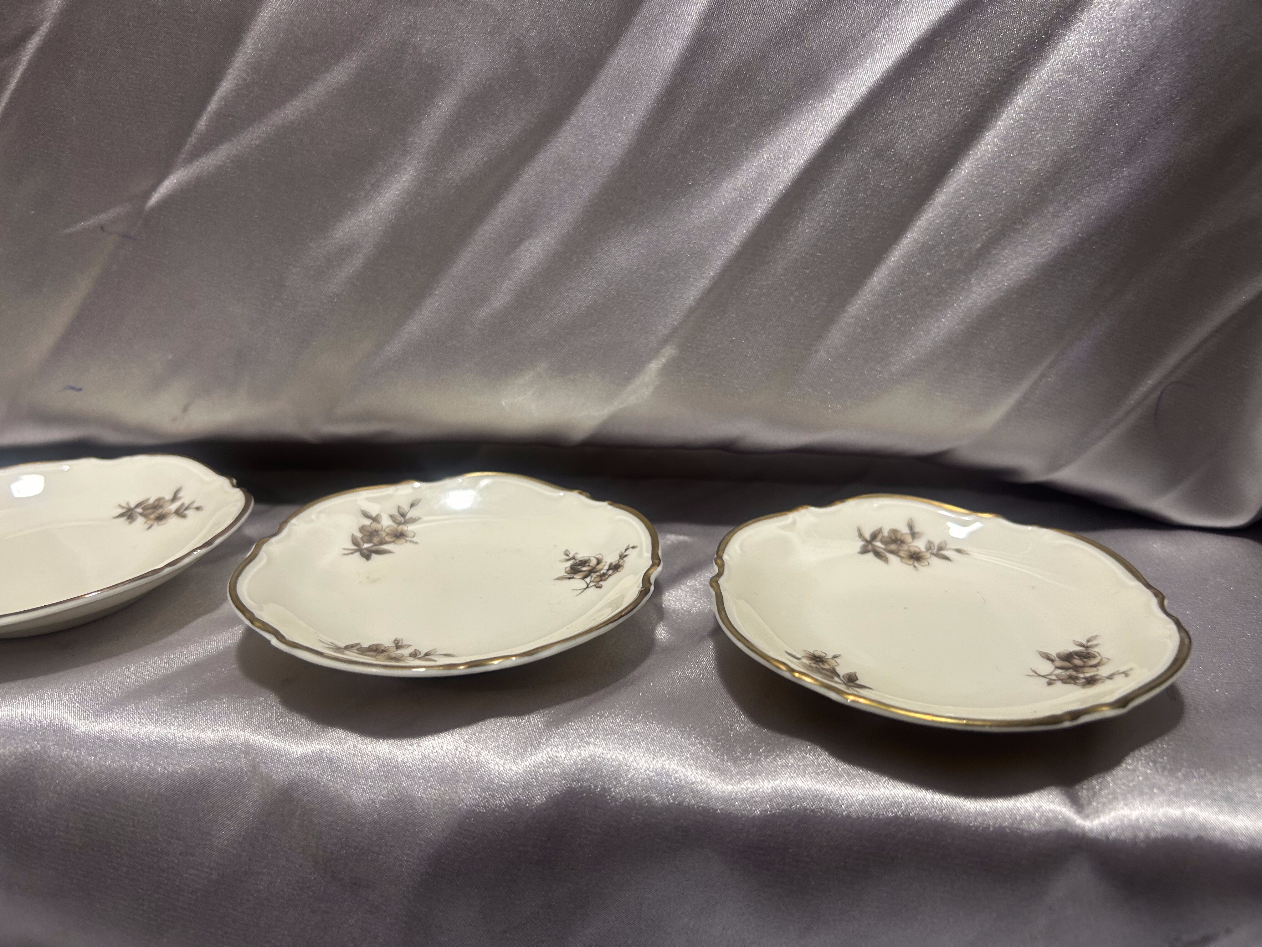 Podstawki mają delikatny odcień śmietankowy, zdobione są subtelnym, roślinnym motywem kwiatowym w tonacji brązów i sepii oraz wykończone złoconym rantem. Ich klasyczna forma i szlachetne zdobienie czynią je pięknym dodatkiem do eleganckiej zastawy stołowej.