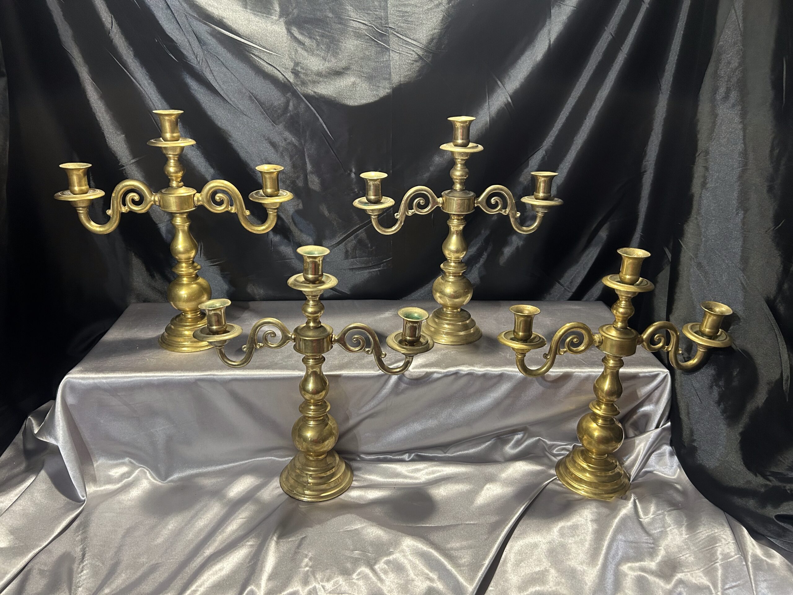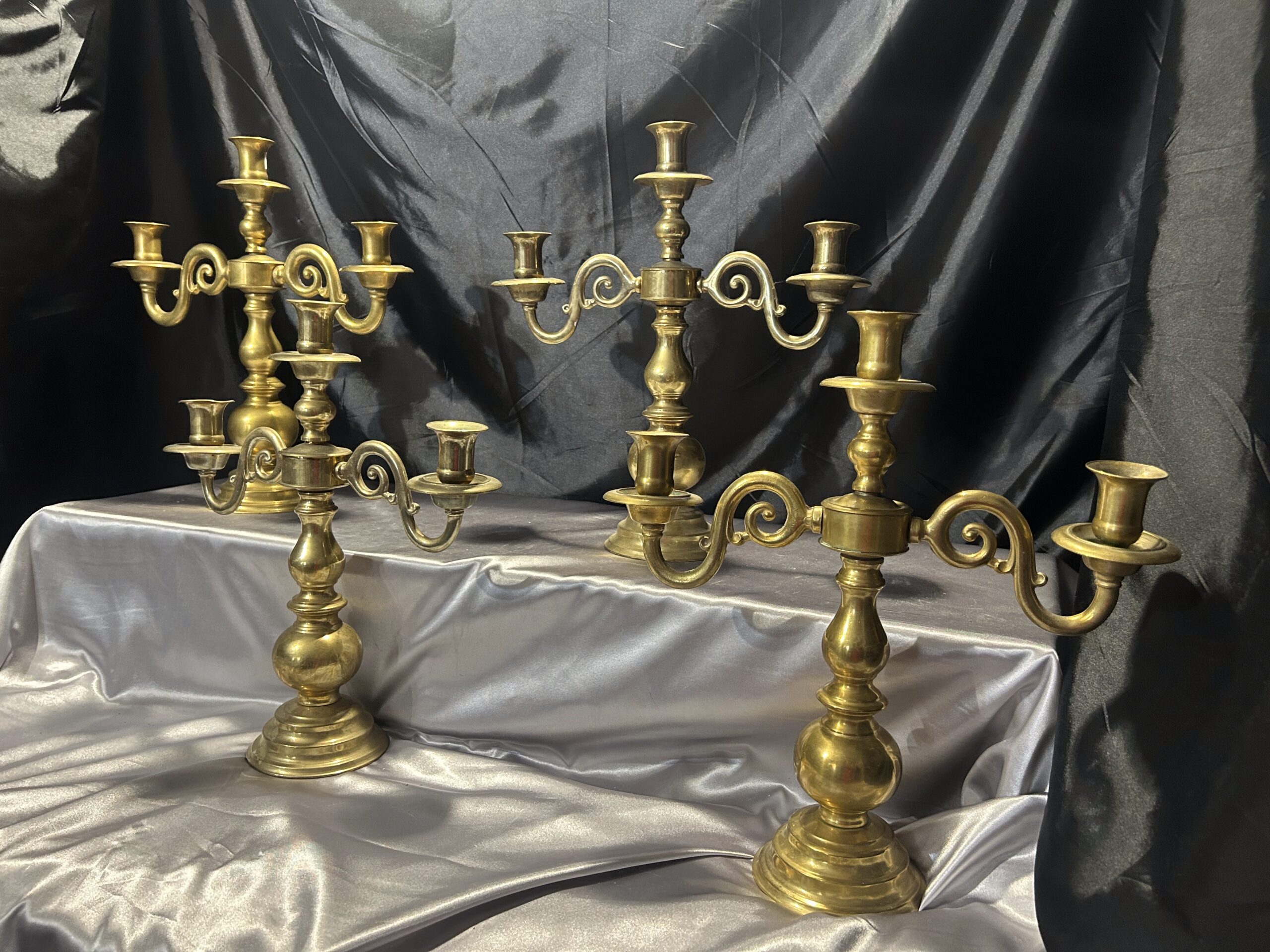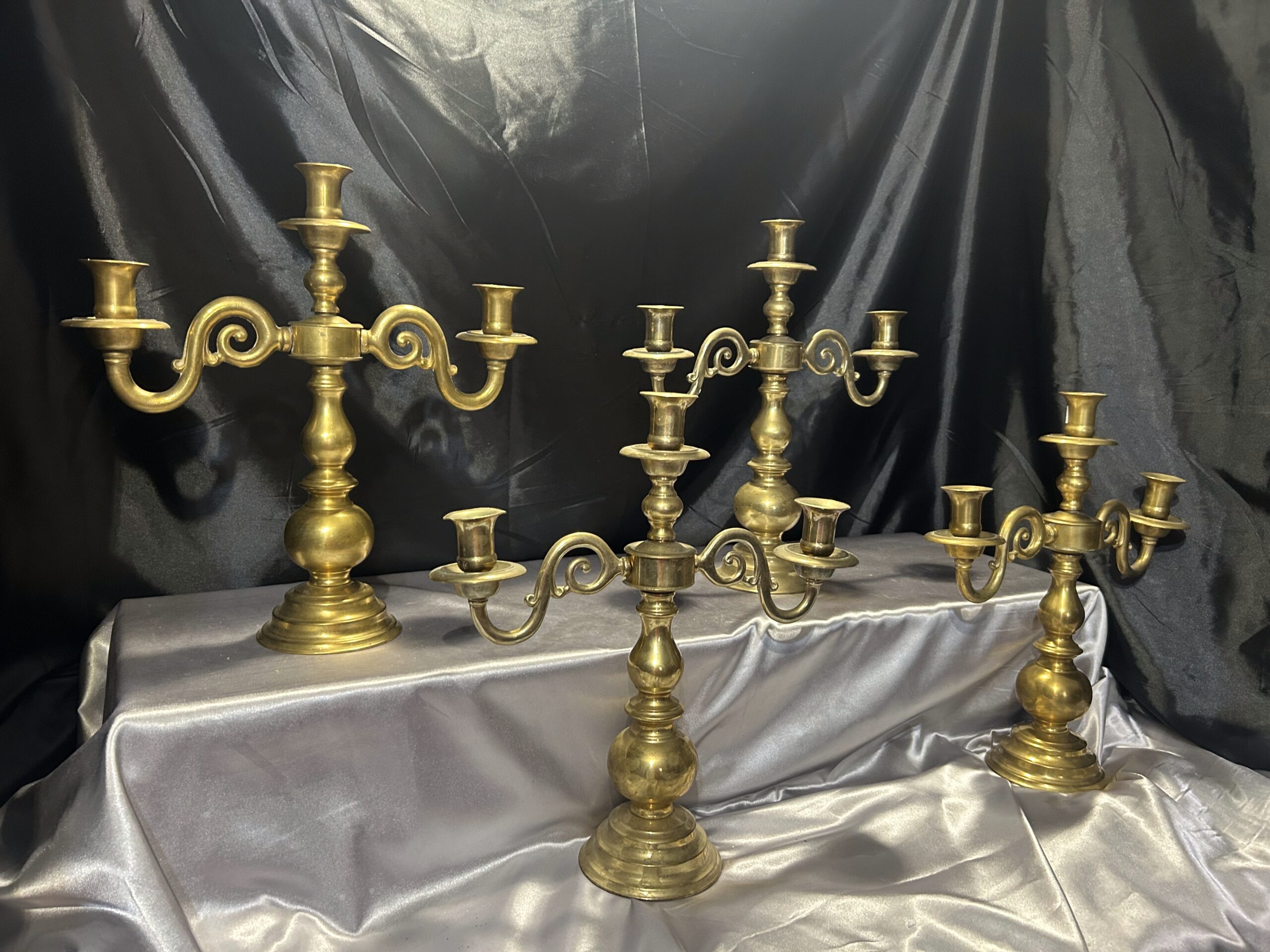 Zestaw Czterech Świeczników Trzyramiennych z Mosiądzu – Zdobione i Eleganckie