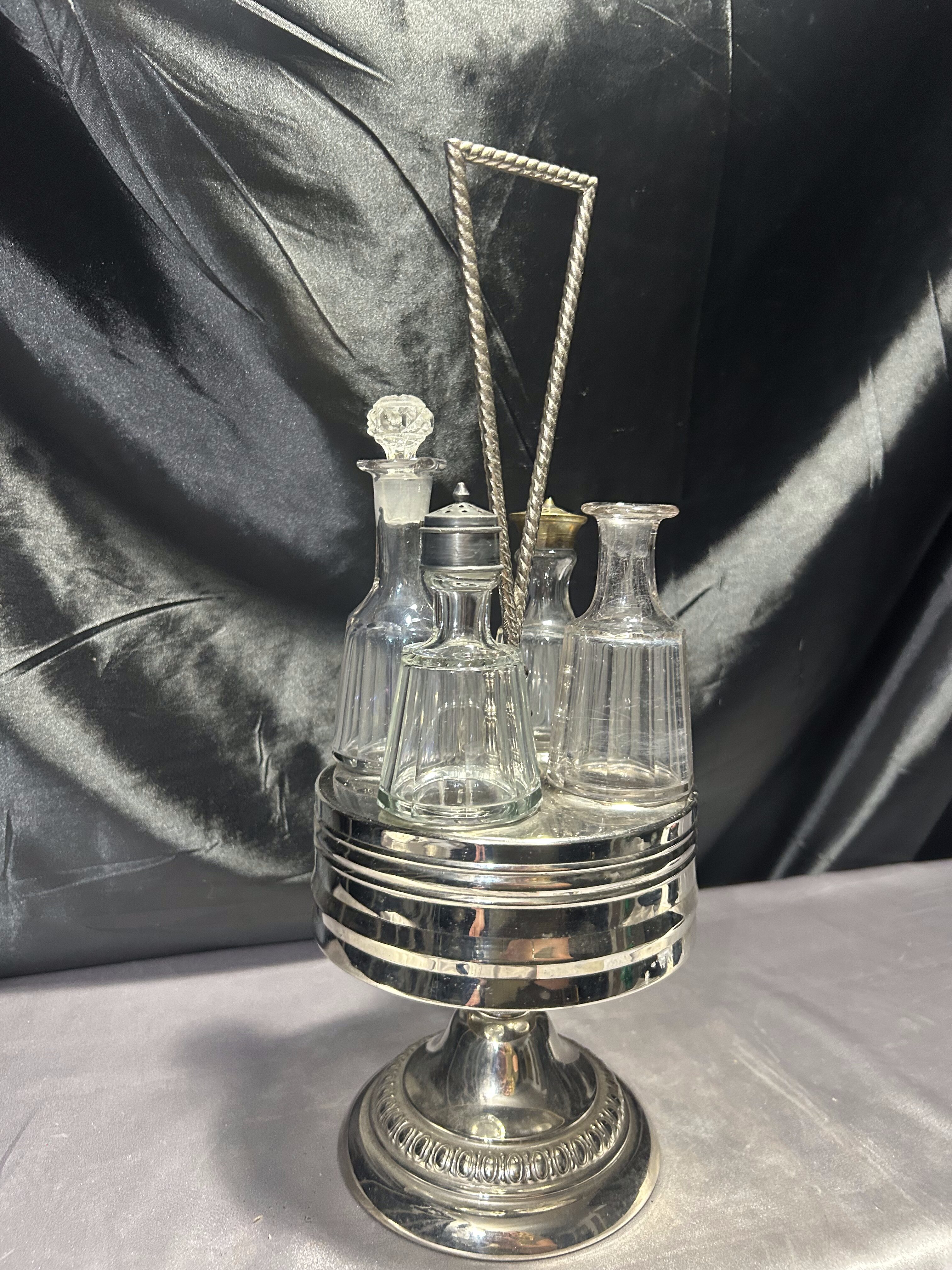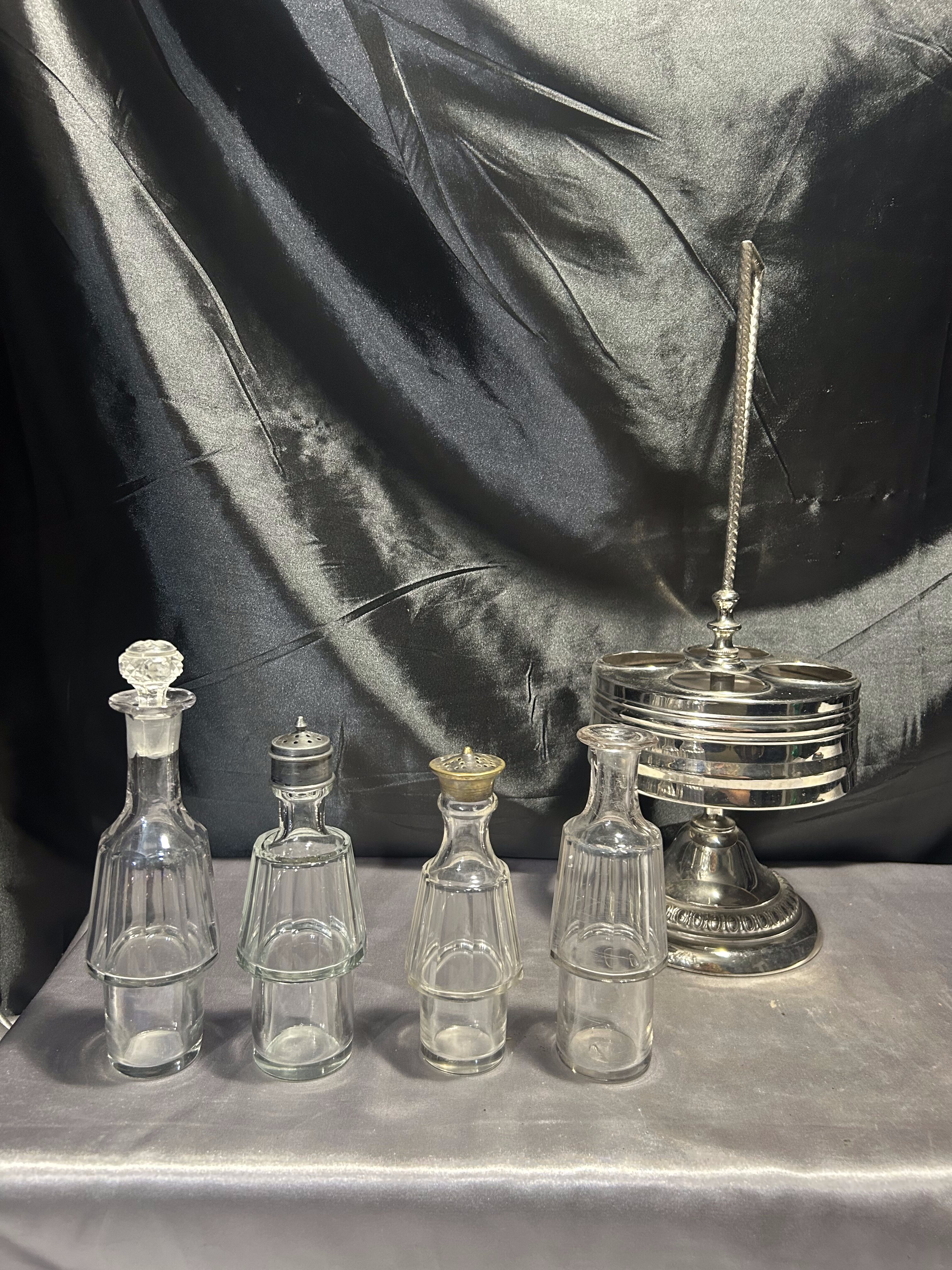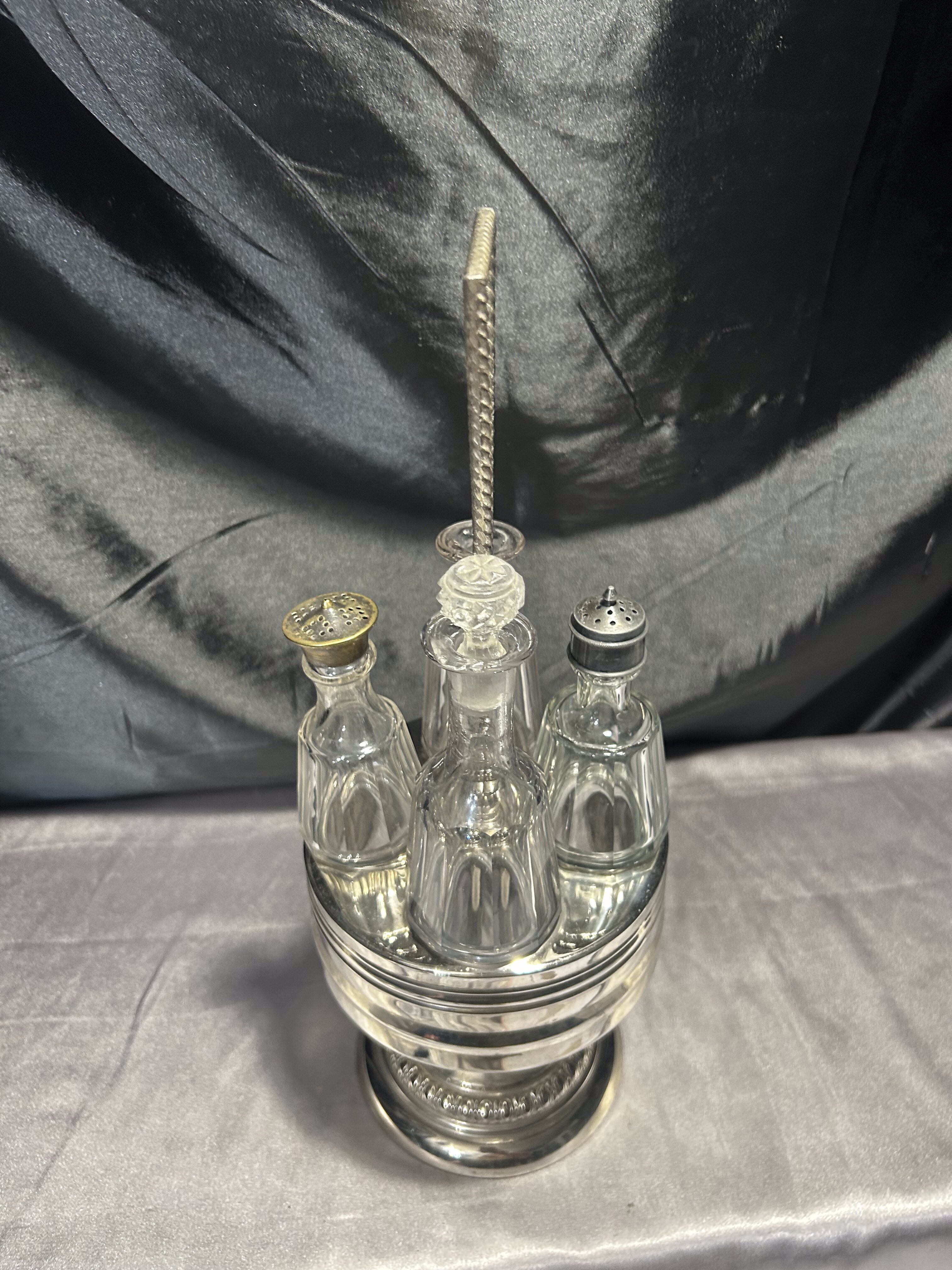 Elegancki zestaw czterech przyprawników wykonanych ze szkła, osadzonych na dekoracyjnej, wysokiej podstawie w srebrnym kolorze. Każdy pojemnik posiada korek lub zakrętkę, a całość prezentuje się niezwykle efektownie – zarówno jako praktyczne wyposażenie kuchni, jak i ozdobny element stołu.