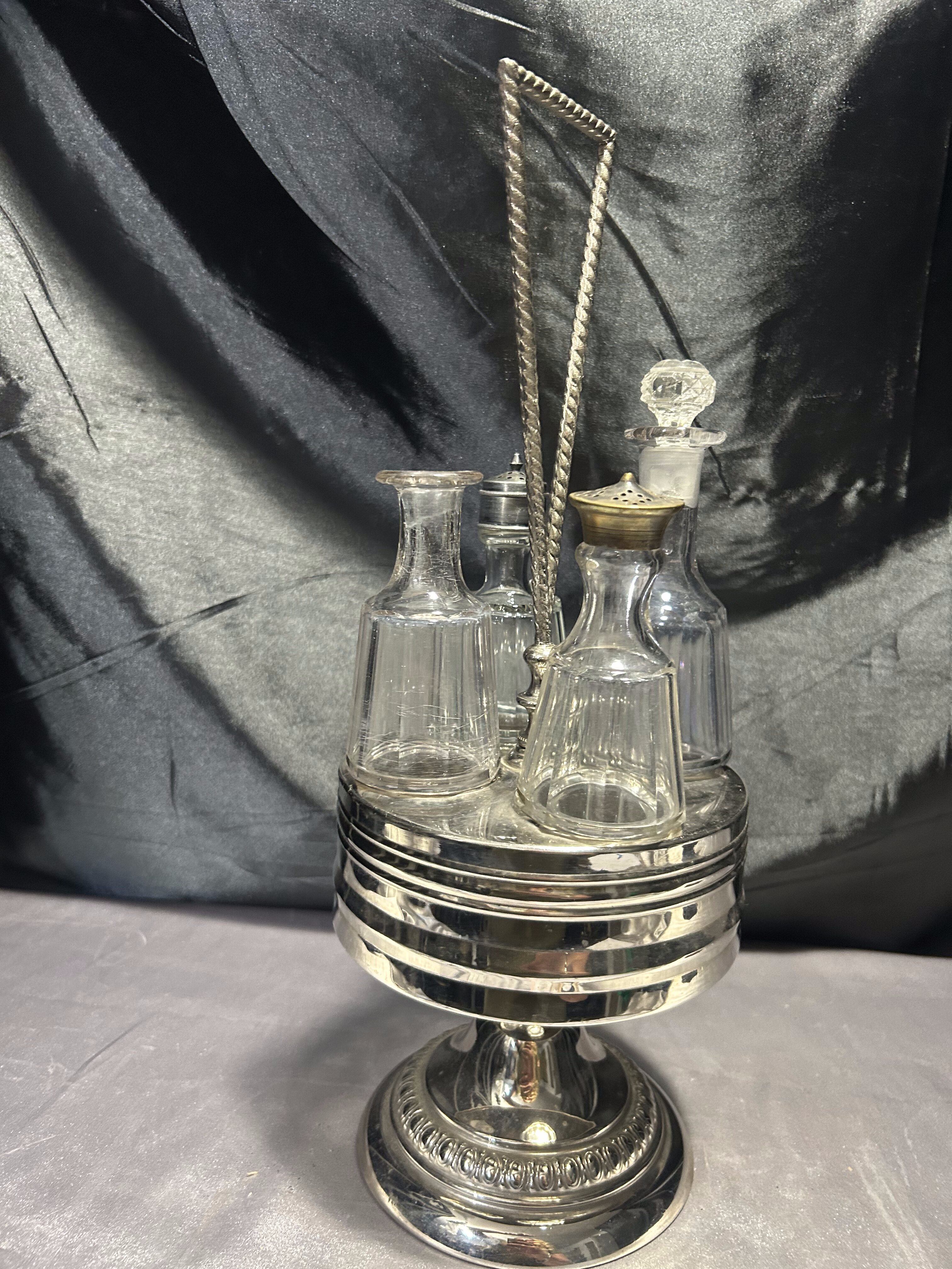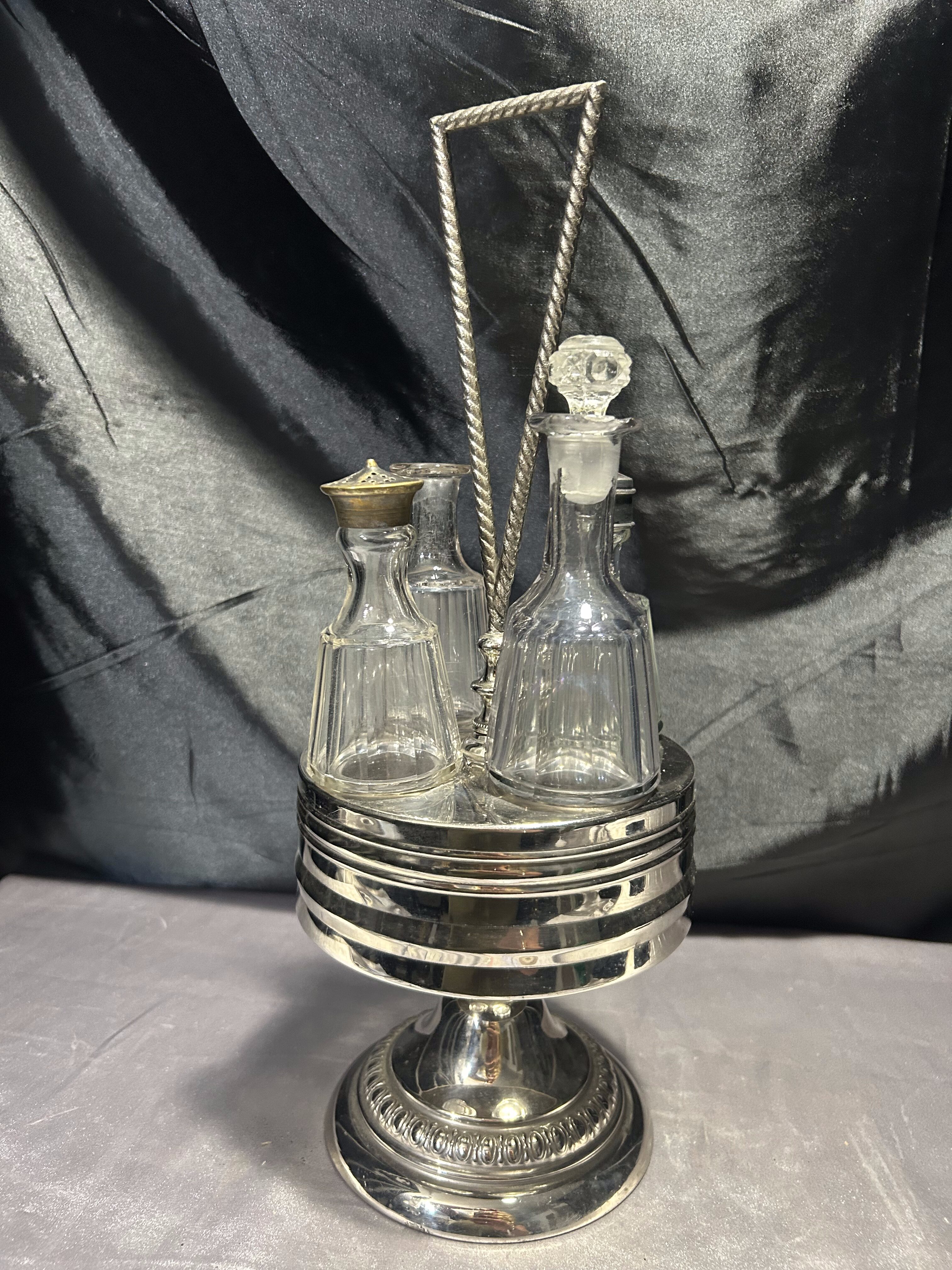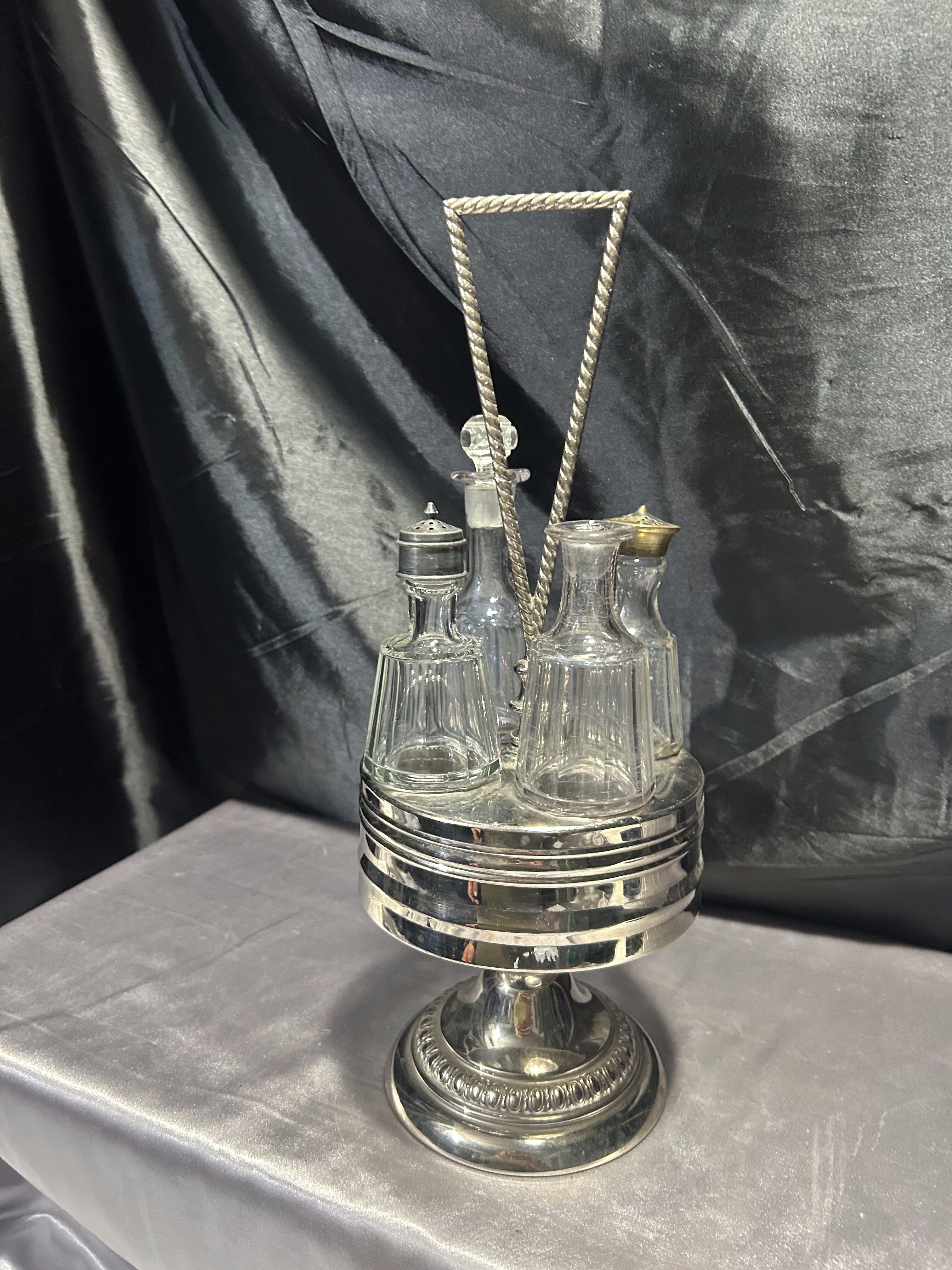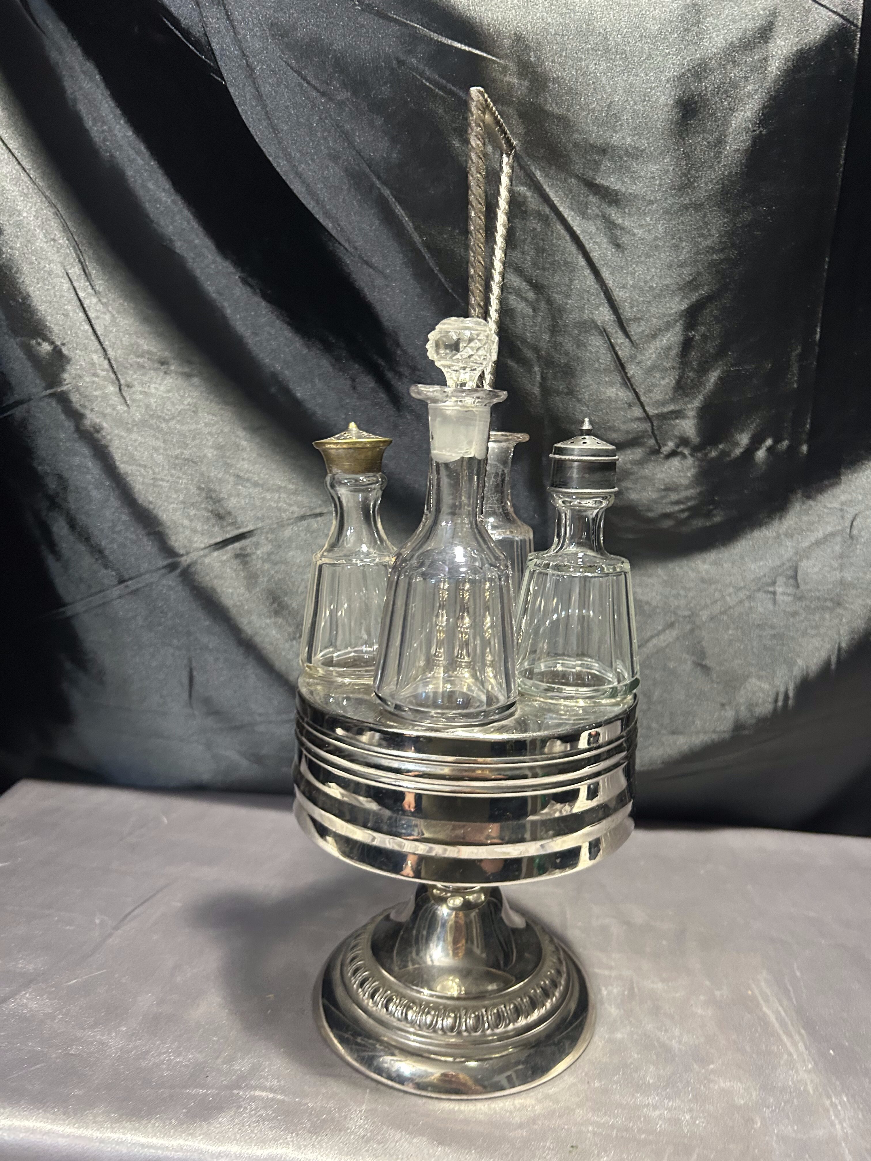 Elegancki zestaw czterech przyprawników wykonanych ze szkła, osadzonych na dekoracyjnej, wysokiej podstawie w srebrnym kolorze. Każdy pojemnik posiada korek lub zakrętkę, a całość prezentuje się niezwykle efektownie – zarówno jako praktyczne wyposażenie kuchni, jak i ozdobny element stołu.