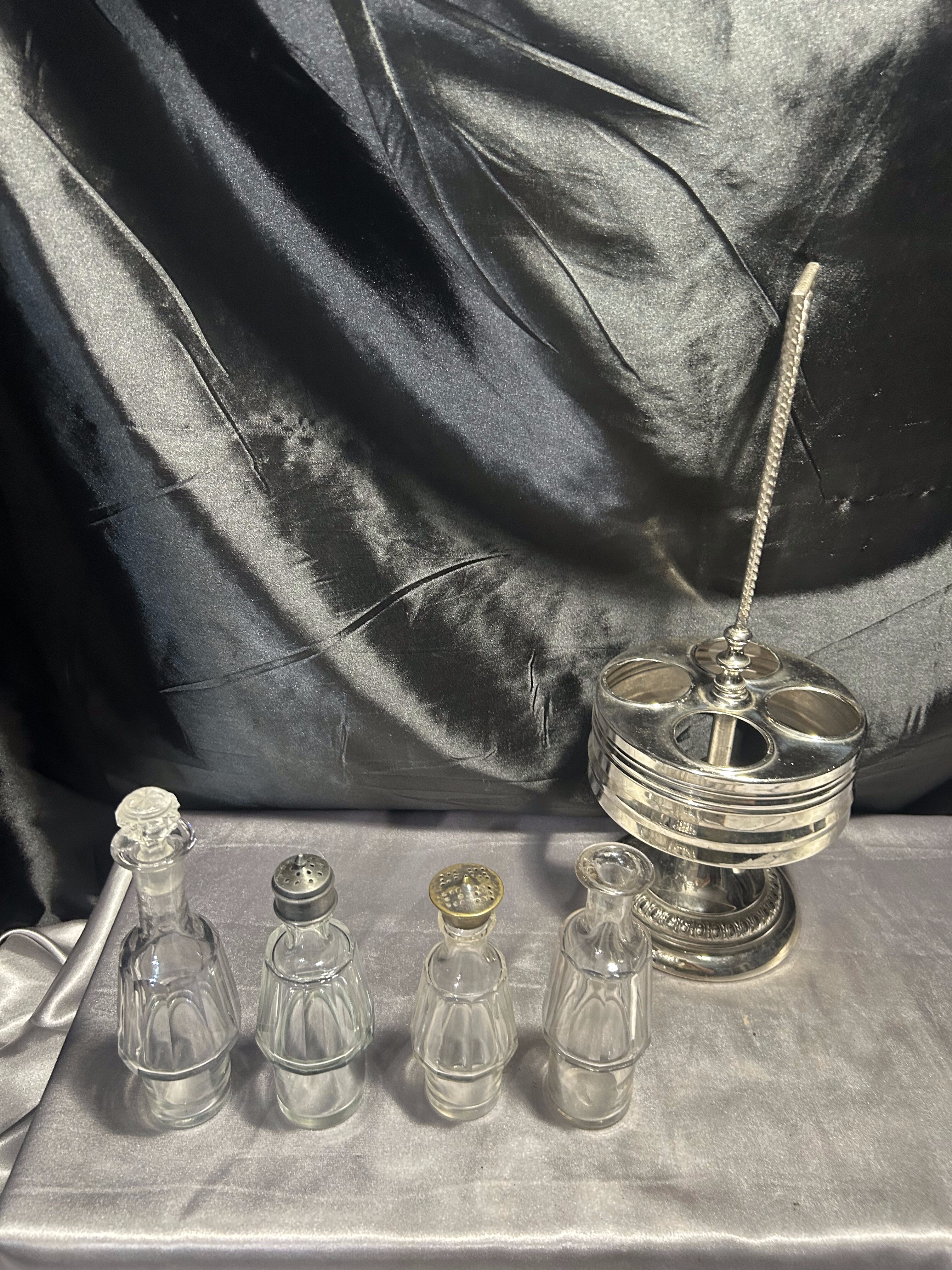 - Zestaw czterech szklanych przyprawników – na ozdobnej podstawie – vintage