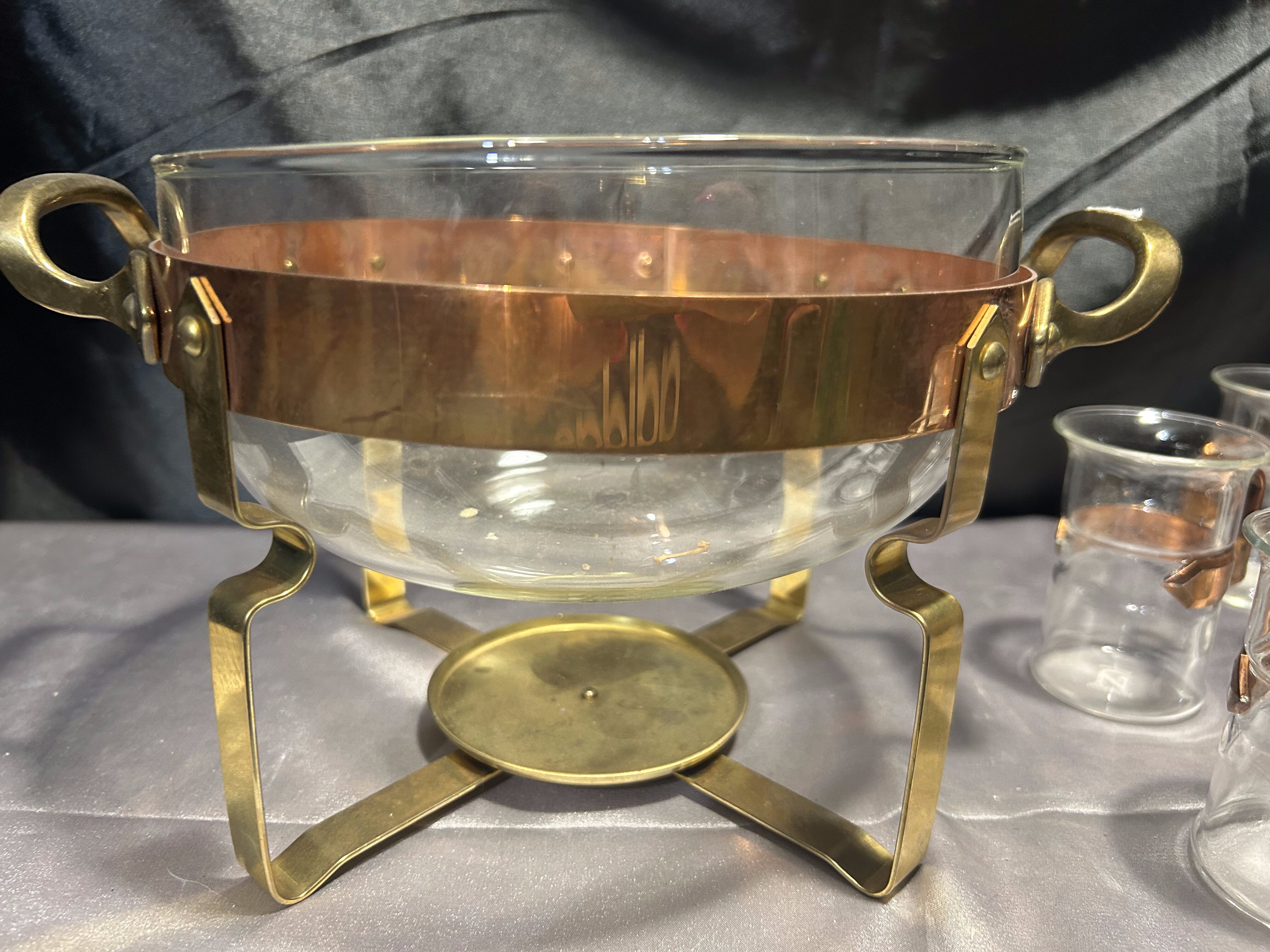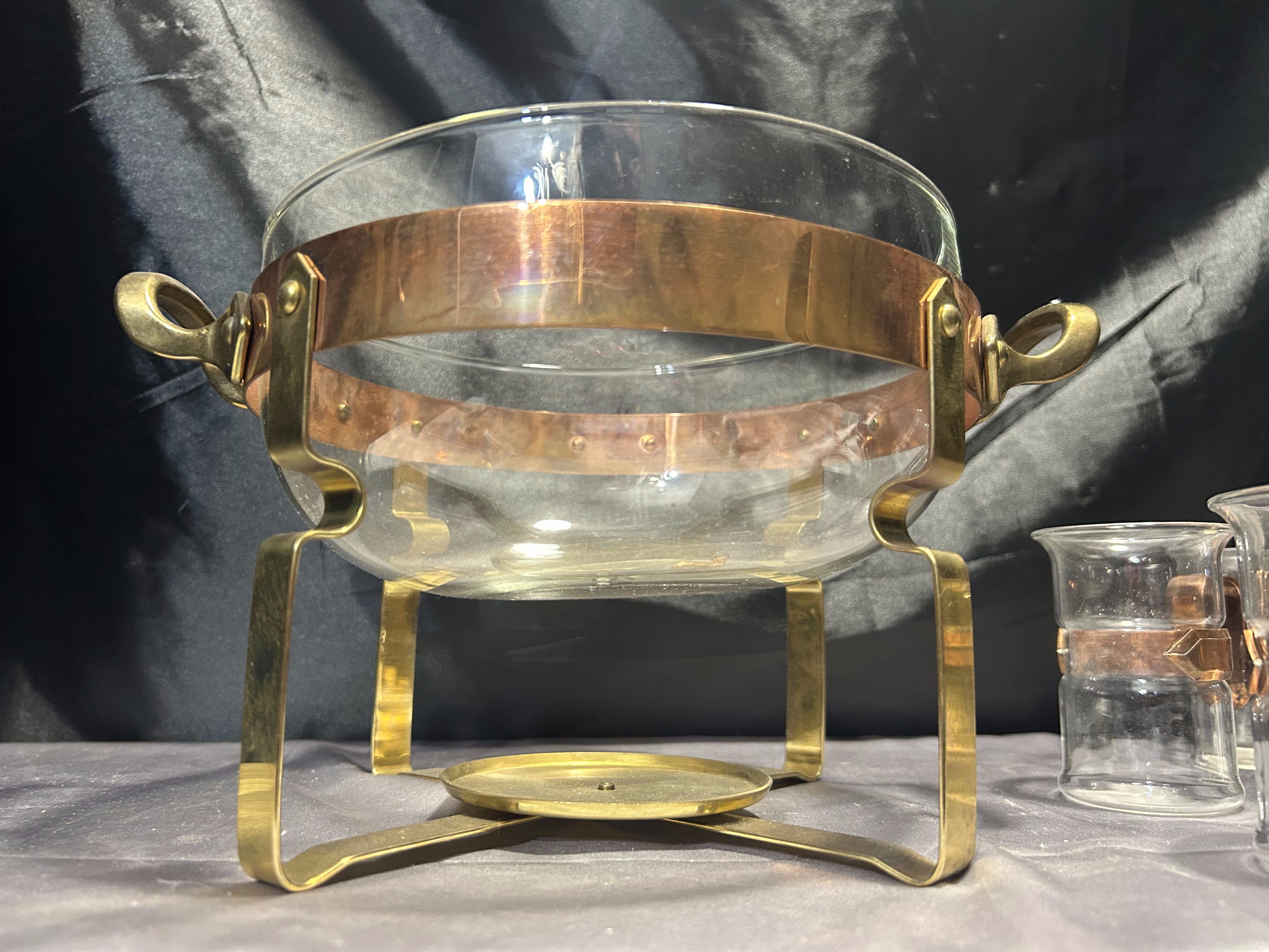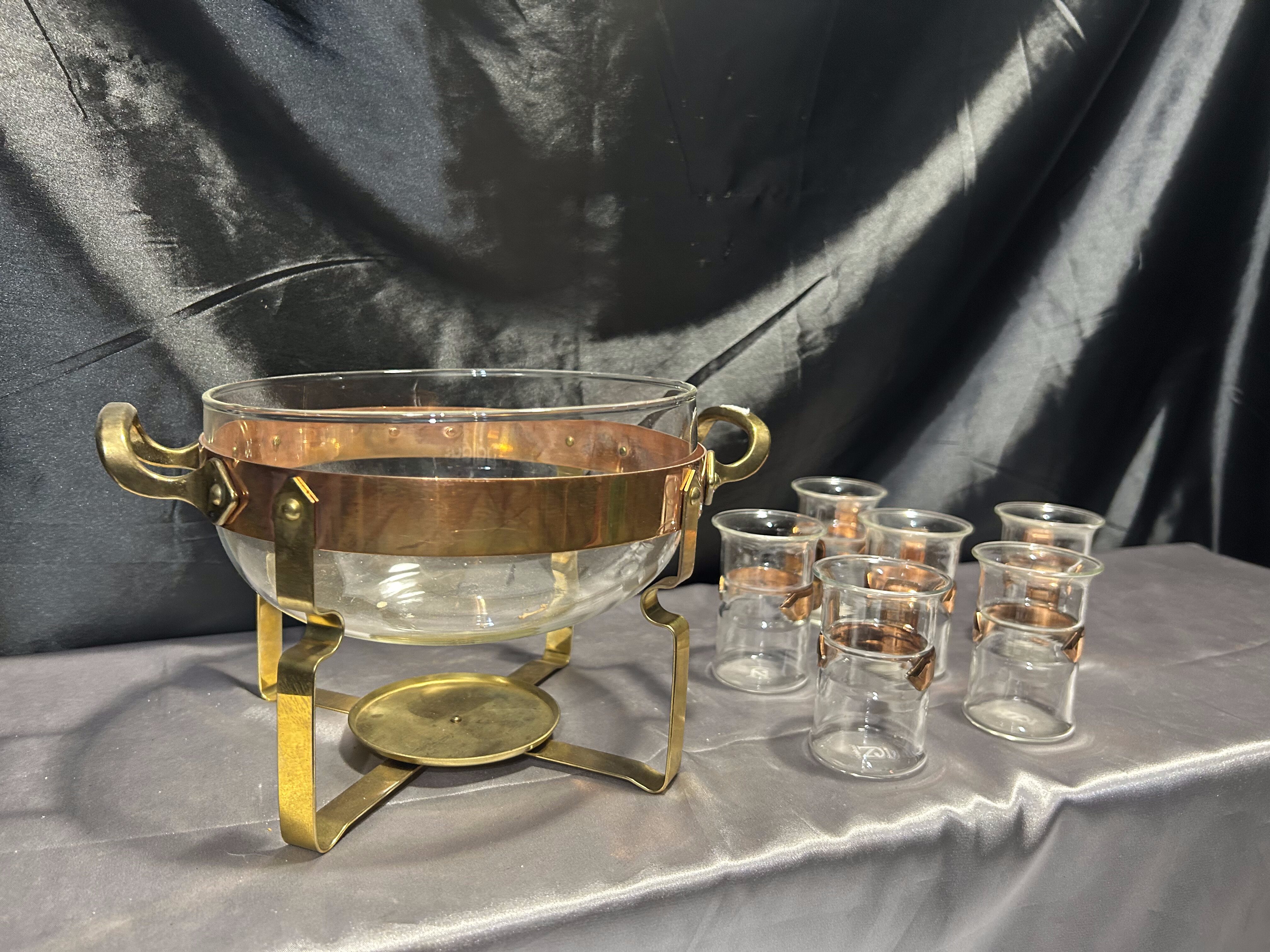 Na sprzedaż wyjątkowy zestaw renomowanej szwedzkiej marki Nilsjohan, składający się ze szklanego garnka na stelażu oraz 6 szklanek z miedzianymi uchwytami. Całość osadzona na eleganckim stojaku z miedzi i mosiądzu, wyposażonym w miejsce na podgrzewacz. Idealny do serwowania herbaty, ponczu lub grzanego wina w stylowy sposób.
