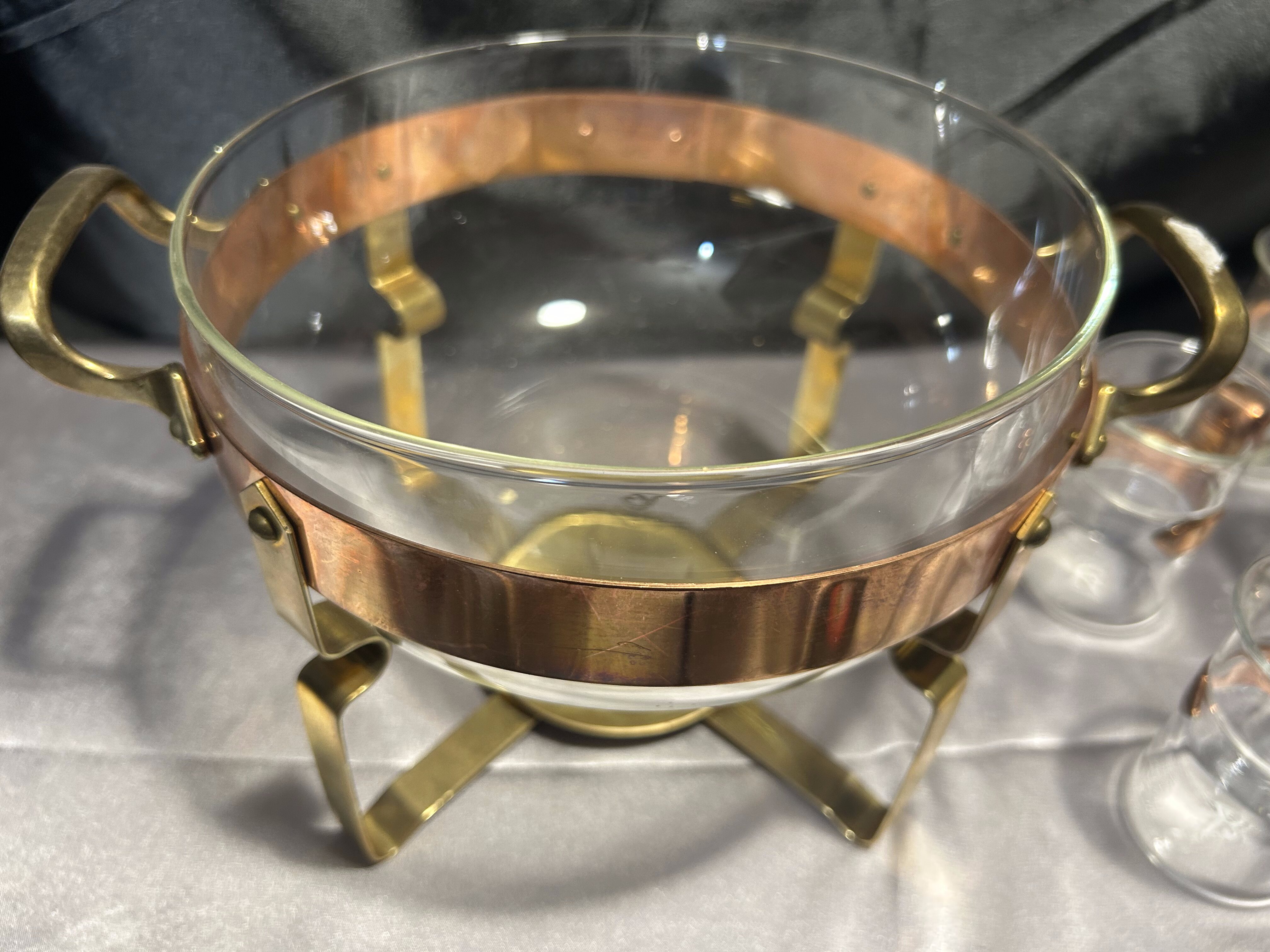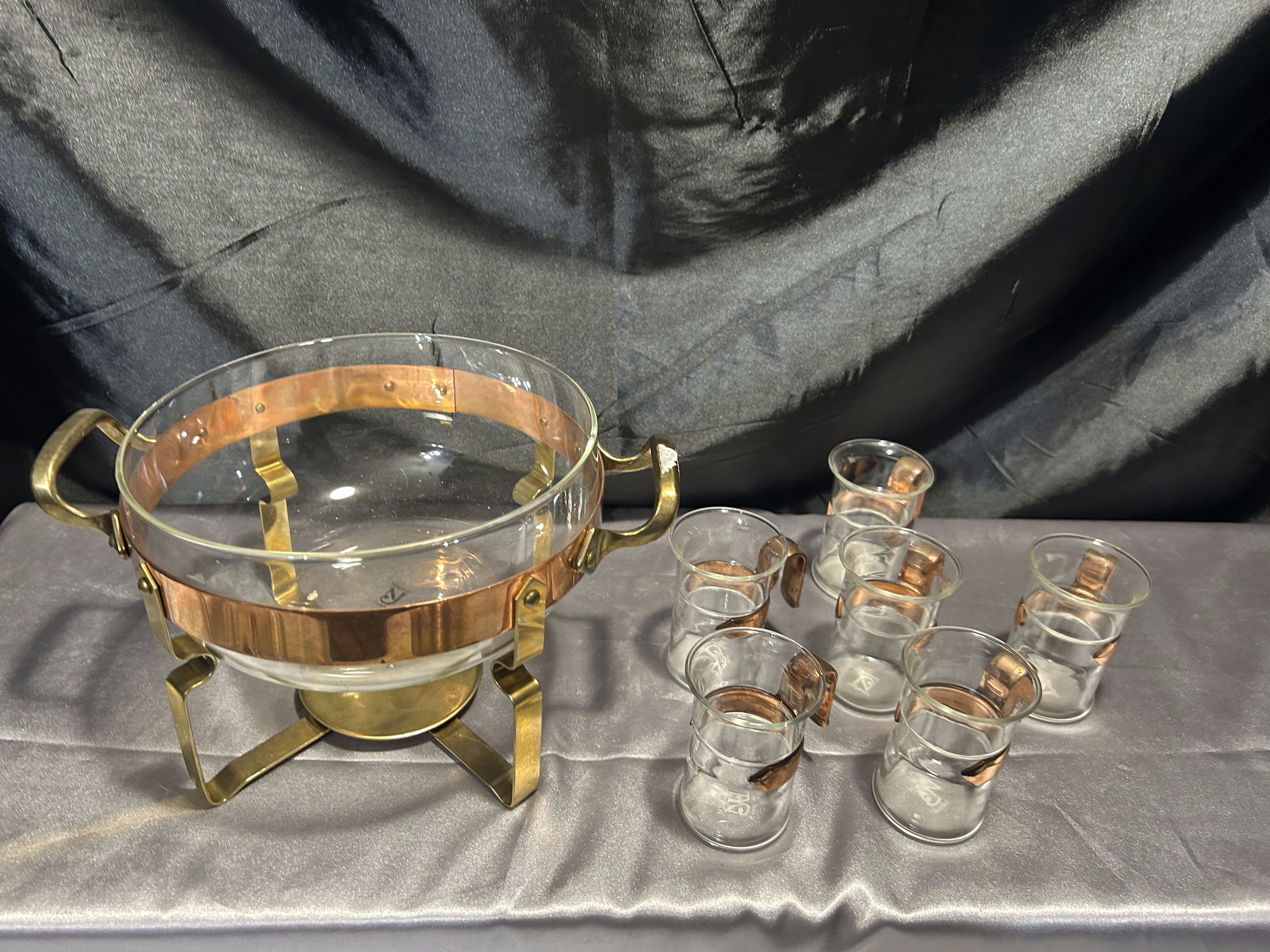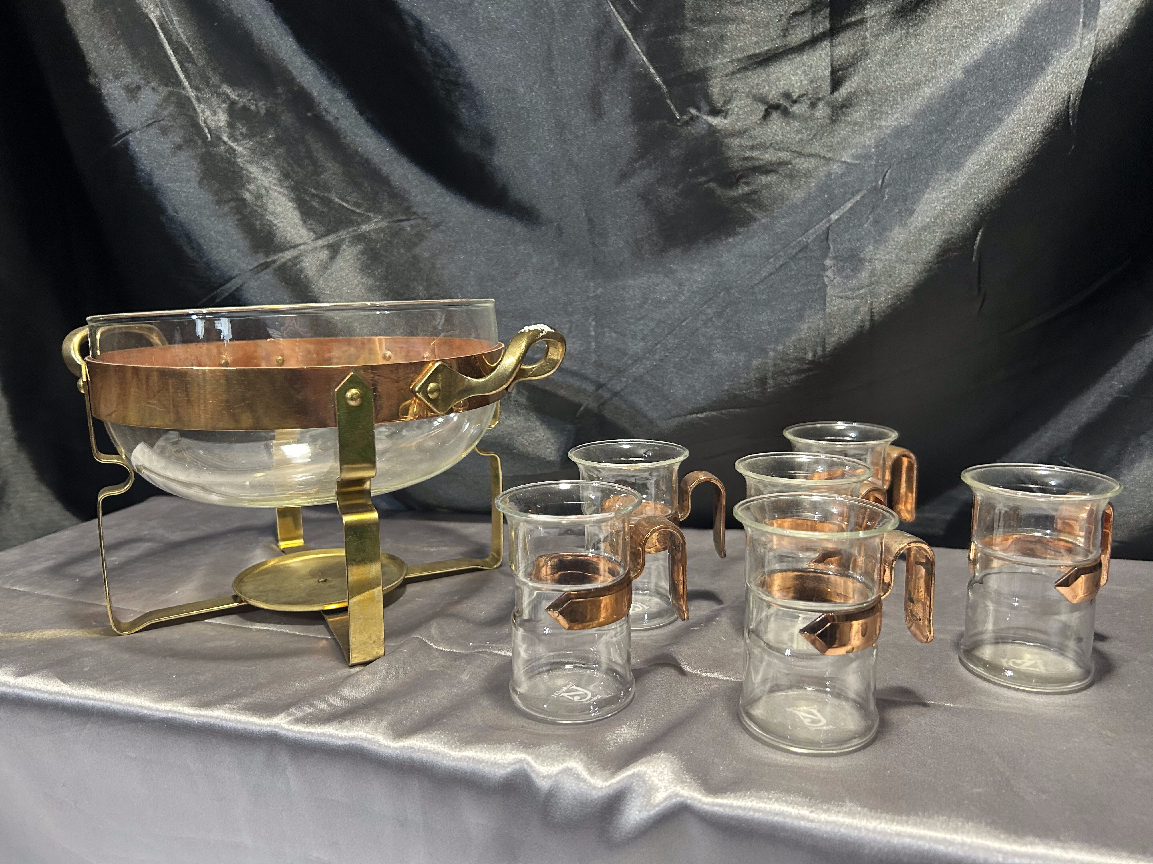 Na sprzedaż wyjątkowy zestaw renomowanej szwedzkiej marki Nilsjohan, składający się ze szklanego garnka na stelażu oraz 6 szklanek z miedzianymi uchwytami. Całość osadzona na eleganckim stojaku z miedzi i mosiądzu, wyposażonym w miejsce na podgrzewacz. Idealny do serwowania herbaty, ponczu lub grzanego wina w stylowy sposób.
