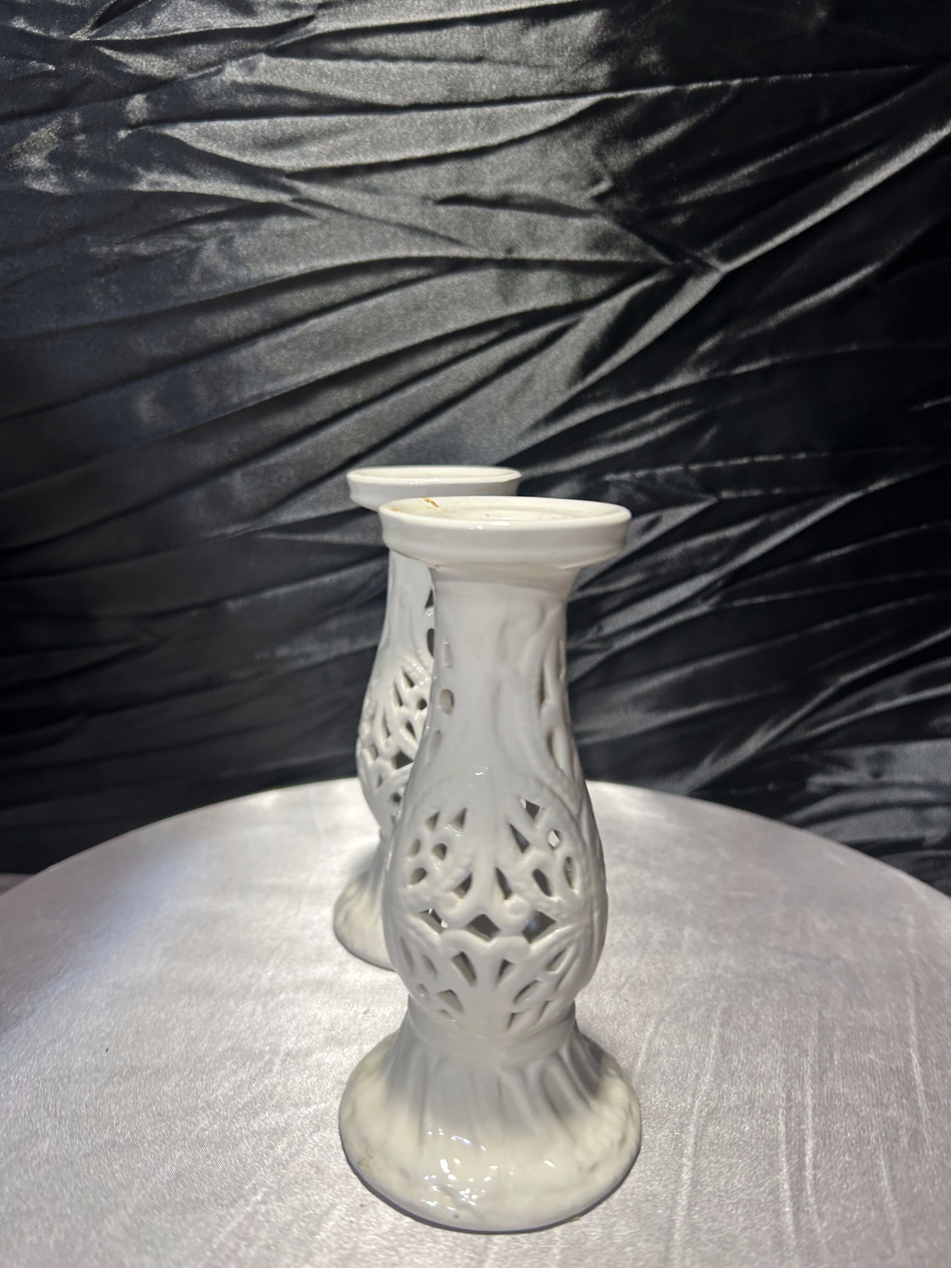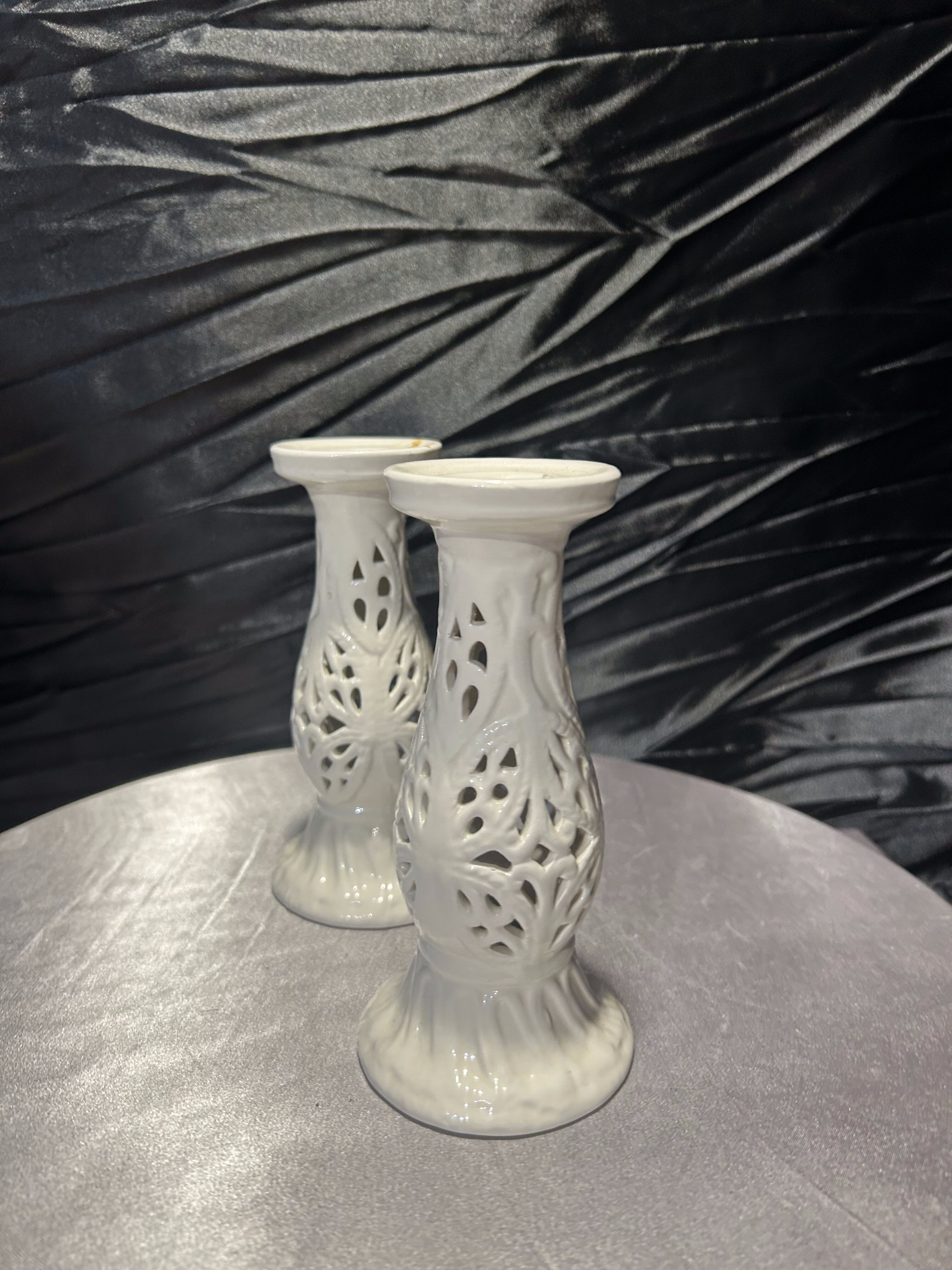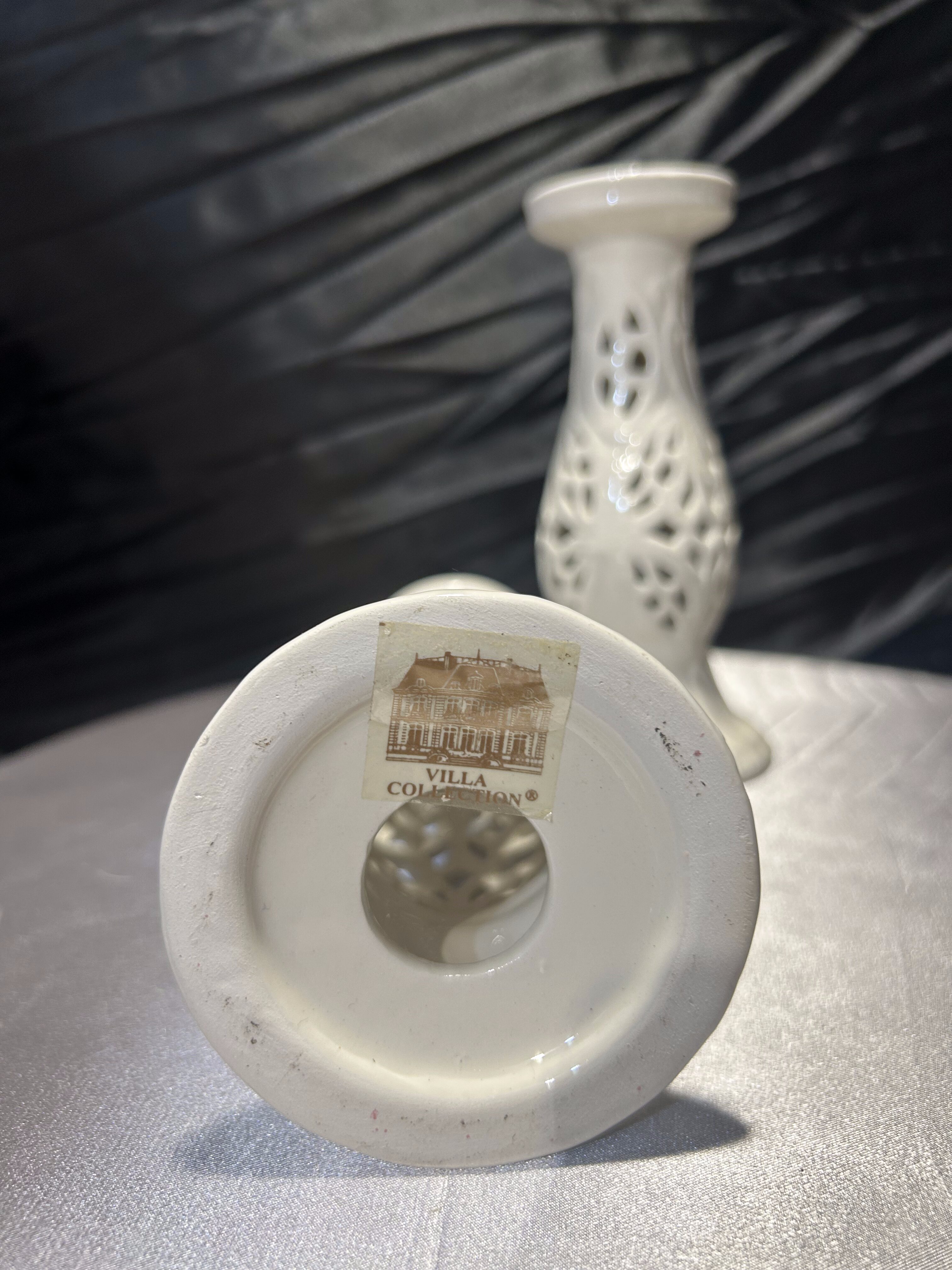 - Zestaw dwóch ażurowych świeczników ceramicznych – Villa Collection – kolor ecru – na cienkie świece