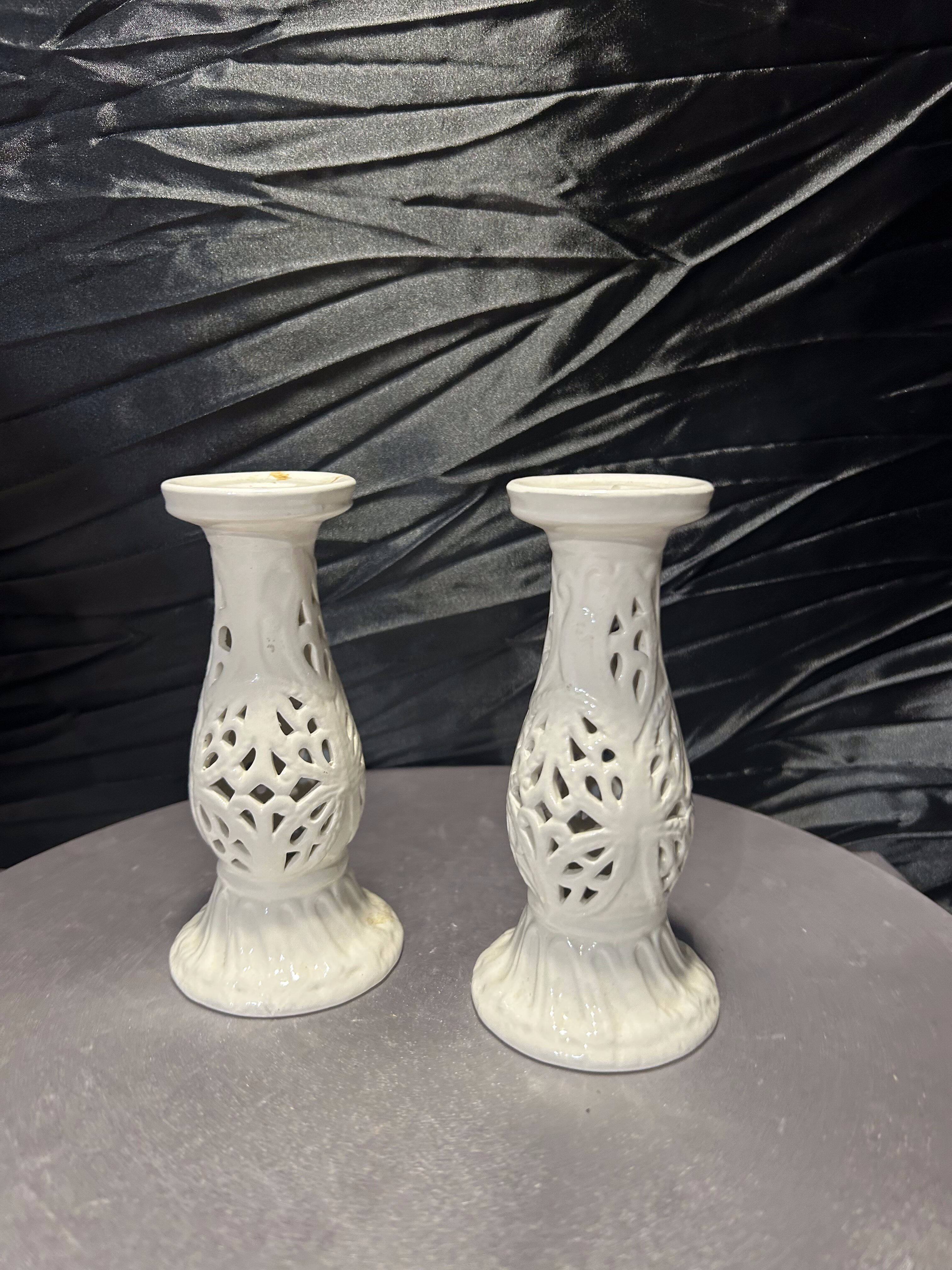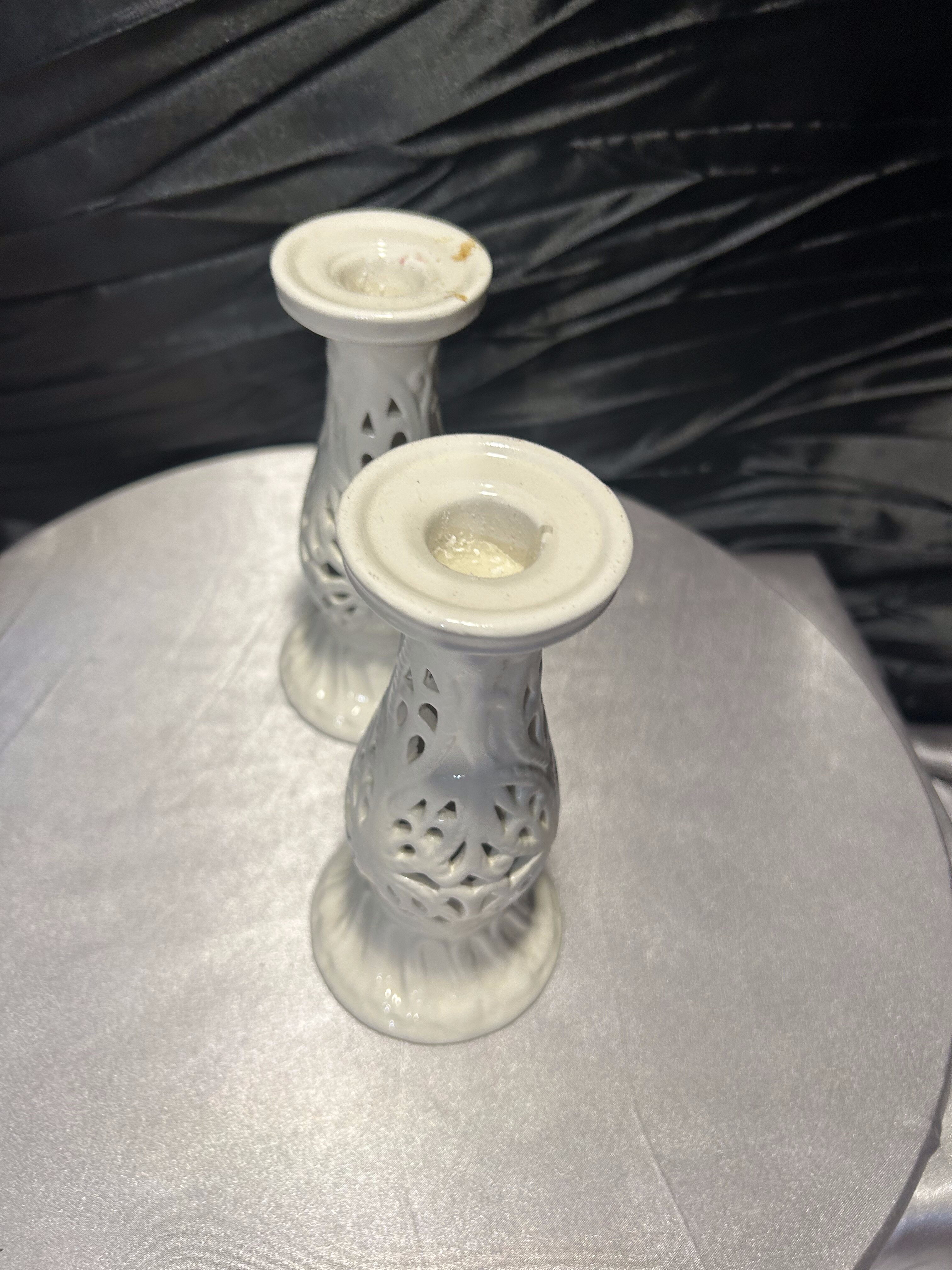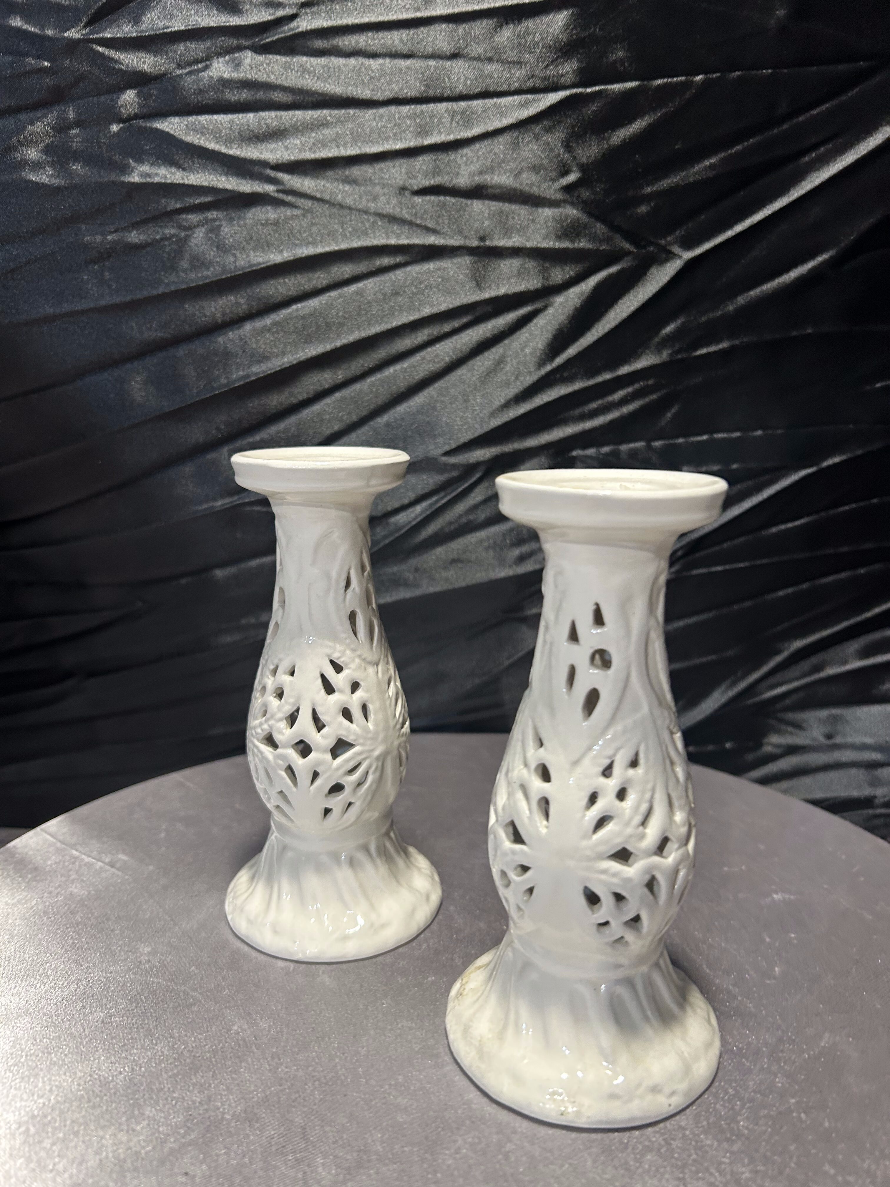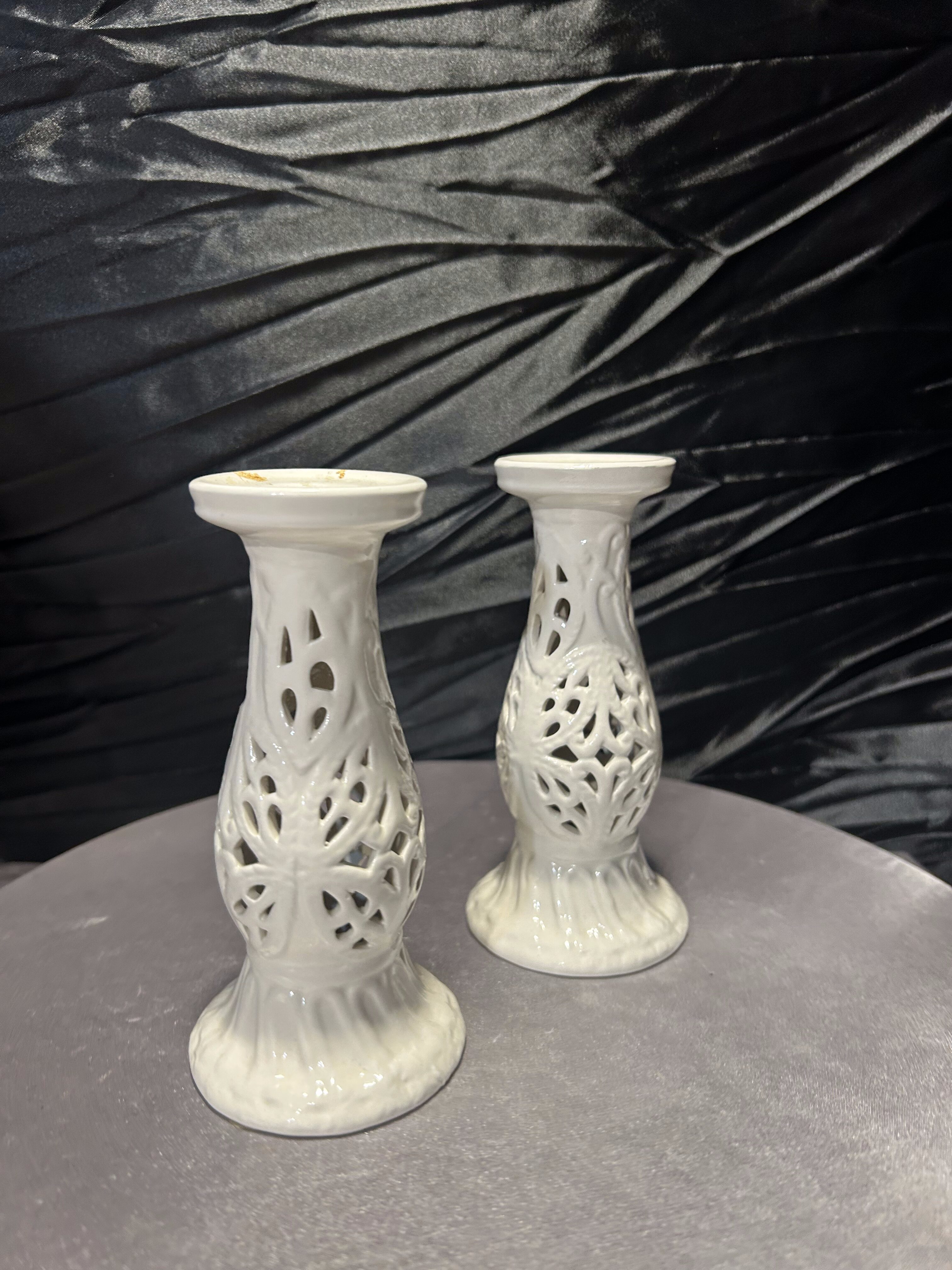 - Zestaw dwóch ażurowych świeczników ceramicznych – Villa Collection – kolor ecru – na cienkie świece
