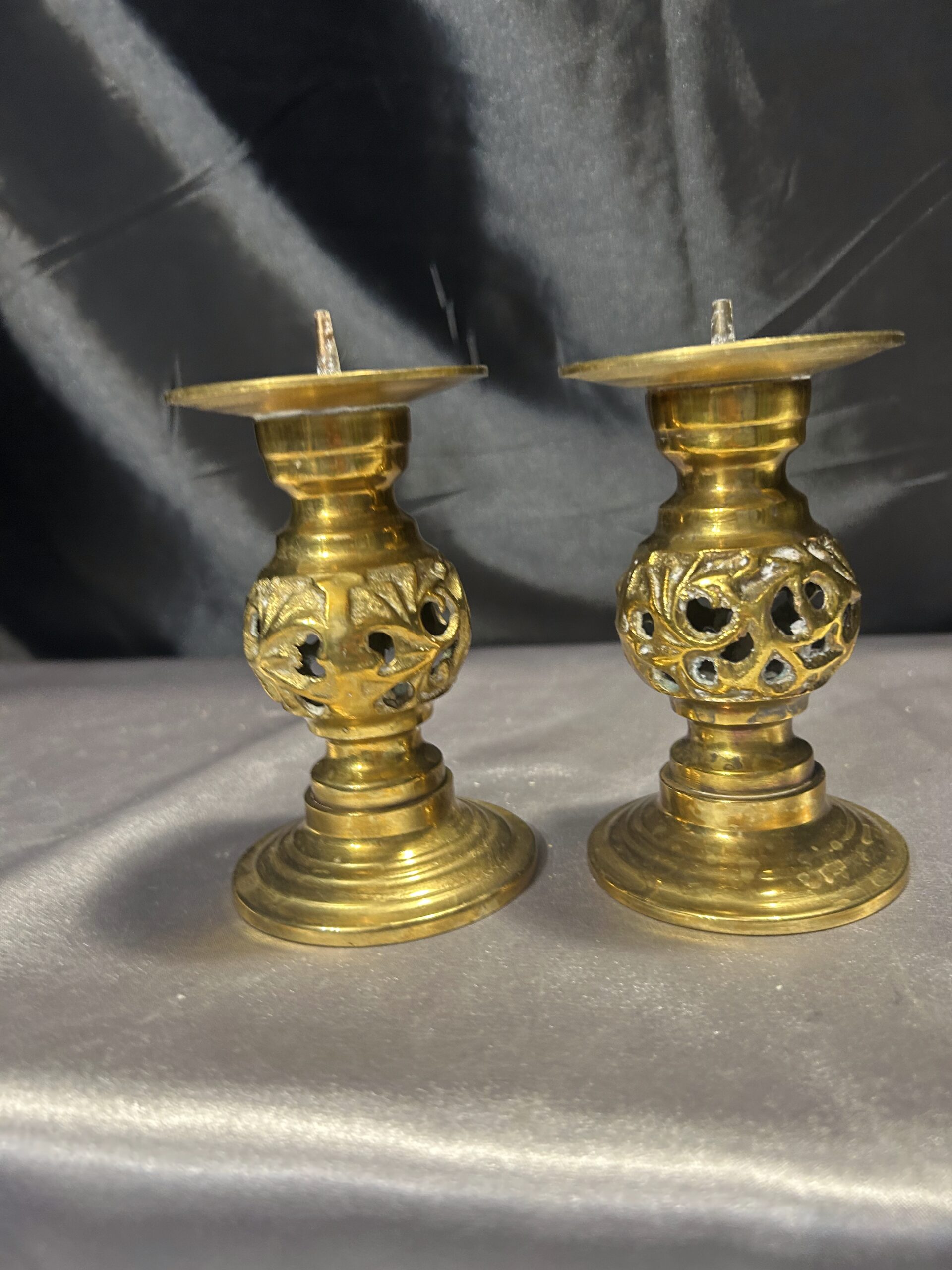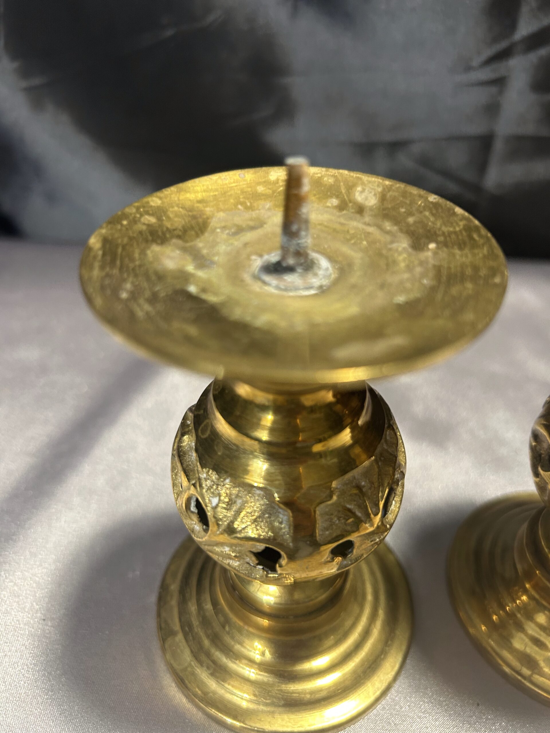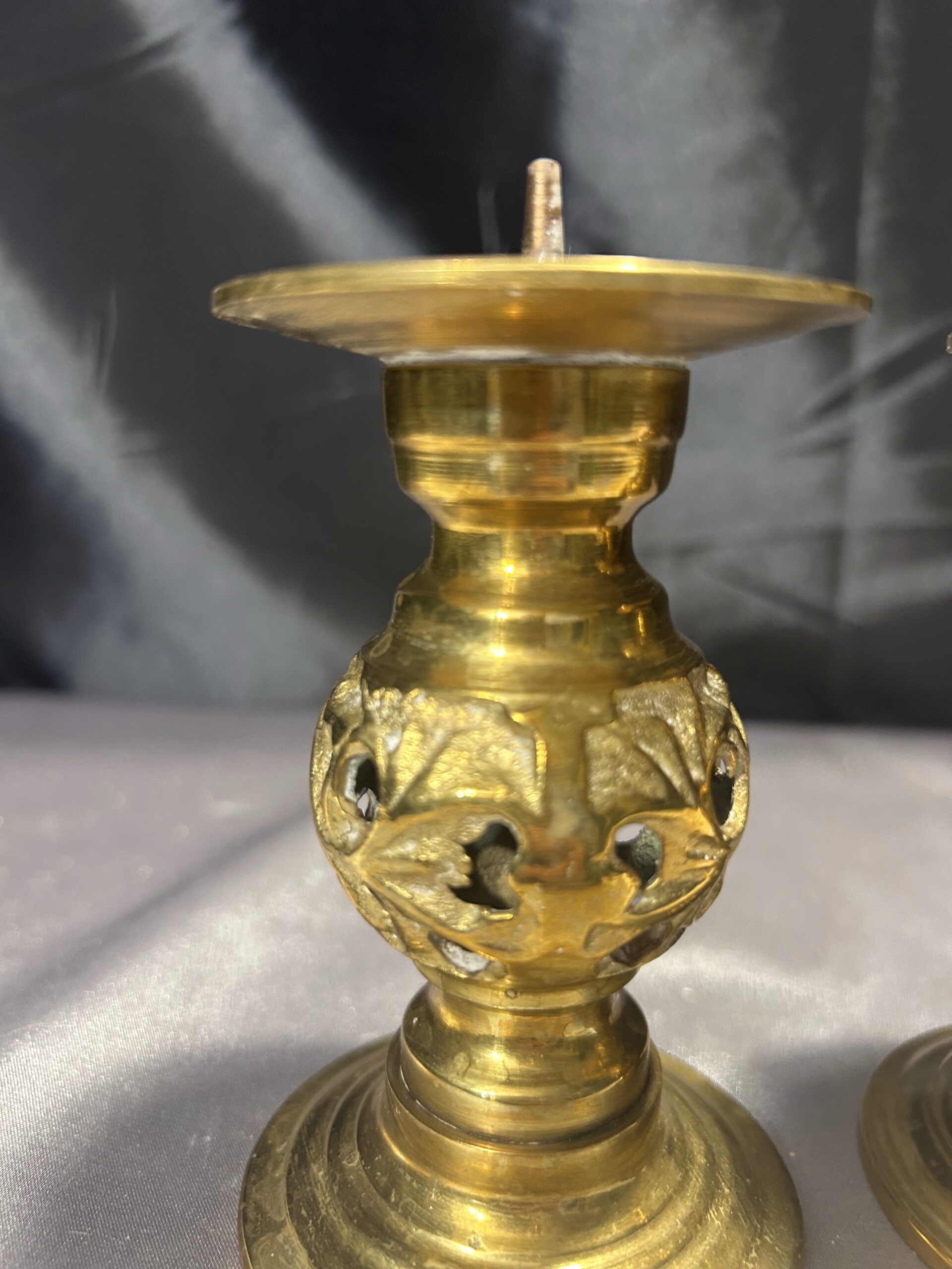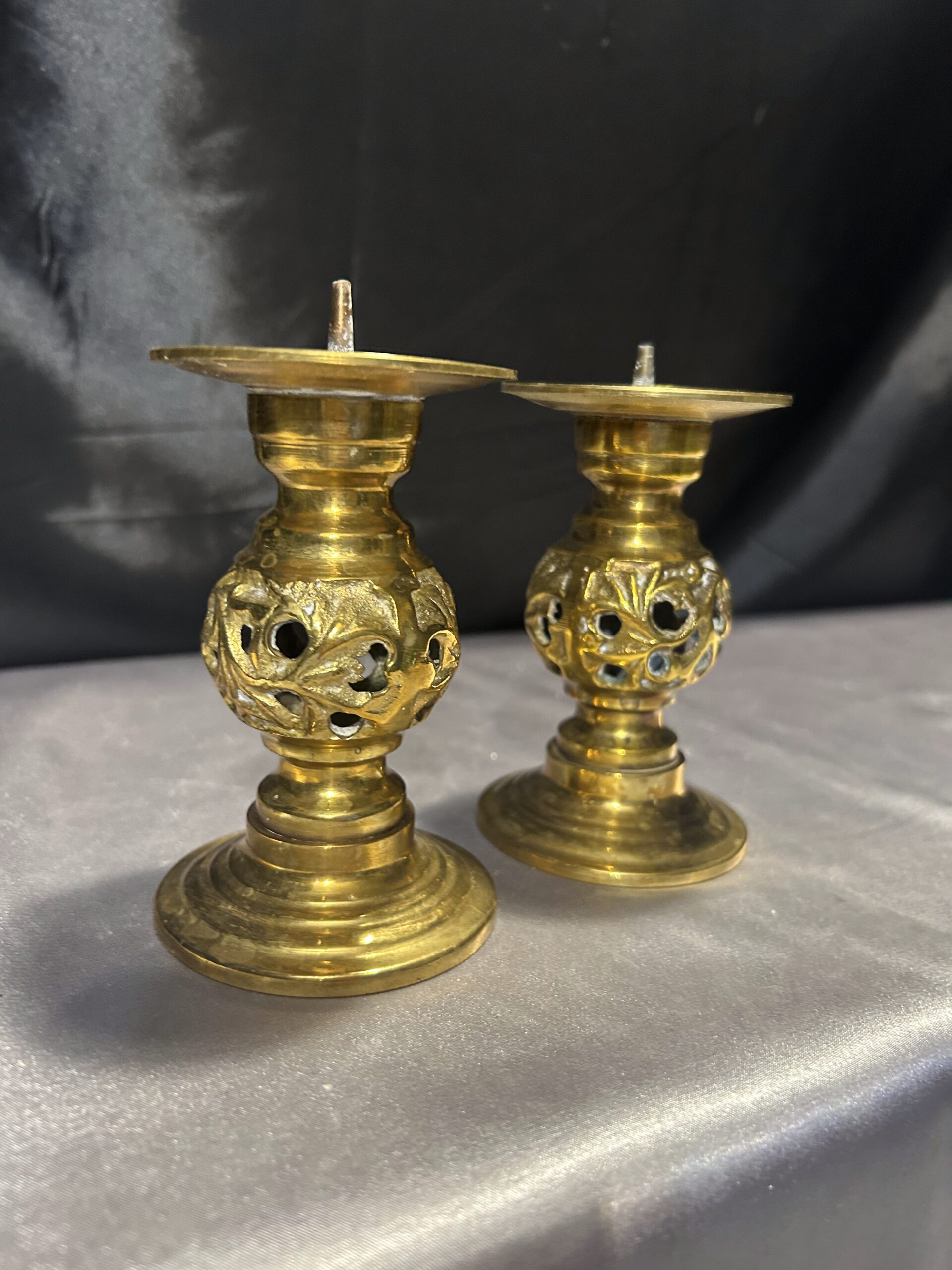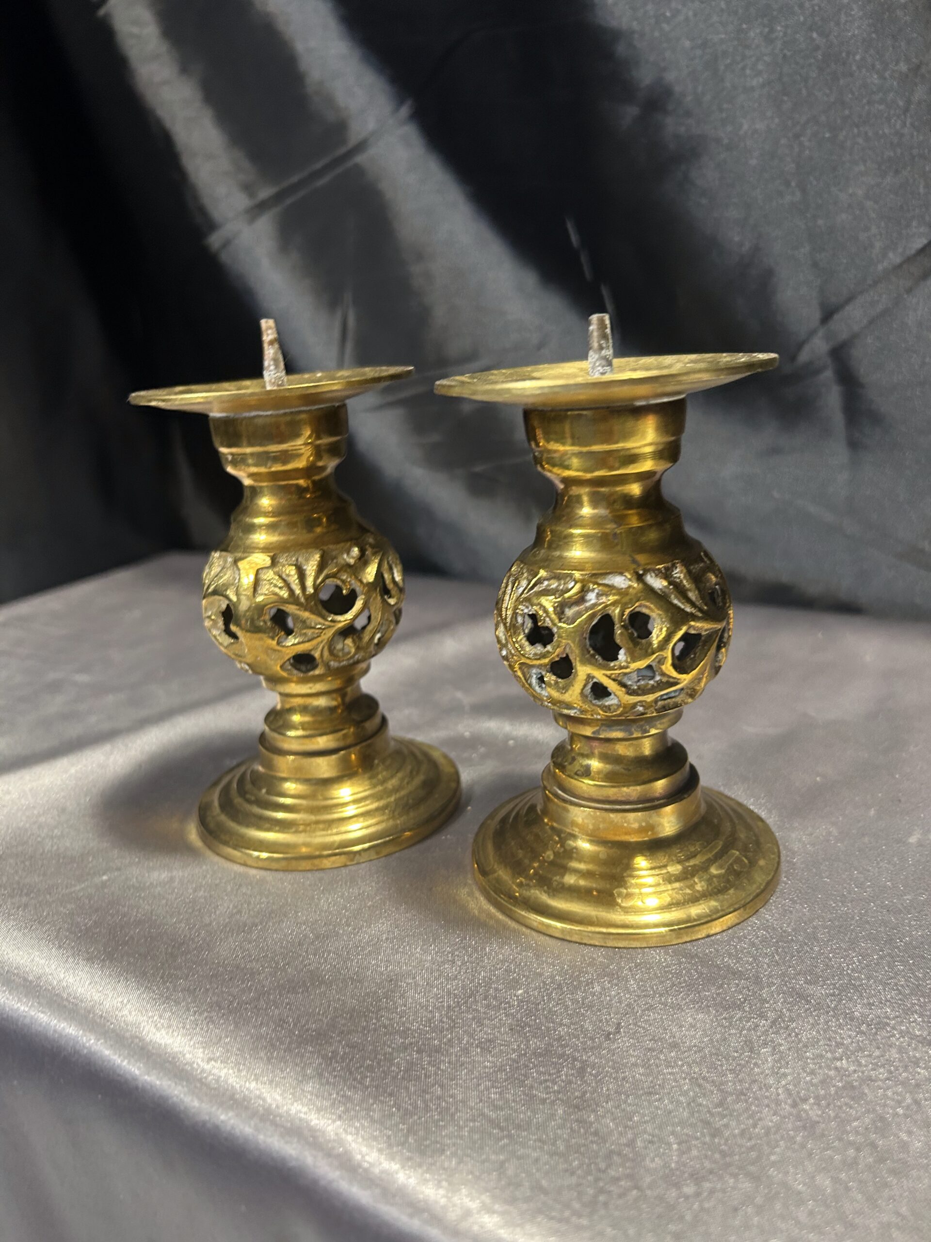 - Zestaw Dwóch Ażurowych Świeczników z Mosiądzu – Lichtarze ze Szpikulcami
