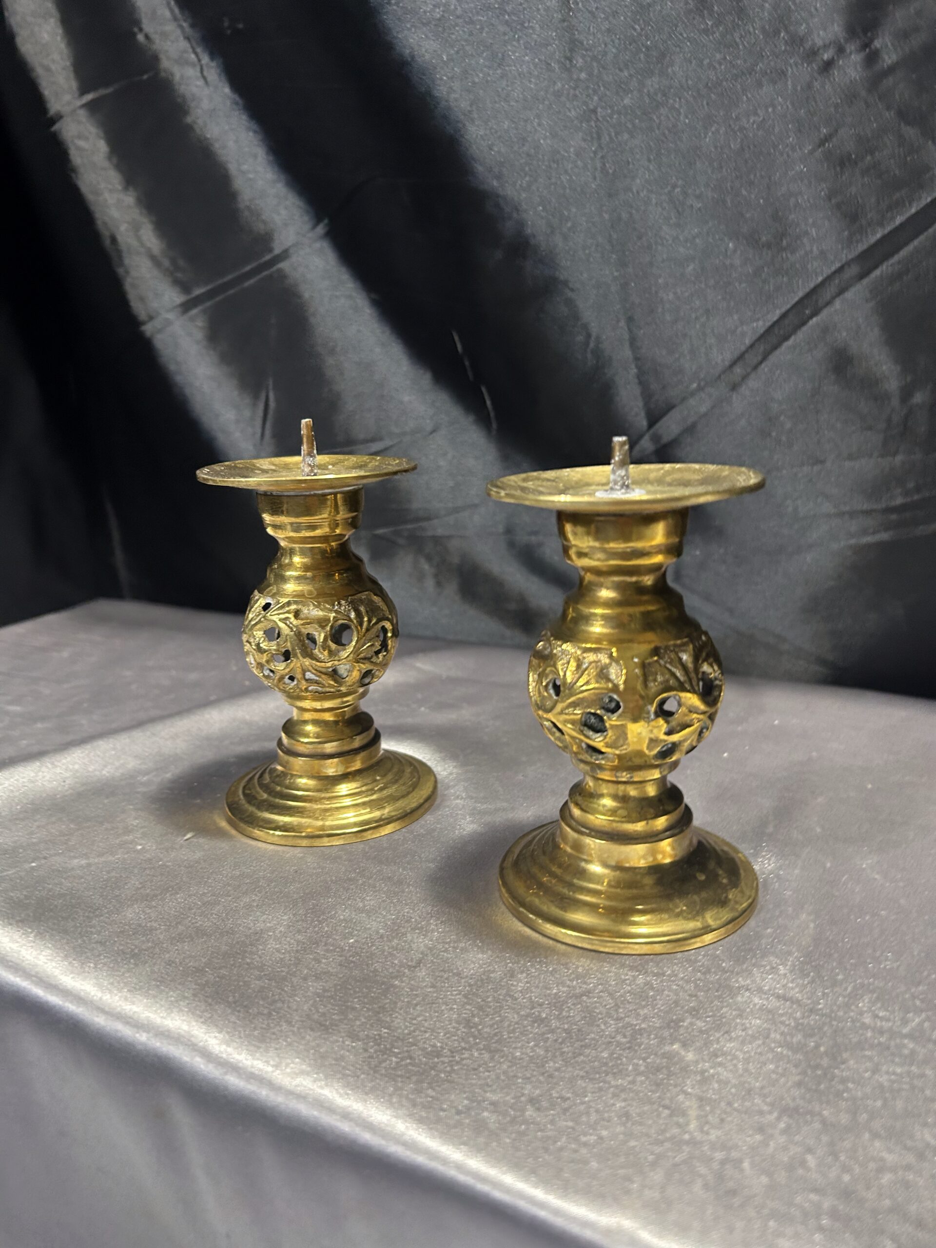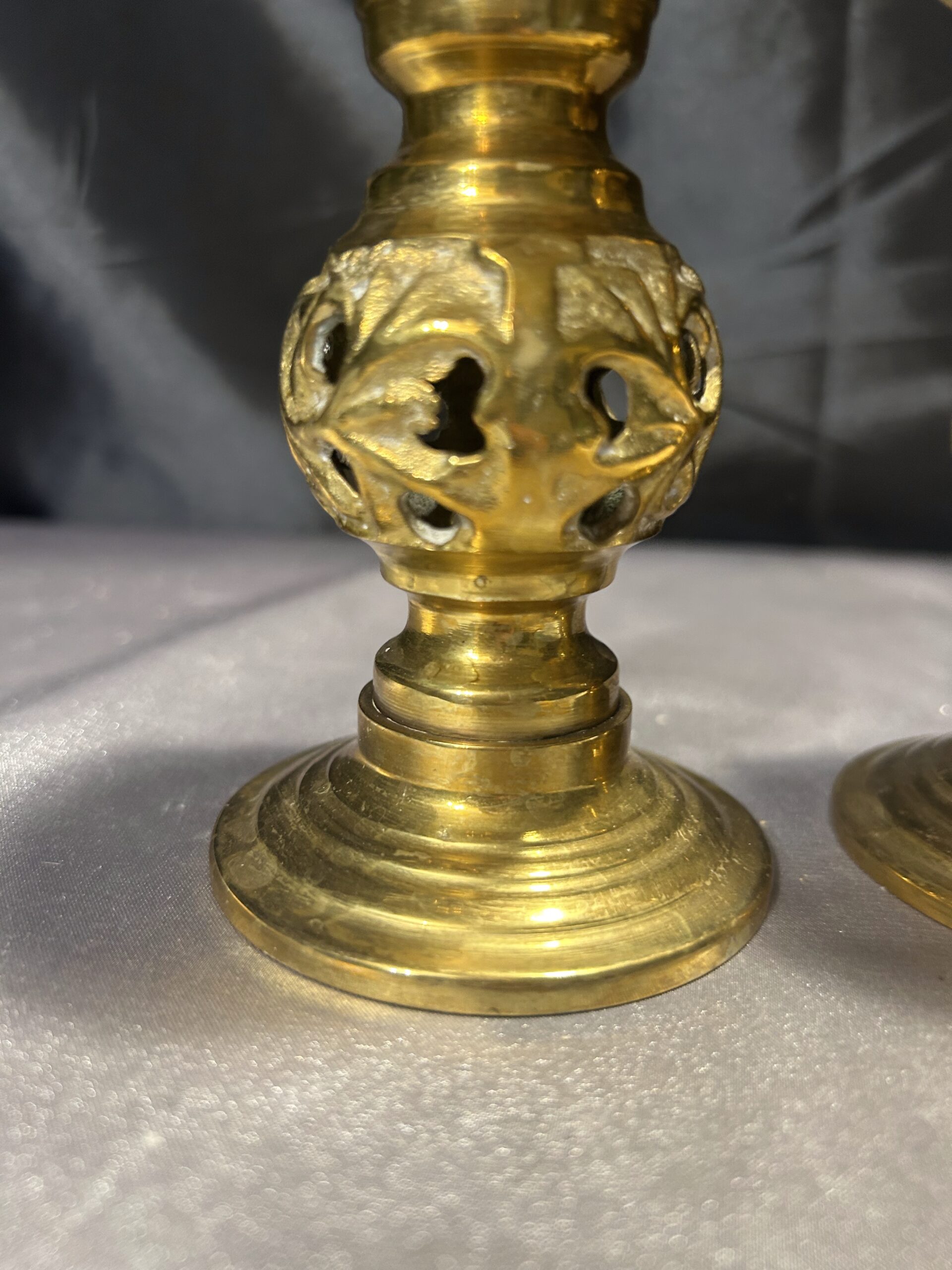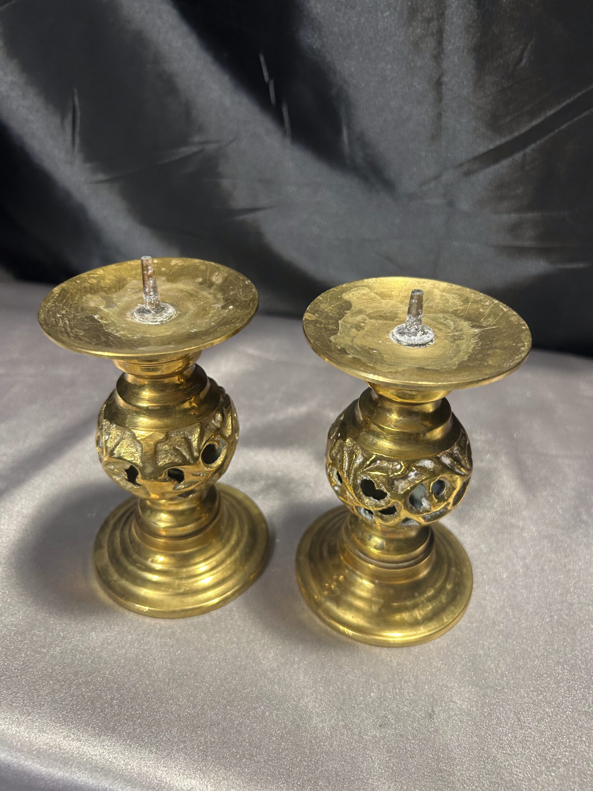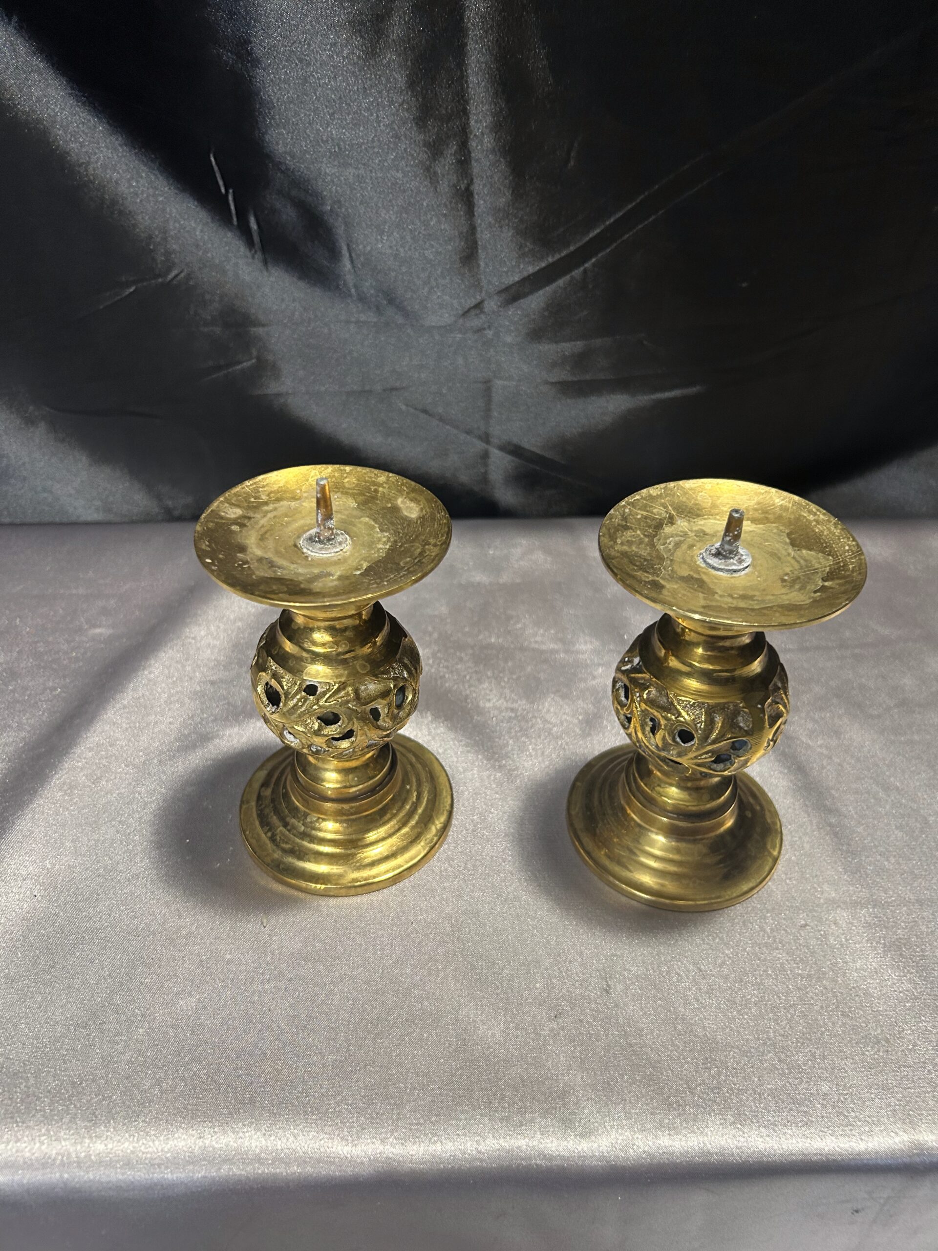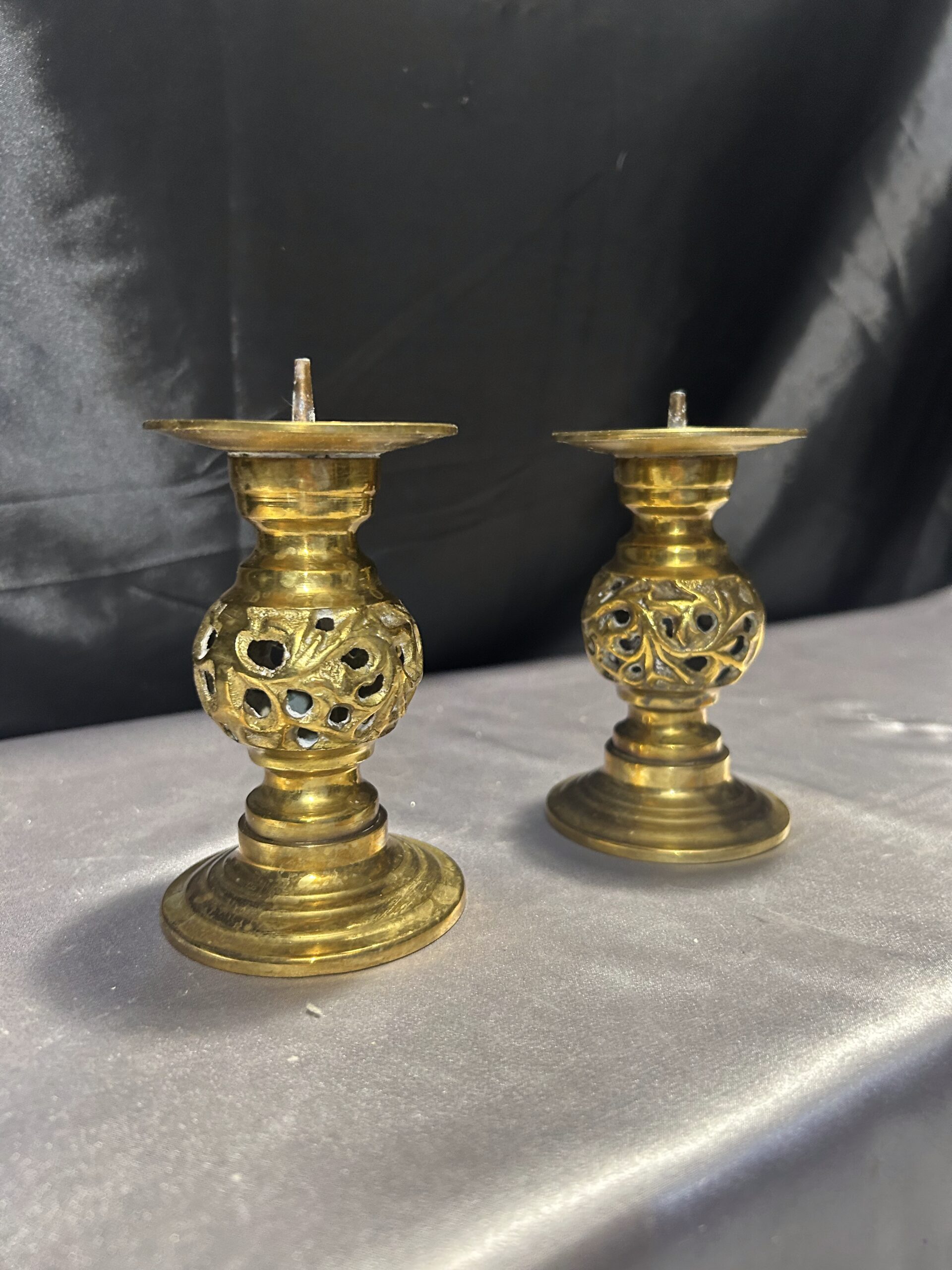 - Zestaw Dwóch Ażurowych Świeczników z Mosiądzu – Lichtarze ze Szpikulcami