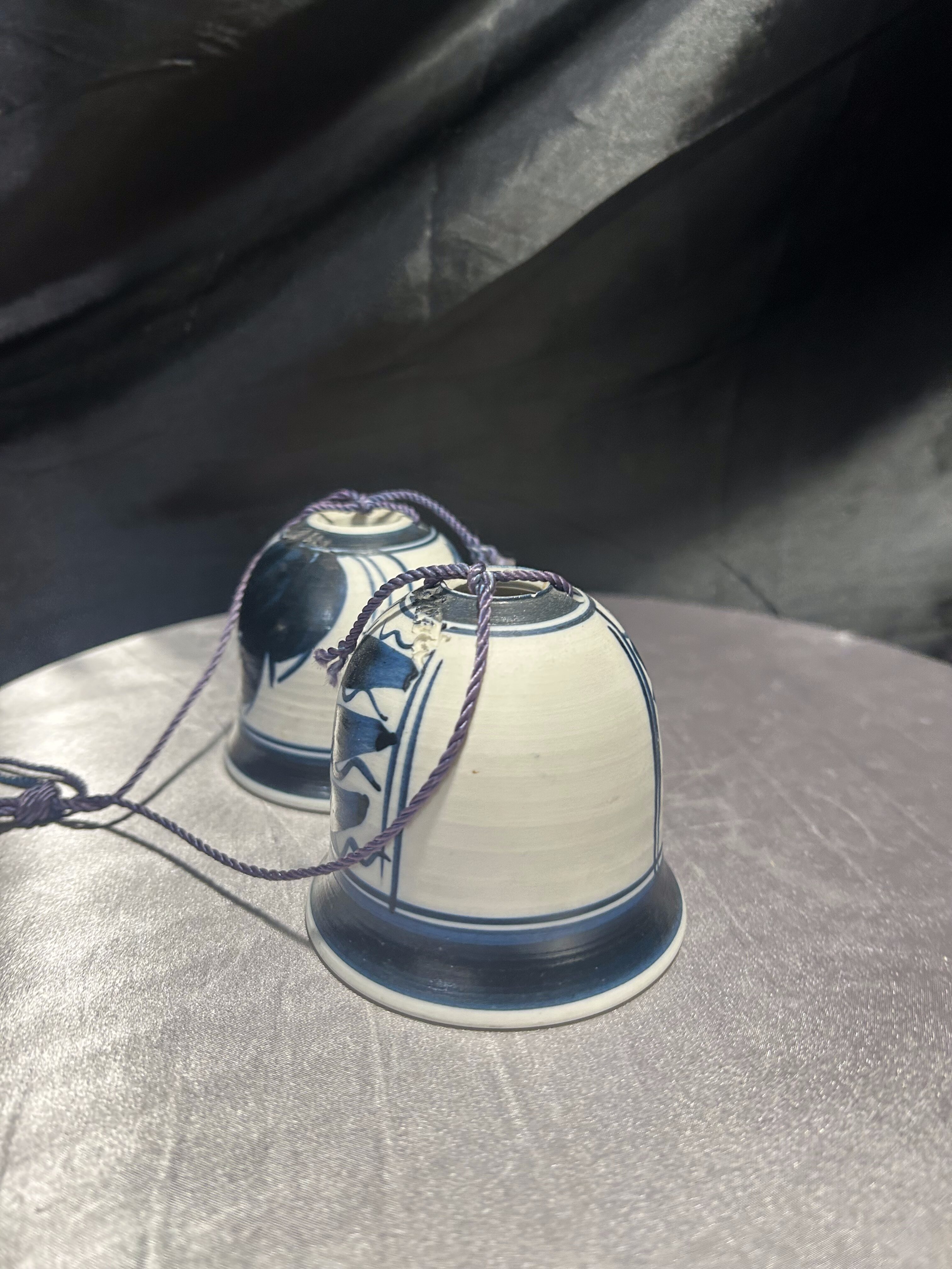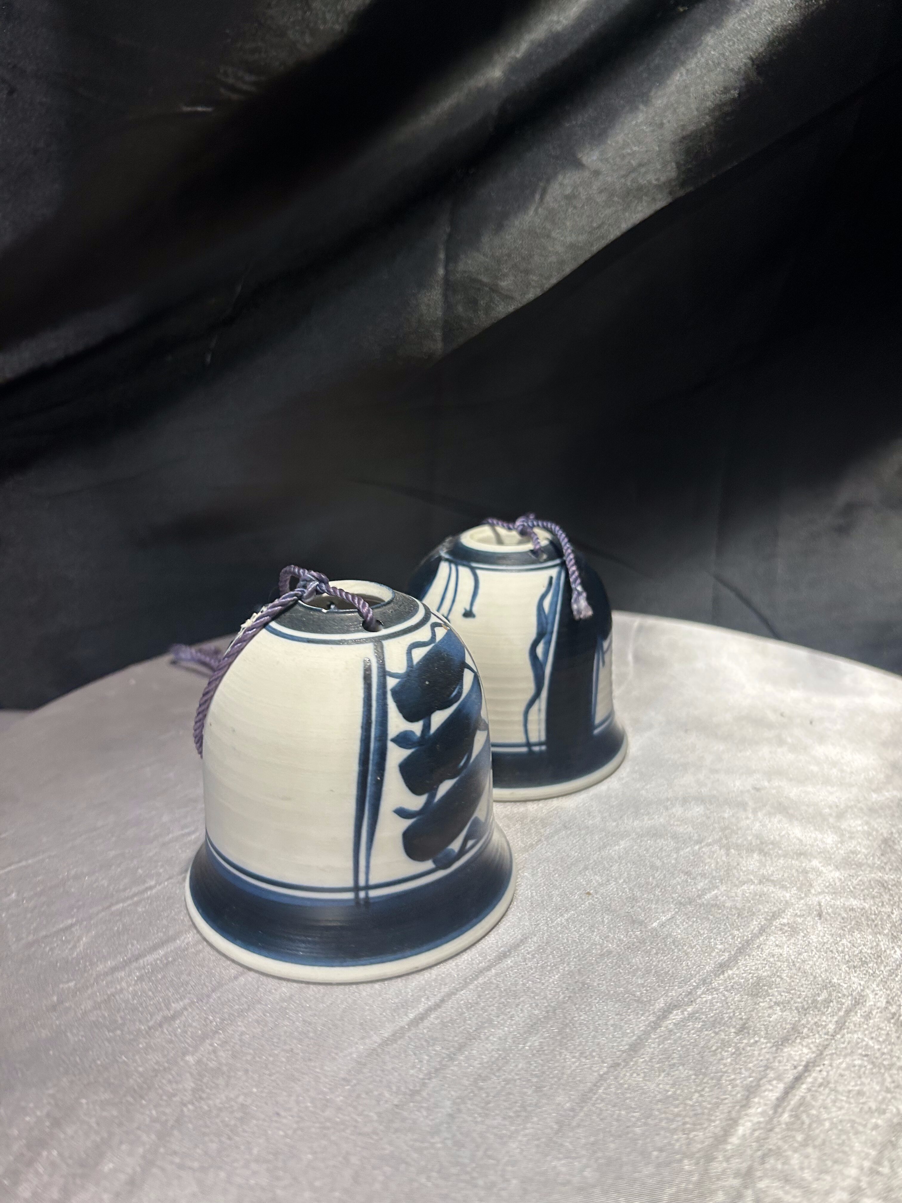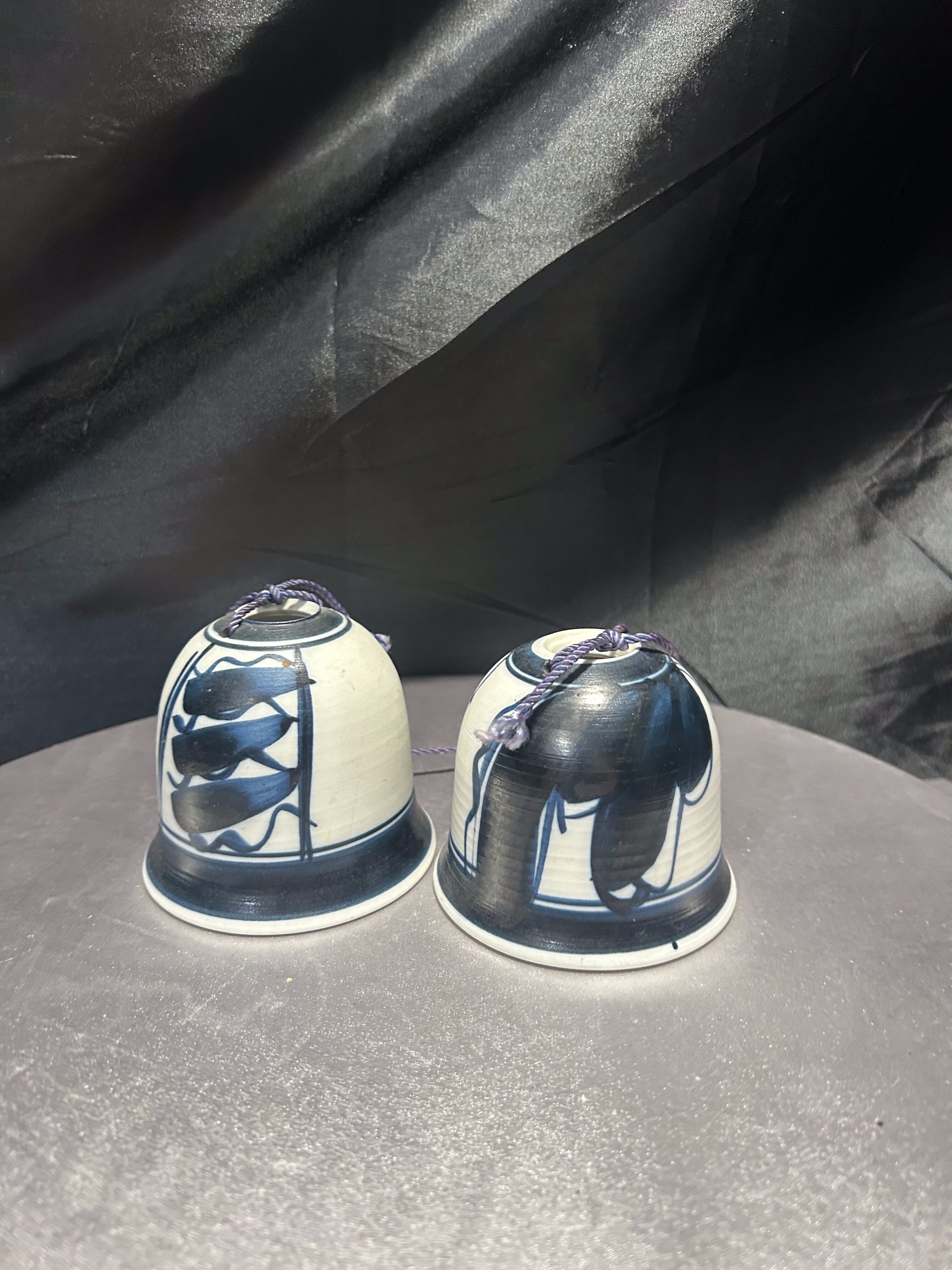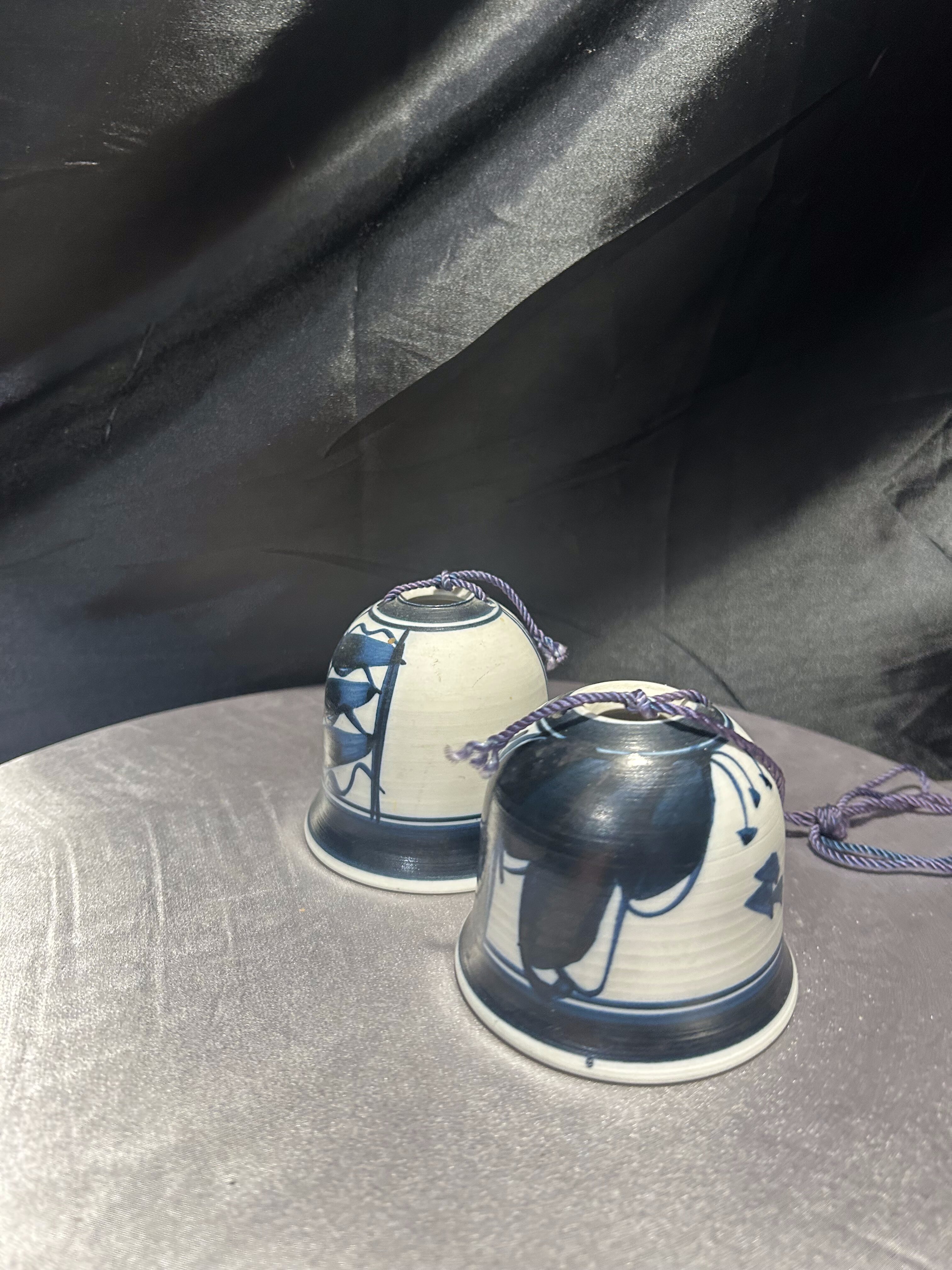 Zestaw dwóch unikatowych, ręcznie malowanych dzwonków ceramicznych o artystycznym charakterze. Każdy egzemplarz ozdobiony jest indywidualną kompozycją malarską w odcieniach kobaltu i granatu, a ich forma i kolorystyka przywodzą na myśl ceremonię herbacianą lub styl zen.