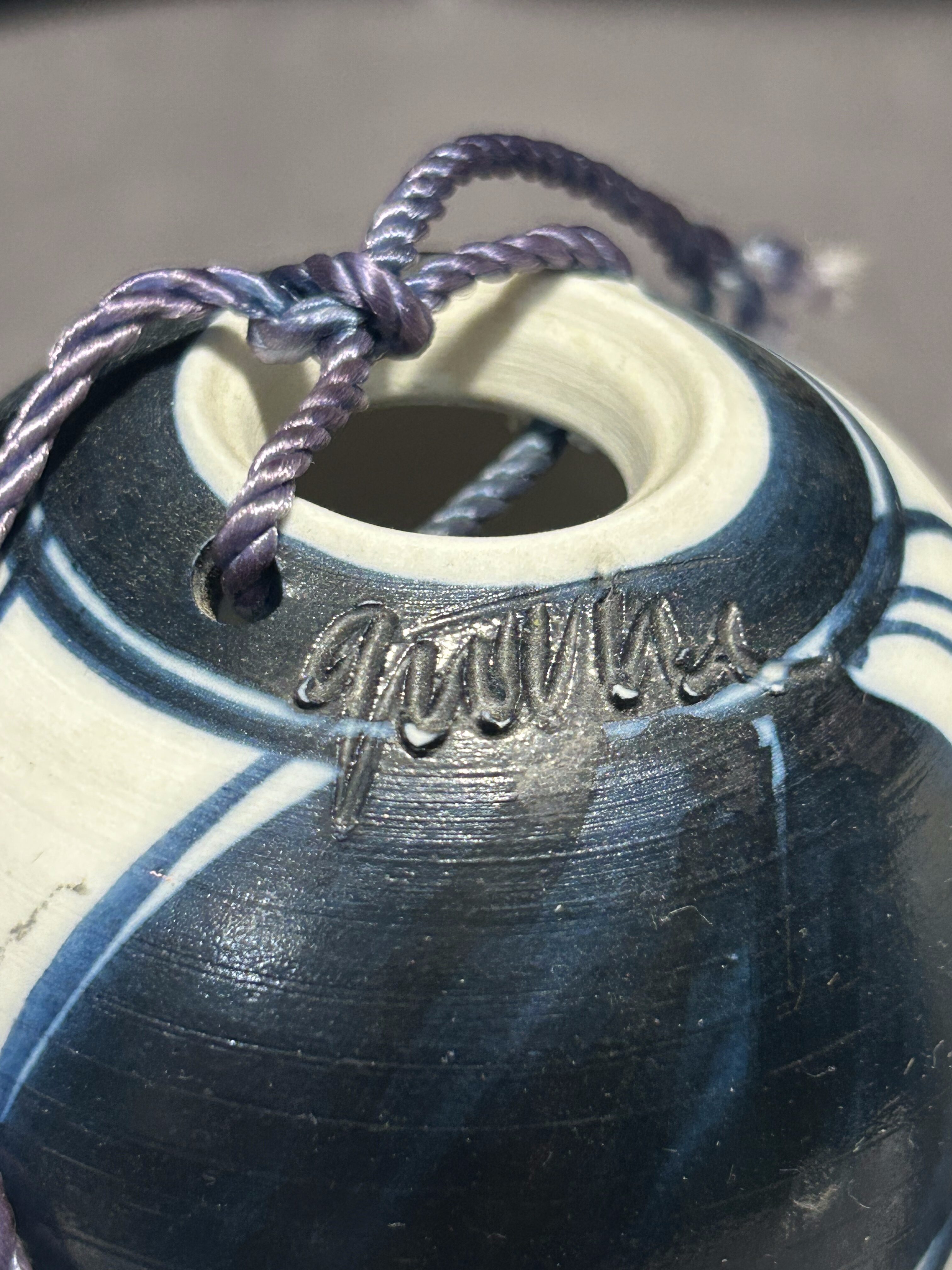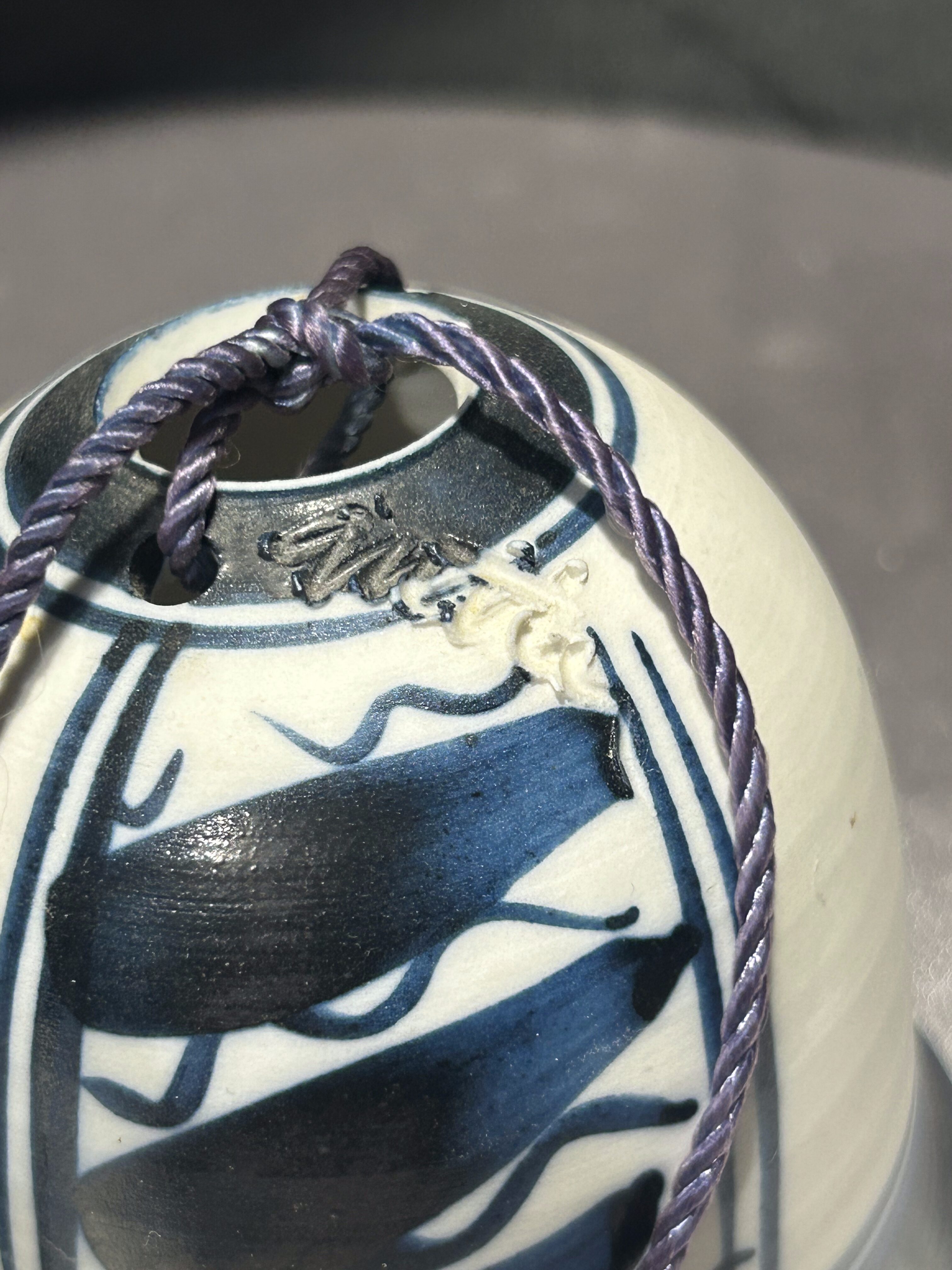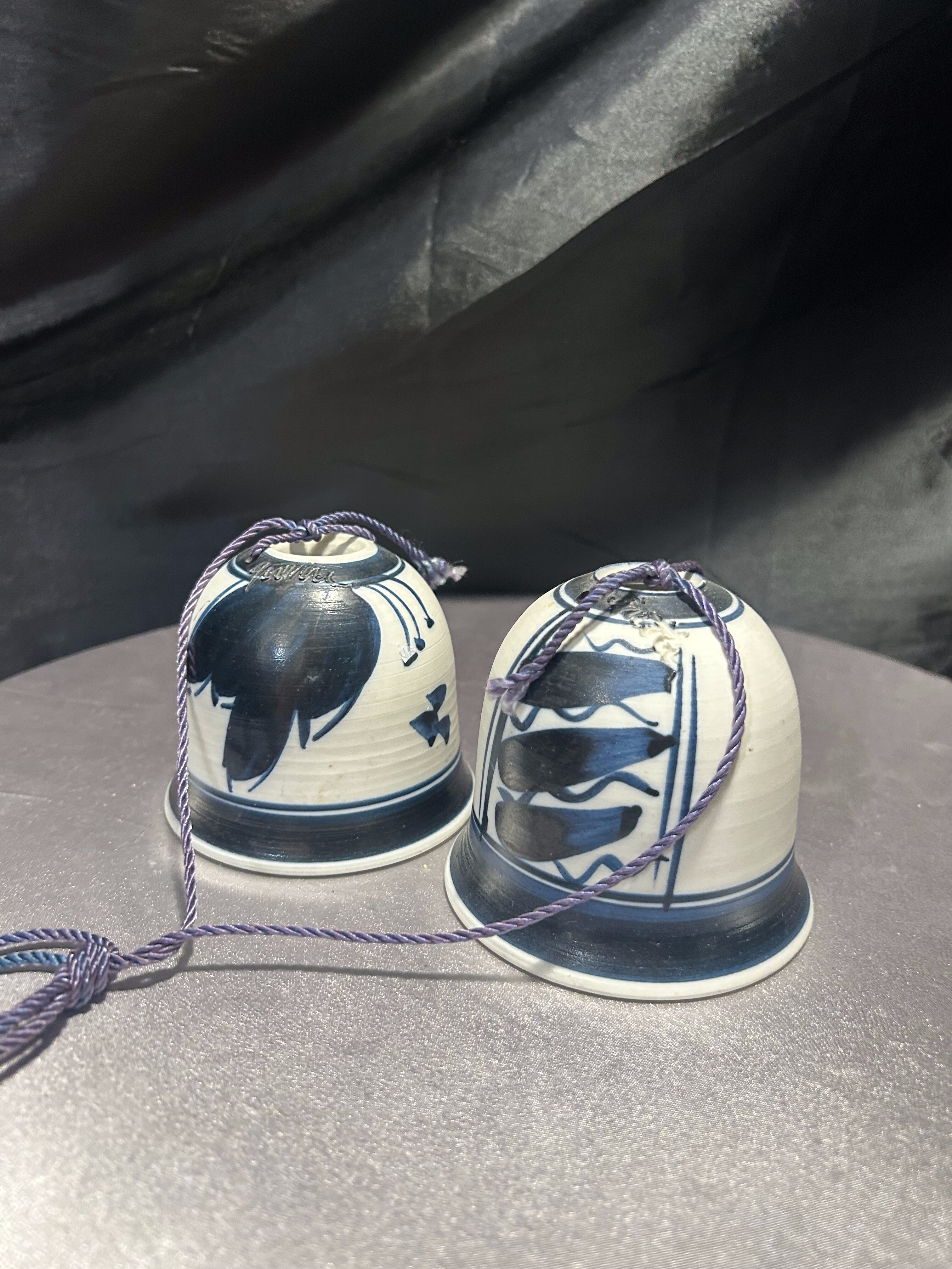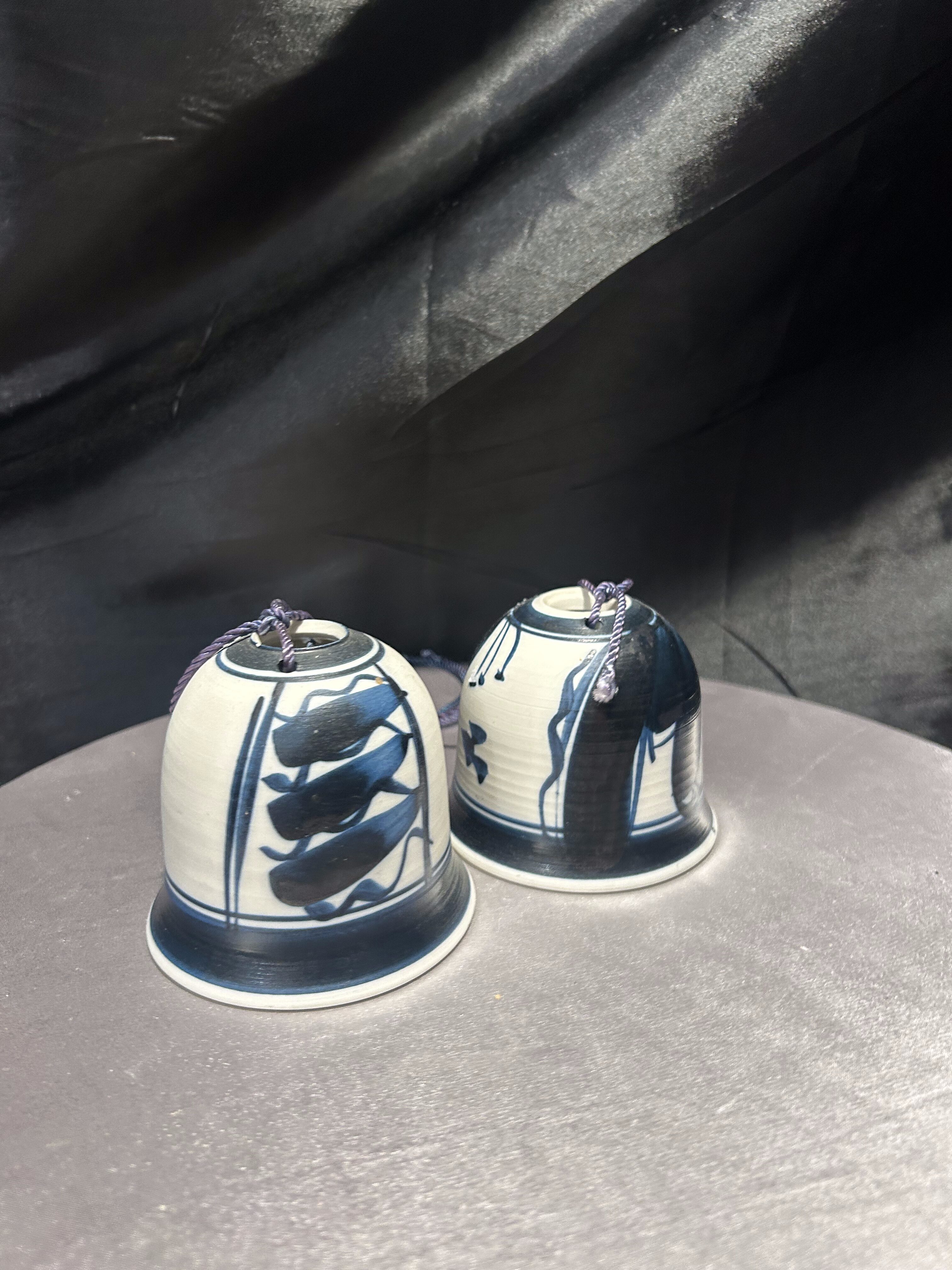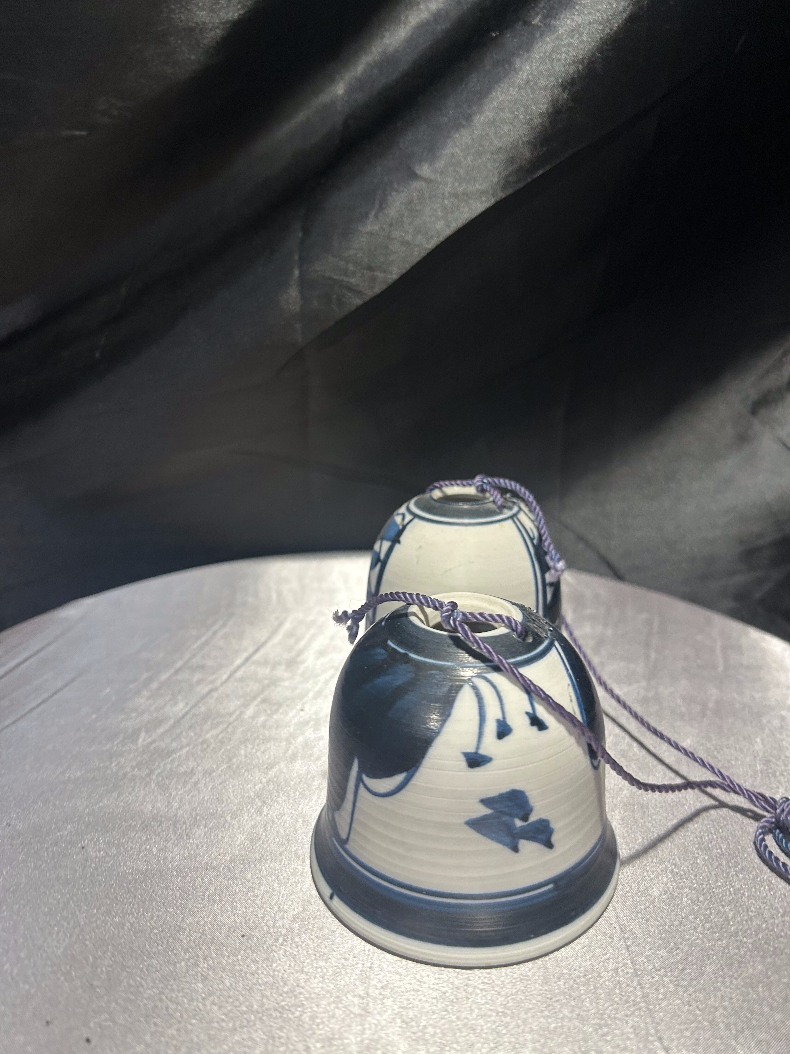 Zestaw dwóch unikatowych, ręcznie malowanych dzwonków ceramicznych o artystycznym charakterze. Każdy egzemplarz ozdobiony jest indywidualną kompozycją malarską w odcieniach kobaltu i granatu, a ich forma i kolorystyka przywodzą na myśl ceremonię herbacianą lub styl zen.