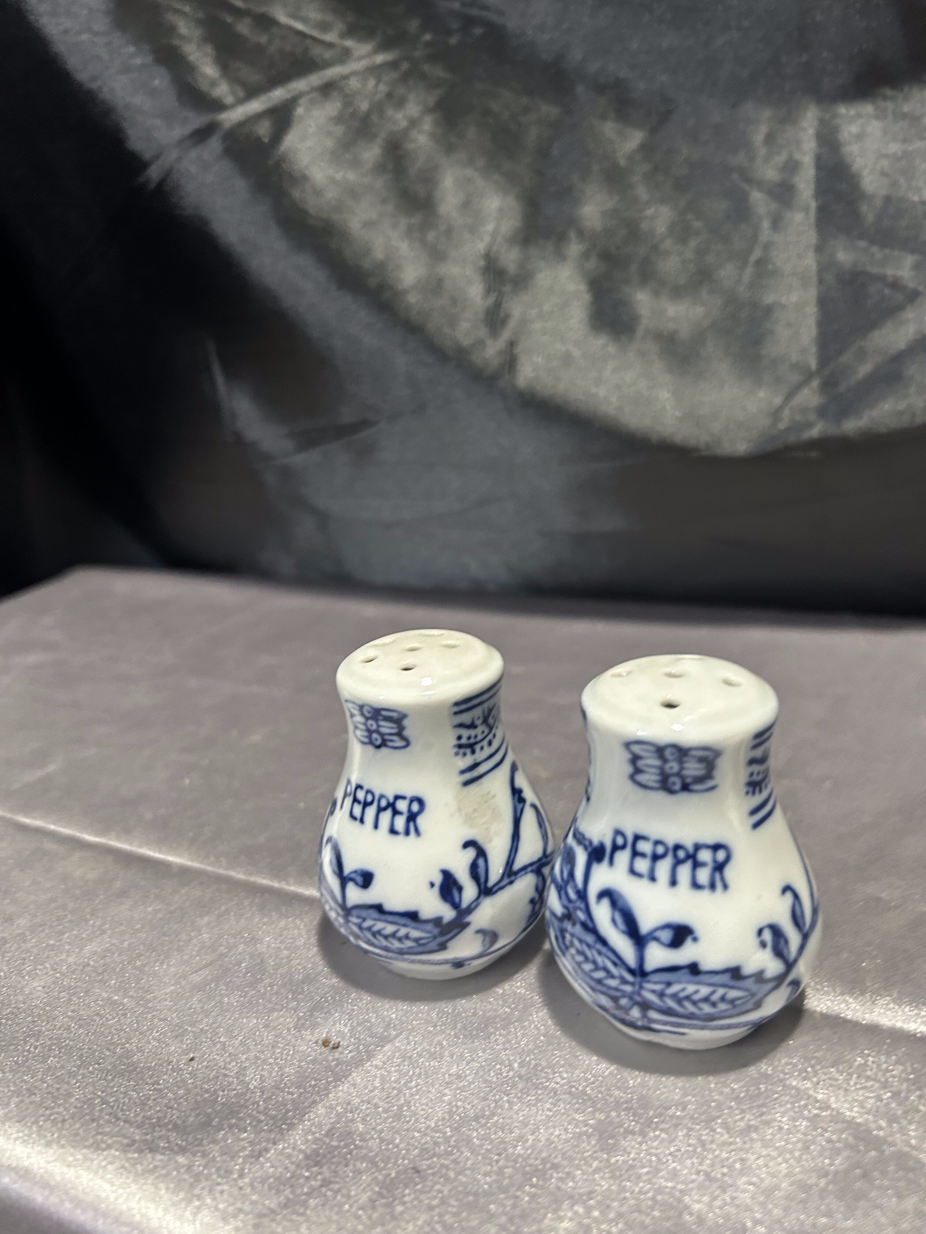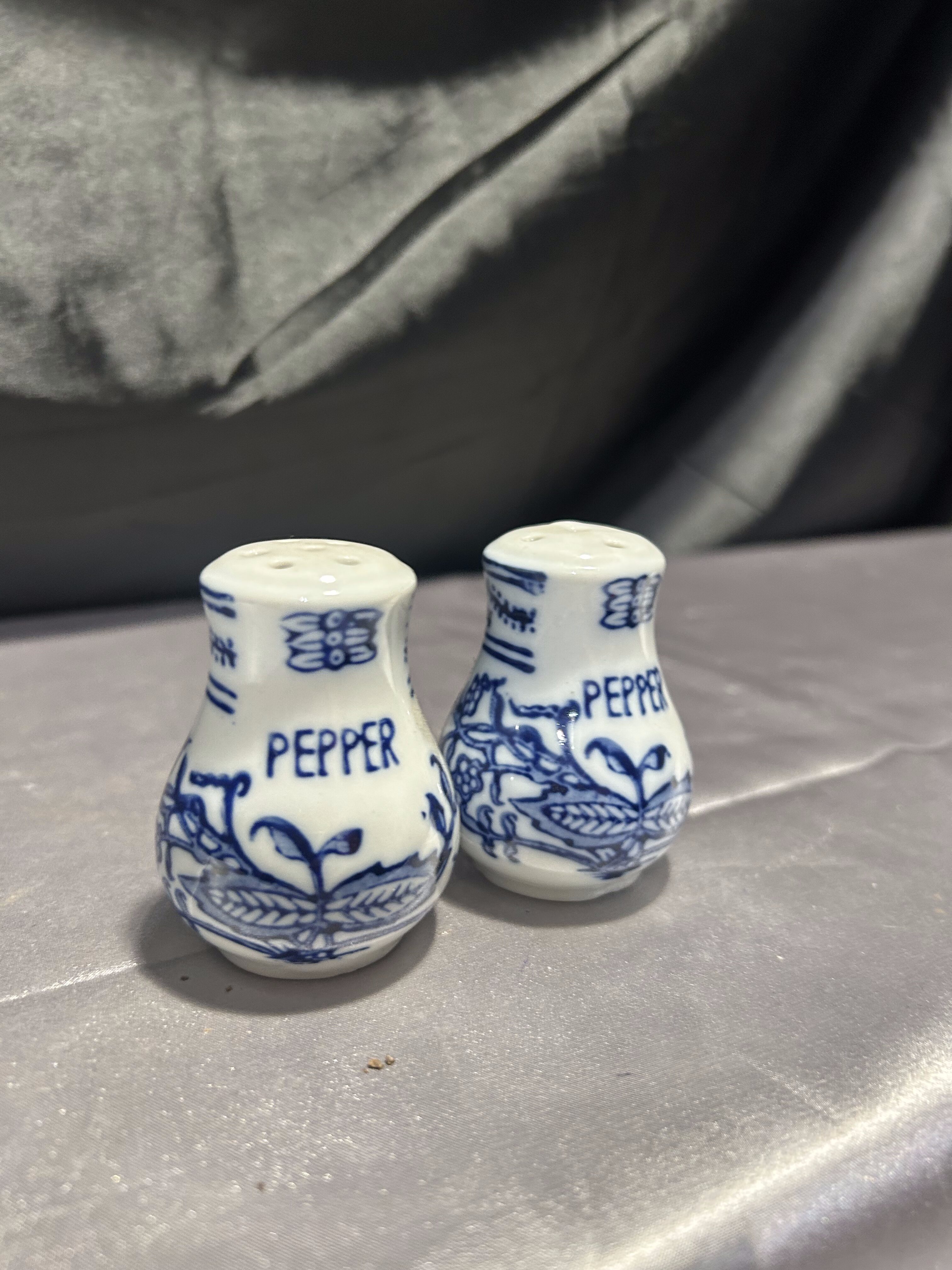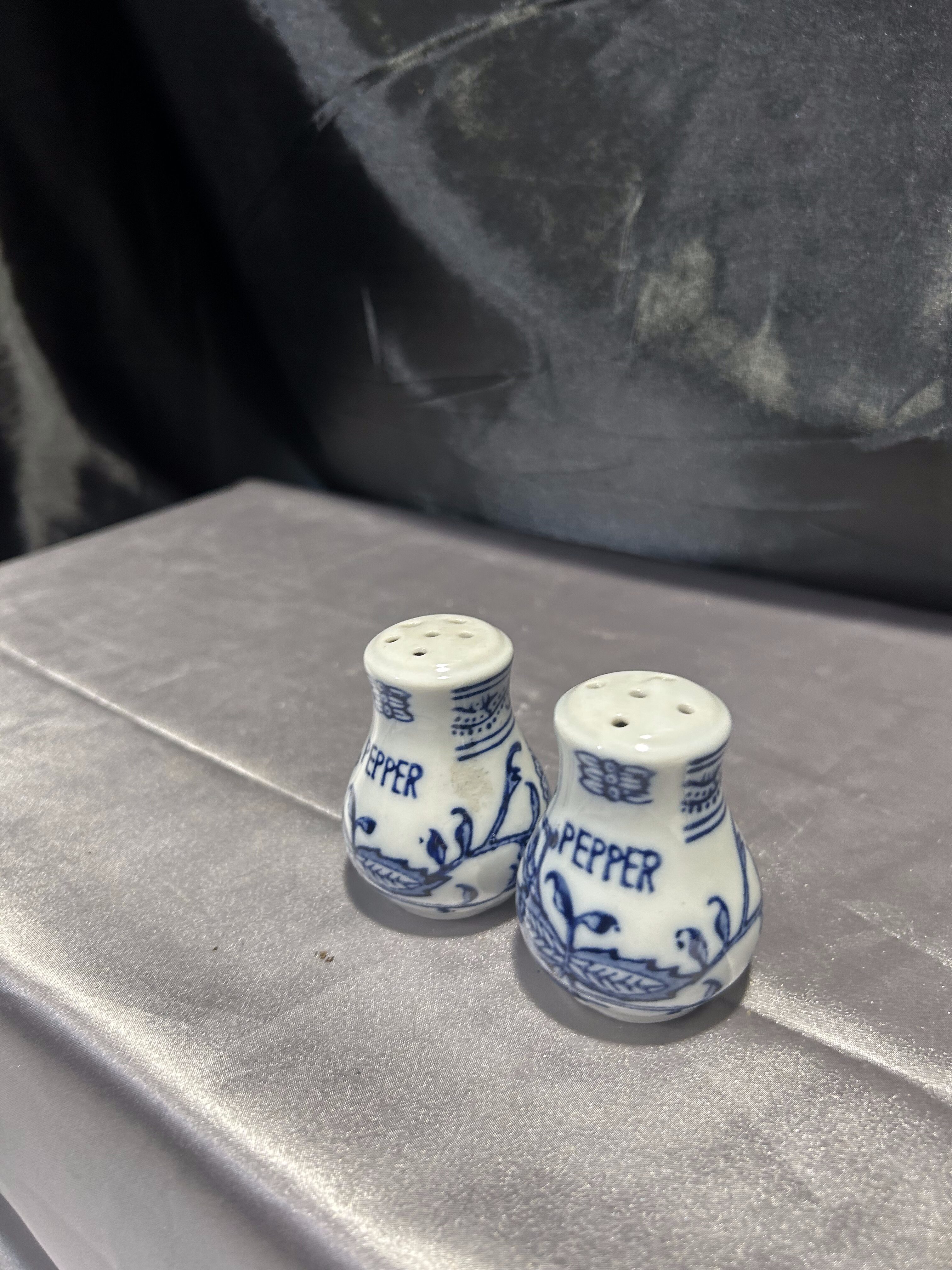 Zestaw dwóch ceramicznych przyprawników zdobionych subtelnym niebieskim wzorem, które choć formalnie to pieprzniczki, mogą pełnić funkcję zarówno solniczki, jak i pieprzniczki. Klasyczna forma i delikatne zdobienia sprawiają, że doskonale wpisują się w estetykę kuchni vintage, prowansalskiej lub rustykalnej.