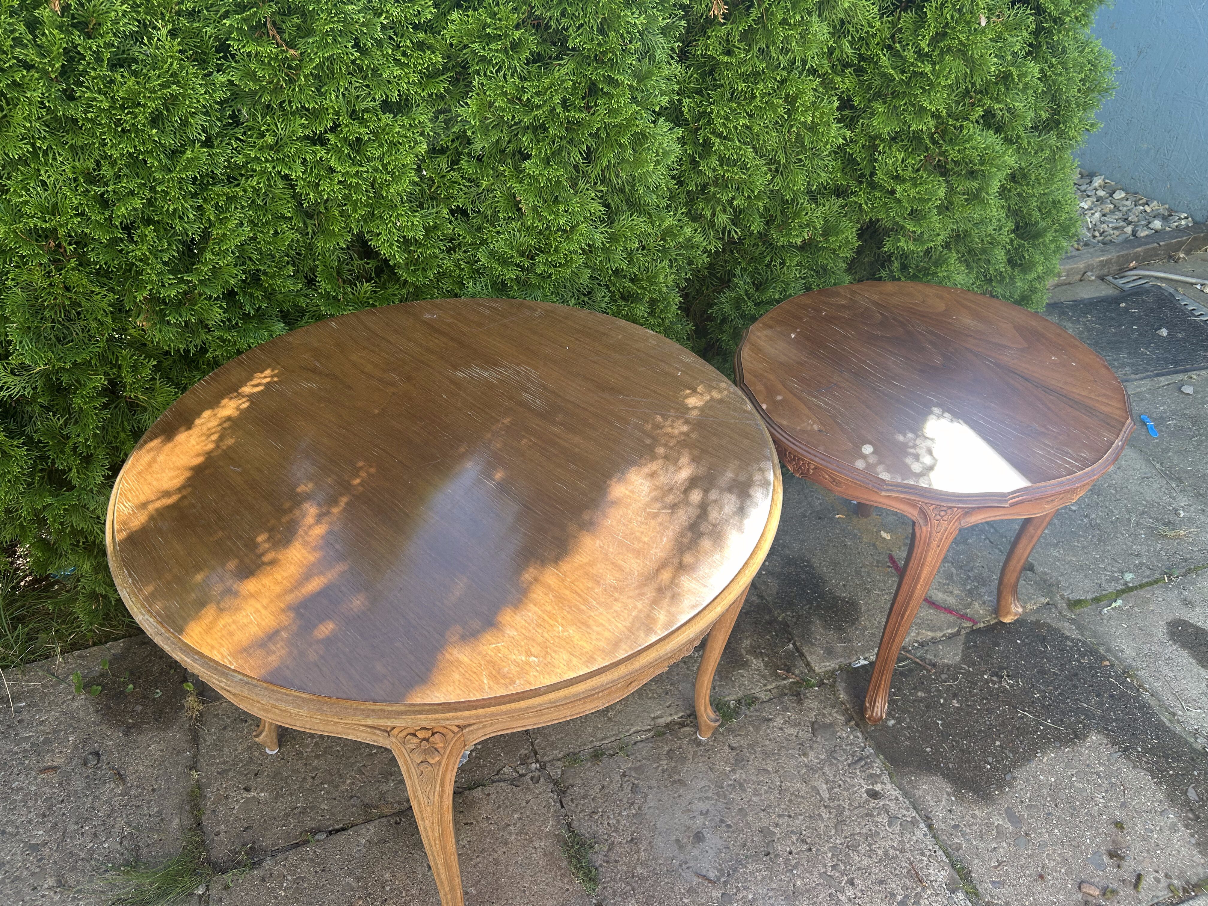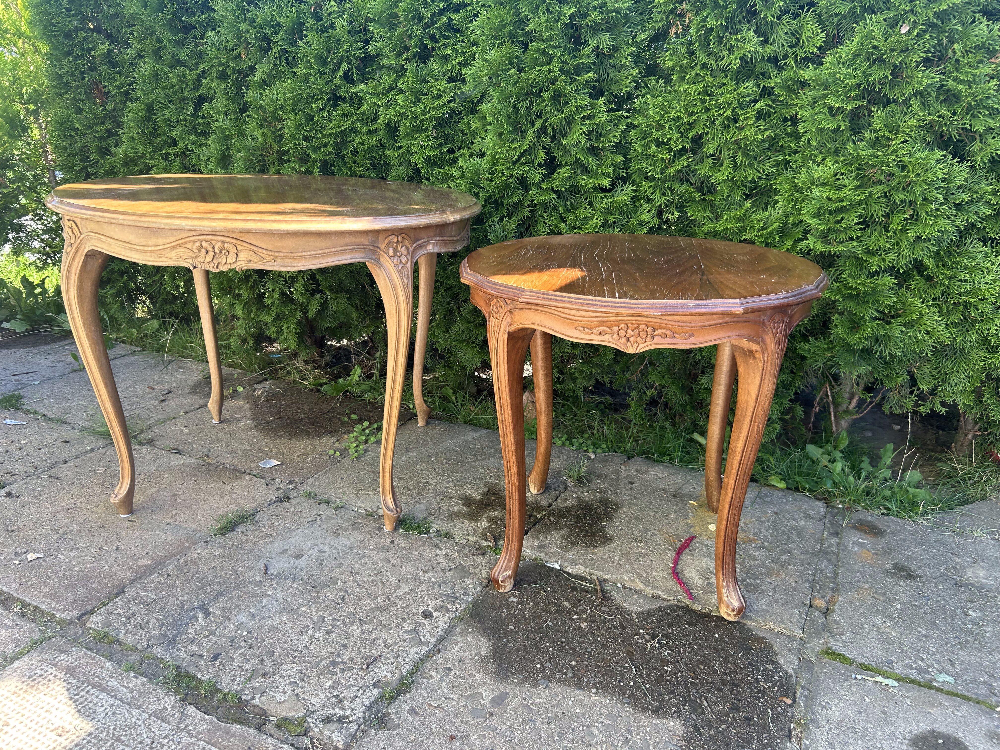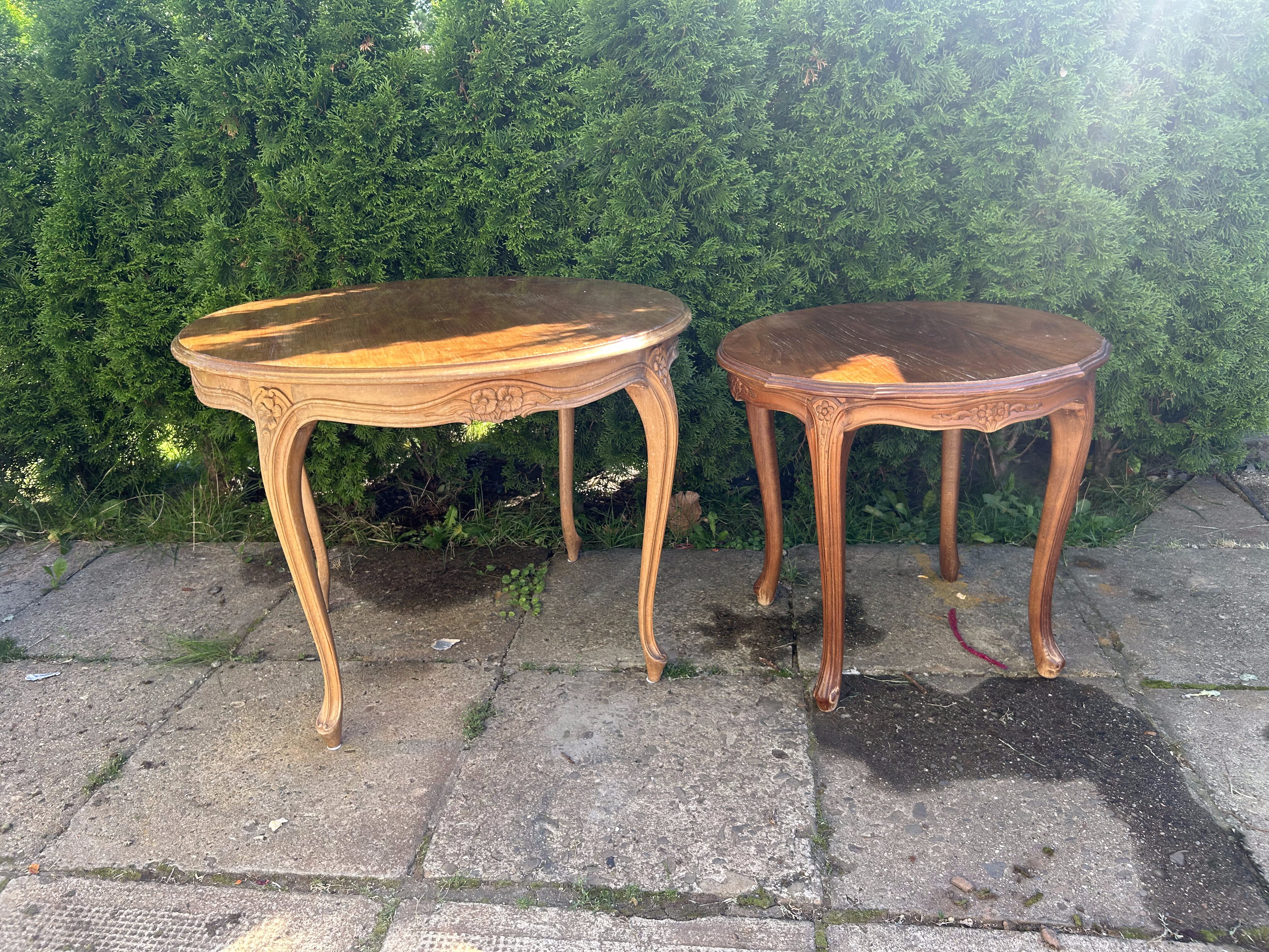 Elegancki komplet dwóch drewnianych stolików o okrągłych blatach, zdobionych subtelnymi rzeźbieniami w formie kwiatów. Delikatnie gięte nogi w stylu ludwikowskim nadają im lekkości i ponadczasowej klasy. Jeden stoliczek mieści się pod drugim, co pozwala na wygodne przechowywanie i dowolną aranżację przestrzeni. Takie stoliki doskonale sprawdzą się zarówno jako element dekoracyjny w salonie, stoliki kawowe, jak i eleganckie podstawy pod kwiaty czy lampy. Ich forma i detale wykonania nawiązują do klasycznych mebli francuskich z przełomu XIX i XX wieku, które były symbolem wyrafinowanego gustu.