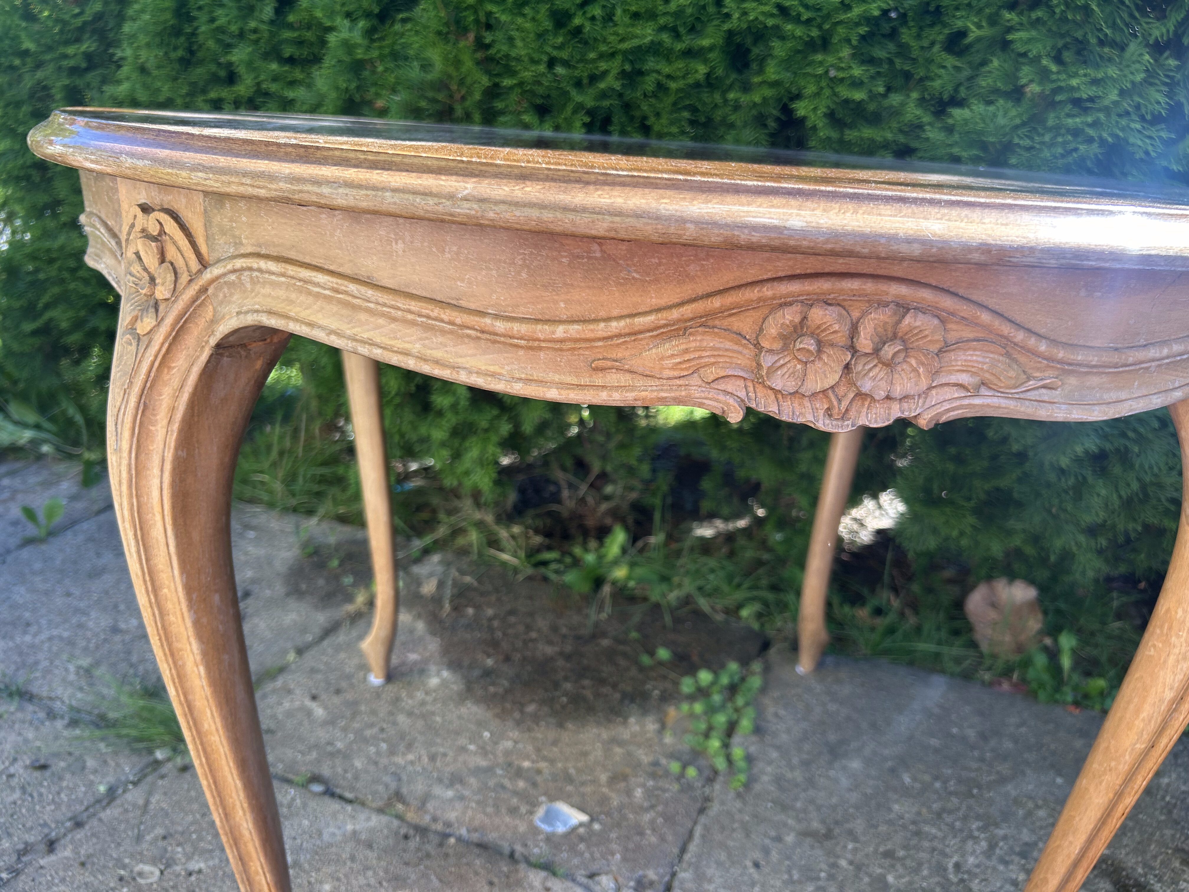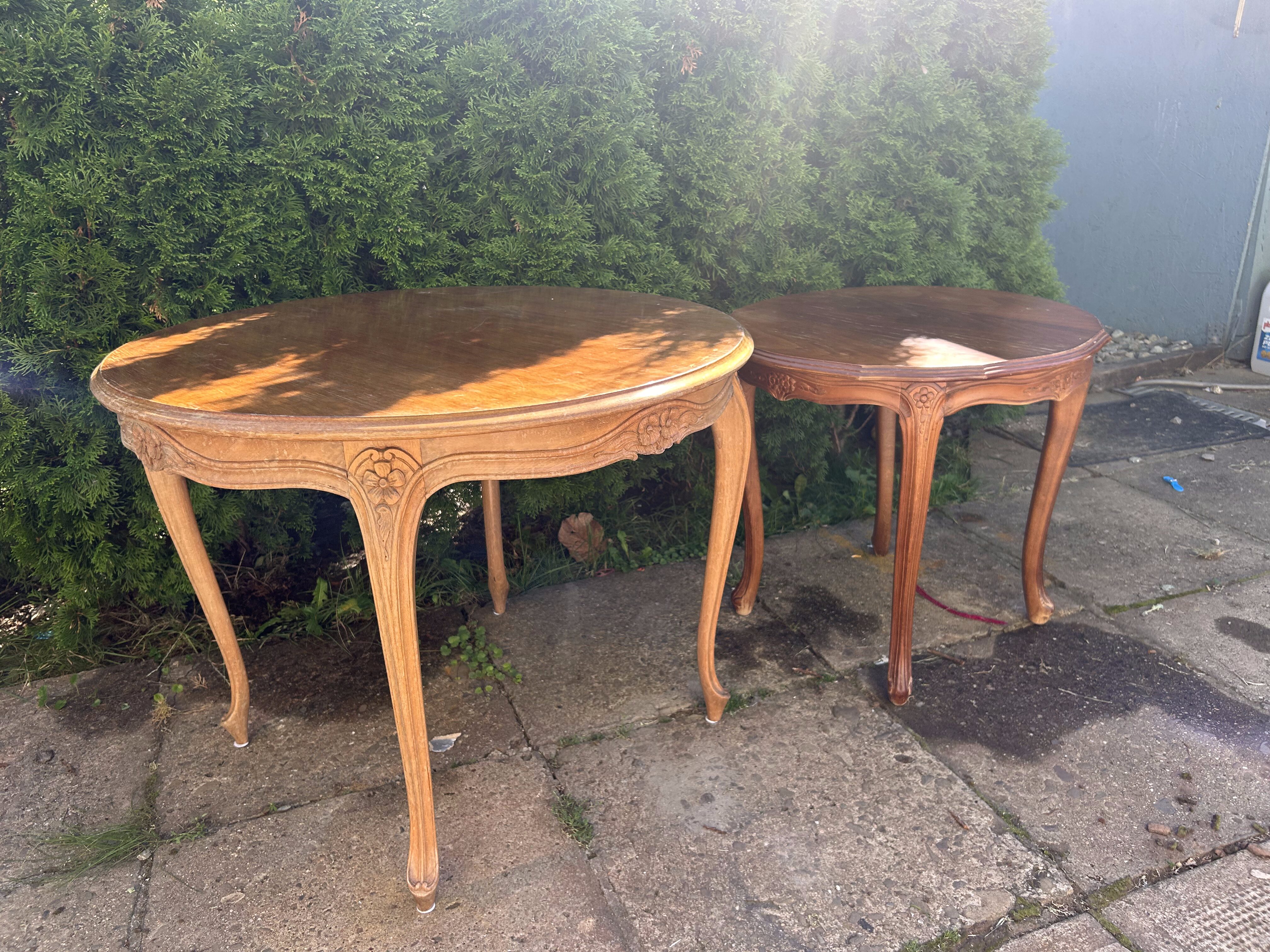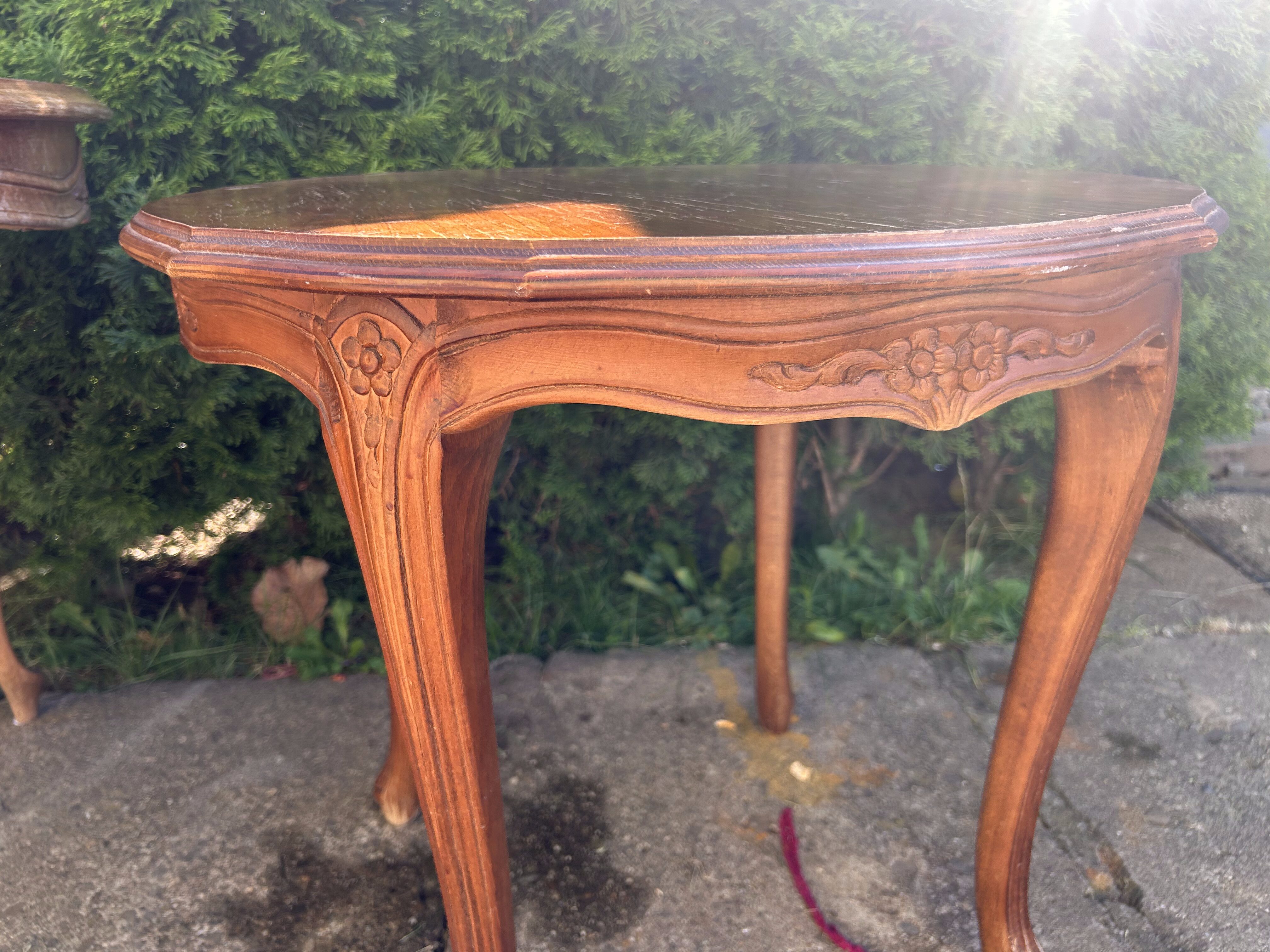 Elegancki komplet dwóch drewnianych stolików o okrągłych blatach, zdobionych subtelnymi rzeźbieniami w formie kwiatów. Delikatnie gięte nogi w stylu ludwikowskim nadają im lekkości i ponadczasowej klasy. Jeden stoliczek mieści się pod drugim, co pozwala na wygodne przechowywanie i dowolną aranżację przestrzeni. Takie stoliki doskonale sprawdzą się zarówno jako element dekoracyjny w salonie, stoliki kawowe, jak i eleganckie podstawy pod kwiaty czy lampy. Ich forma i detale wykonania nawiązują do klasycznych mebli francuskich z przełomu XIX i XX wieku, które były symbolem wyrafinowanego gustu.