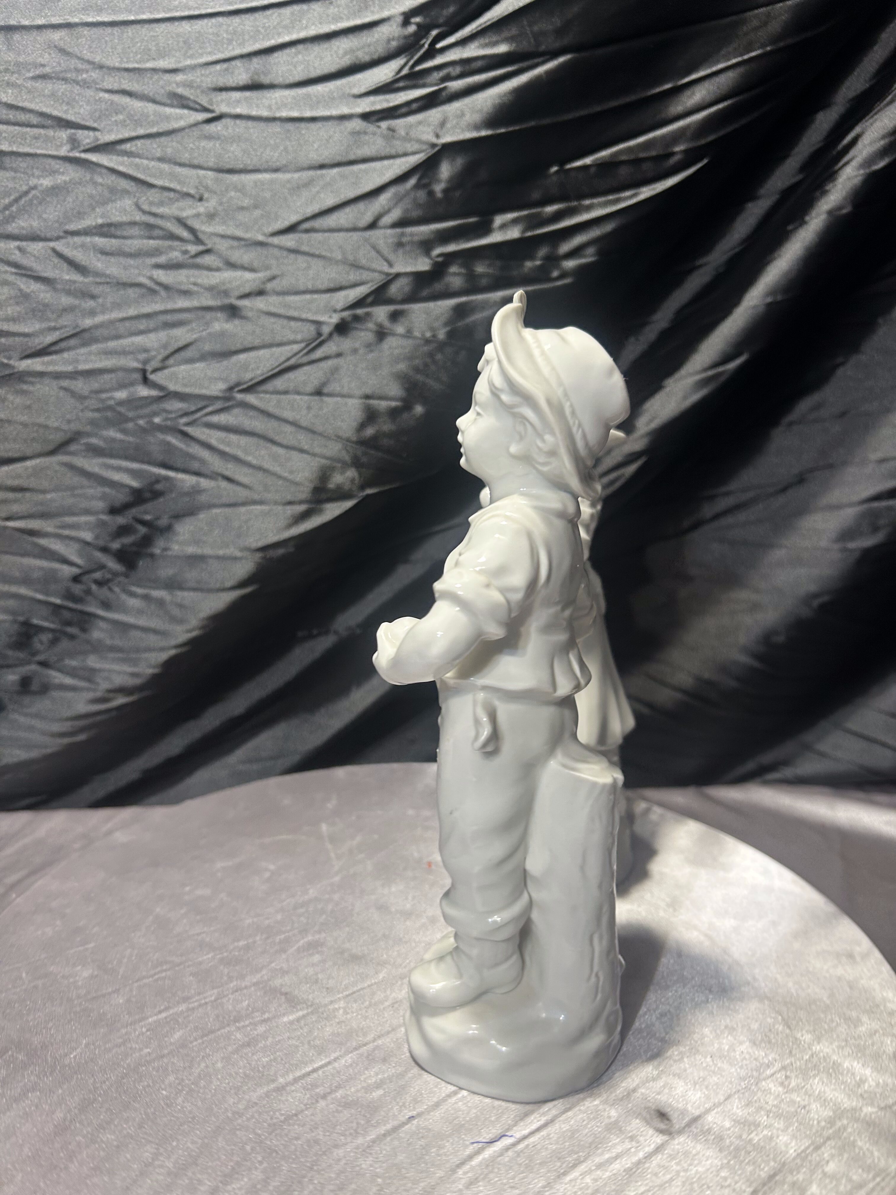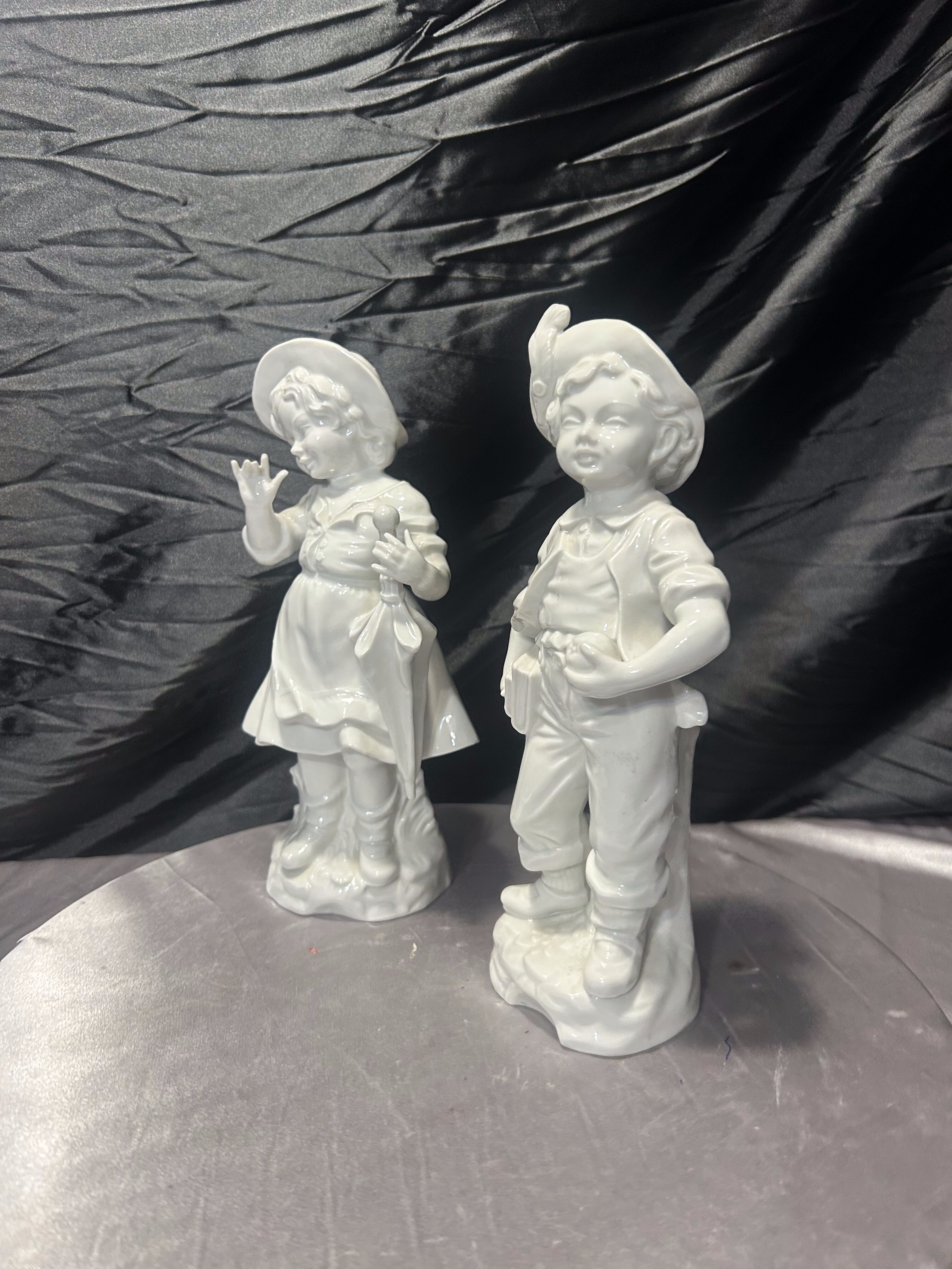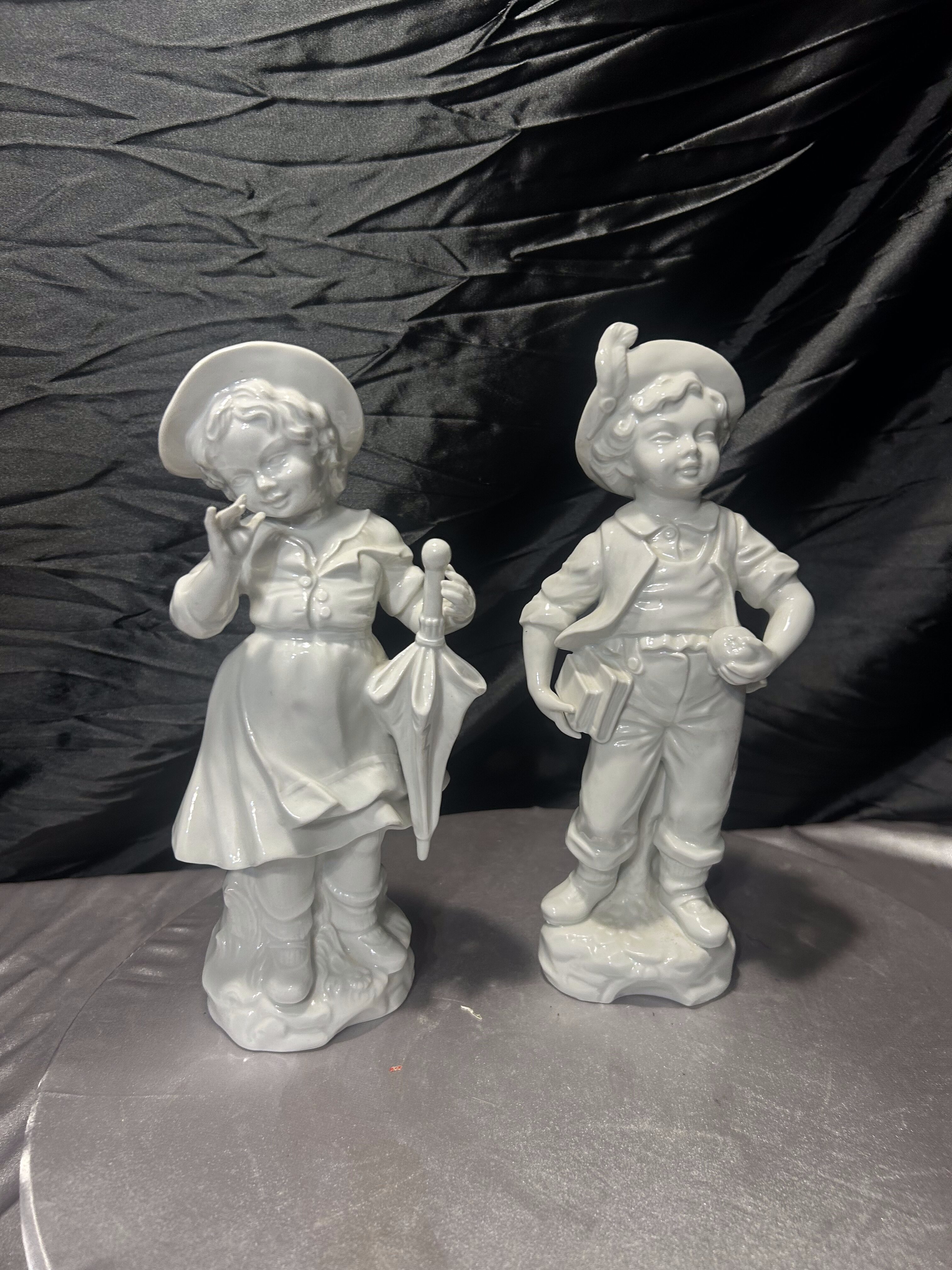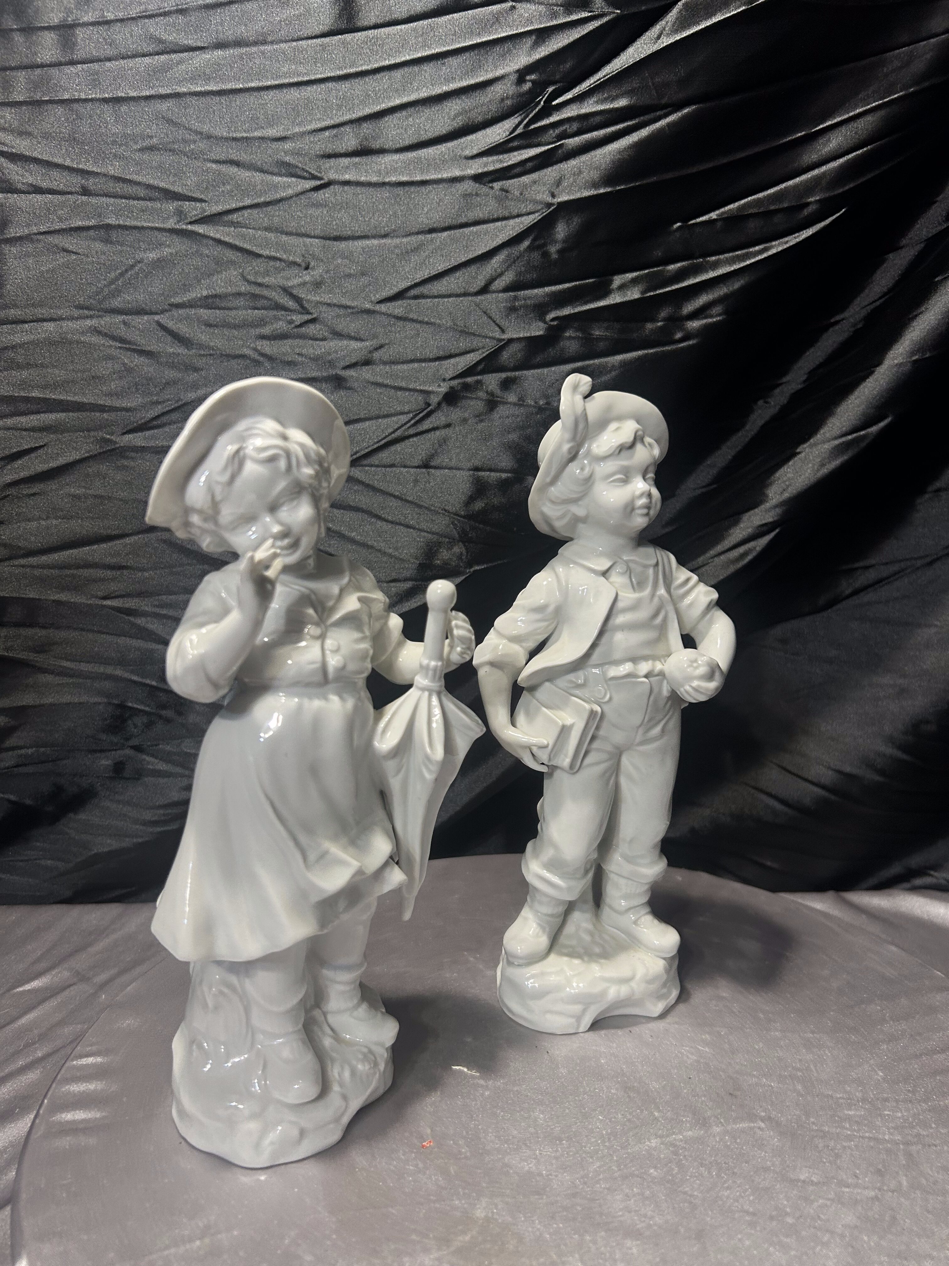 Oferuję zestaw dwóch klasycznych porcelanowych figurek przedstawiających dziewczynkę z parasolką oraz chłopca z książkami i jabłkiem. Figury wykonano w delikatnym, gładkim stylu charakterystycznym dla manufaktur działających na terenie dawnej Niemieckiej Republiki Demokratycznej (GDR).