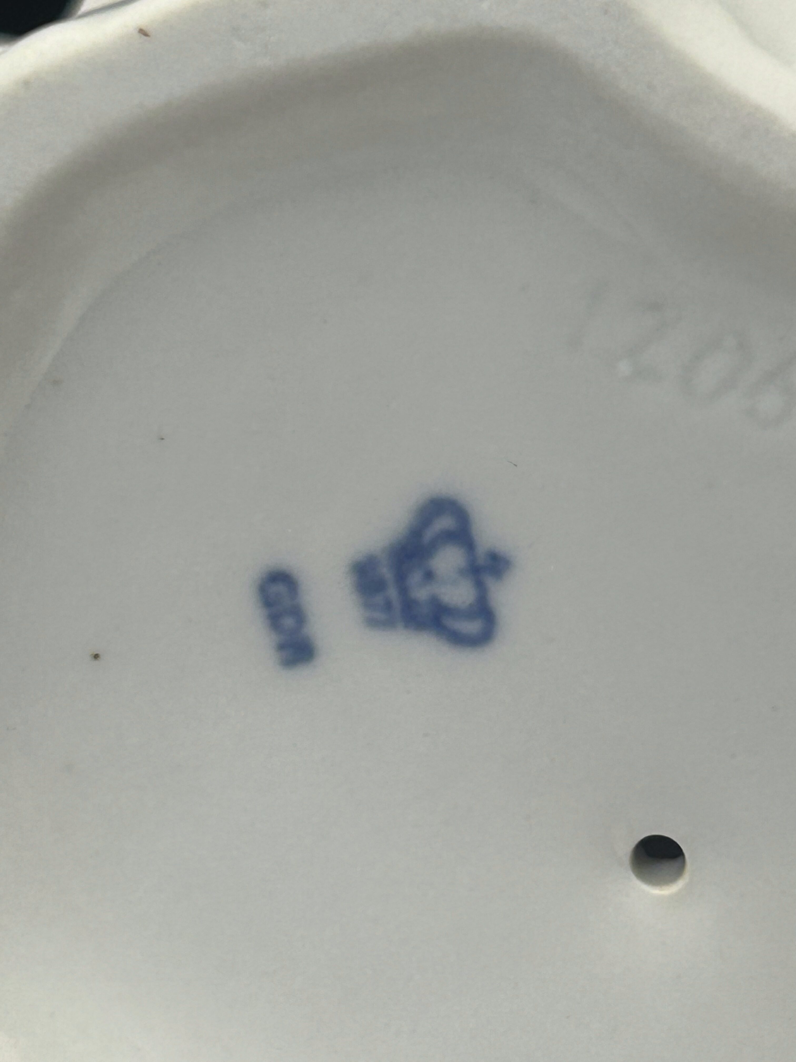 Na spodzie widnieje sygnatura z koroną oraz oznaczeniem GDR, co jednoznacznie wskazuje na produkcję w latach 1950–1990, kiedy w NRD działało wiele wytwórni opierających swoje projekty na tradycyjnych wzorach miśnieńskich i vogtlandzkich. Sygnatura z koroną była stosowana m.in. przez Volkstedt, Unterweißbach oraz kilka pomniejszych pracowni – część z nich funkcjonowała pod wspólnymi oznaczeniami eksportowymi, dlatego w przypadku tej sygnatury typowe jest zbiorcze określenie „porcelana GDR”.