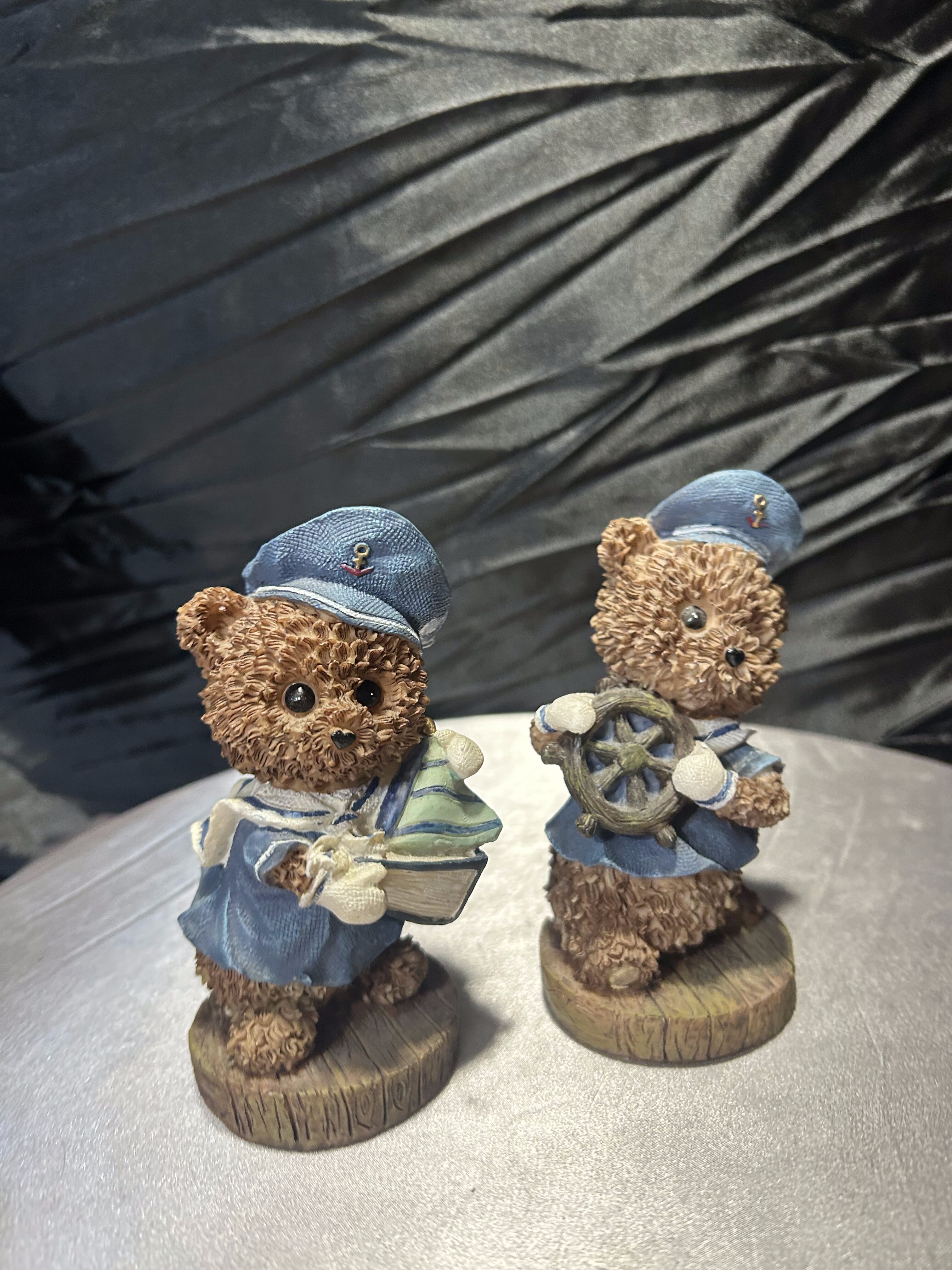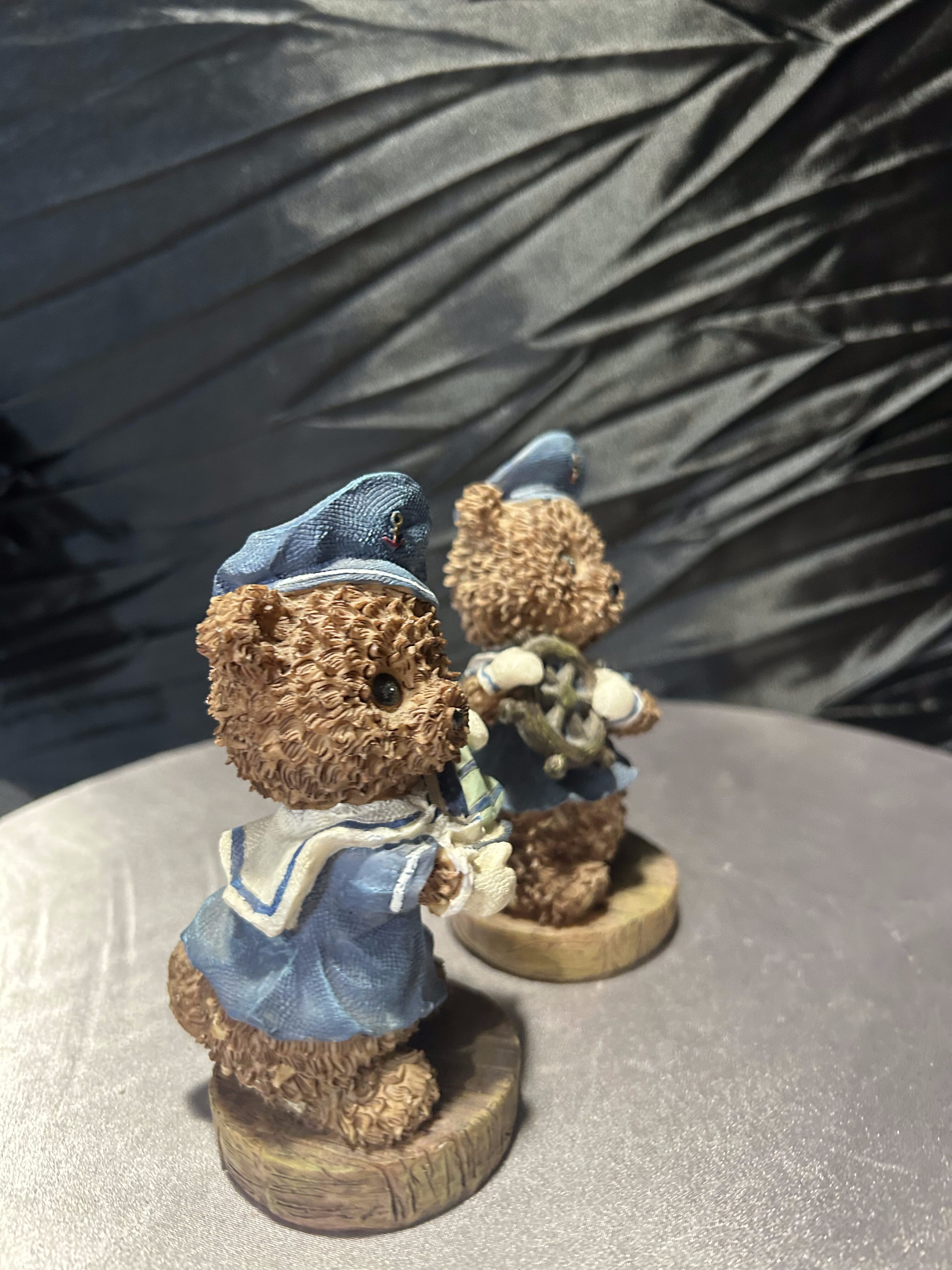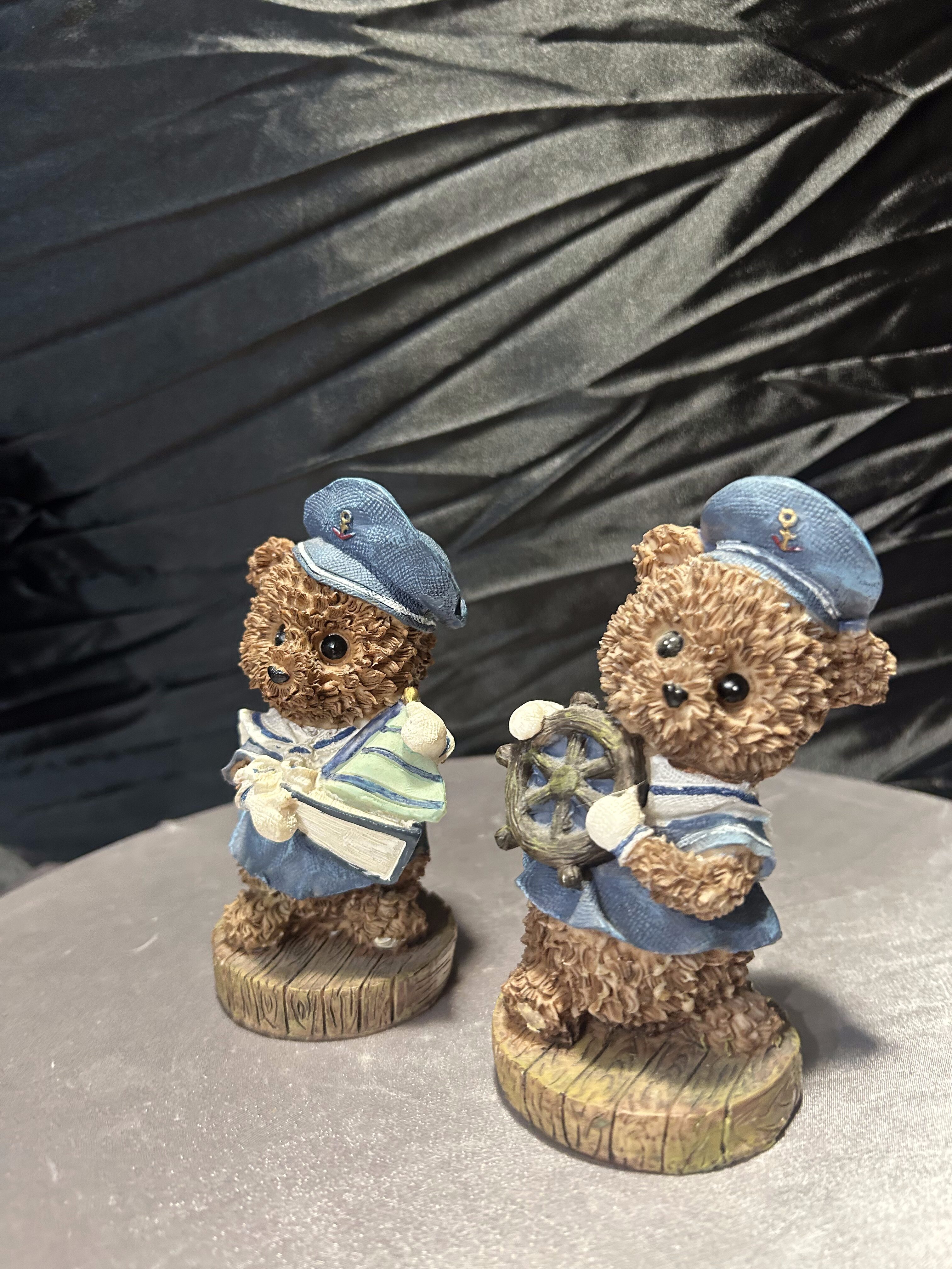 Uroczy komplet dwóch figurek przedstawiających misie ubrane w marynistyczne stroje. Jeden z nich trzyma ster, drugi dzierży w łapkach żaglówkę, a oba mają granatowe czapeczki z kotwicą, dodające im żeglarskiego charakteru. Starannie odwzorowane detale i żywe kolory nadają figurkom wyjątkowego uroku, sprawiając, że są idealnym dodatkiem do wnętrz inspirowanych stylem morskim. To słodka i pełna wdzięku dekoracja, która rozświetli każde pomieszczenie.