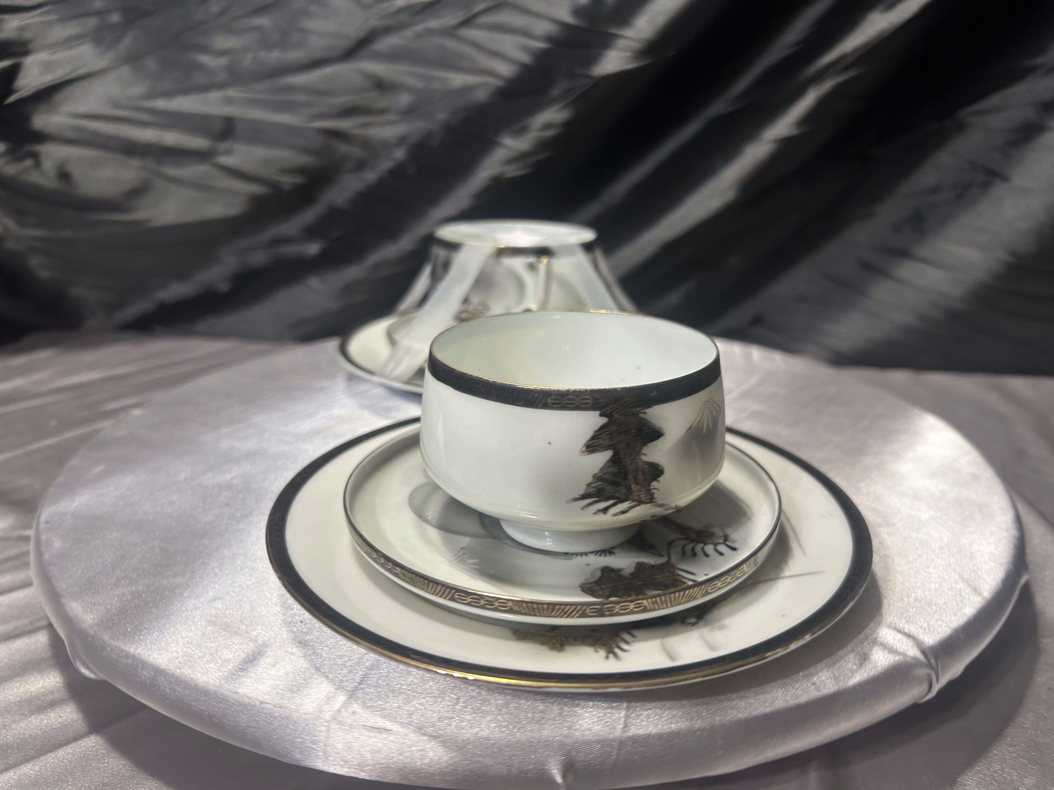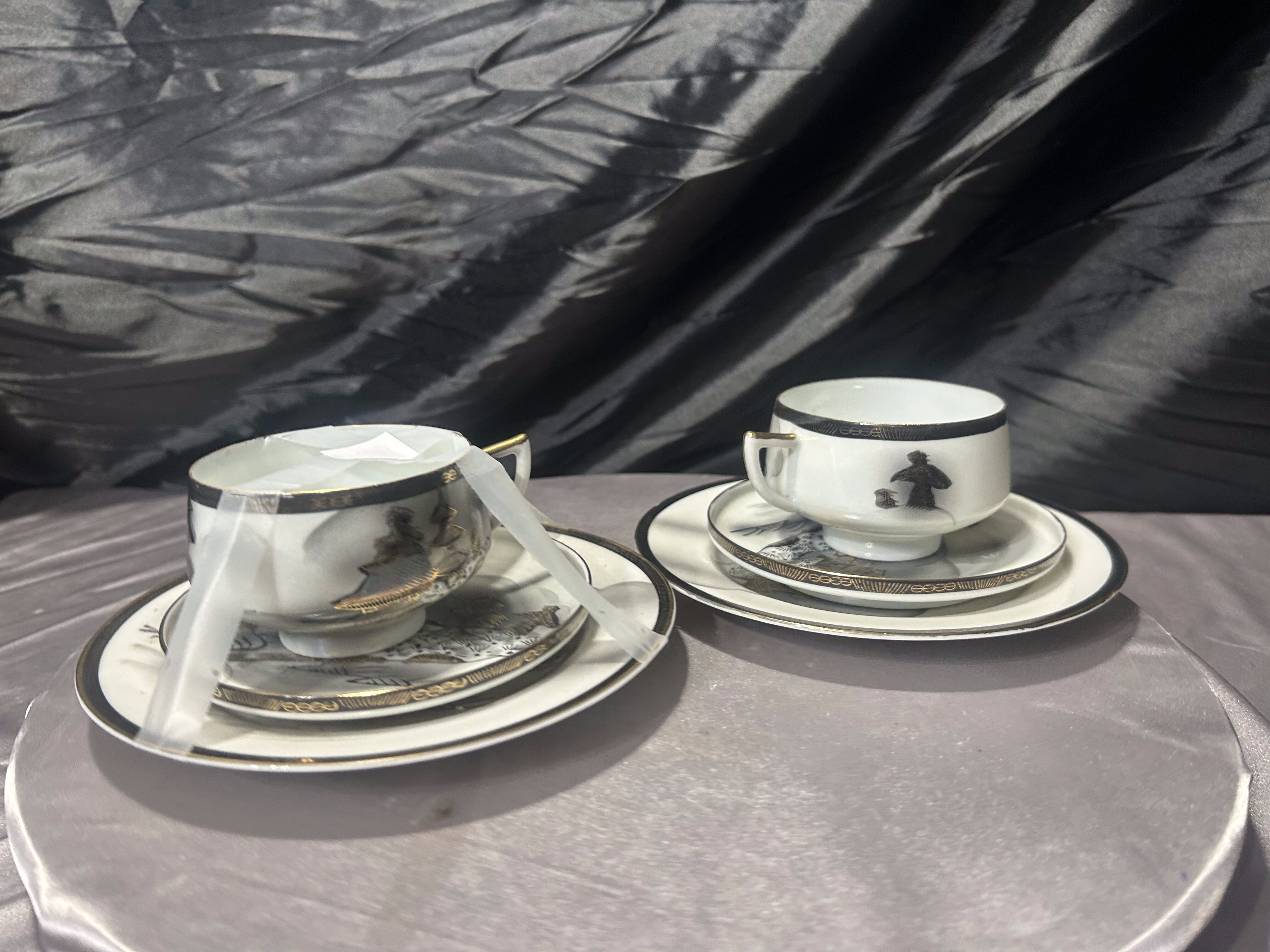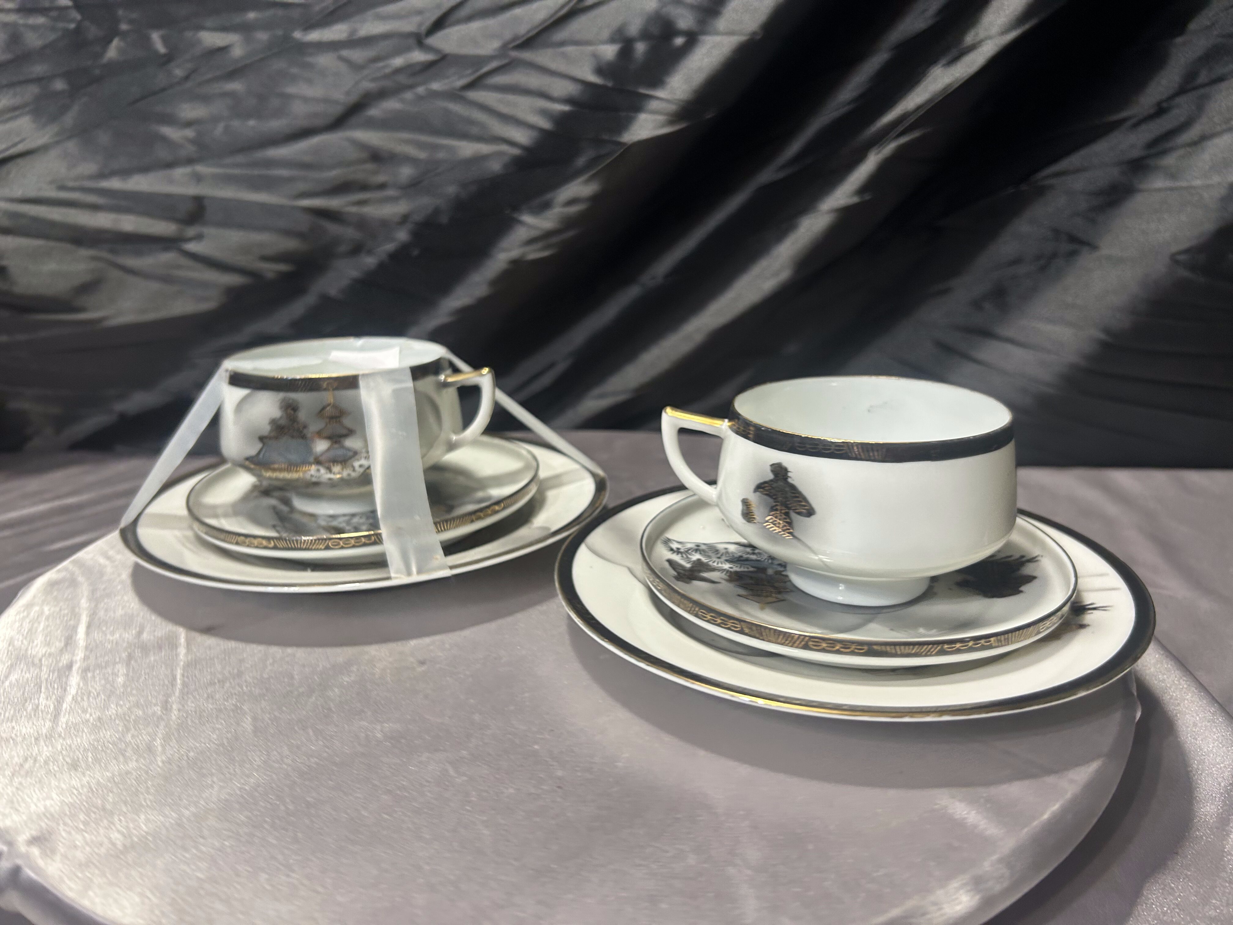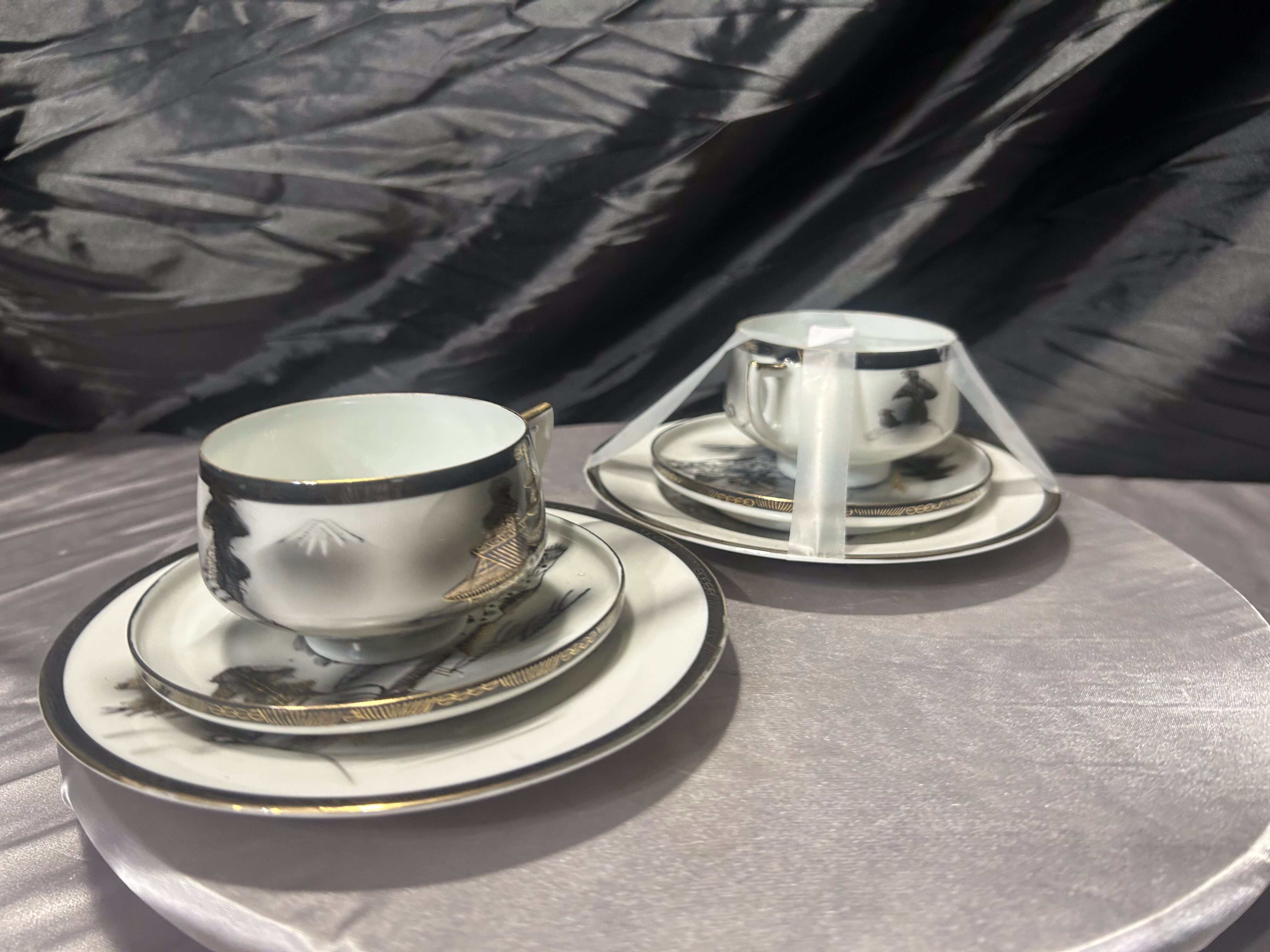 Elegancki zestaw dwóch filiżanek typu Kutani Trio, obejmujący filiżankę, spodek oraz talerzyk deserowy. Klasyczna japońska porcelana dekorowana subtelną sceną krajobrazową z architekturą i delikatnymi złoceniami. Scena dekoracyjna jest wyjątkowo udana i prezentuje się niezwykle elegancko, a całość zachwyca harmonią formy i detalu.