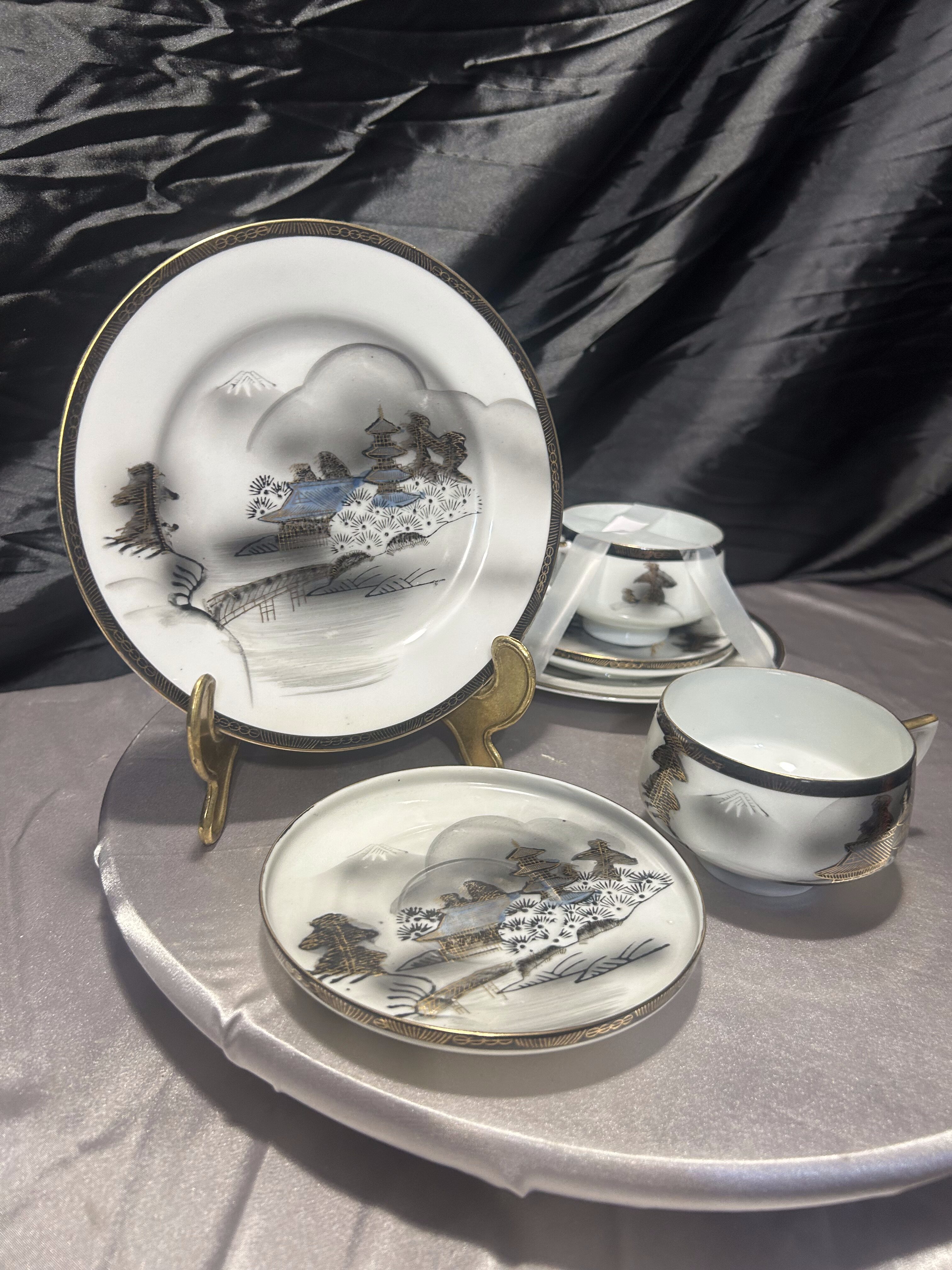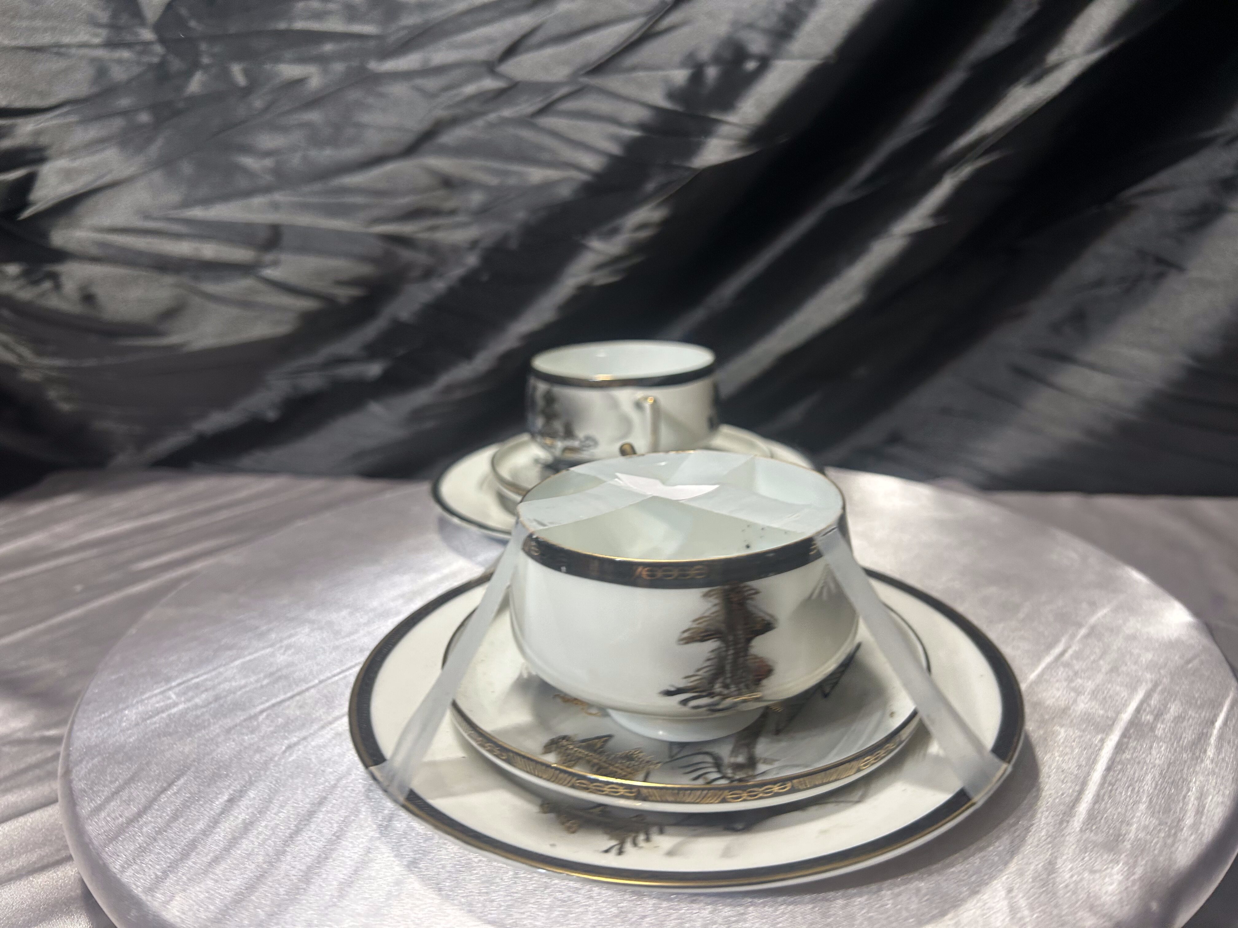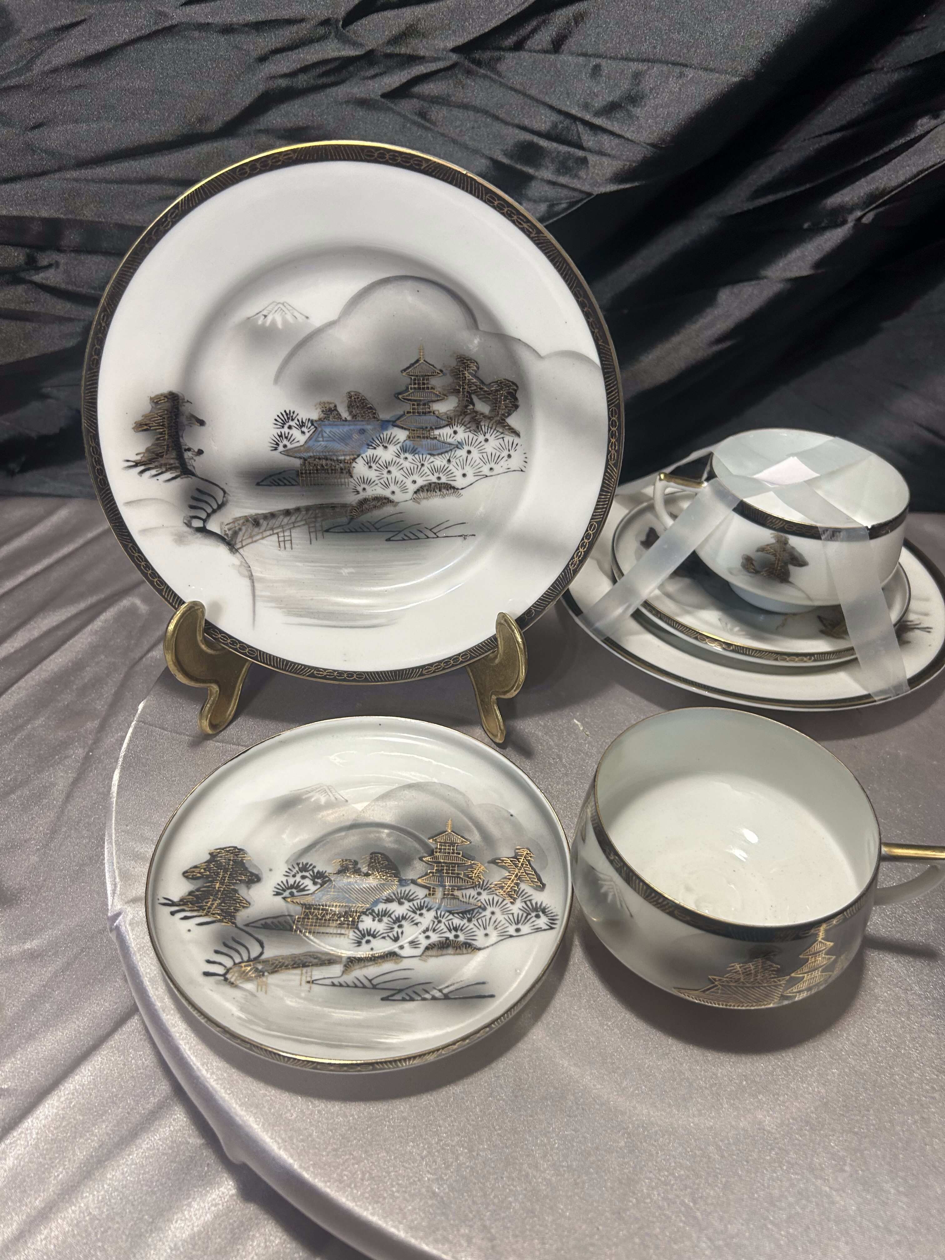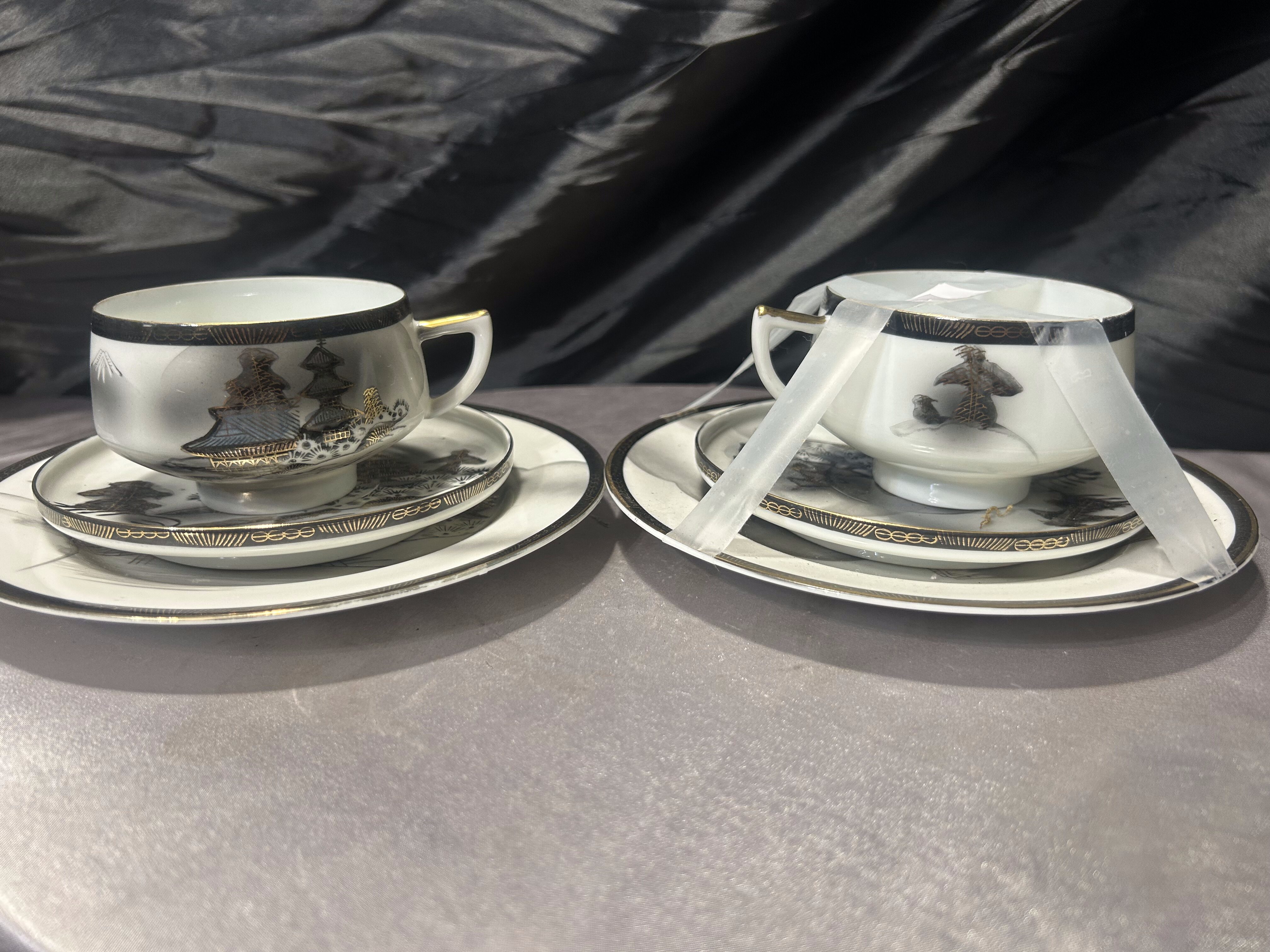 Elegancki zestaw dwóch filiżanek typu Kutani Trio, obejmujący filiżankę, spodek oraz talerzyk deserowy. Klasyczna japońska porcelana dekorowana subtelną sceną krajobrazową z architekturą i delikatnymi złoceniami. Scena dekoracyjna jest wyjątkowo udana i prezentuje się niezwykle elegancko, a całość zachwyca harmonią formy i detalu.