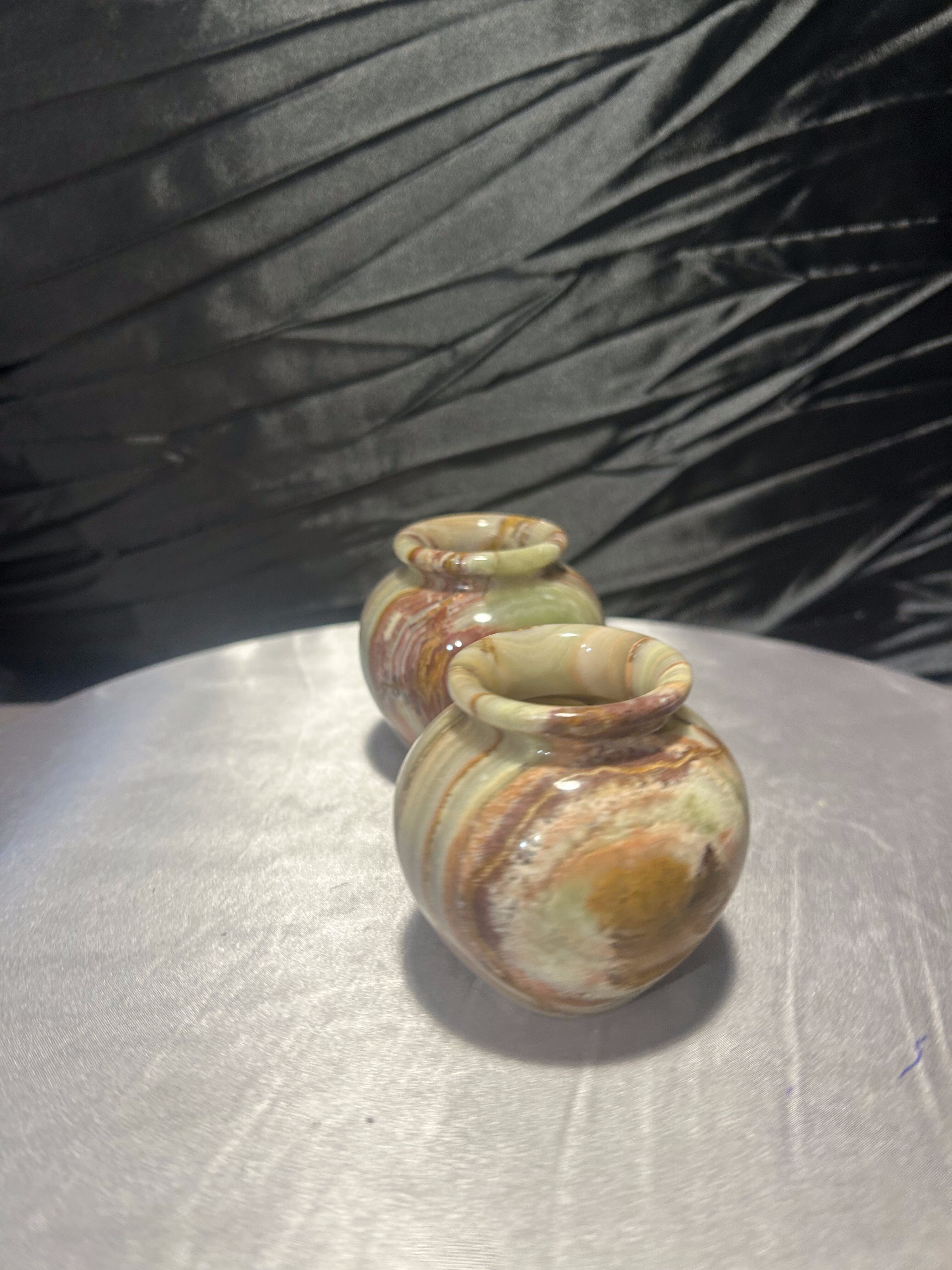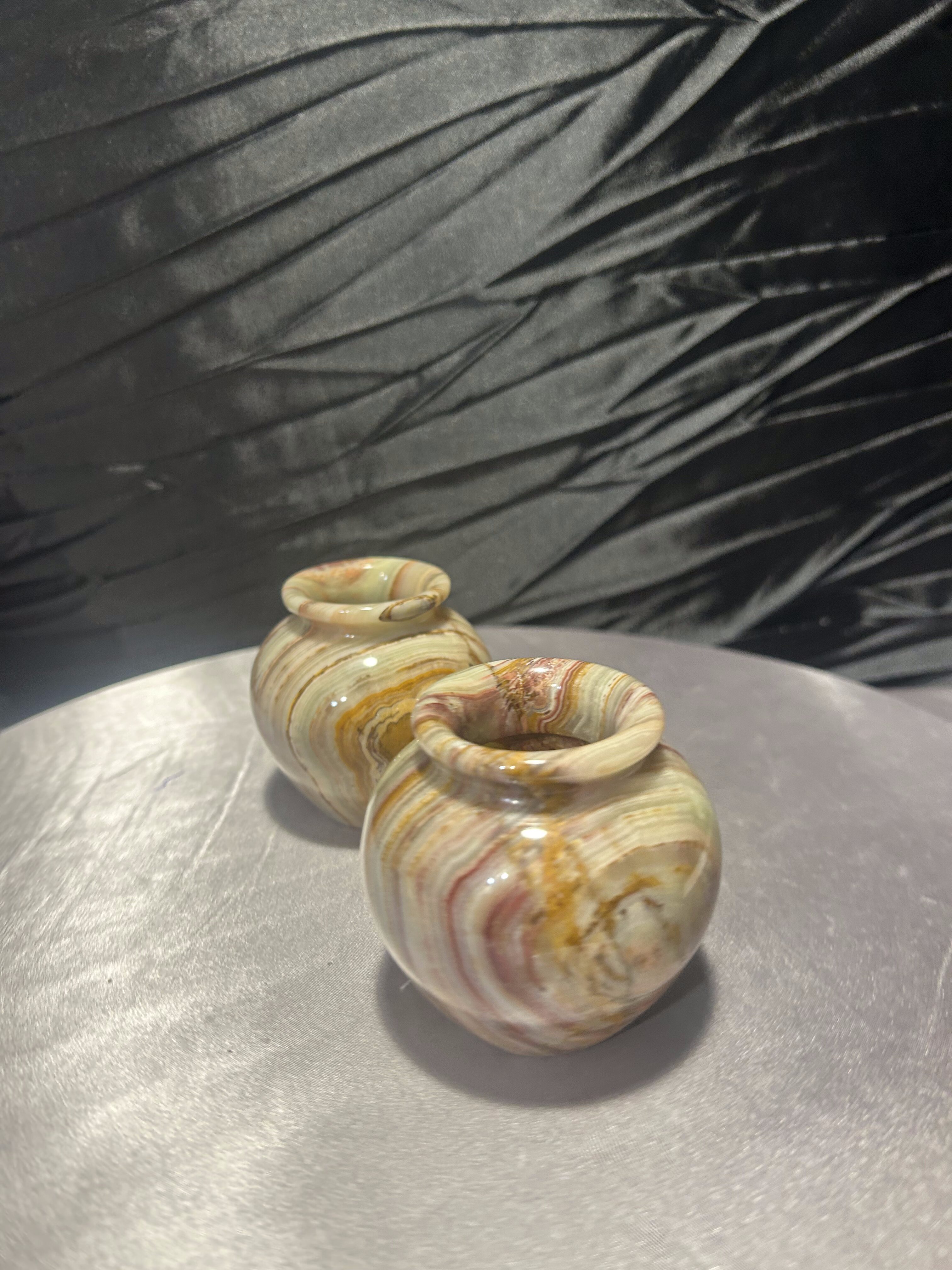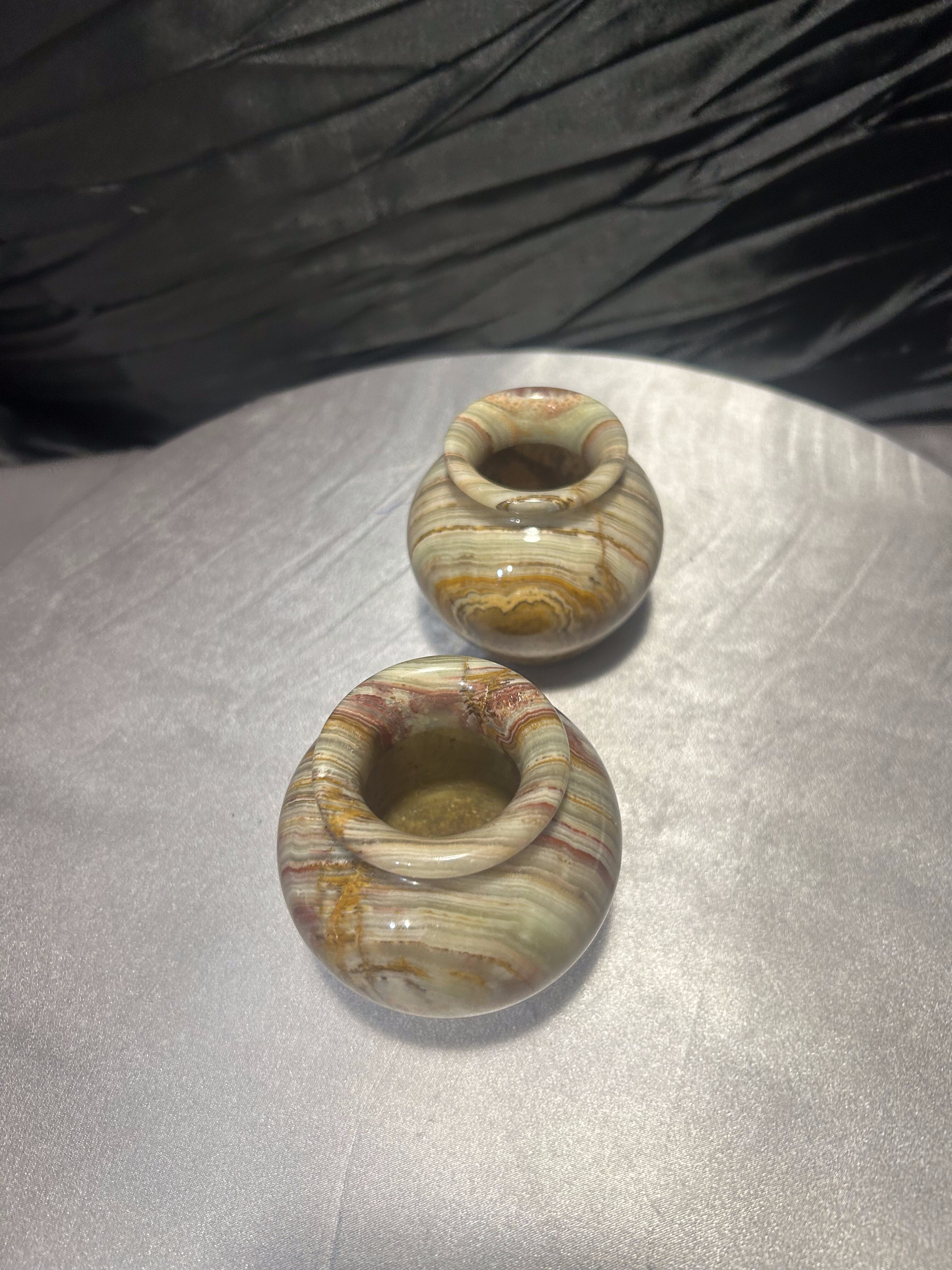 Wyjątkowy komplet dwóch dekoracyjnych flakoników wykonanych z naturalnego onyksu, sygnowanych przez Rock Craft. Każdy z nich został ręcznie toczony z jednolitego bloku kamienia, dzięki czemu układ barwnych warstw tworzy niepowtarzalny, naturalny wzór.