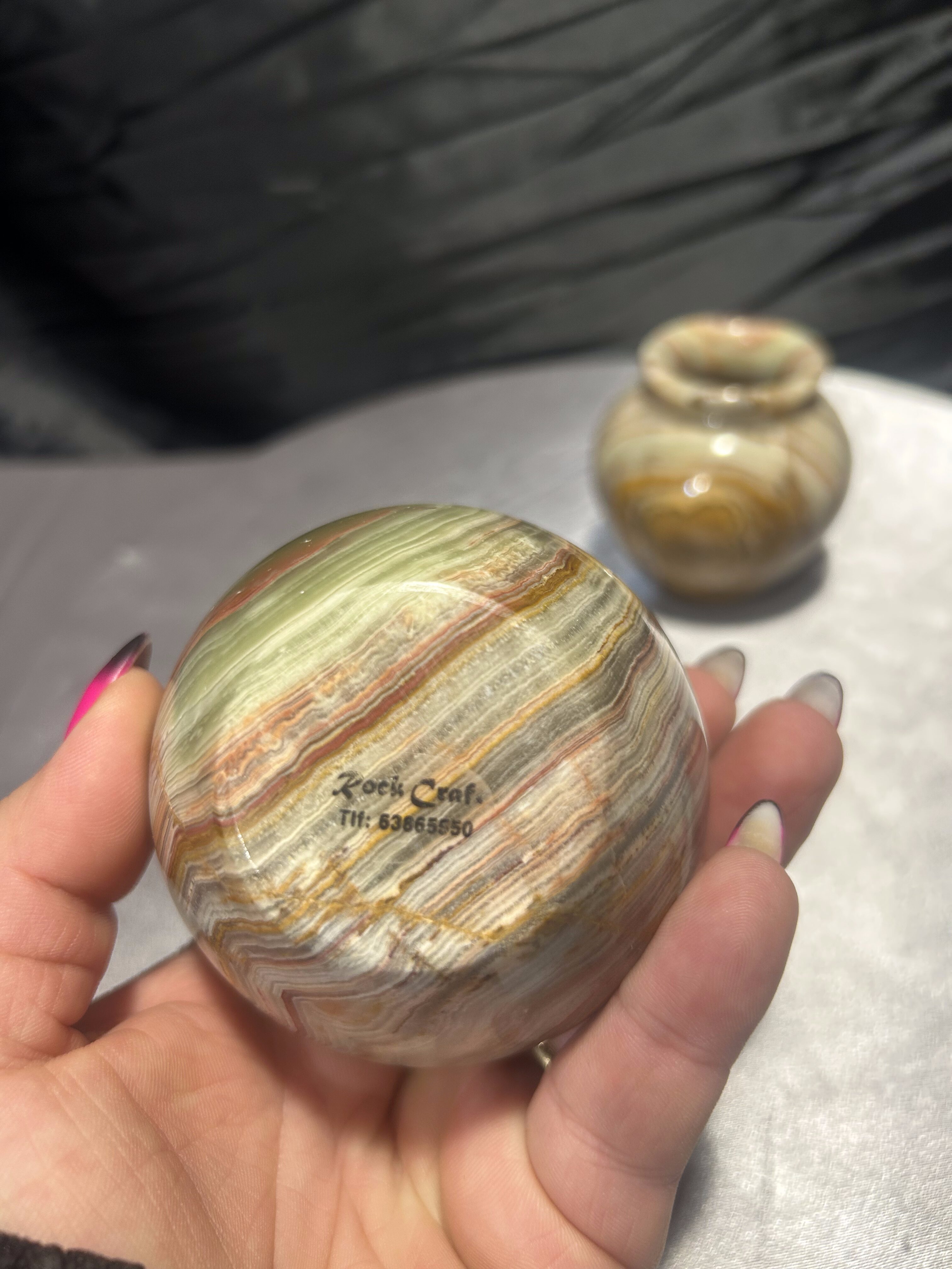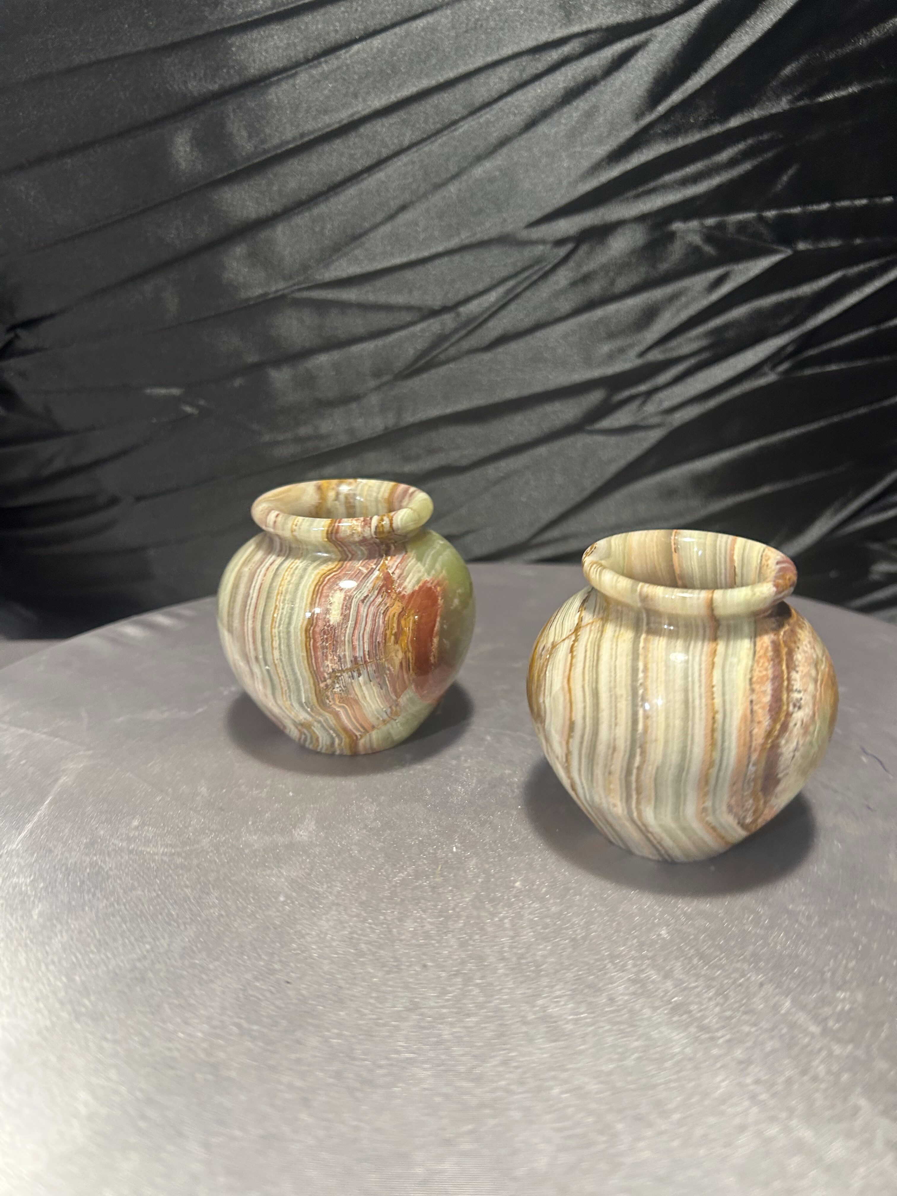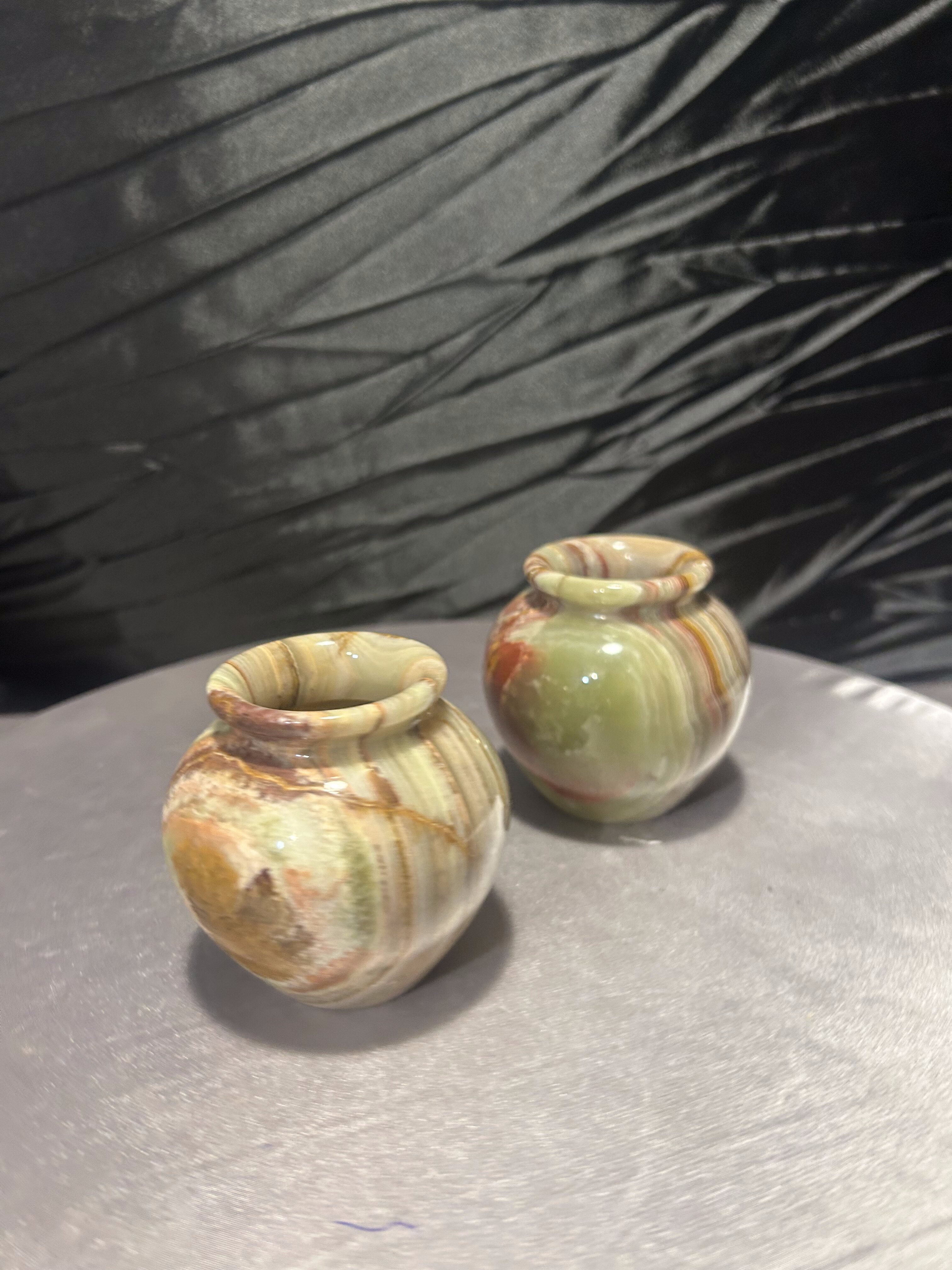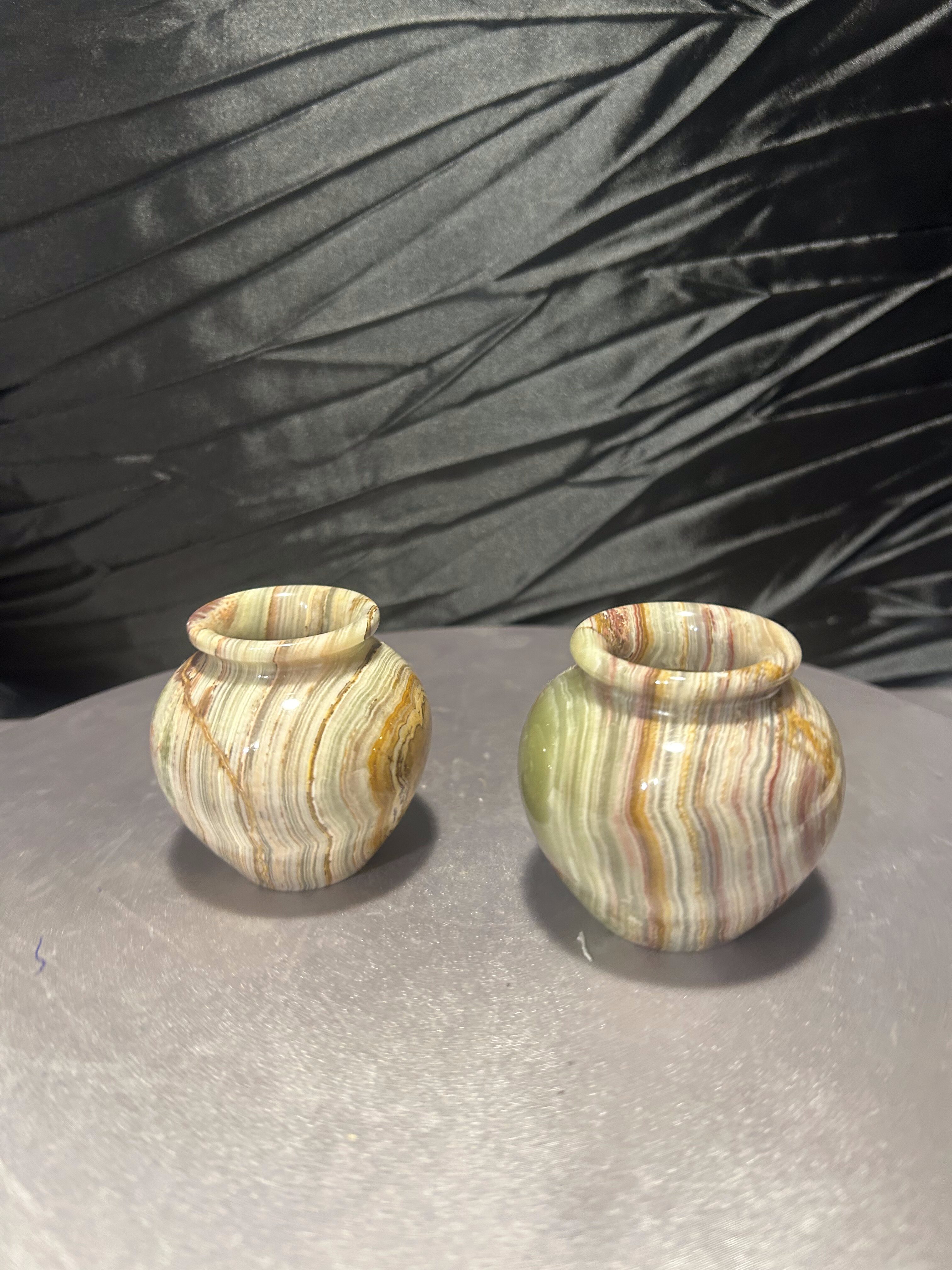 Wyjątkowy komplet dwóch dekoracyjnych flakoników wykonanych z naturalnego onyksu, sygnowanych przez Rock Craft. Każdy z nich został ręcznie toczony z jednolitego bloku kamienia, dzięki czemu układ barwnych warstw tworzy niepowtarzalny, naturalny wzór.