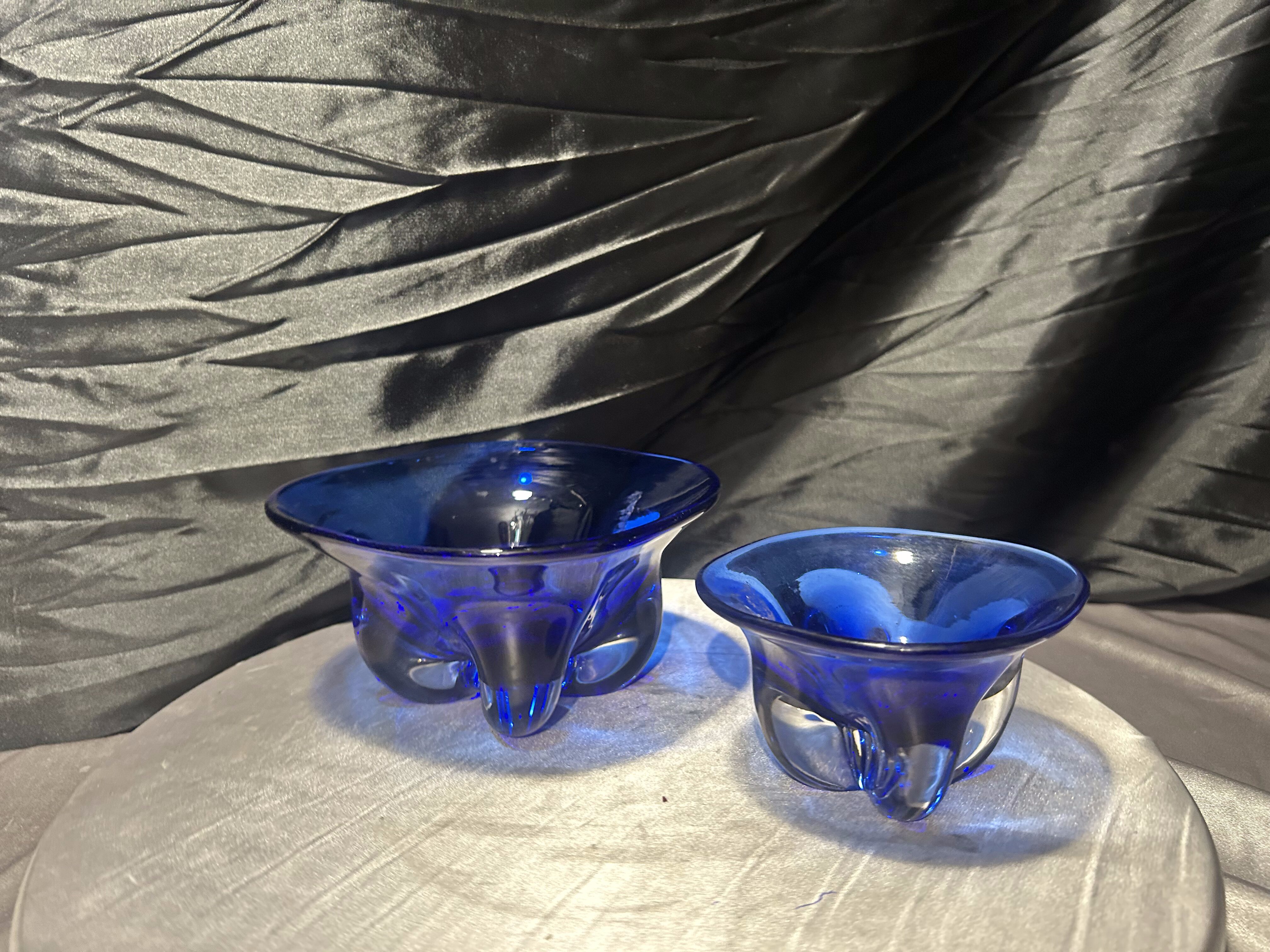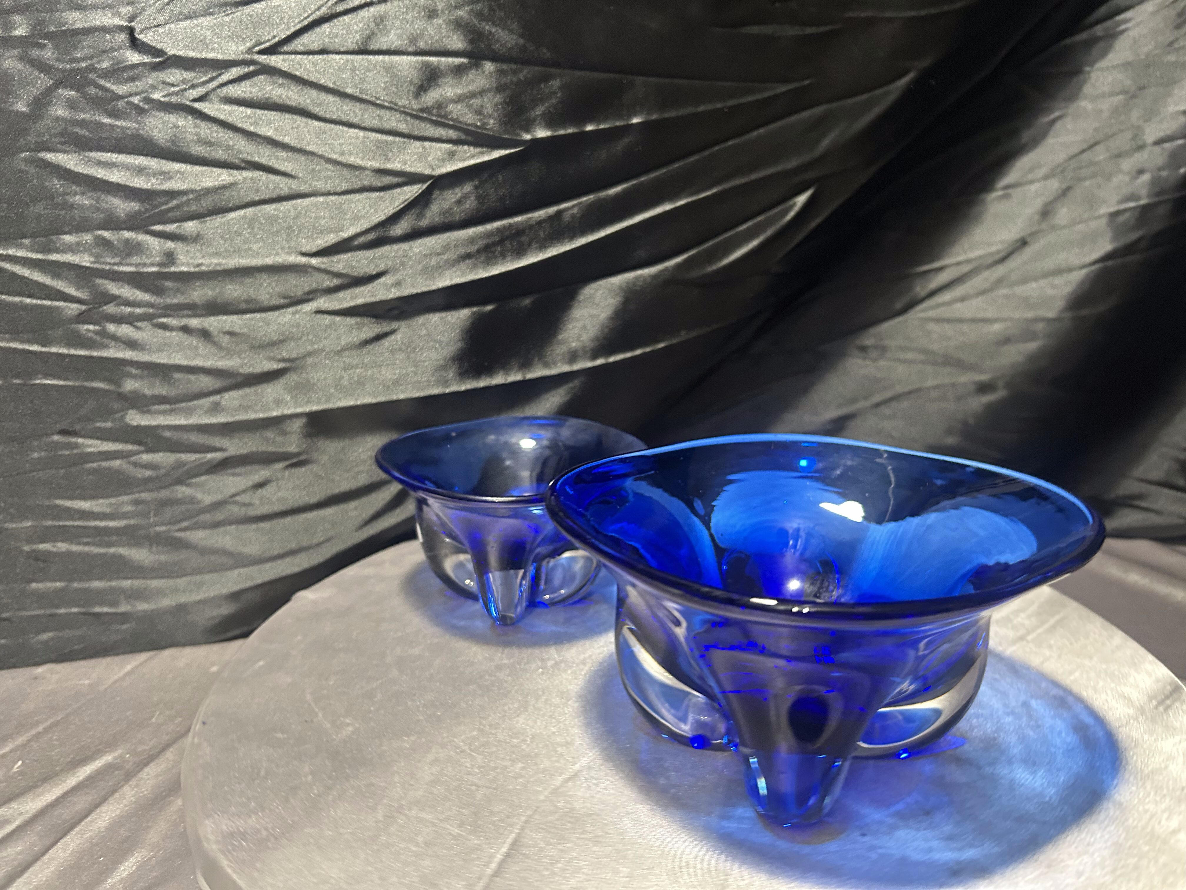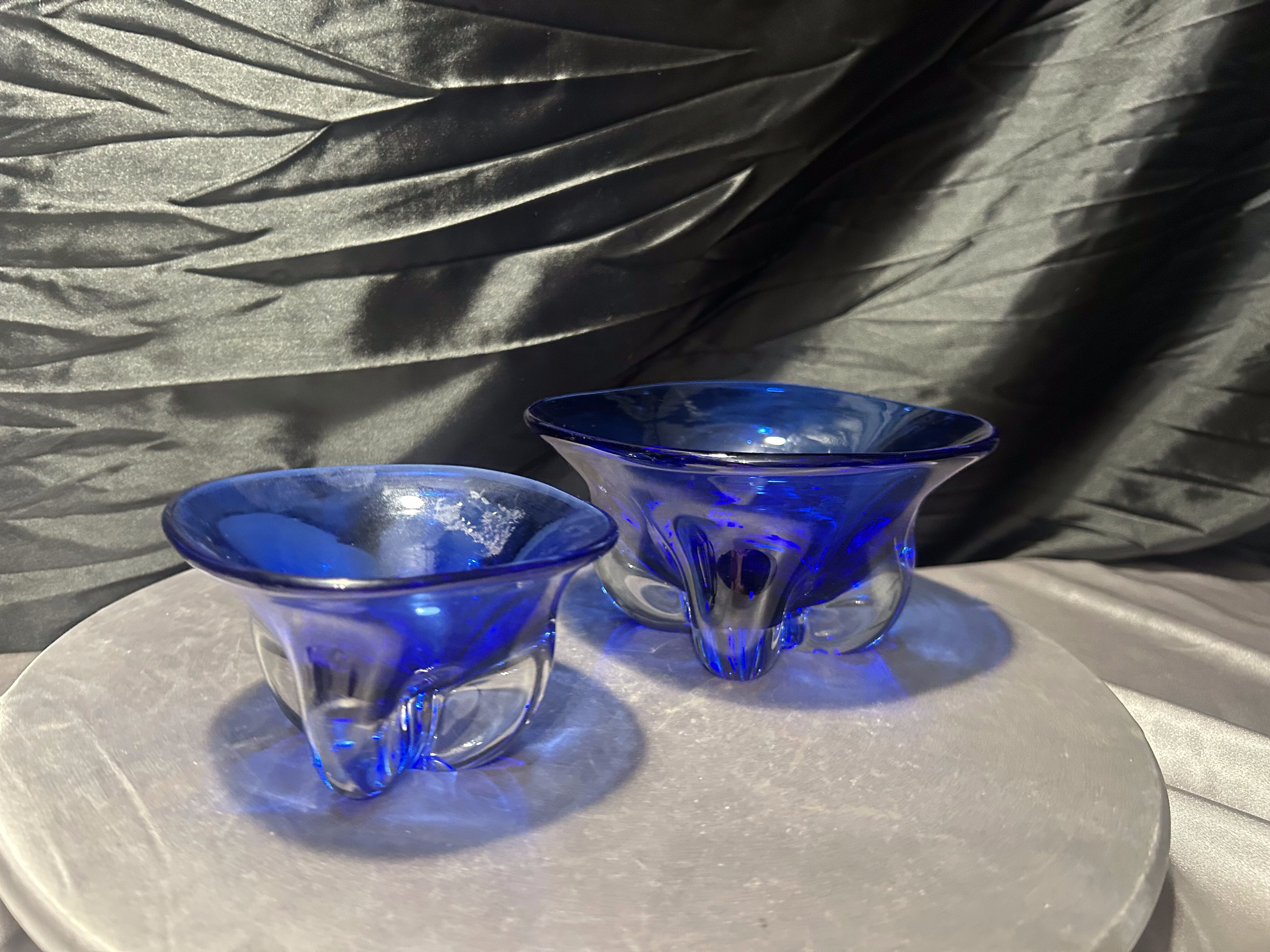 Komplet dwóch dekoracyjnych mis wykonanych ze szkła artystycznego w głębokim, intensywnym odcieniu granatu. Charakterystyczna, rozszerzająca się ku górze forma oraz masywna, profilowana podstawa nadają im wyrazisty, rzeźbiarski charakter.