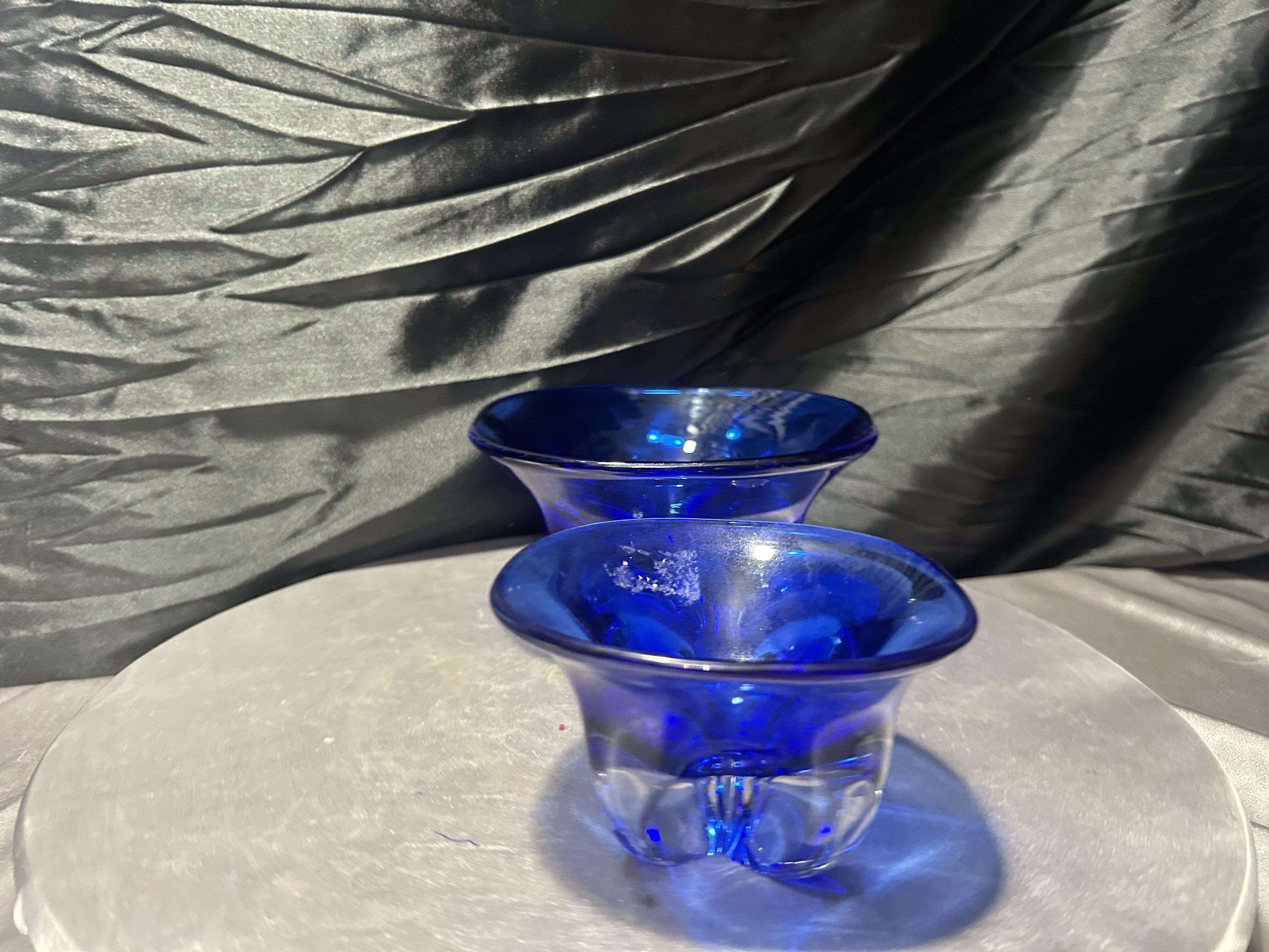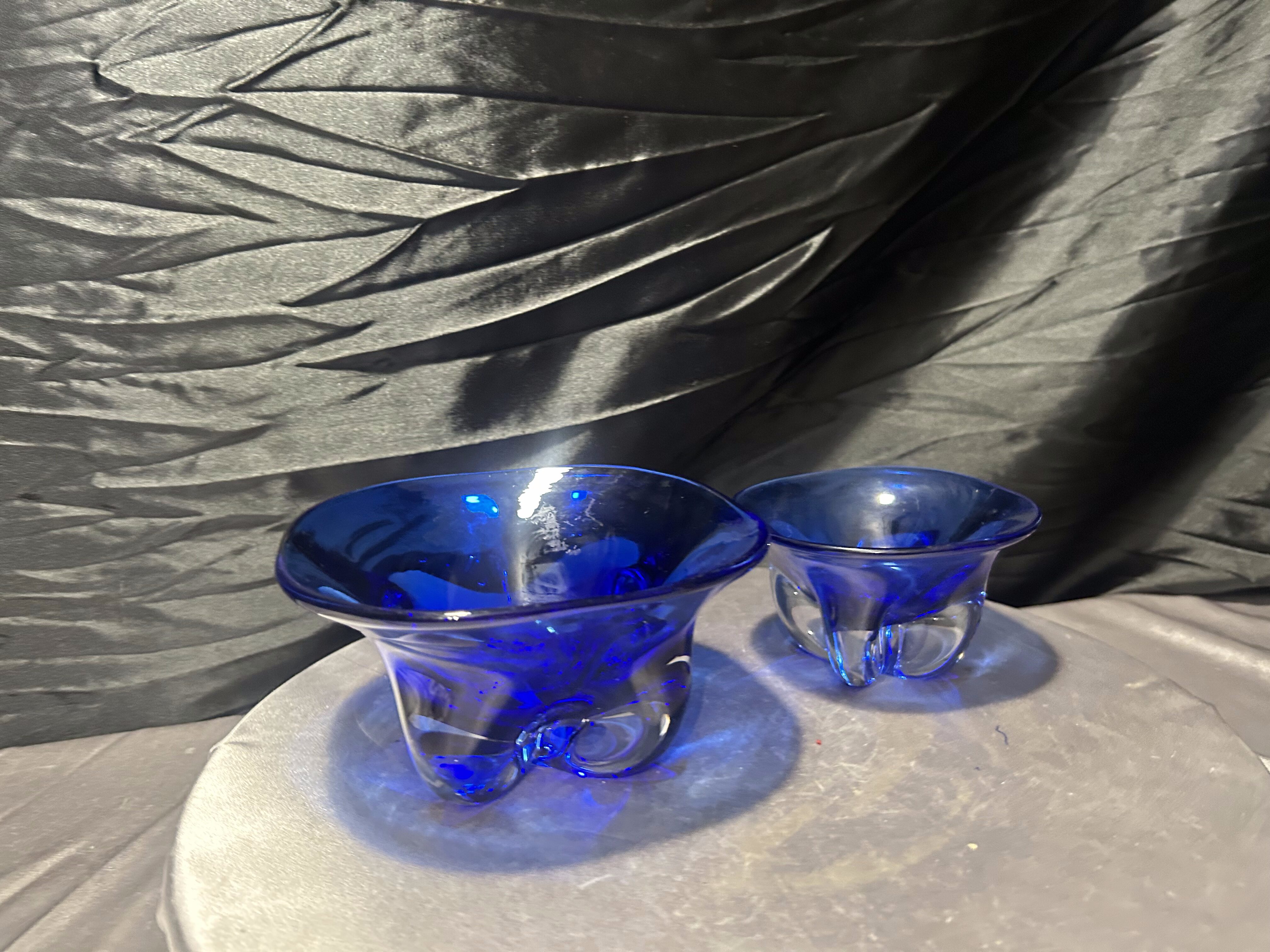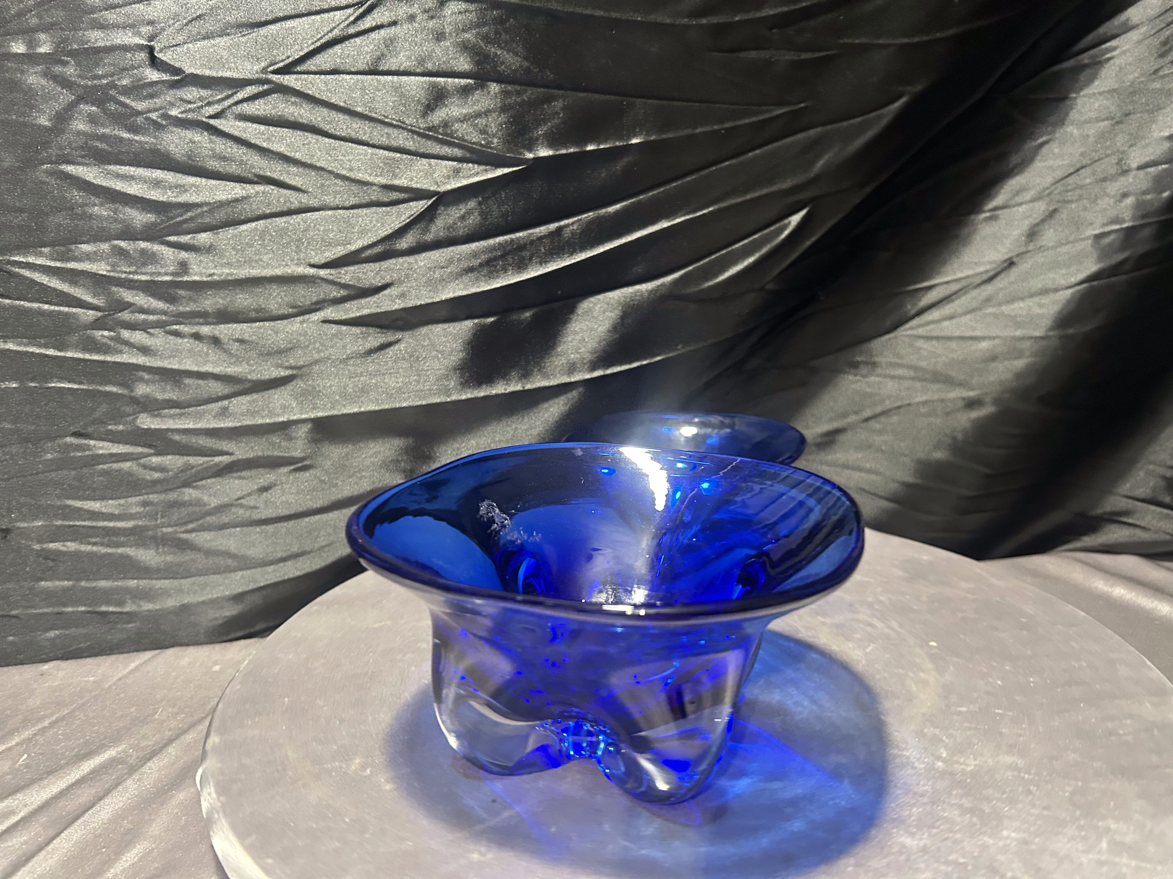 Komplet dwóch dekoracyjnych mis wykonanych ze szkła artystycznego w głębokim, intensywnym odcieniu granatu. Charakterystyczna, rozszerzająca się ku górze forma oraz masywna, profilowana podstawa nadają im wyrazisty, rzeźbiarski charakter.