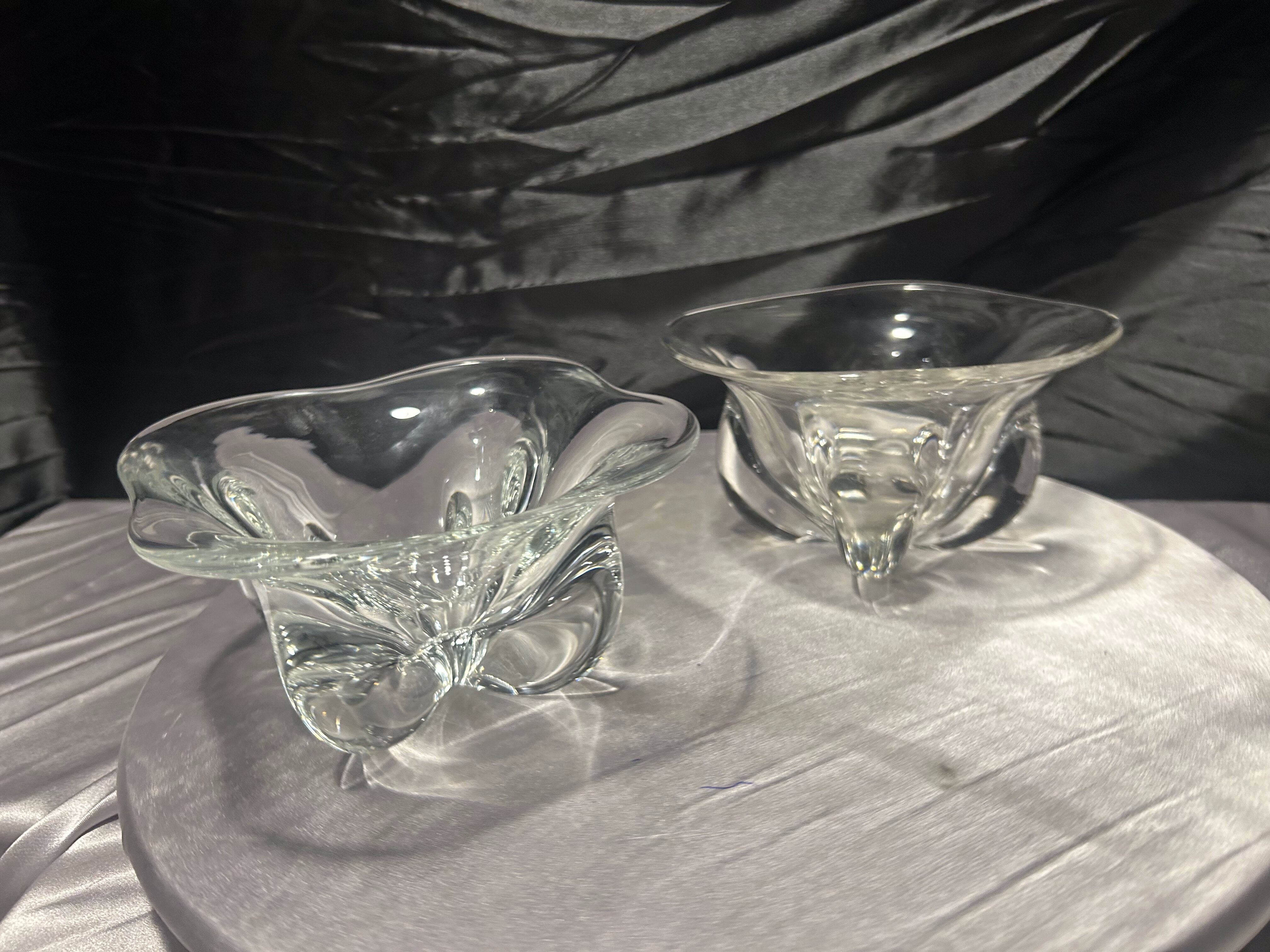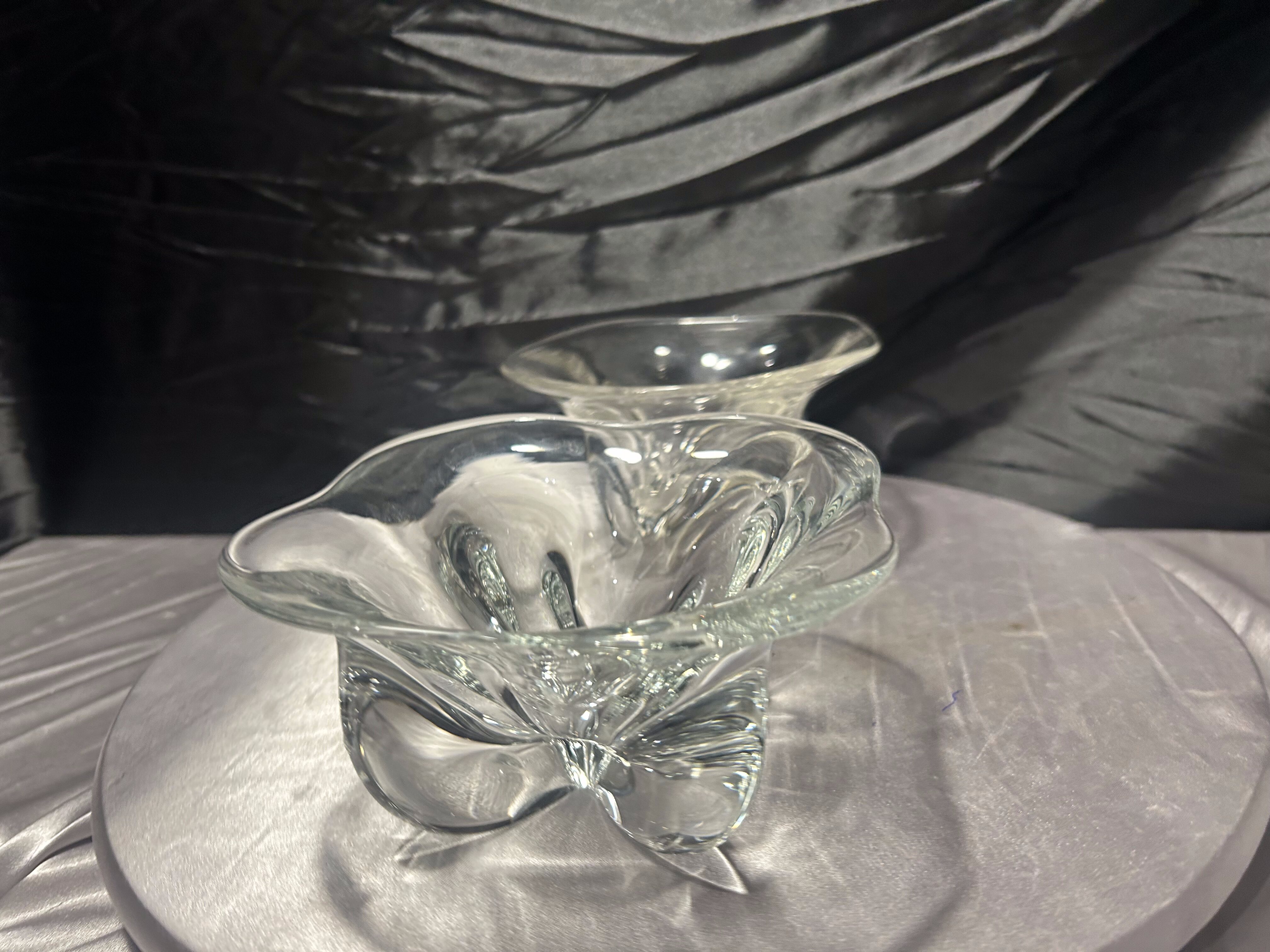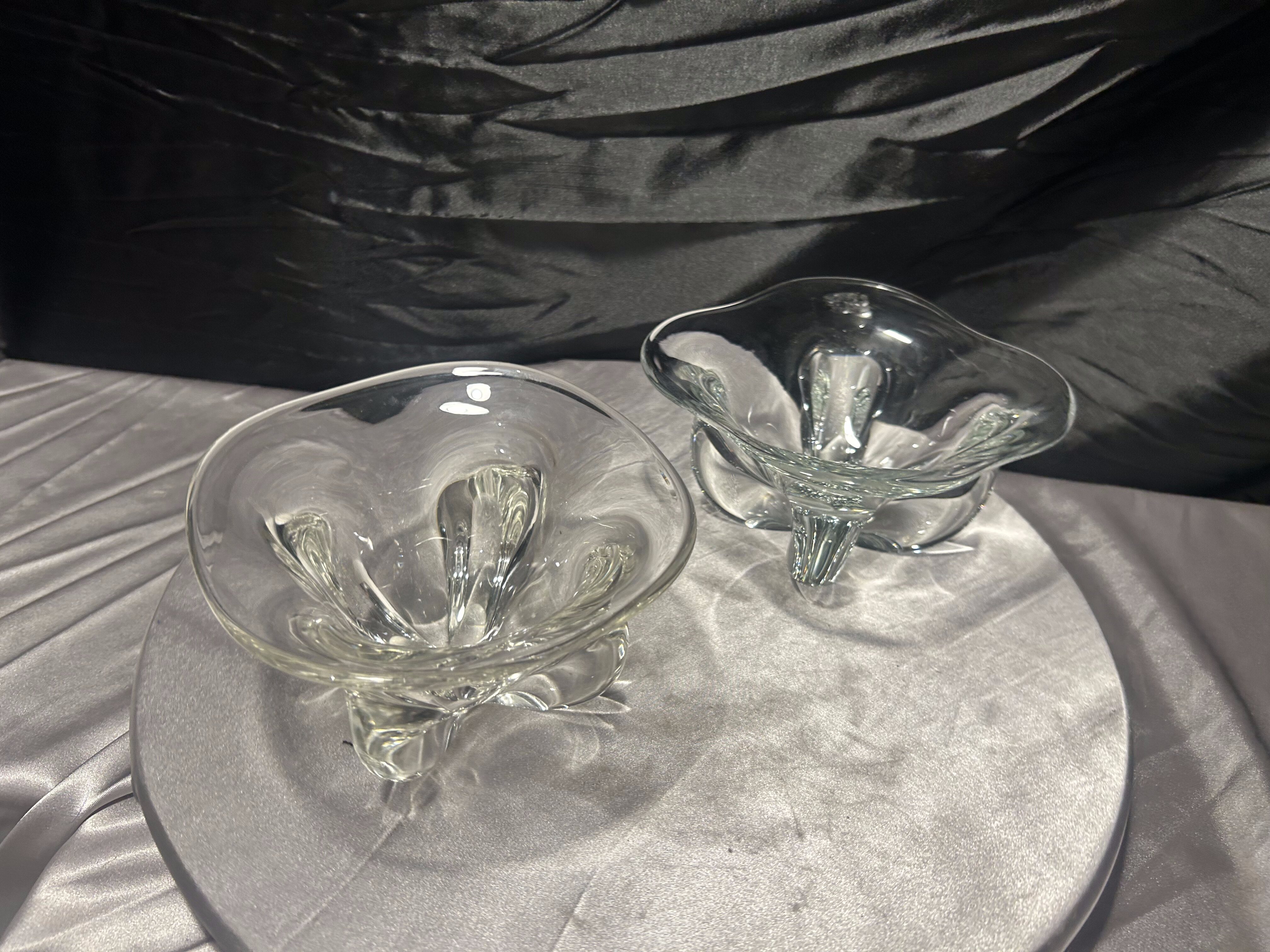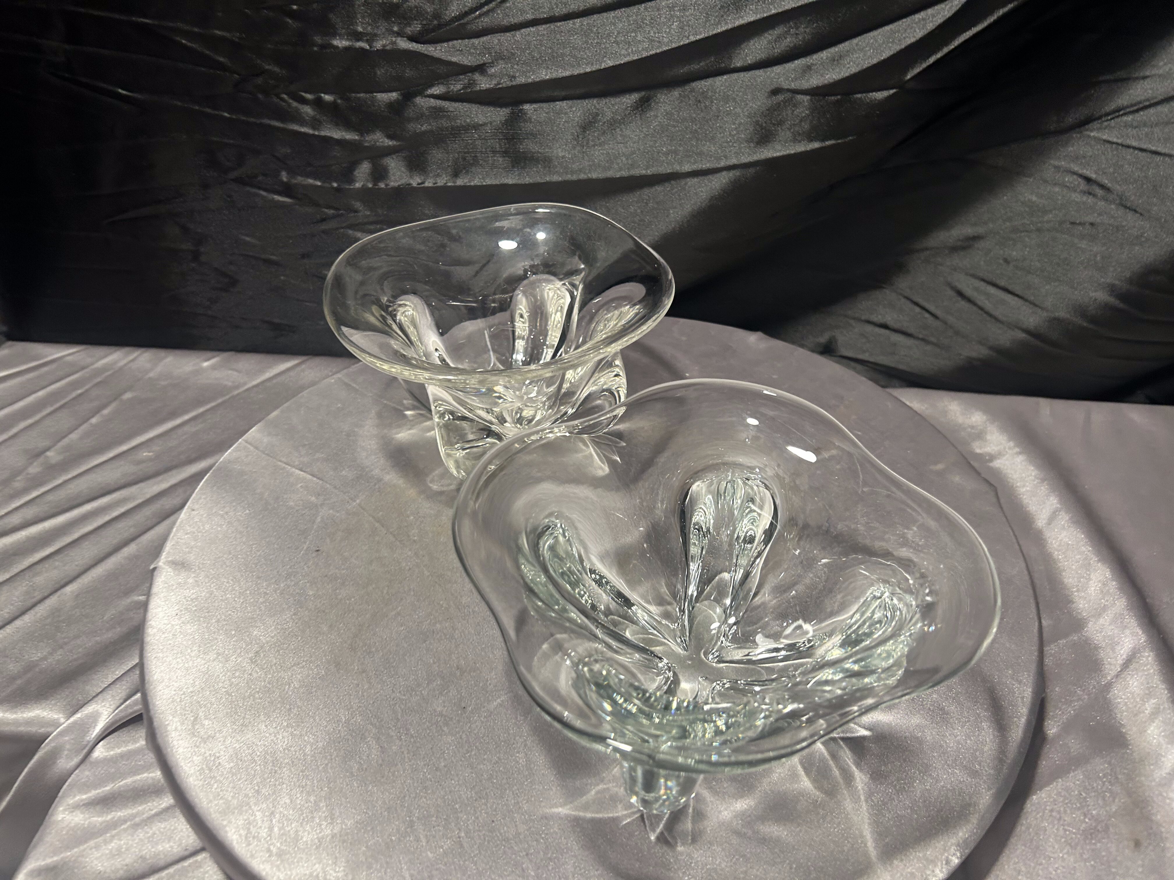 Komplet dwóch dekoracyjnych mis wykonanych z grubego, transparentnego szkła artystycznego. Forma o miękko falowanej krawędzi oraz dynamicznie uformowane wnętrze nadają im rzeźbiarski charakter.