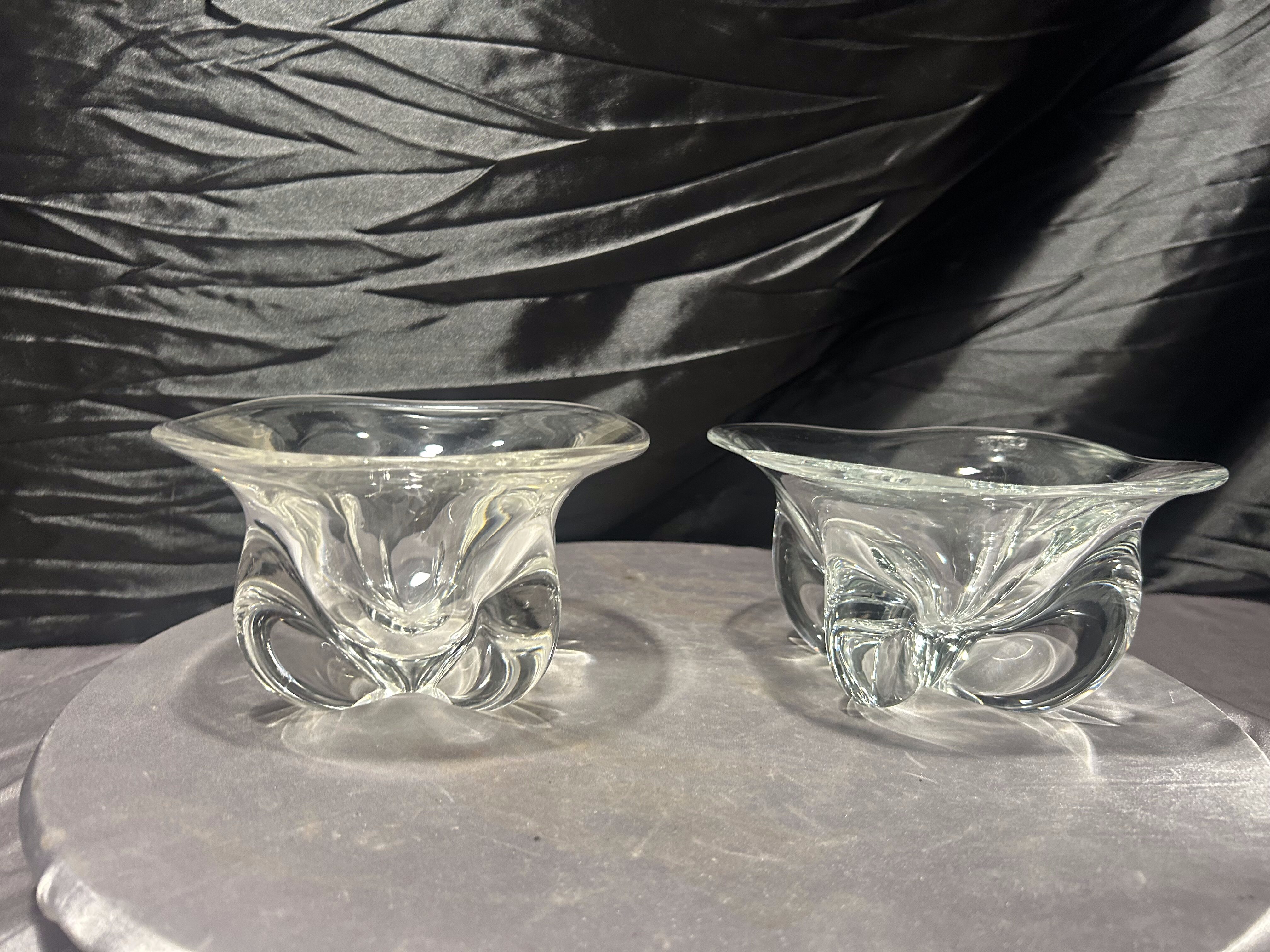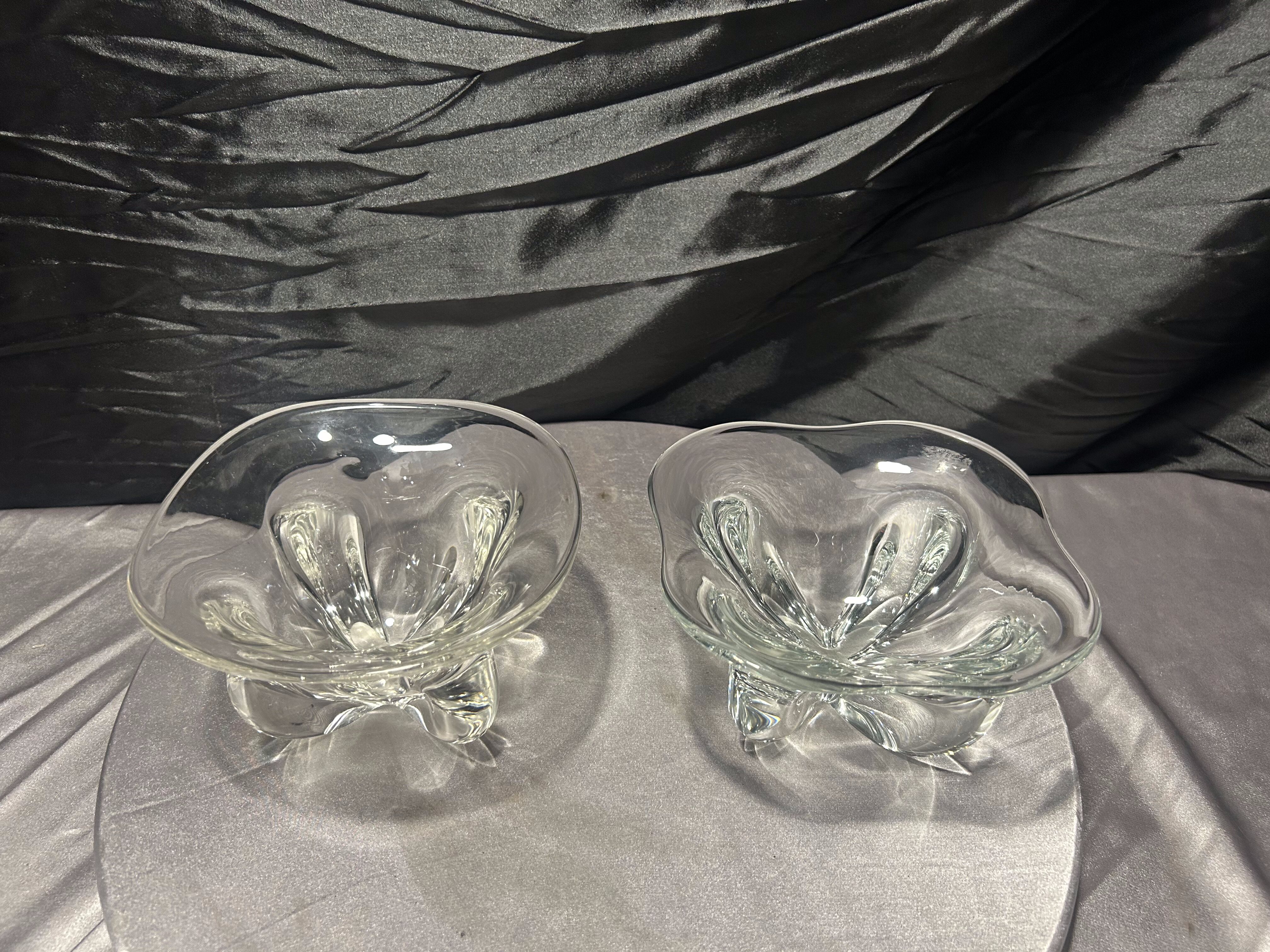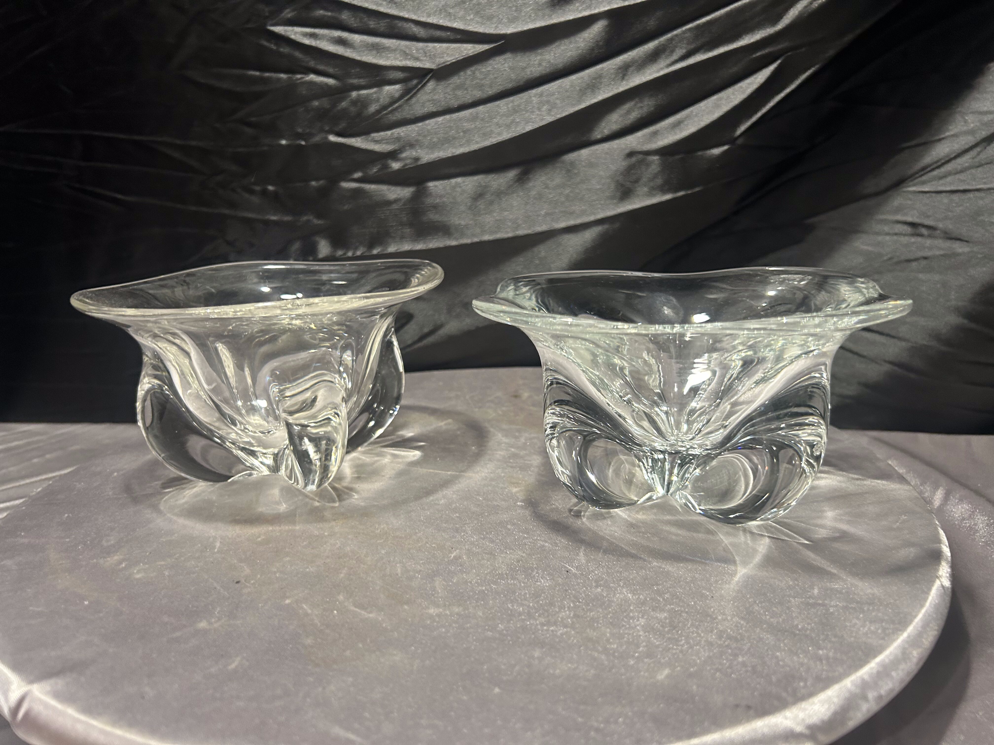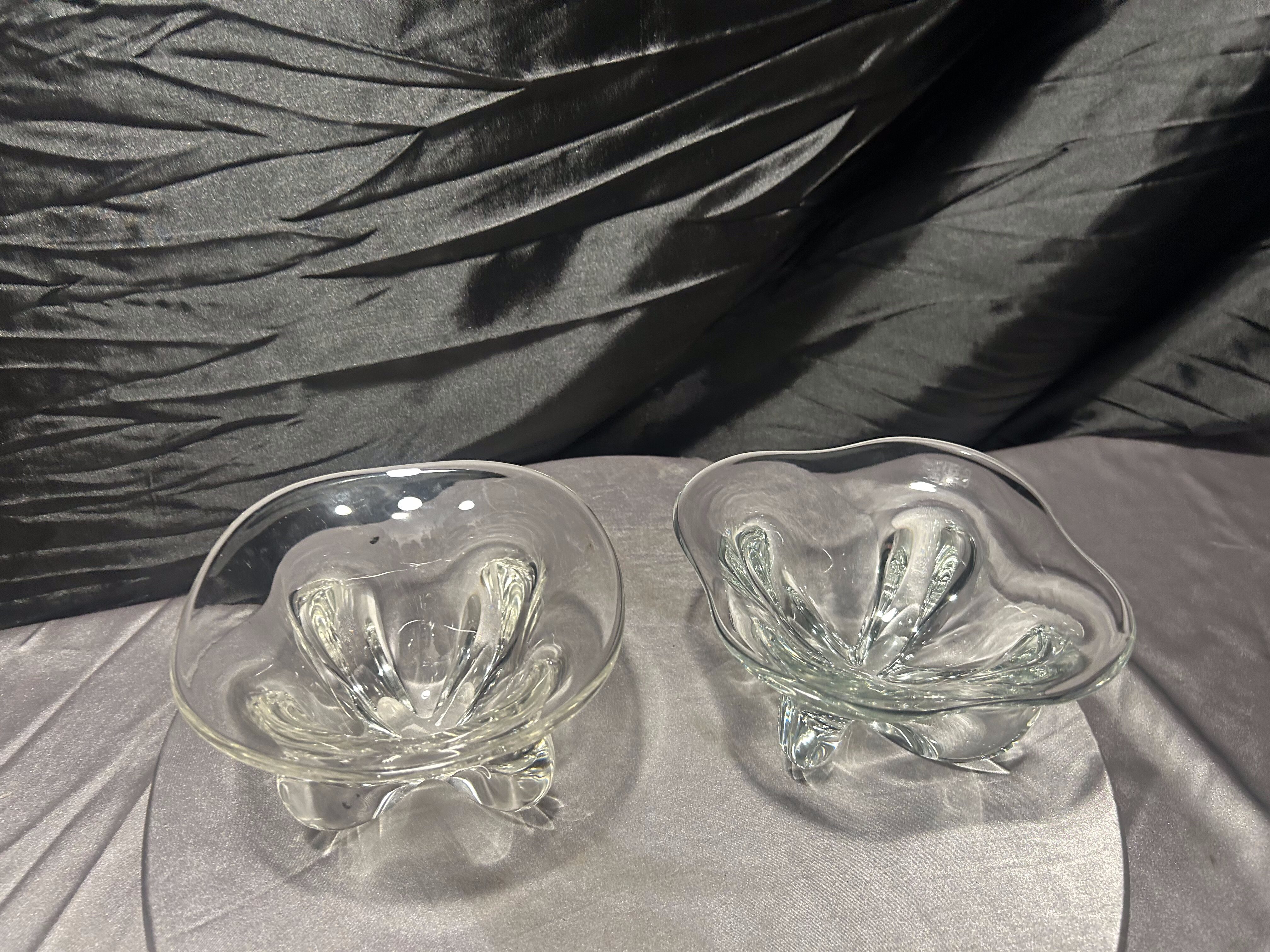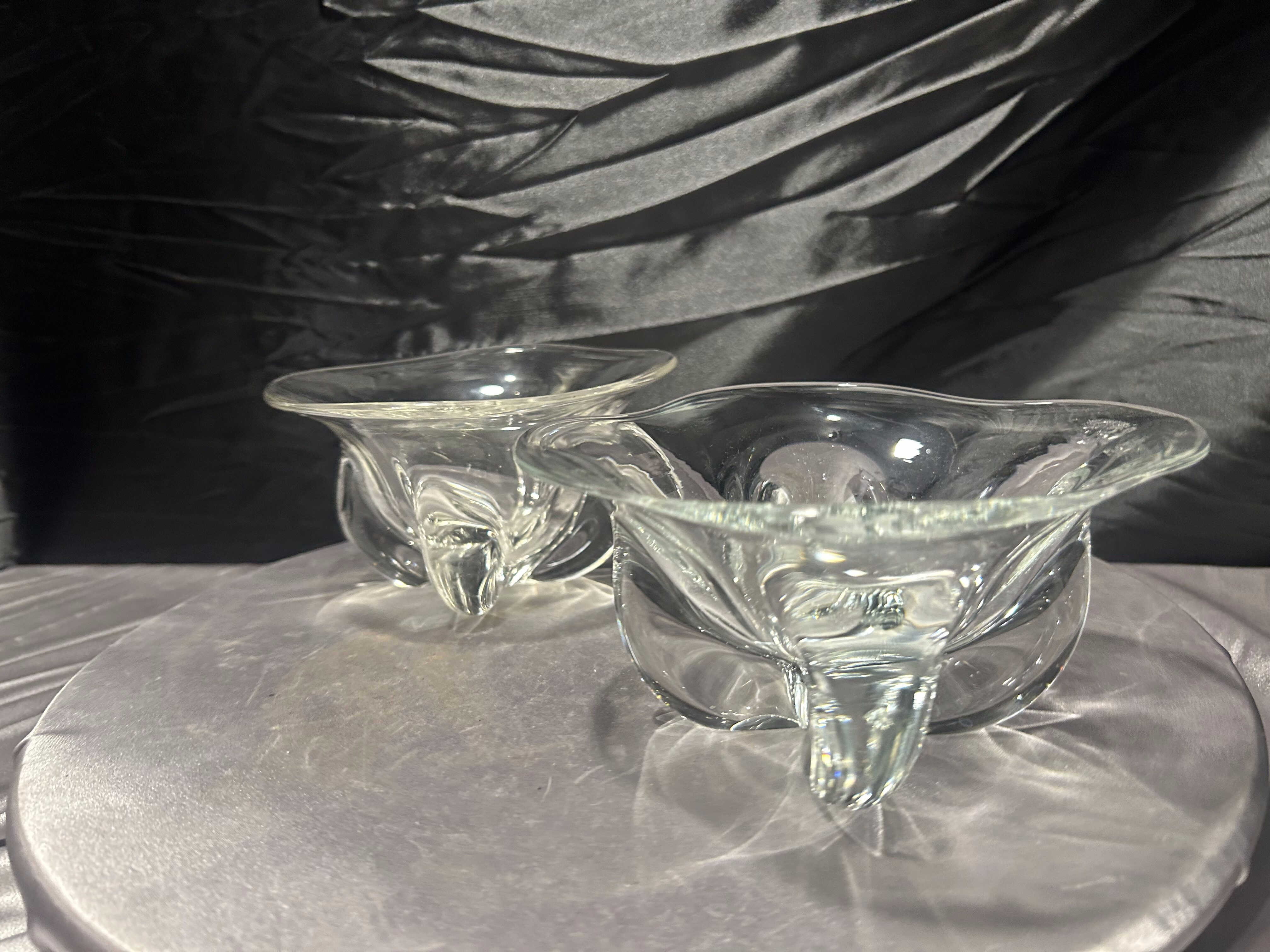 Komplet dwóch dekoracyjnych mis wykonanych z grubego, transparentnego szkła artystycznego. Forma o miękko falowanej krawędzi oraz dynamicznie uformowane wnętrze nadają im rzeźbiarski charakter.
