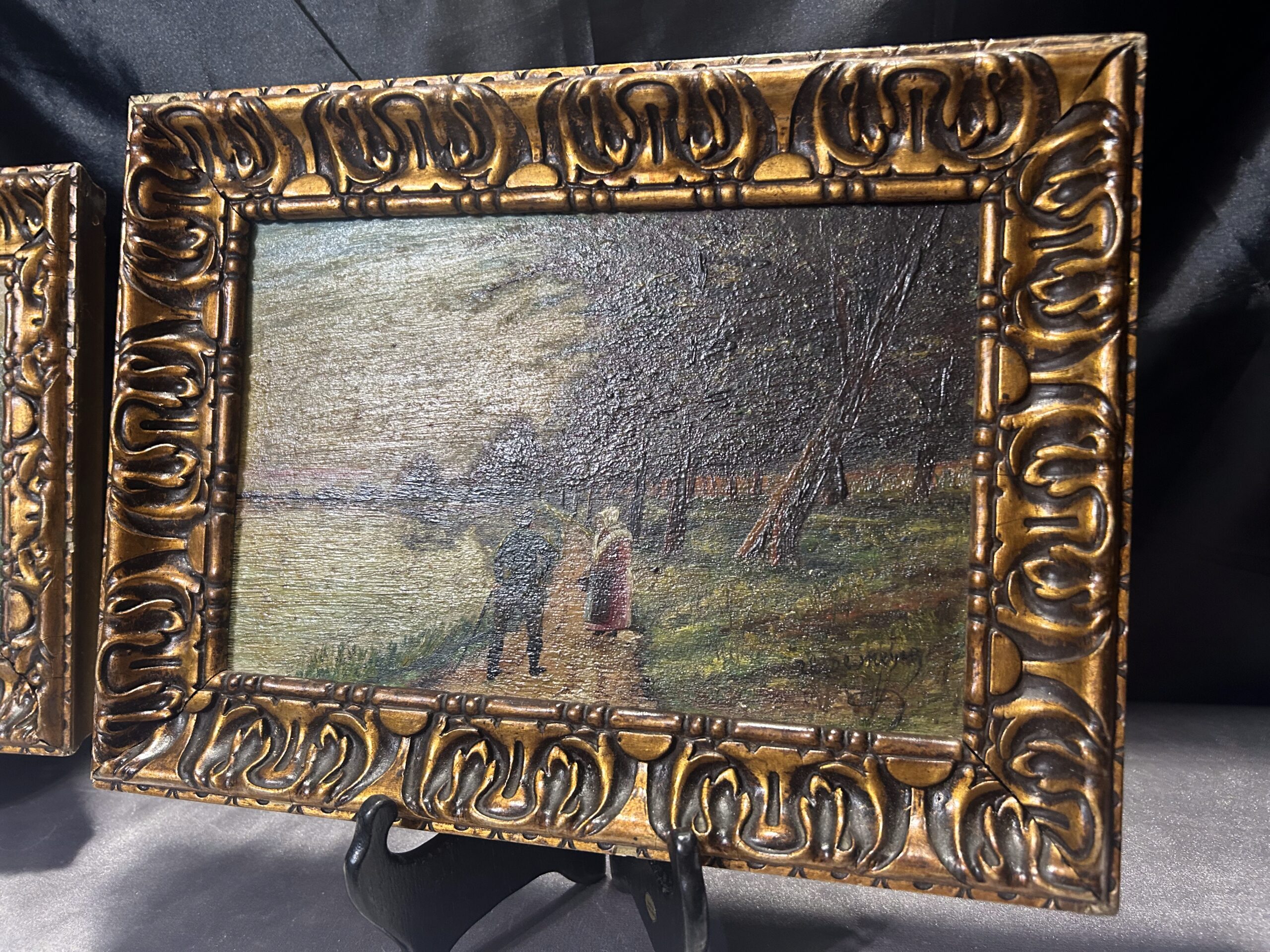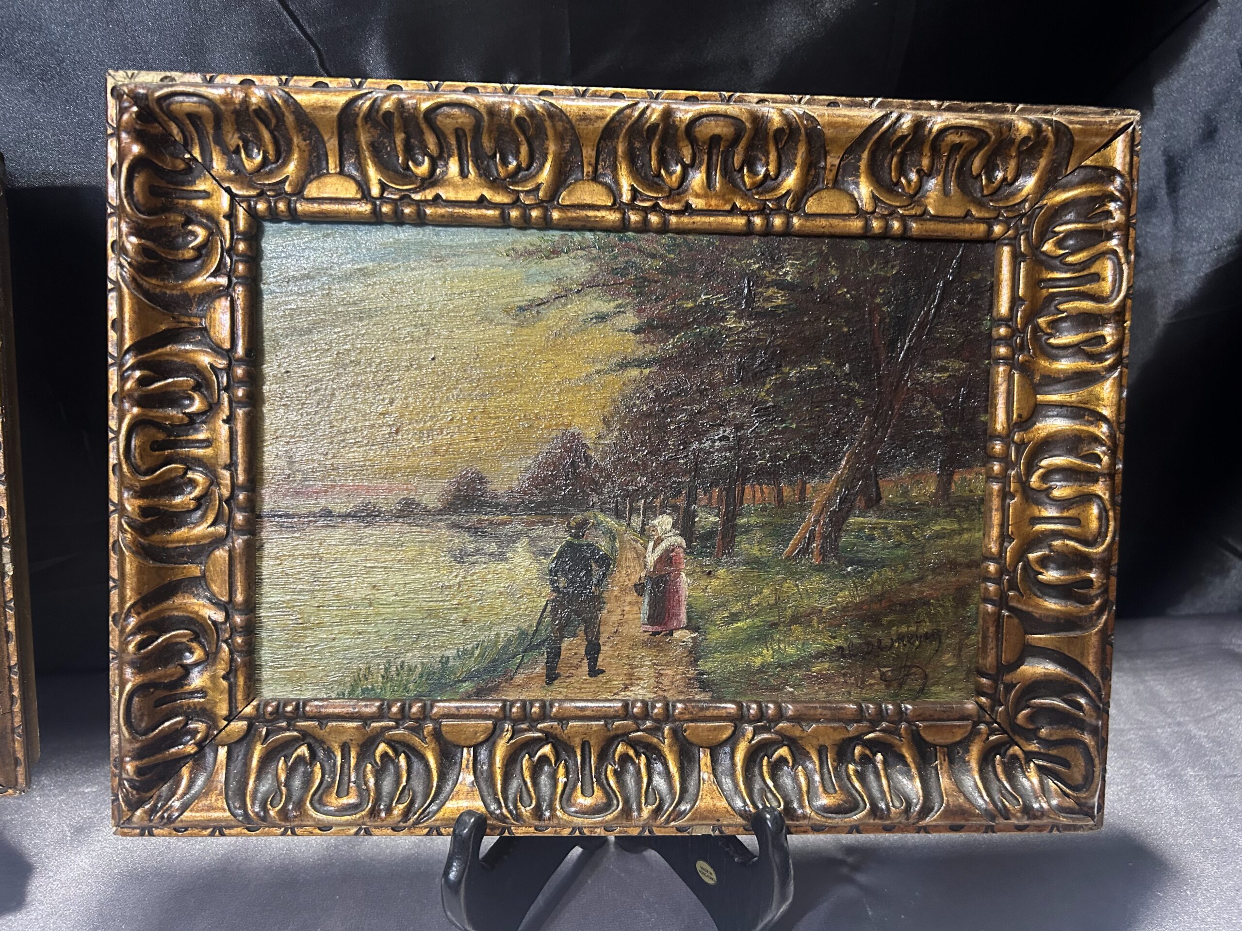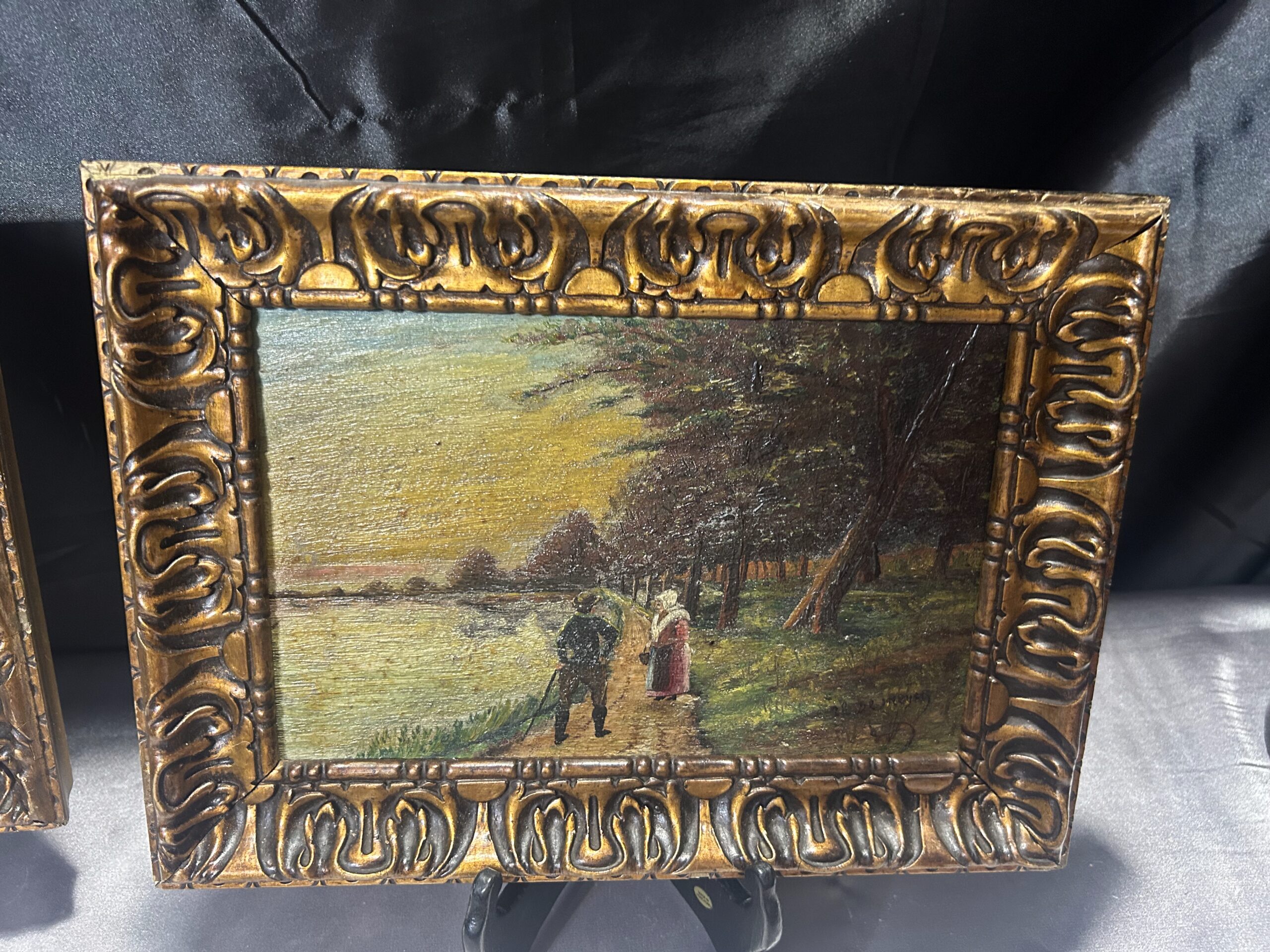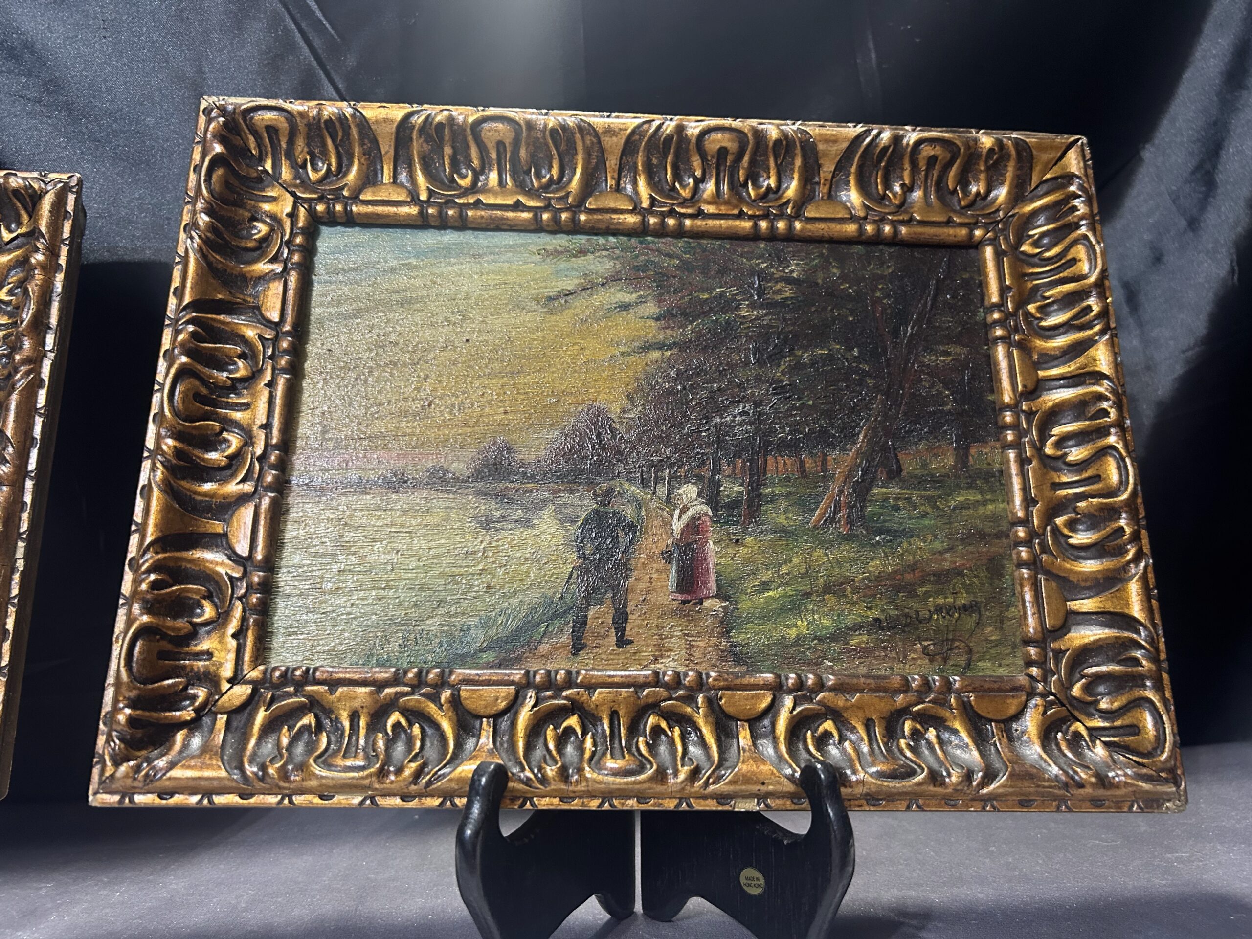 Zestaw Dwóch Obrazów Olejnych na Desce – Malownicze Sceny w Złoconych, Drewnianych Ramach