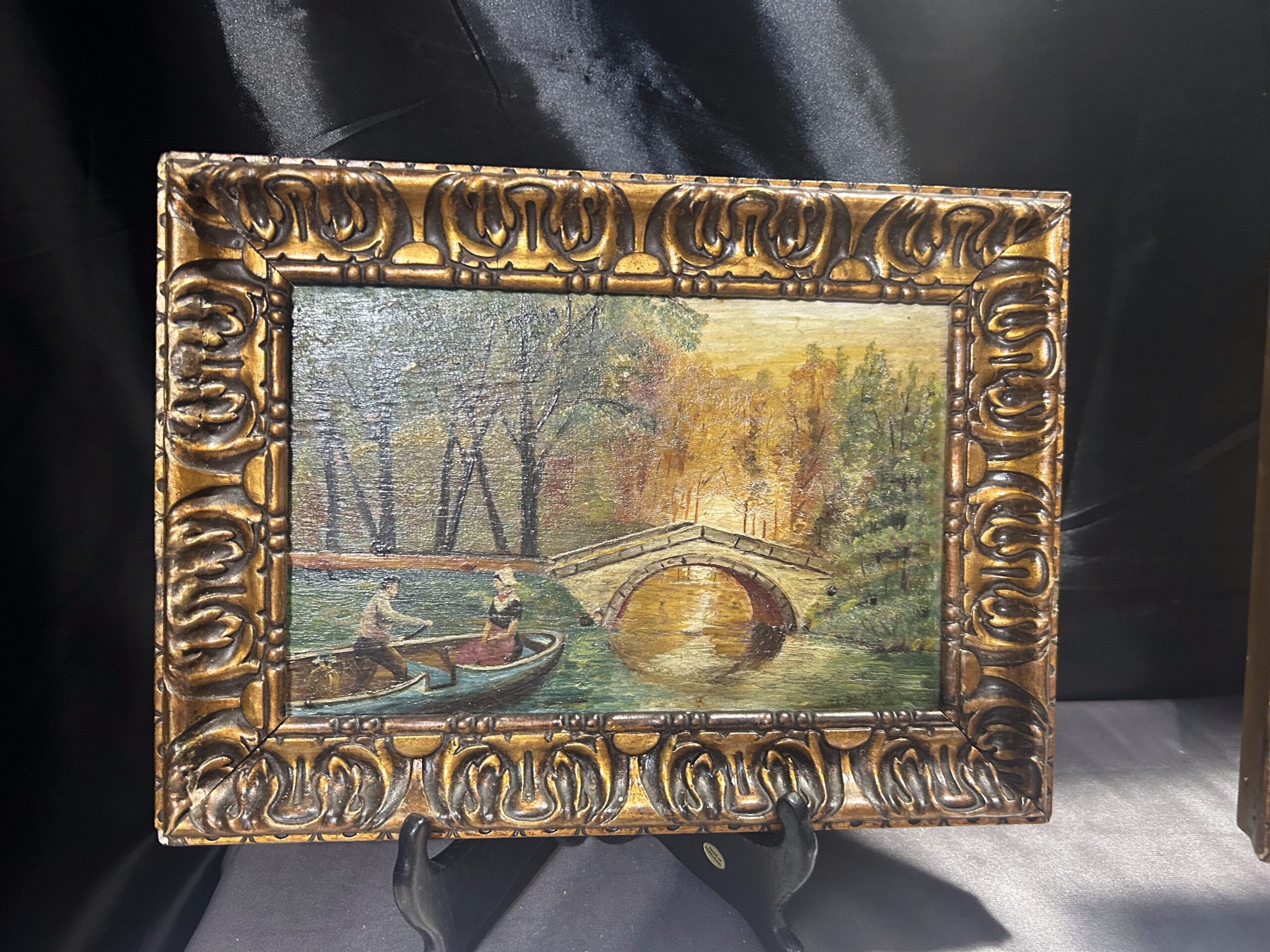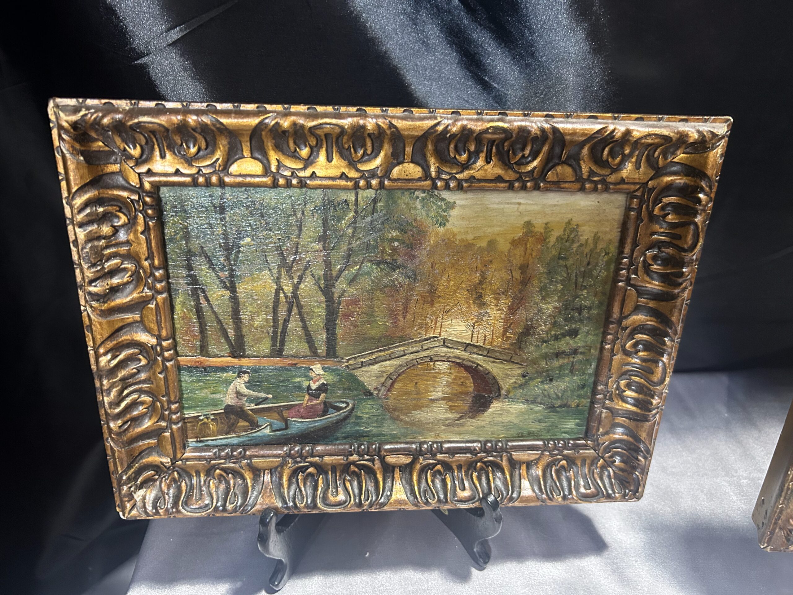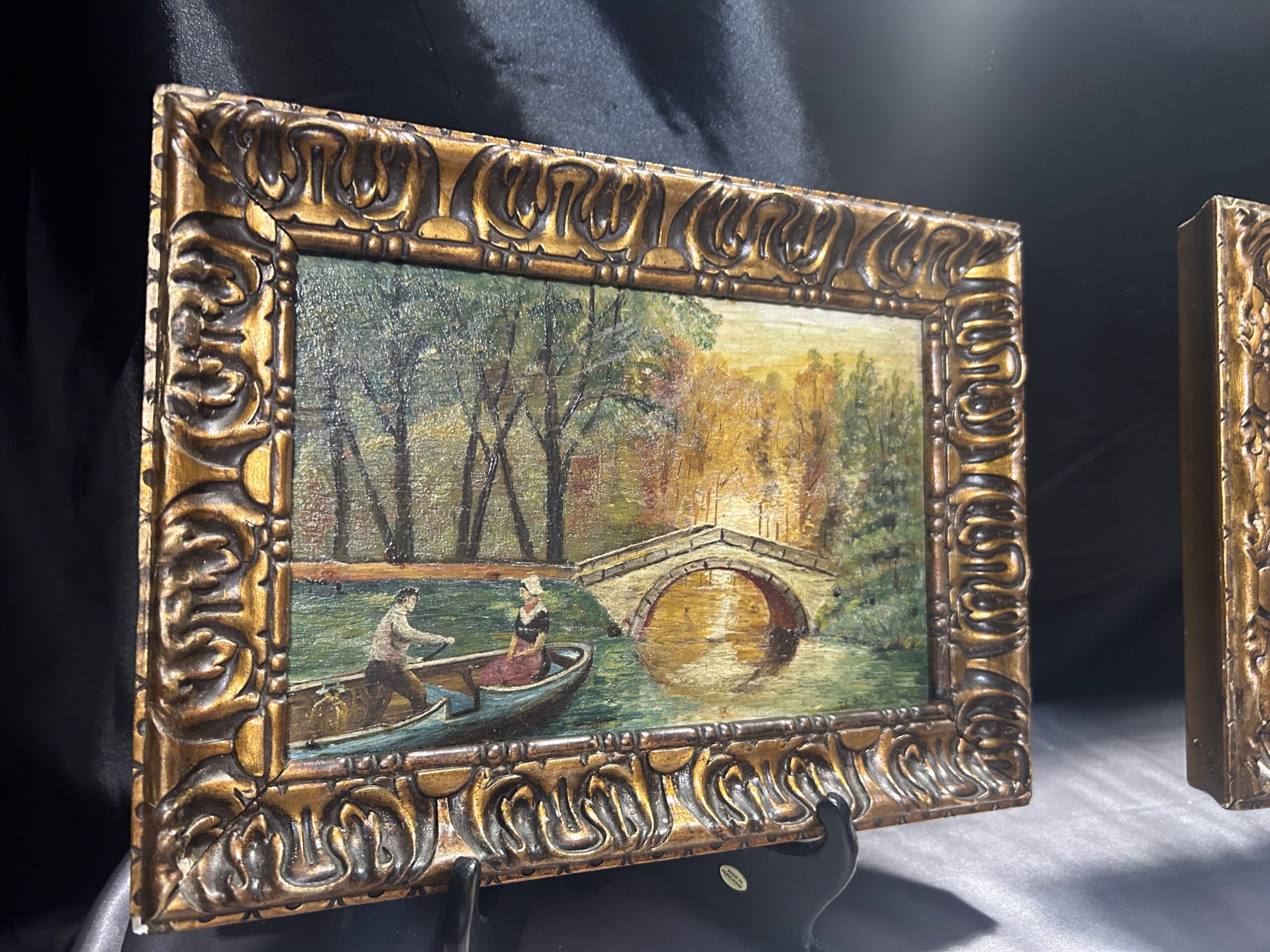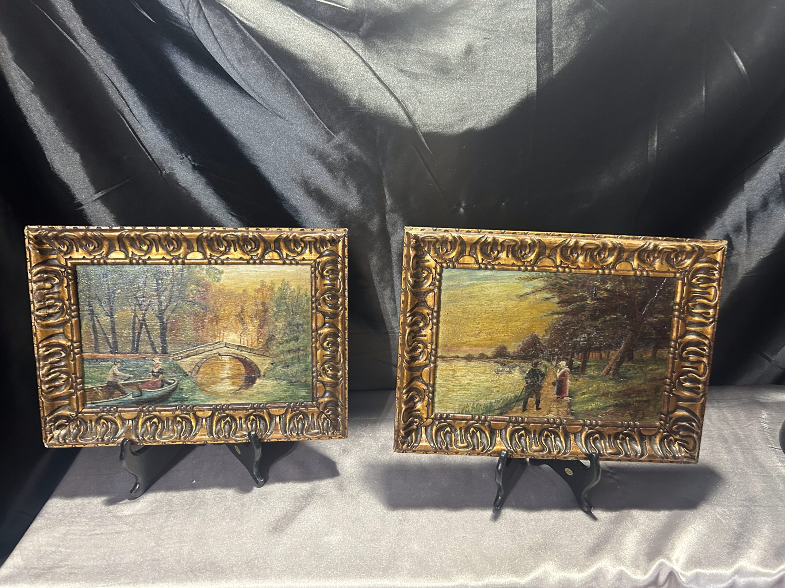 Zestaw Dwóch Obrazów Olejnych na Desce – Malownicze Sceny w Złoconych, Drewnianych Ramach