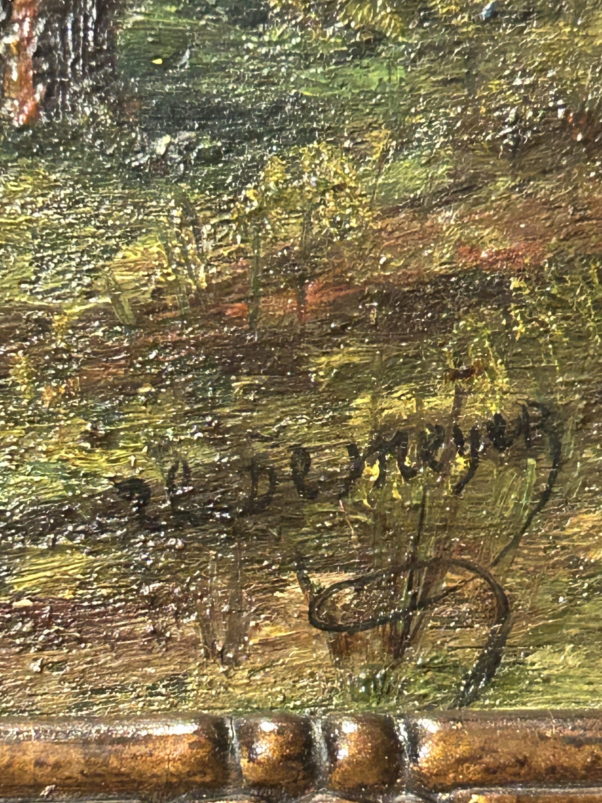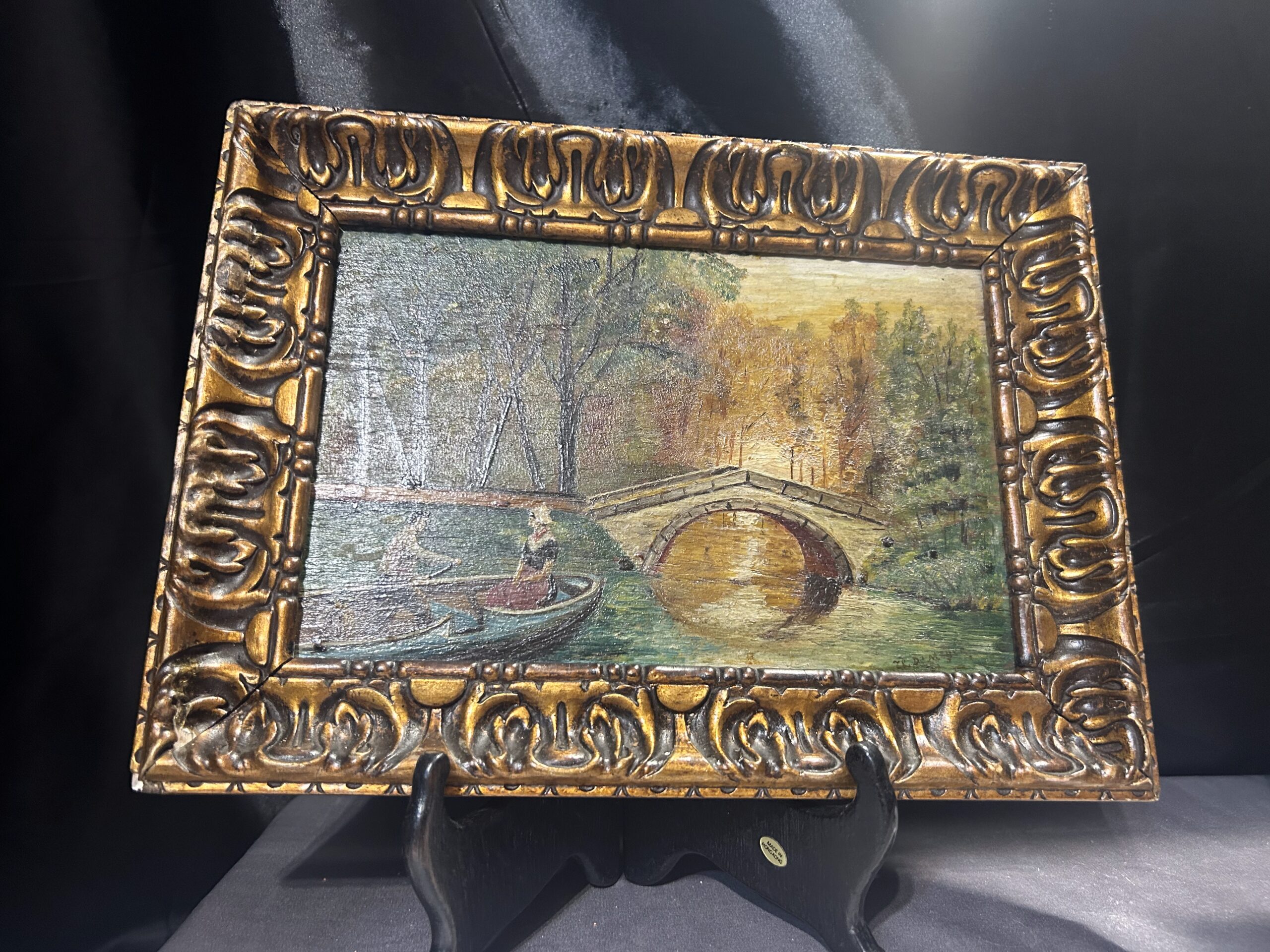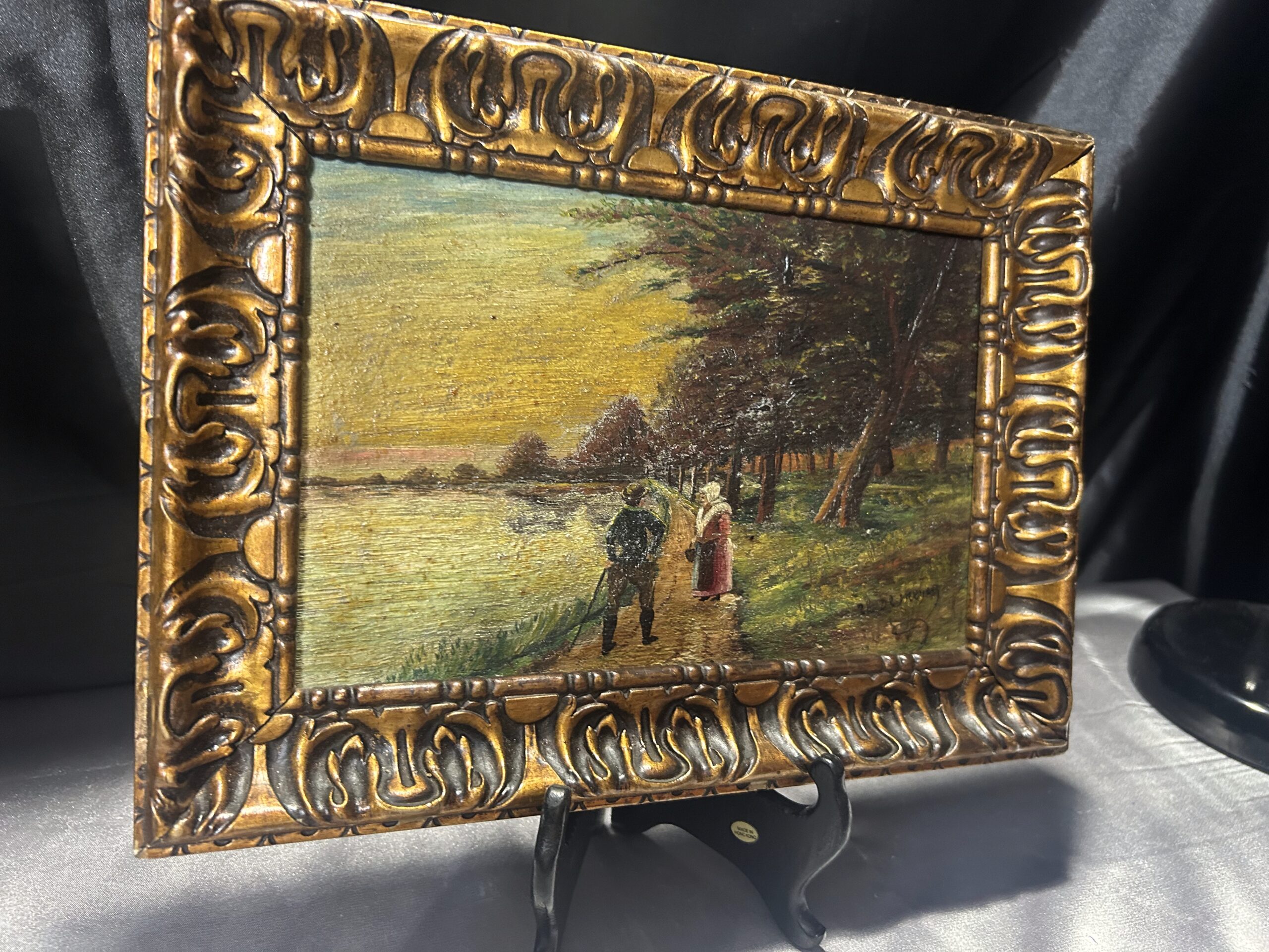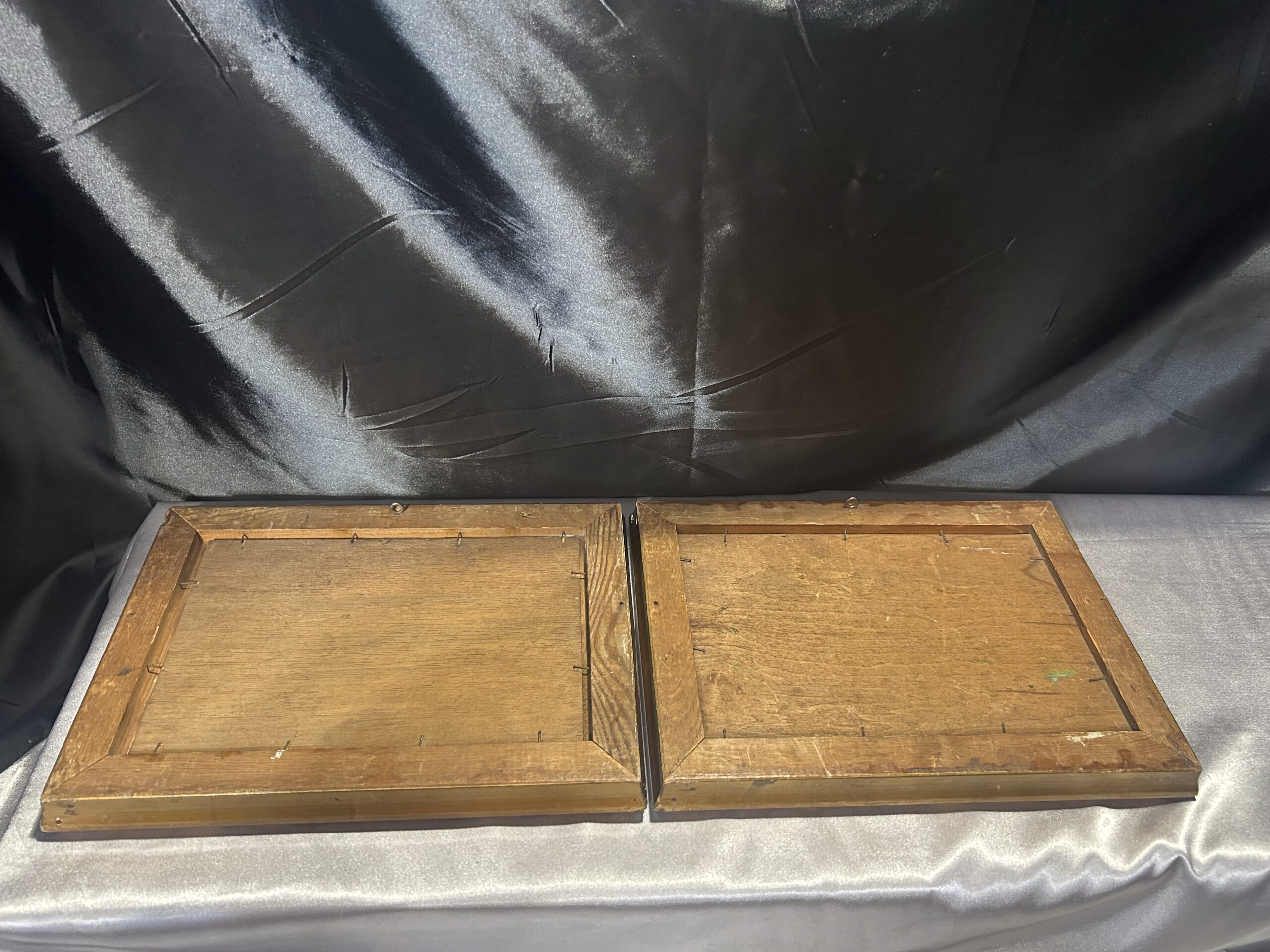 Zestaw Dwóch Obrazów Olejnych na Desce – Malownicze Sceny w Złoconych, Drewnianych Ramach
