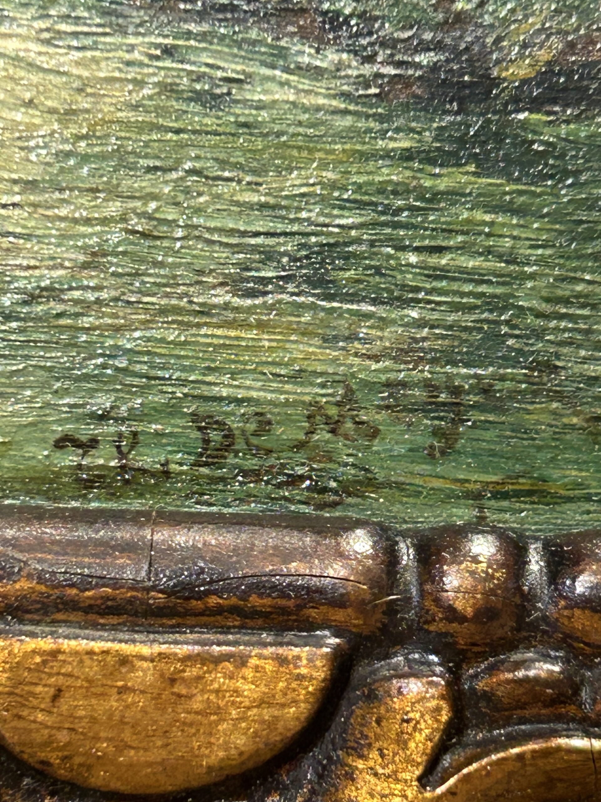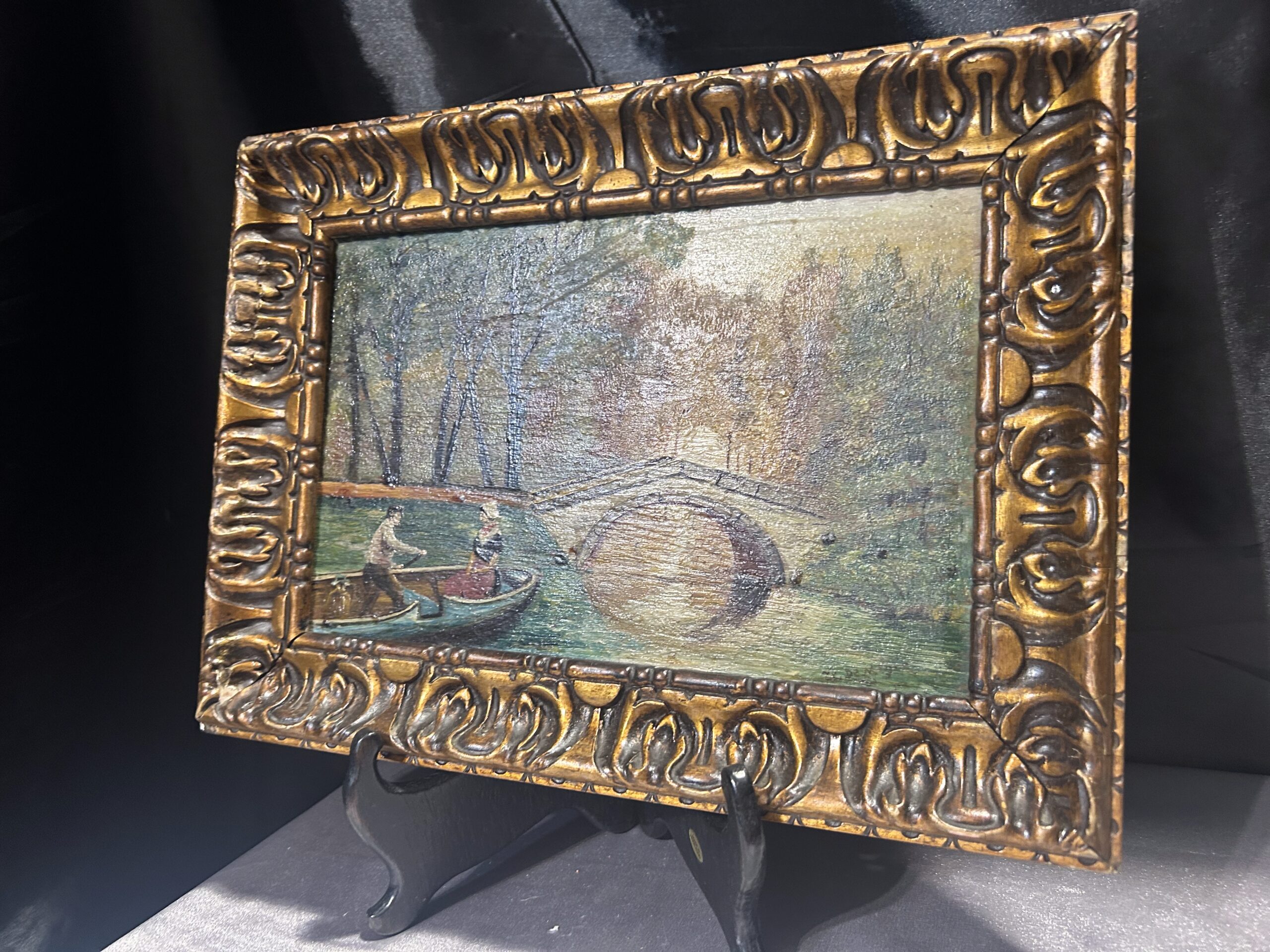 Przedstawiamy wyjątkowy zestaw dwóch obrazów, malowanych techniką olejną na desce, oprawionych w zdobione, drewniane ramy malowane na złoto. Każdy z obrazów jest sygnowany, jednak podpis autora jest nieczytelny. Przedstawiają nastrojowe sceny nad rzeką, oddające urok i klimat malowniczej przyrody.