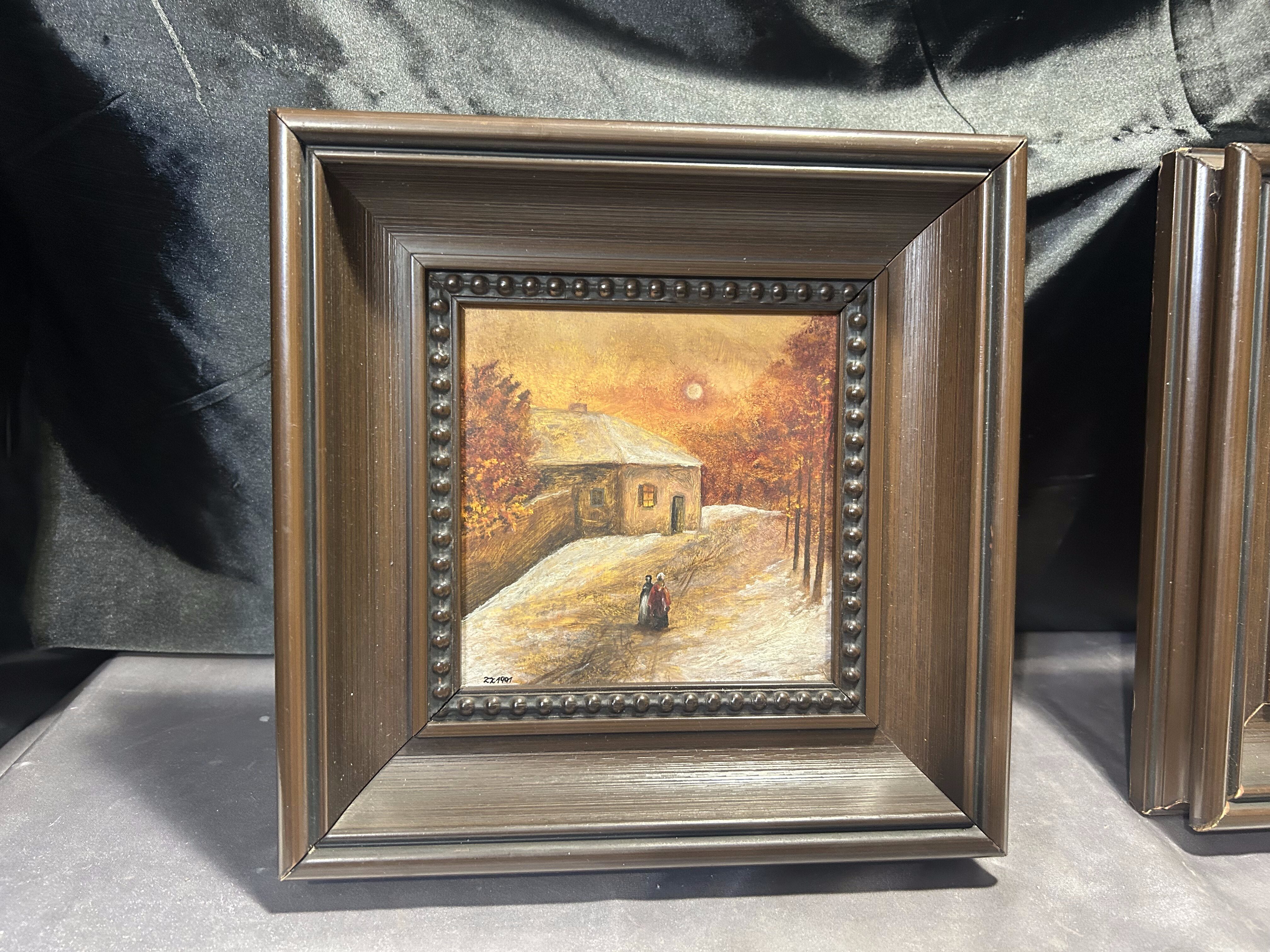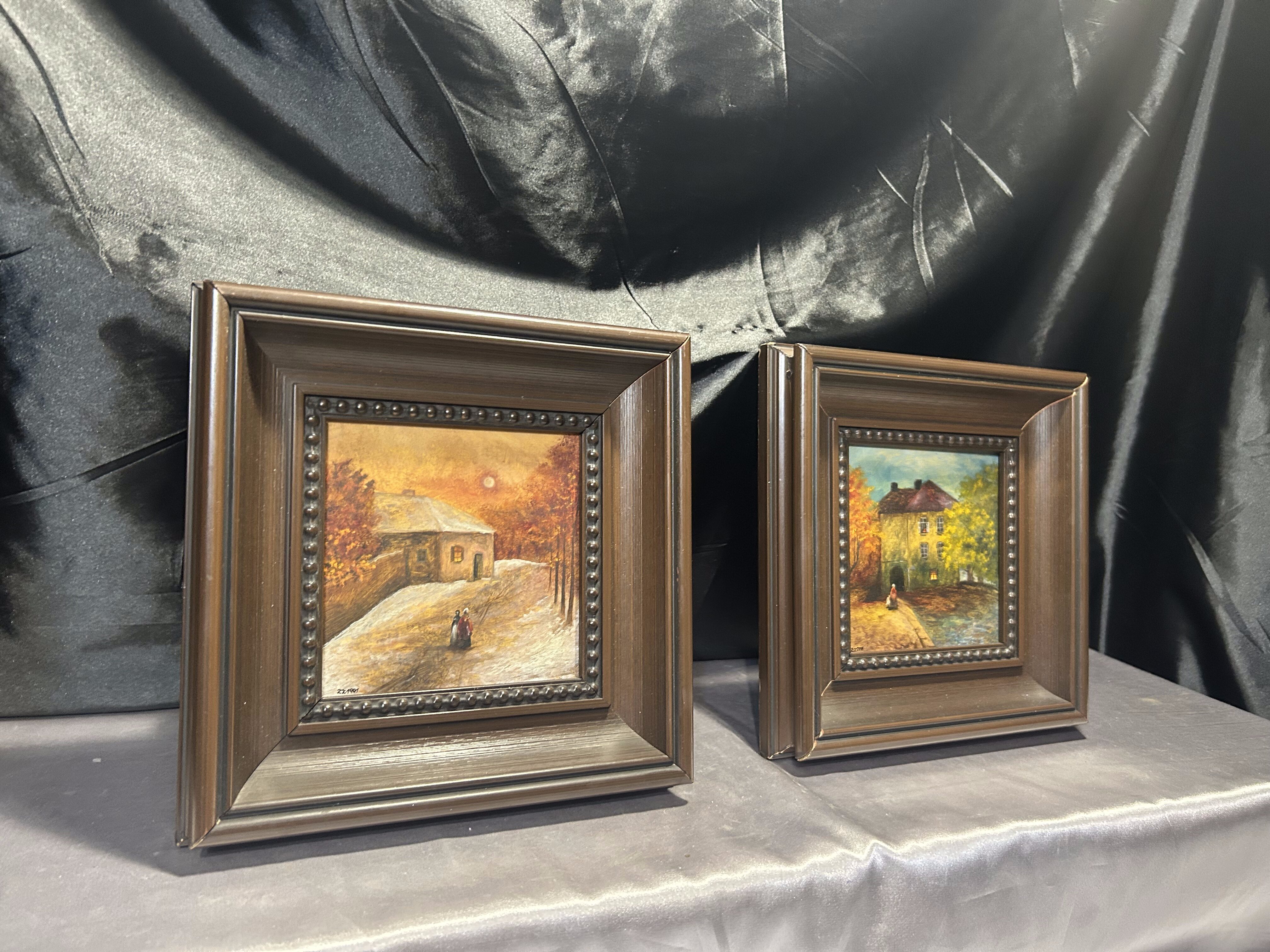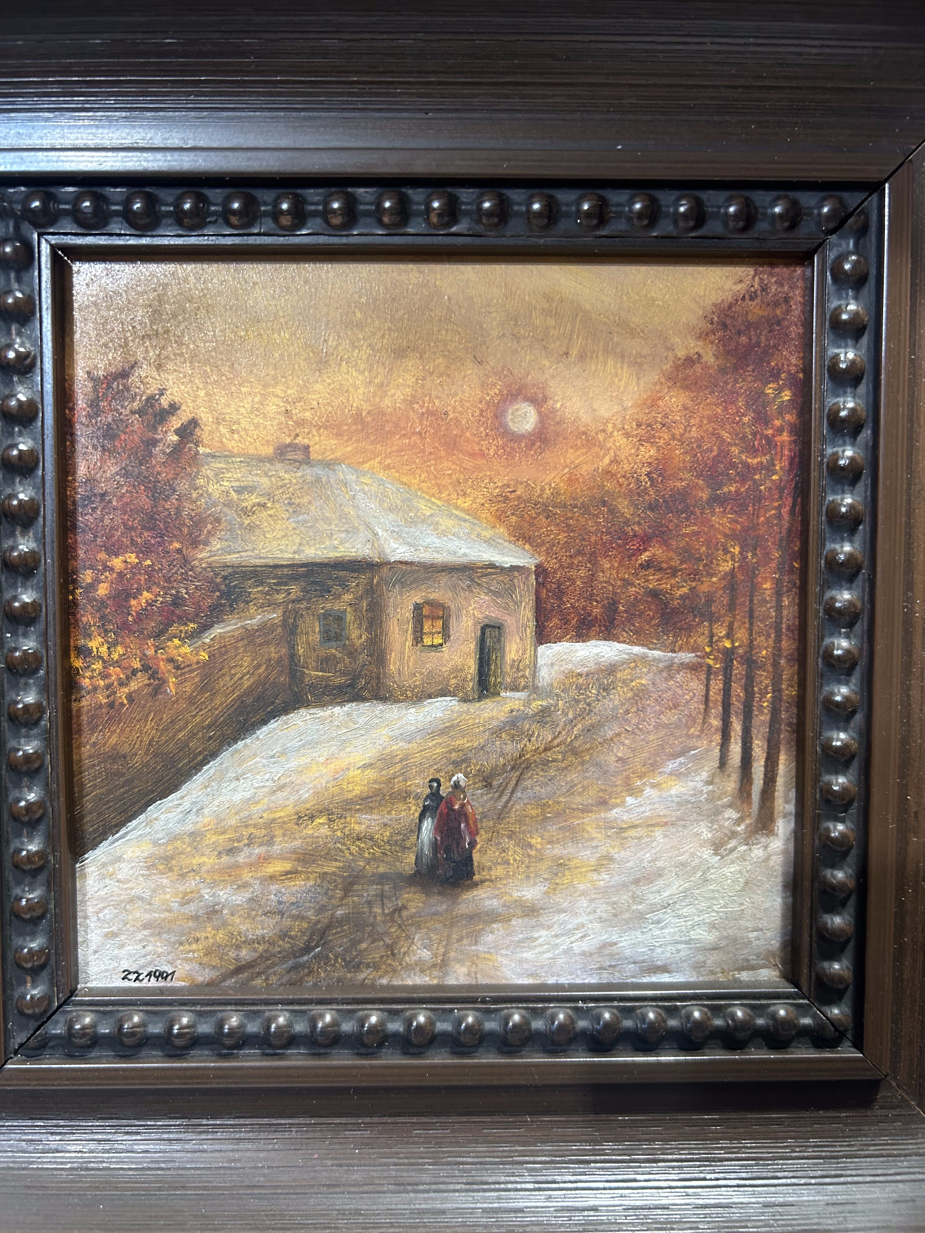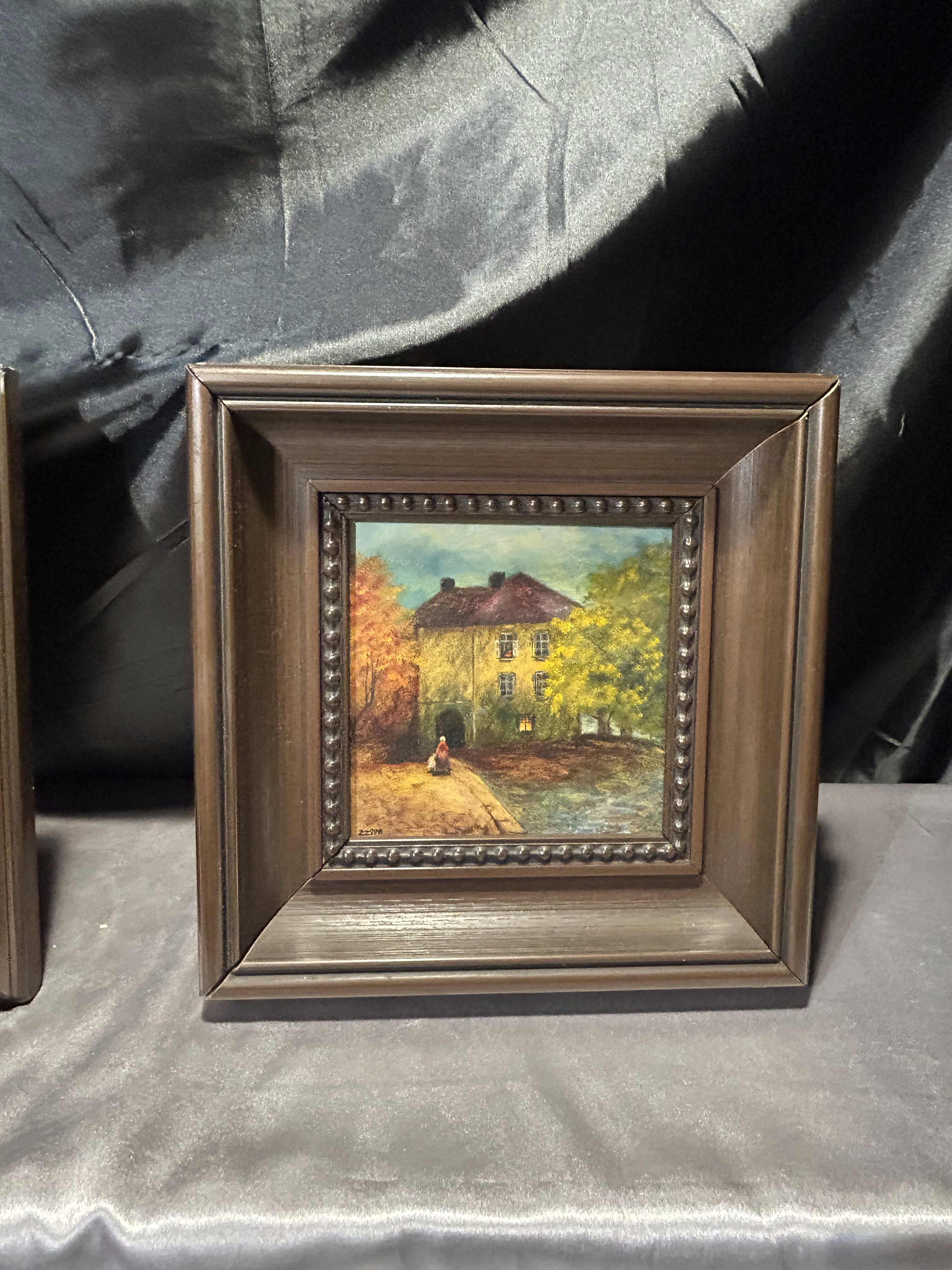 Na sprzedaż zestaw dwóch obrazów olejnych na desce, sygnowanych przez Zbynka Zronka Jr z pełnym podpisem na odwrocie oraz datą Maj 1991, co świadczy, że dzieła mają już ponad 30 lat. Każdy obraz przedstawia malowniczy pejzaż, w którym postacie podchodzą do domostwa, wkomponowanego w naturalny krajobraz. Starannie dopracowane detale i nostalgiczna kolorystyka nadają scenom wyjątkową głębię i atmosferę.