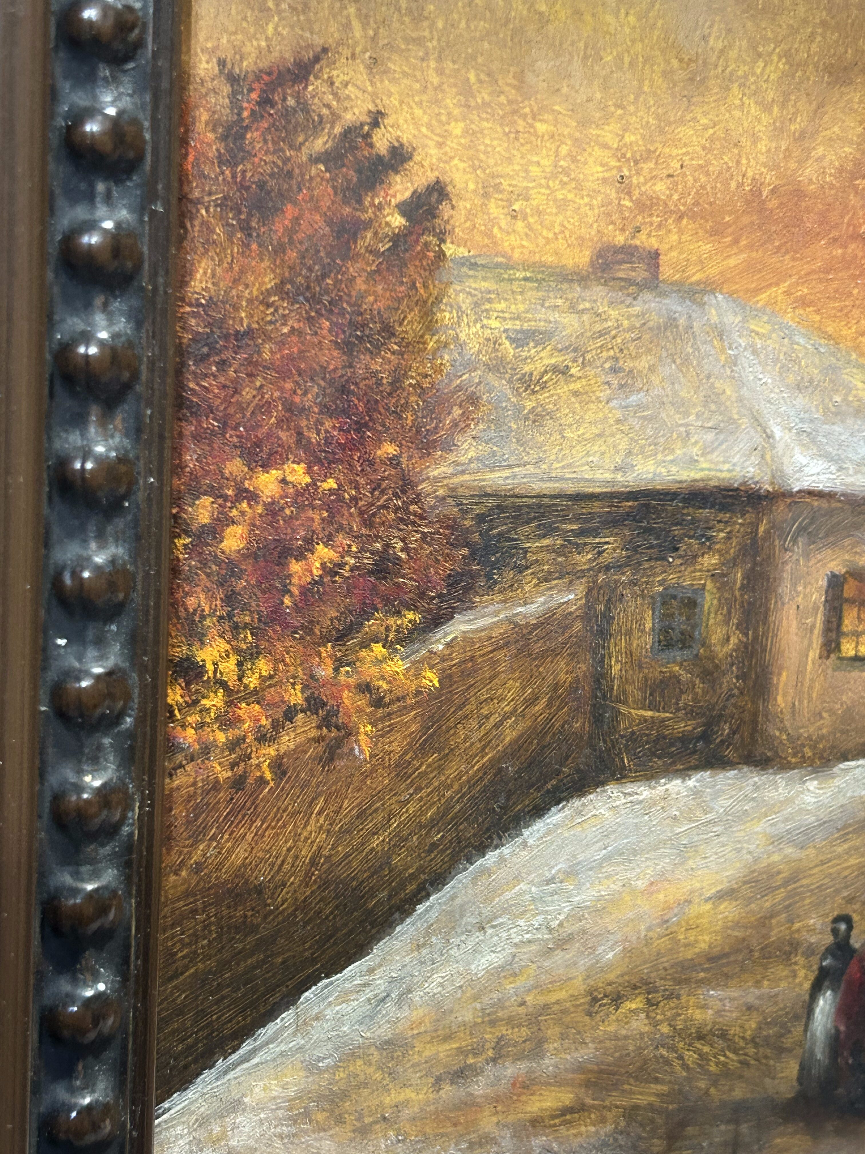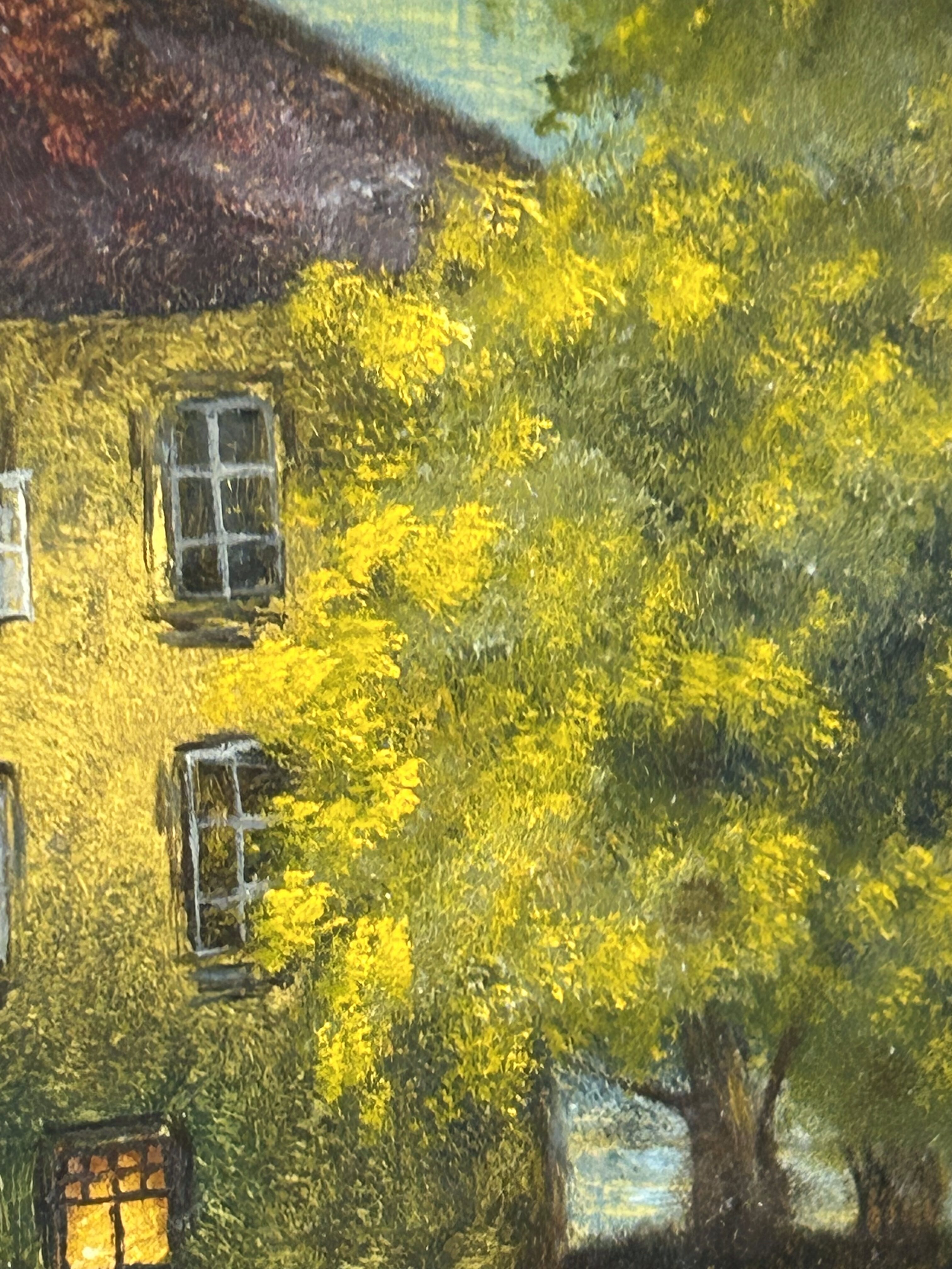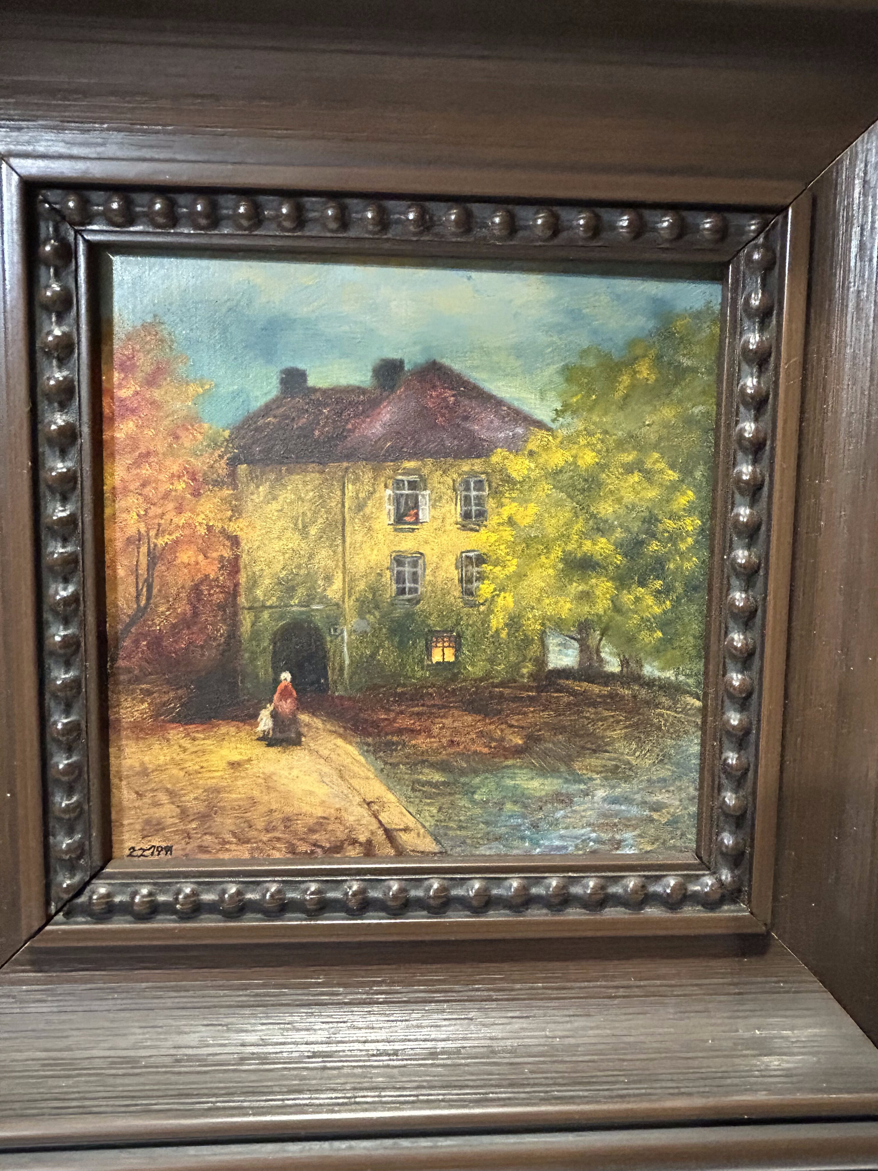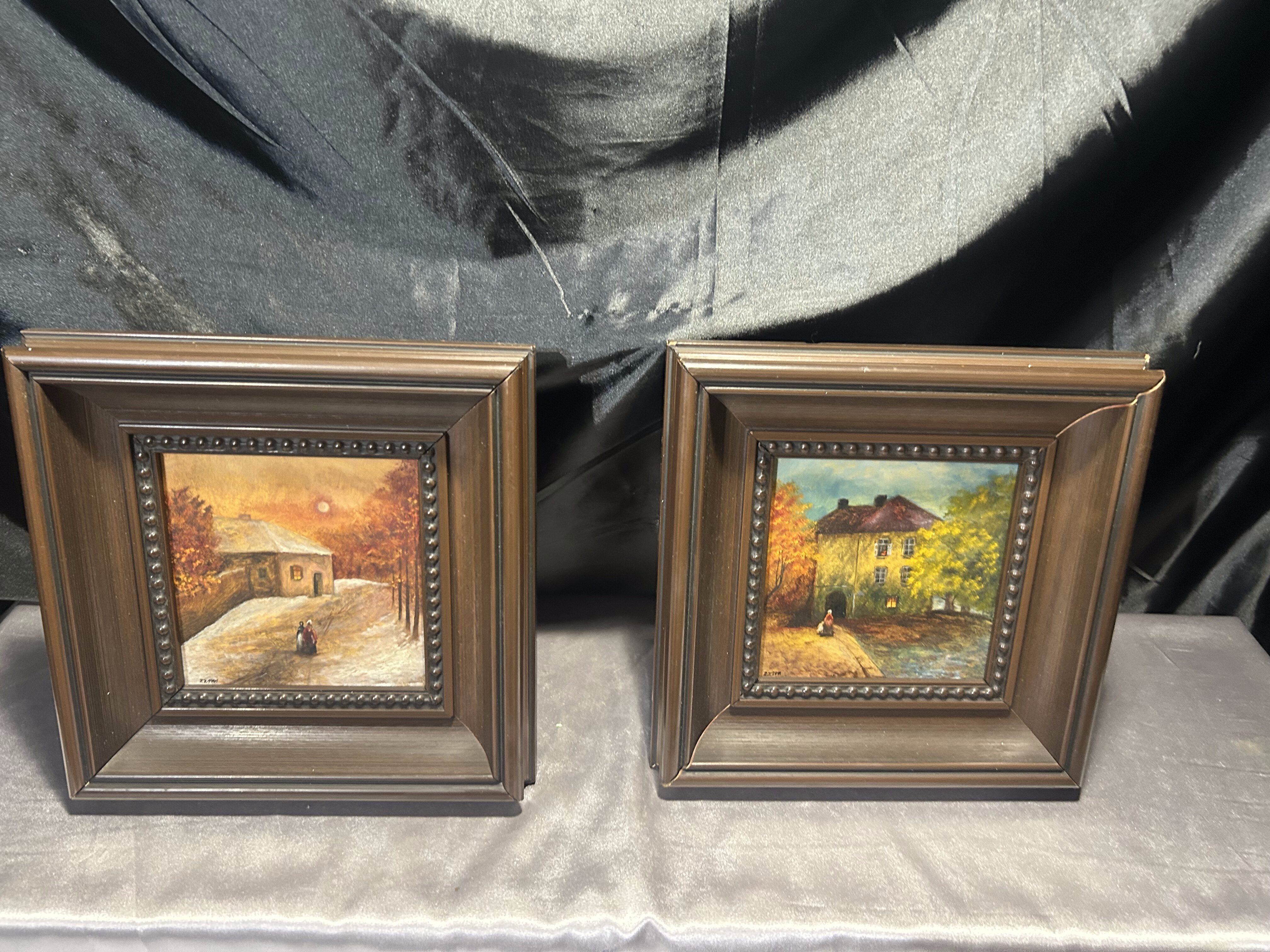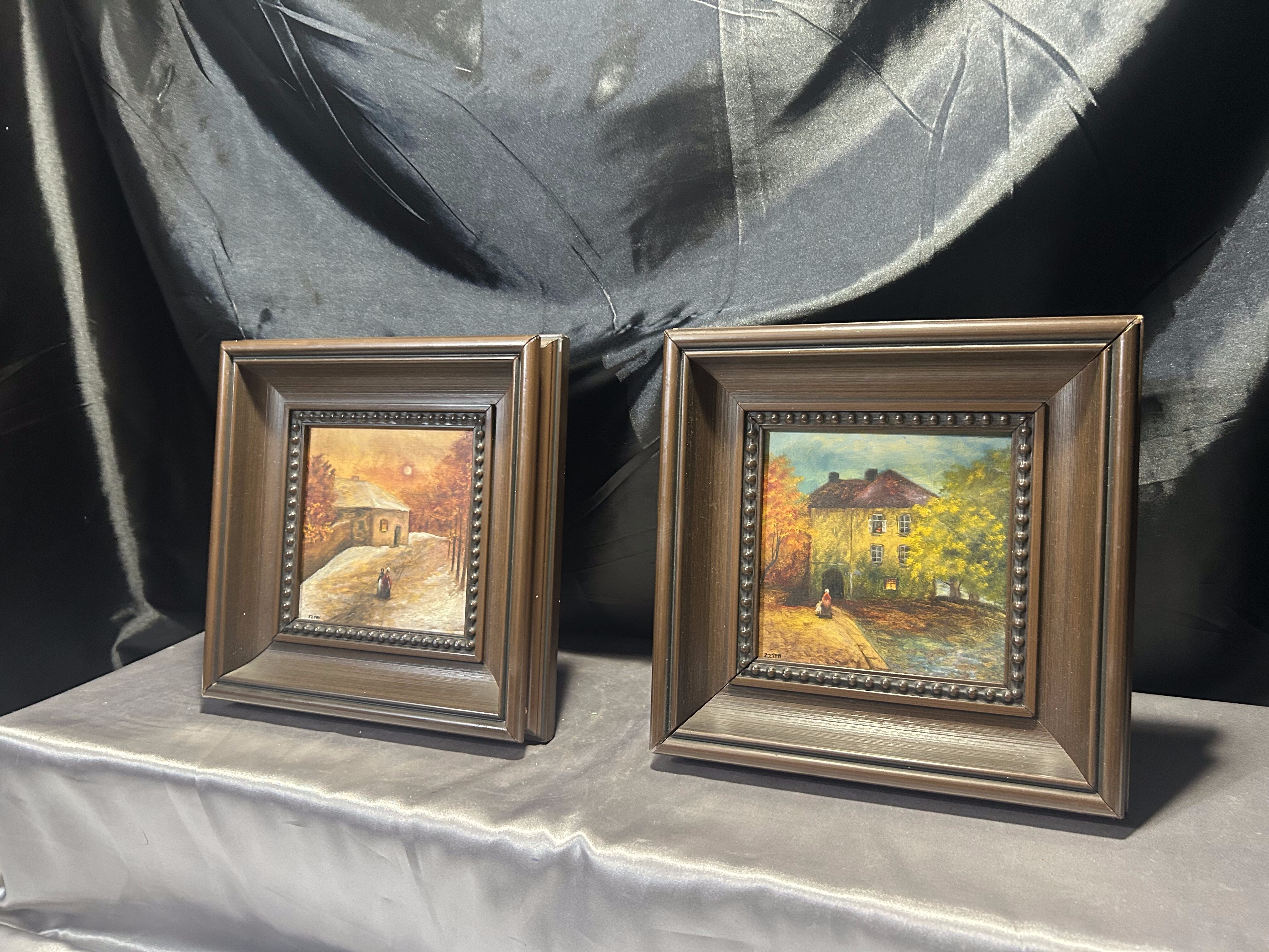 Na sprzedaż zestaw dwóch obrazów olejnych na desce, sygnowanych przez Zbynka Zronka Jr z pełnym podpisem na odwrocie oraz datą Maj 1991, co świadczy, że dzieła mają już ponad 30 lat. Każdy obraz przedstawia malowniczy pejzaż, w którym postacie podchodzą do domostwa, wkomponowanego w naturalny krajobraz. Starannie dopracowane detale i nostalgiczna kolorystyka nadają scenom wyjątkową głębię i atmosferę.