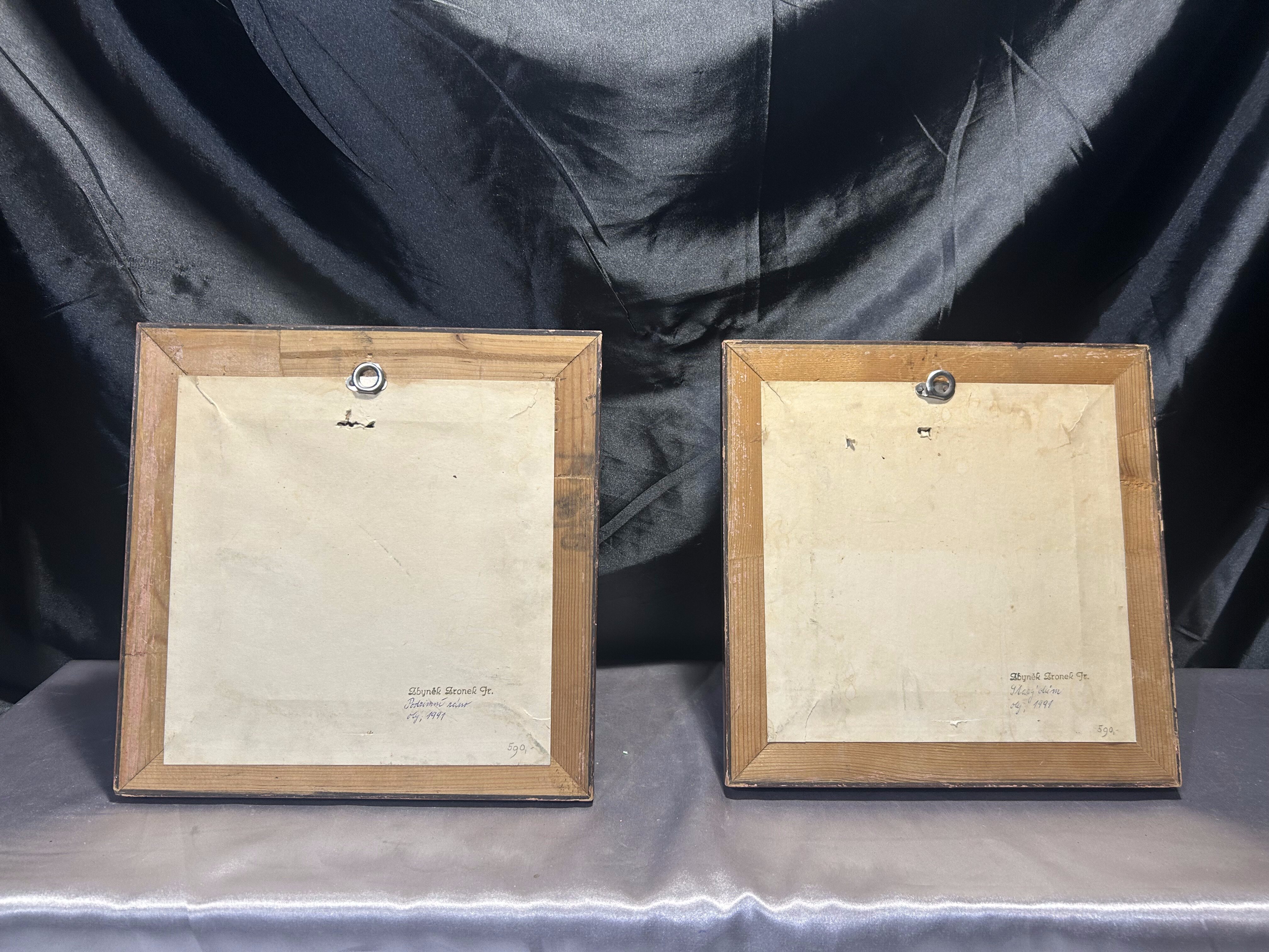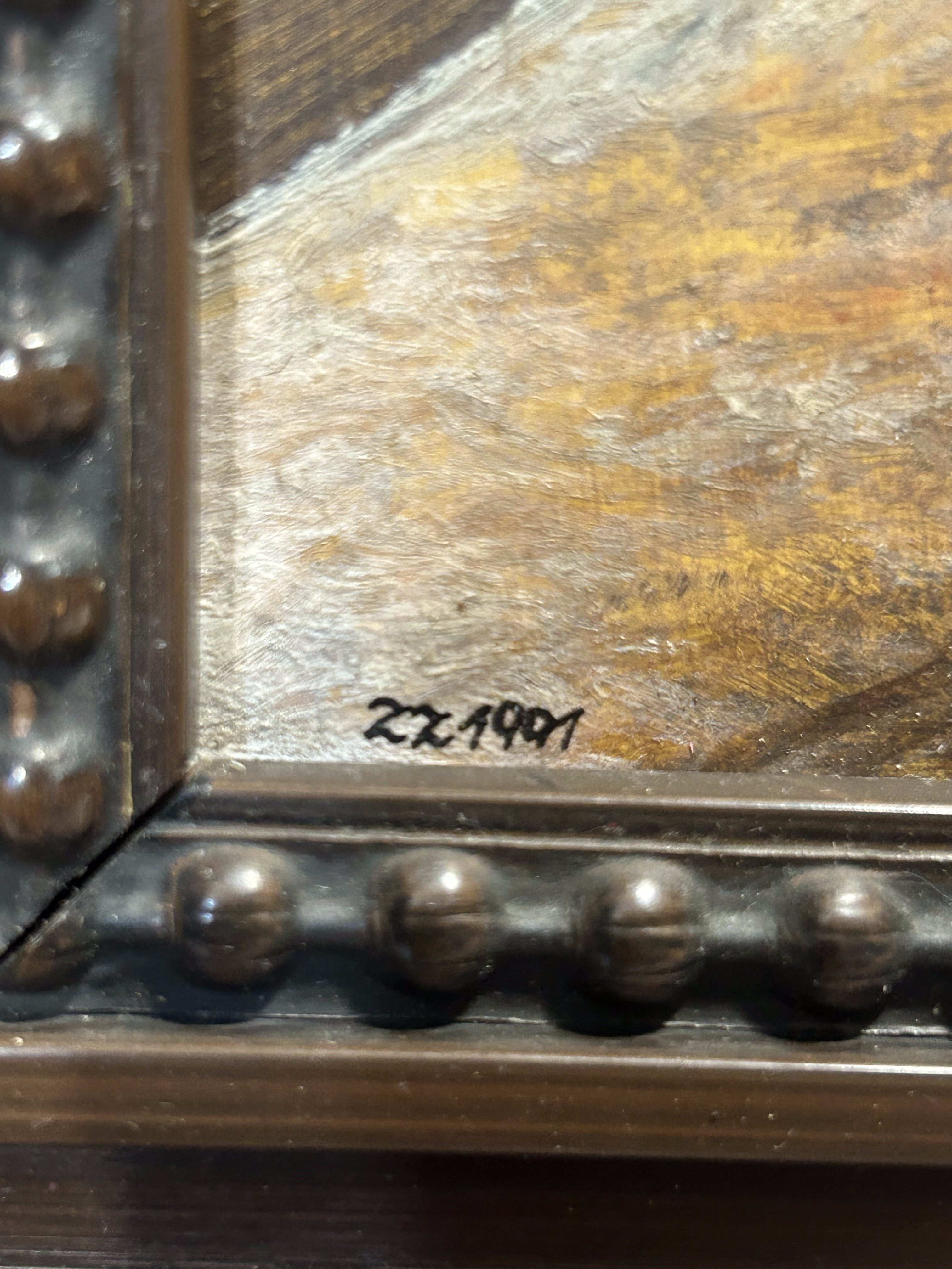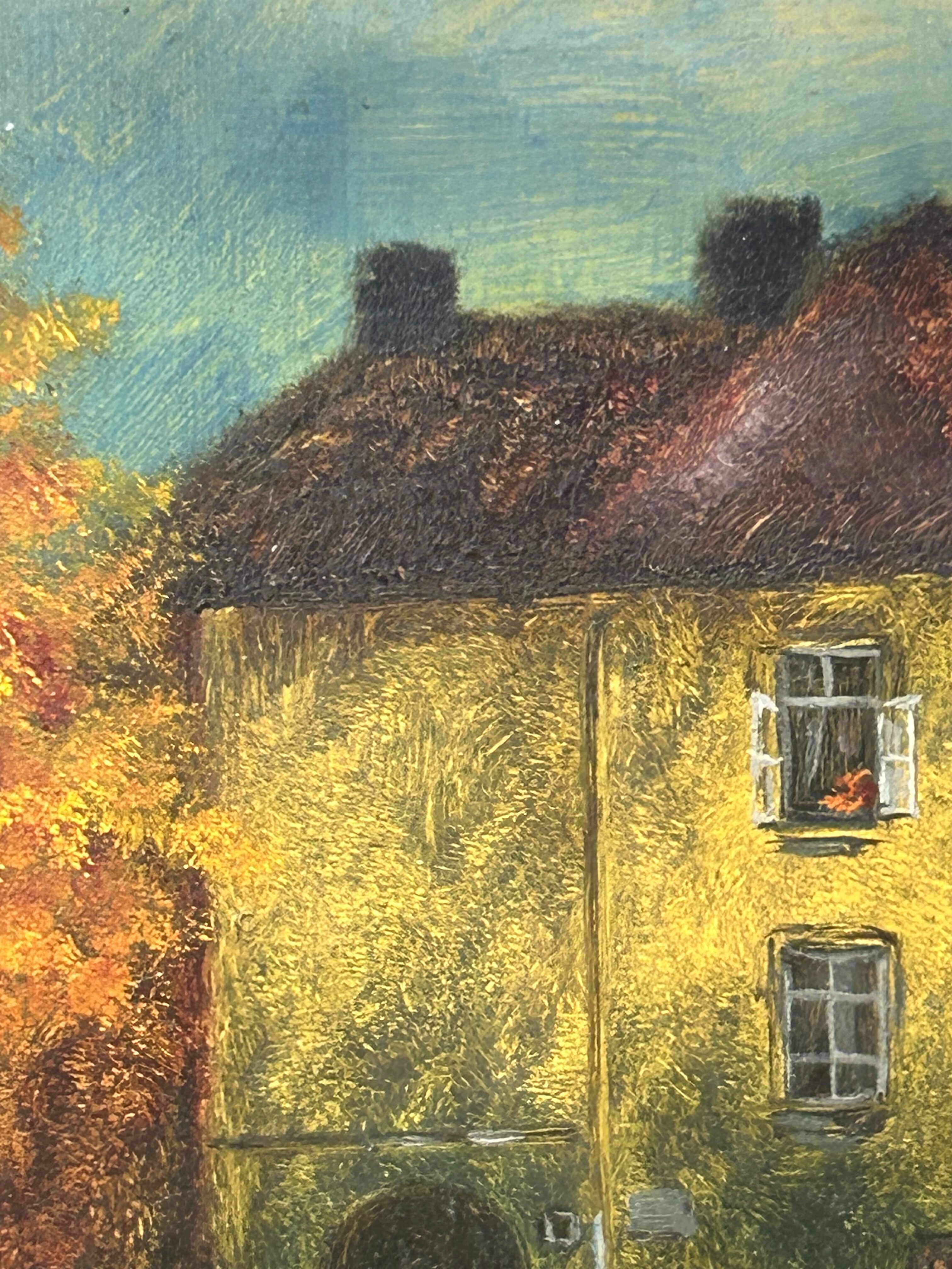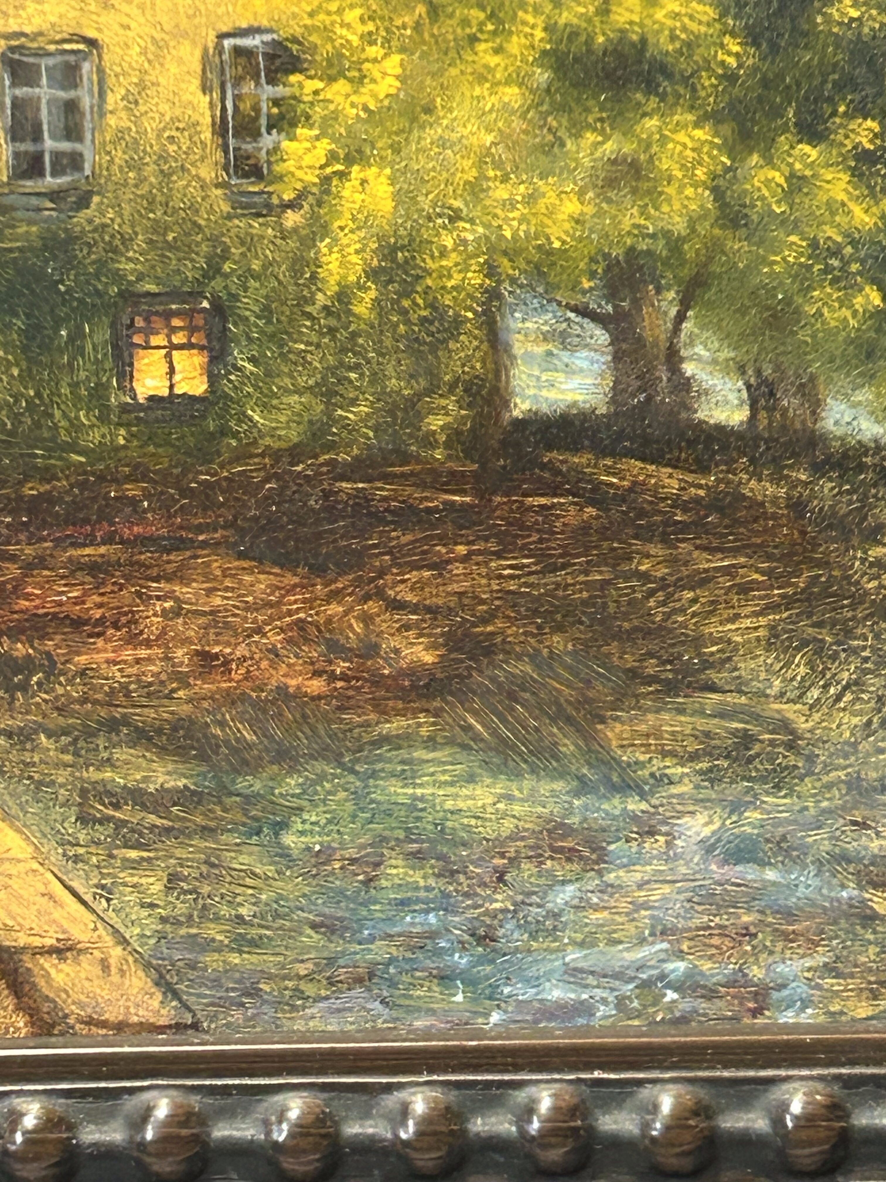 Na sprzedaż zestaw dwóch obrazów olejnych na desce, sygnowanych przez Zbynka Zronka Jr z pełnym podpisem na odwrocie oraz datą Maj 1991, co świadczy, że dzieła mają już ponad 30 lat. Każdy obraz przedstawia malowniczy pejzaż, w którym postacie podchodzą do domostwa, wkomponowanego w naturalny krajobraz. Starannie dopracowane detale i nostalgiczna kolorystyka nadają scenom wyjątkową głębię i atmosferę.