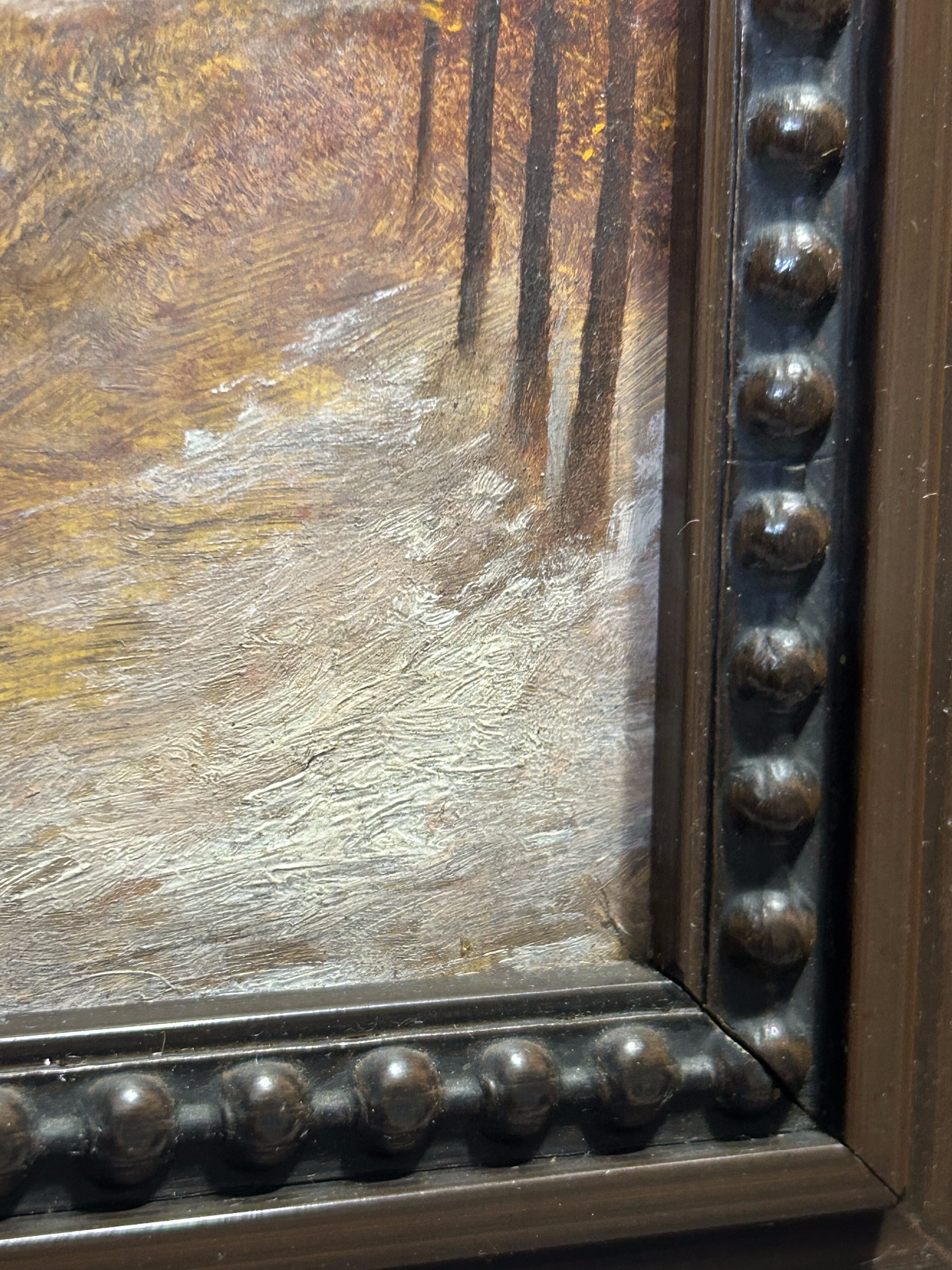 Obrazy oprawione są w identyczne, drewniane, brązowe ramy zdobione, które podkreślają ich klasyczny charakter. Doskonałe do eleganckich wnętrz, kolekcji malarstwa i miłośników sztuki pejzażowej.