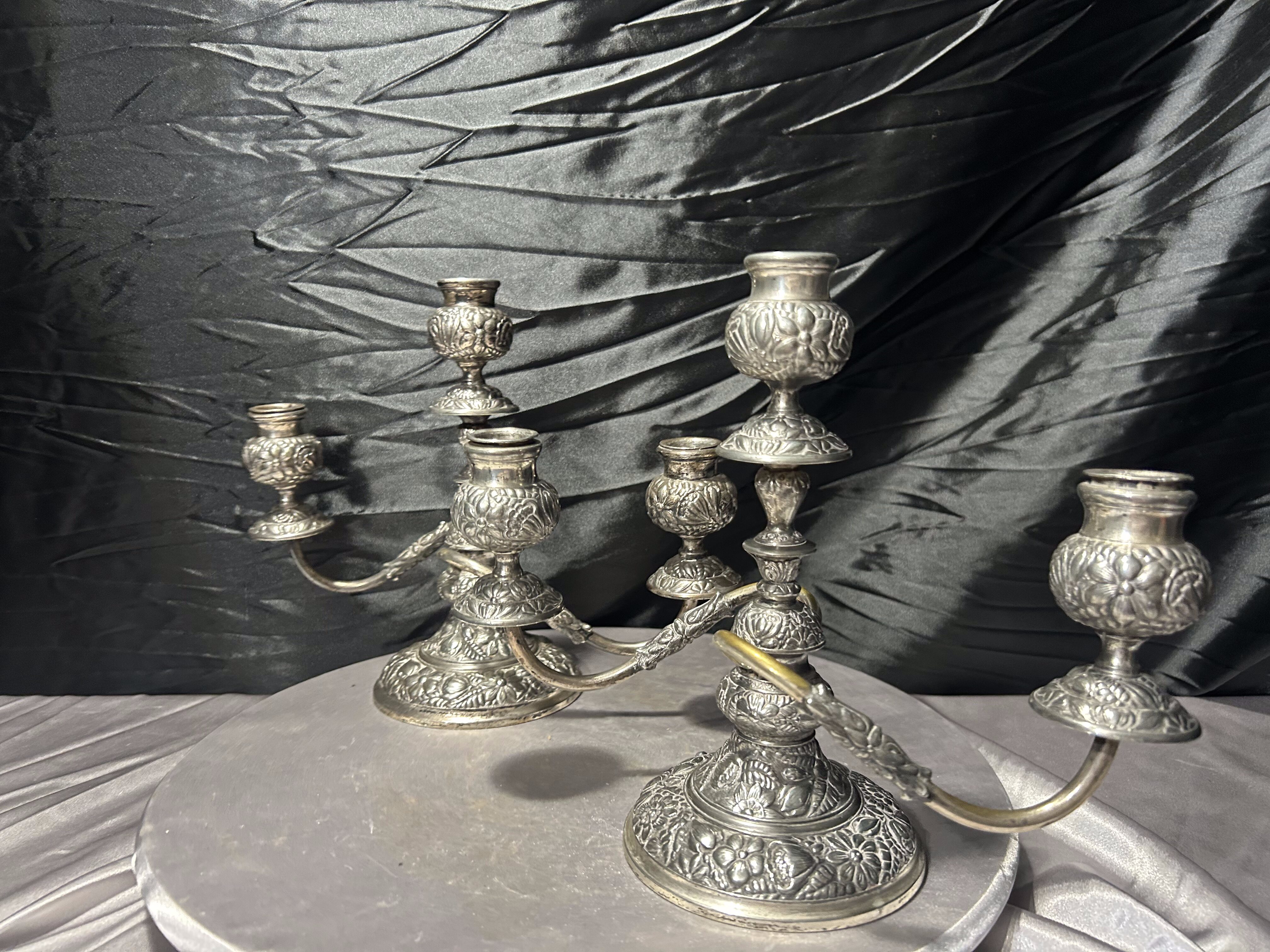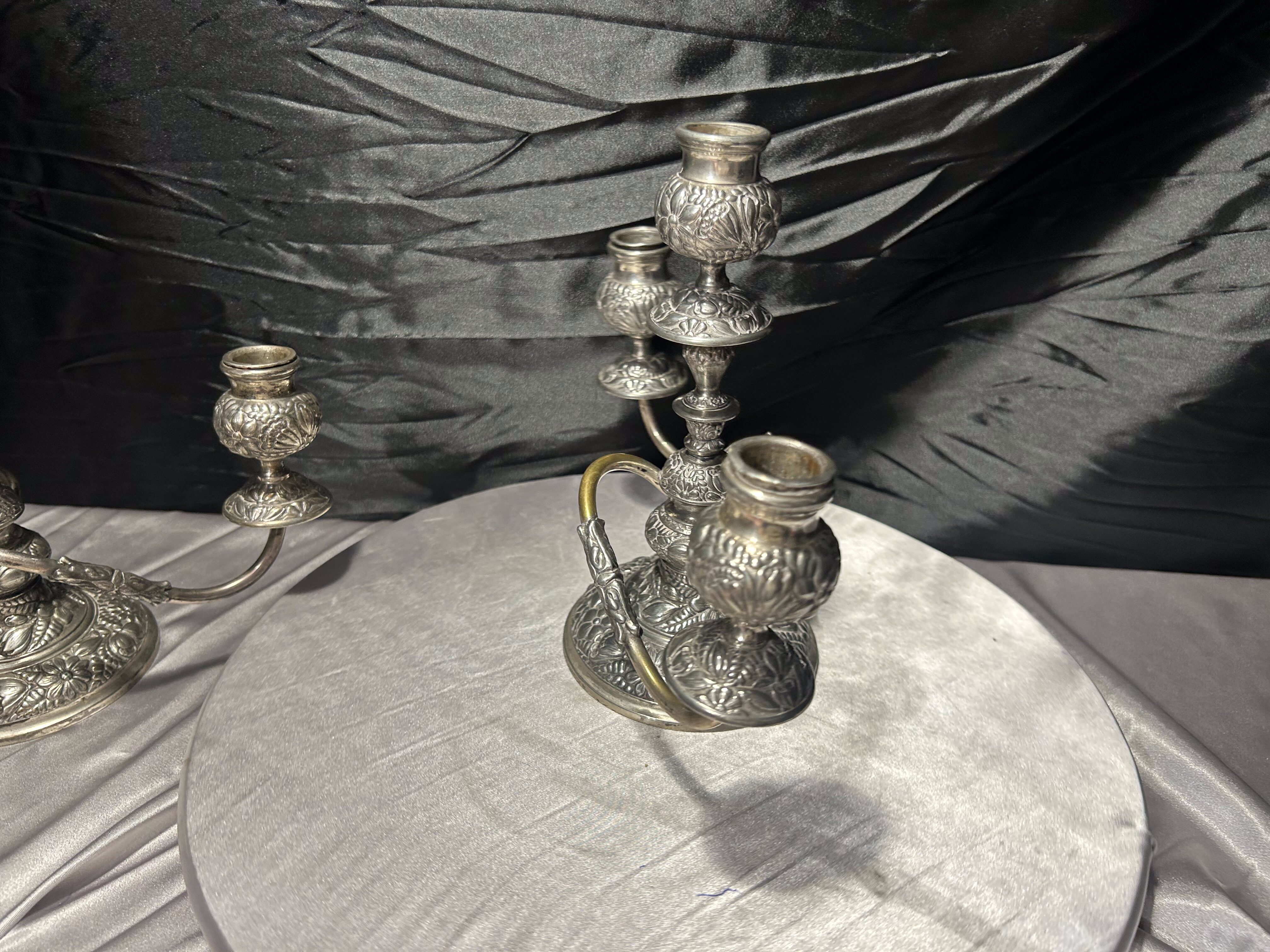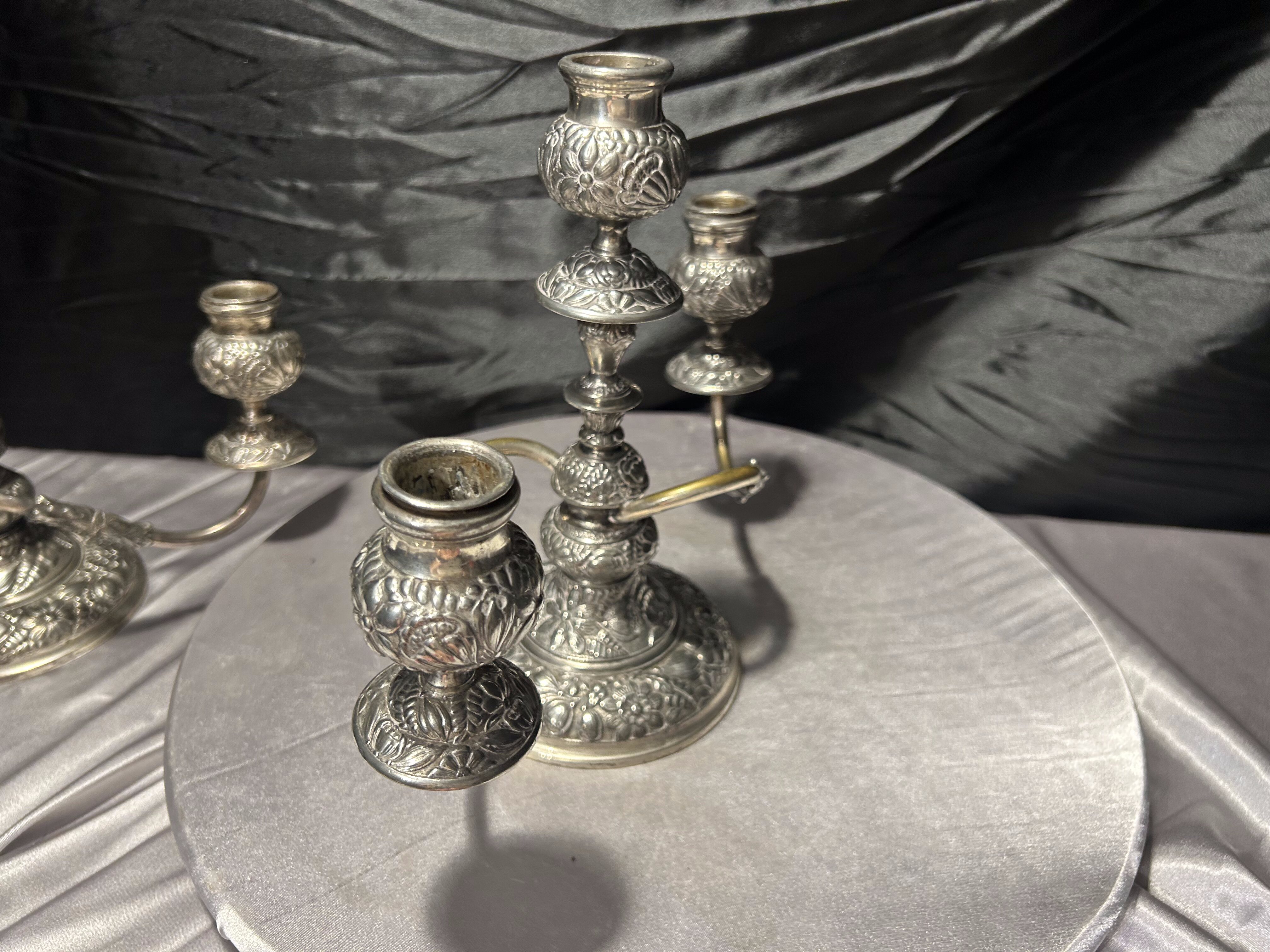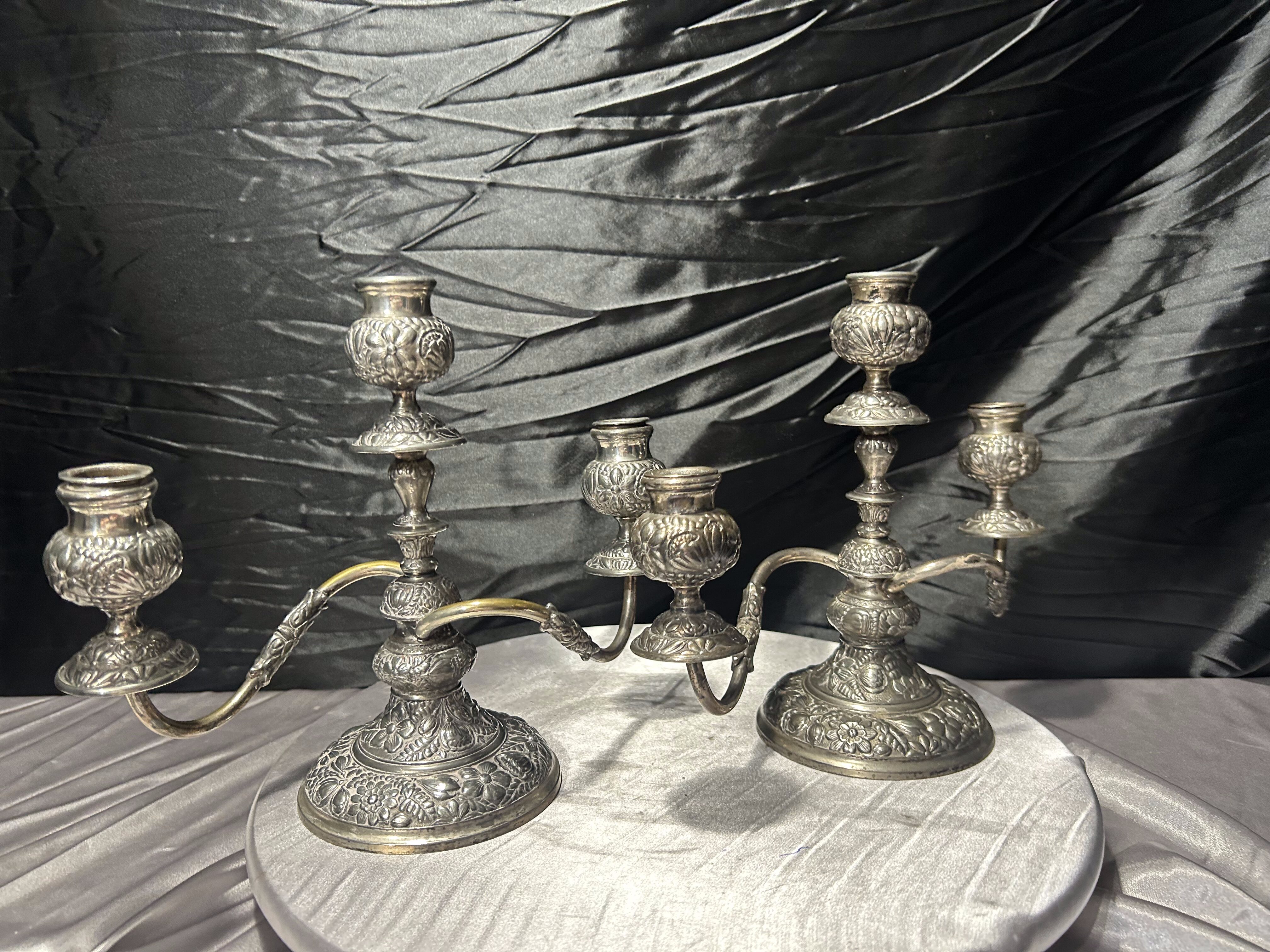- Zestaw dwóch posrebrzanych świeczników dwuramiennych na trzy świece – bogate zdobienia – klasyczny styl
