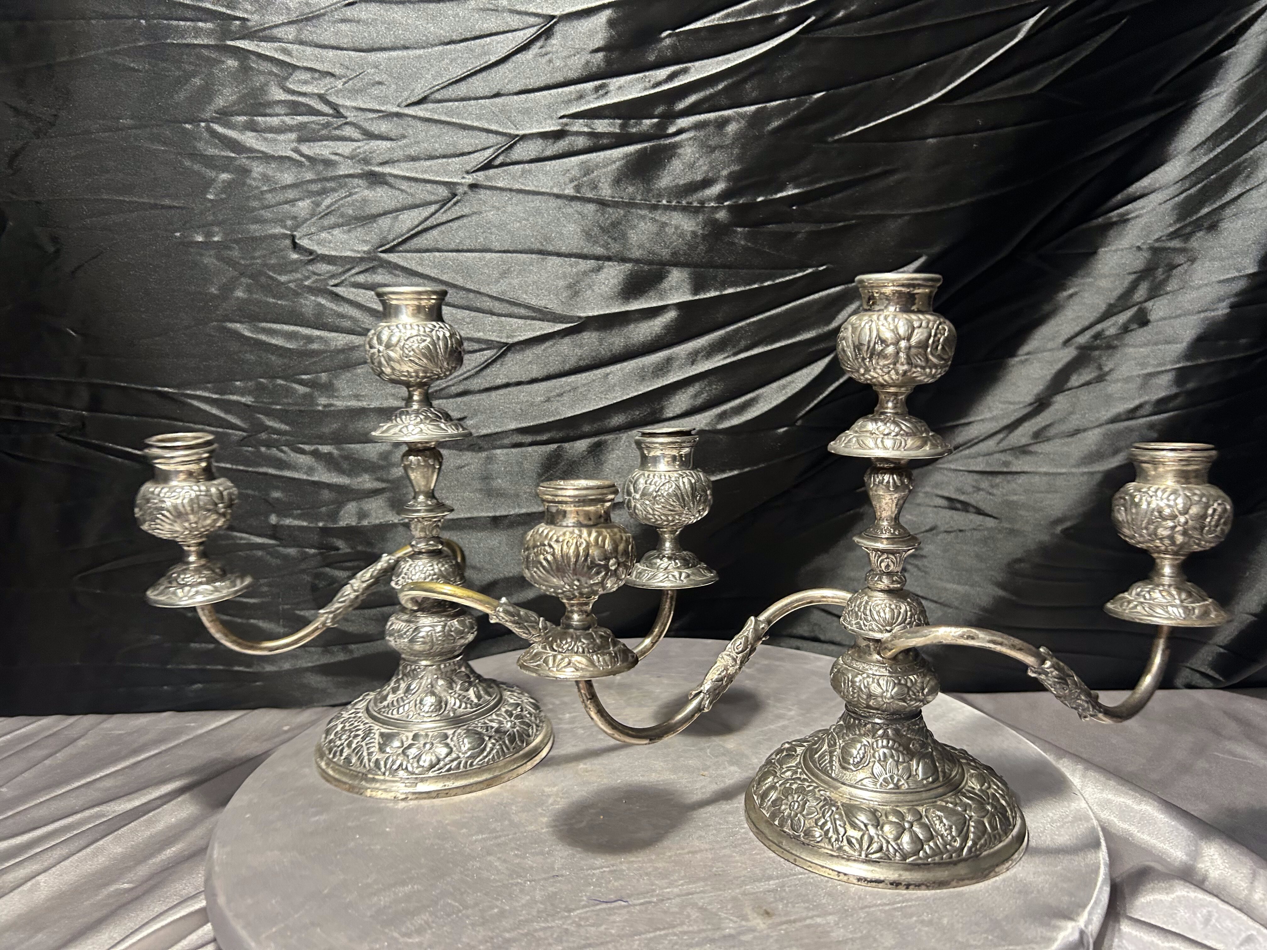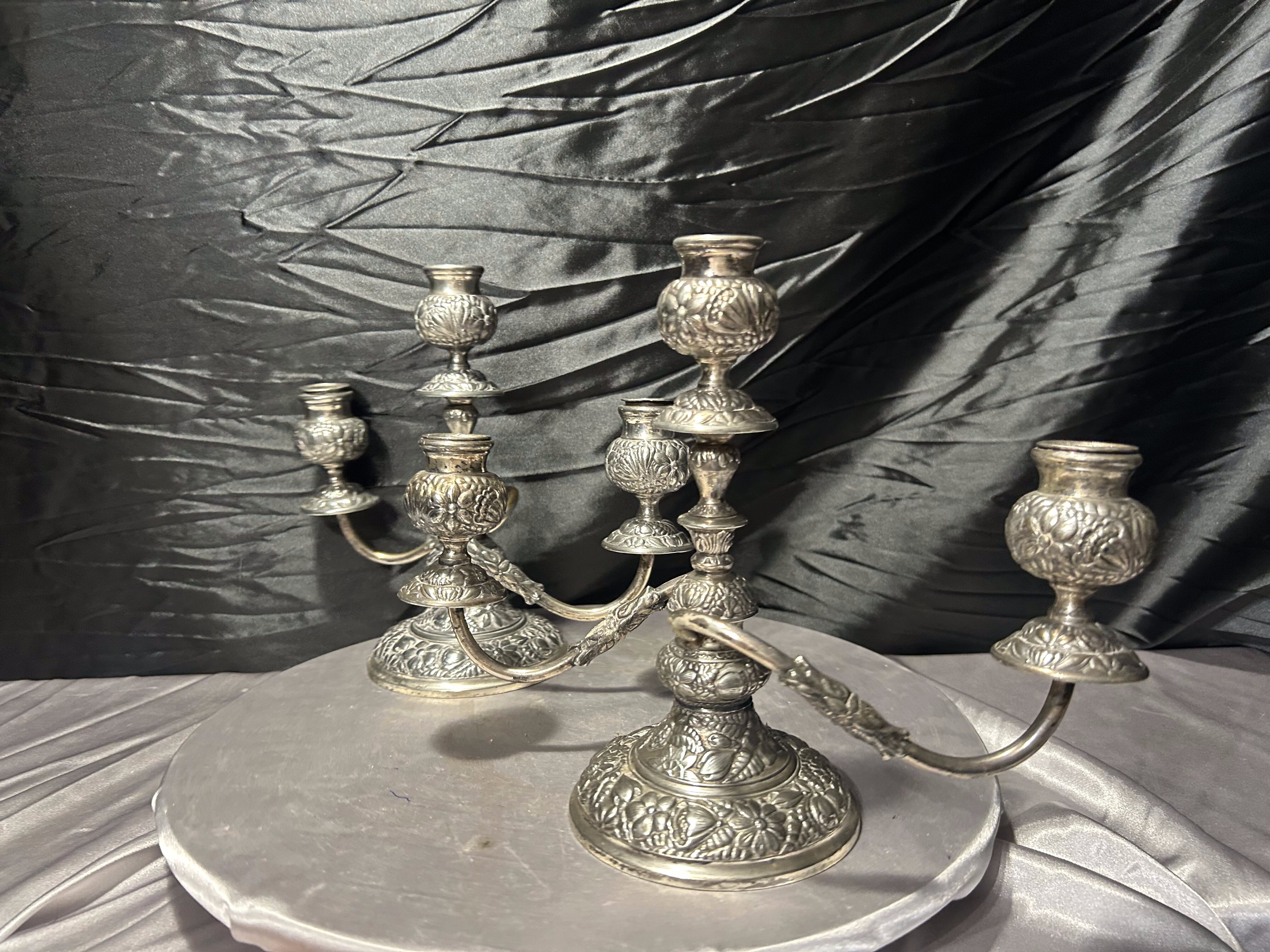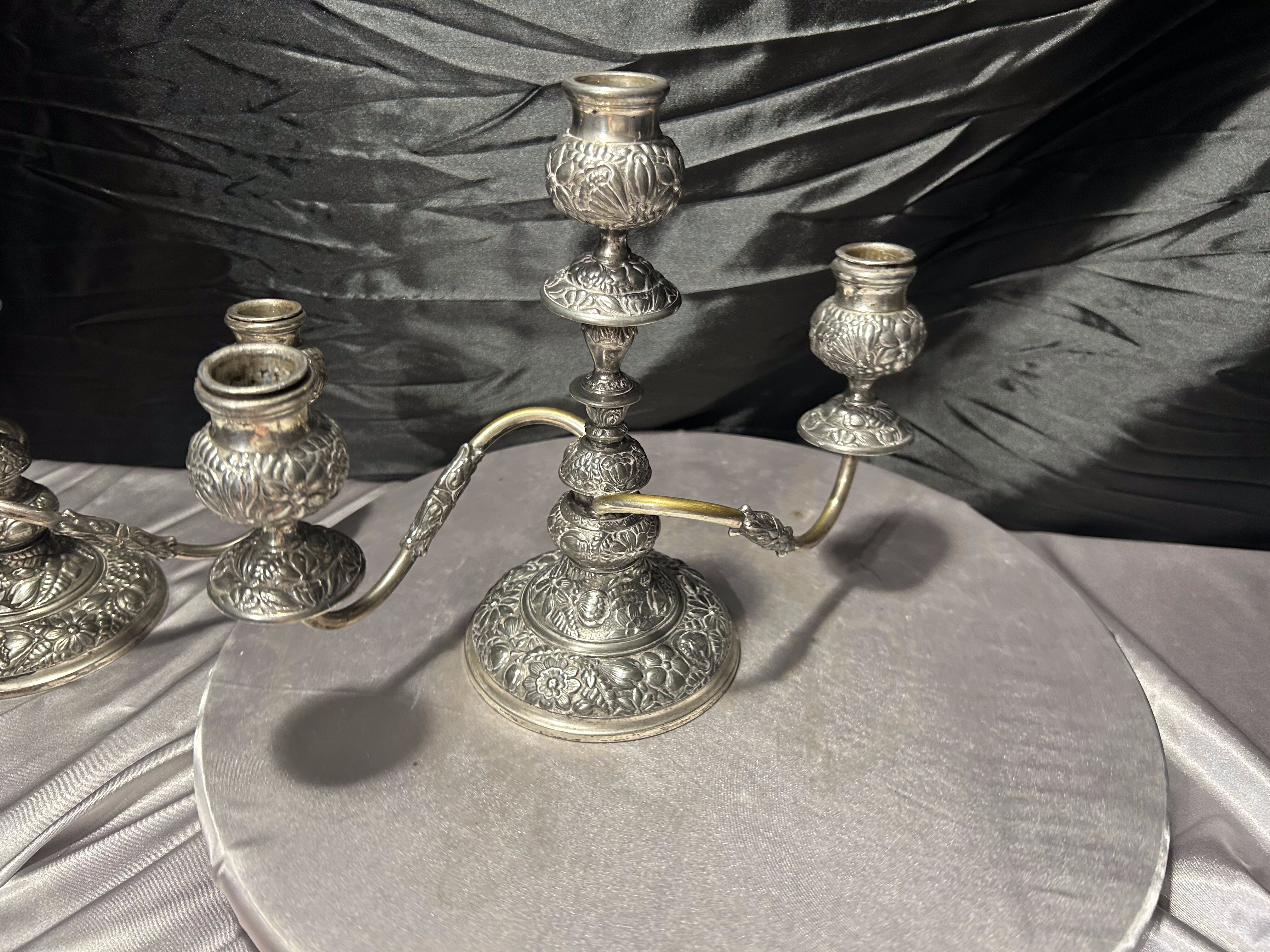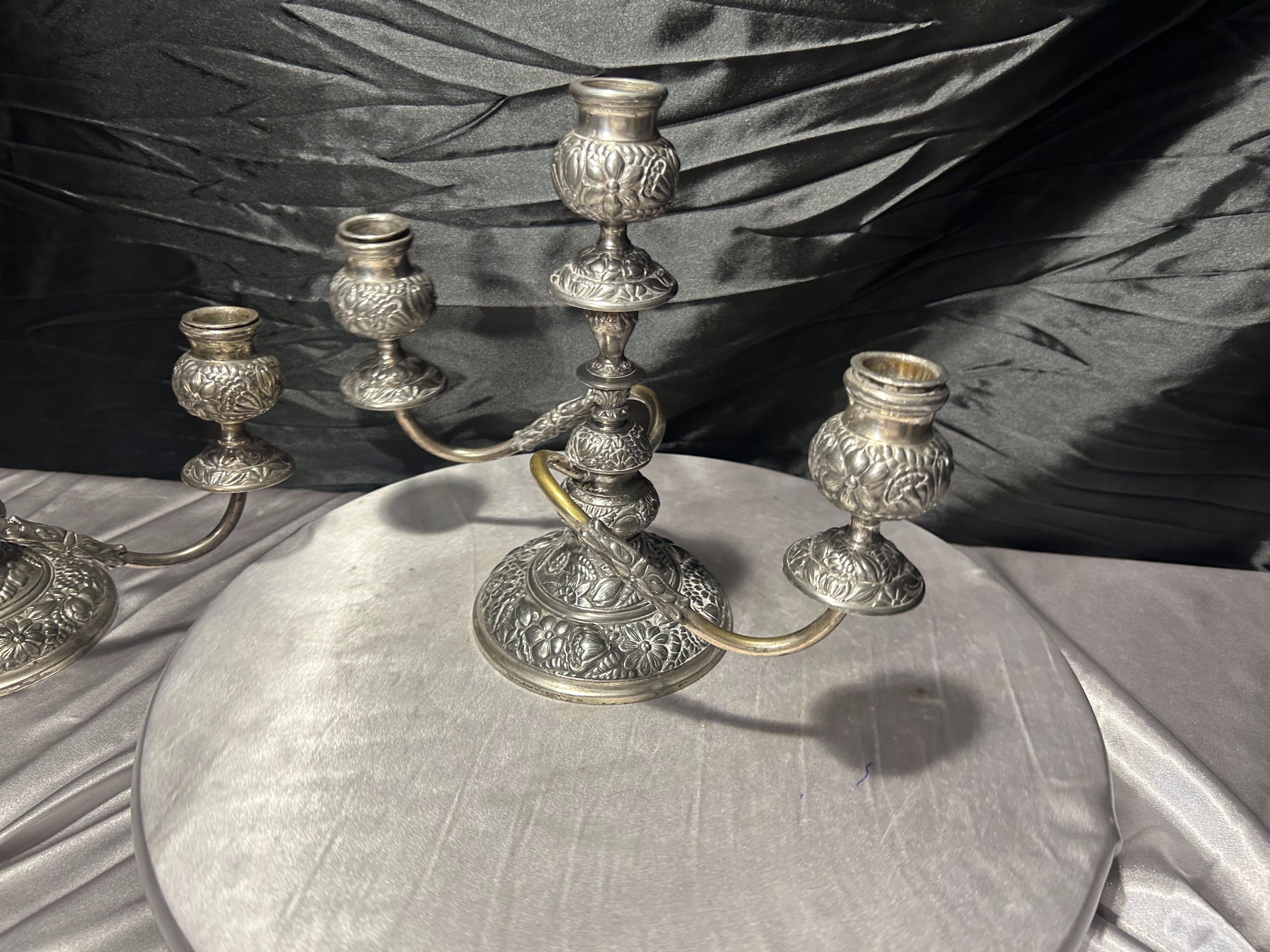 - Zestaw dwóch posrebrzanych świeczników dwuramiennych na trzy świece – bogate zdobienia – klasyczny styl