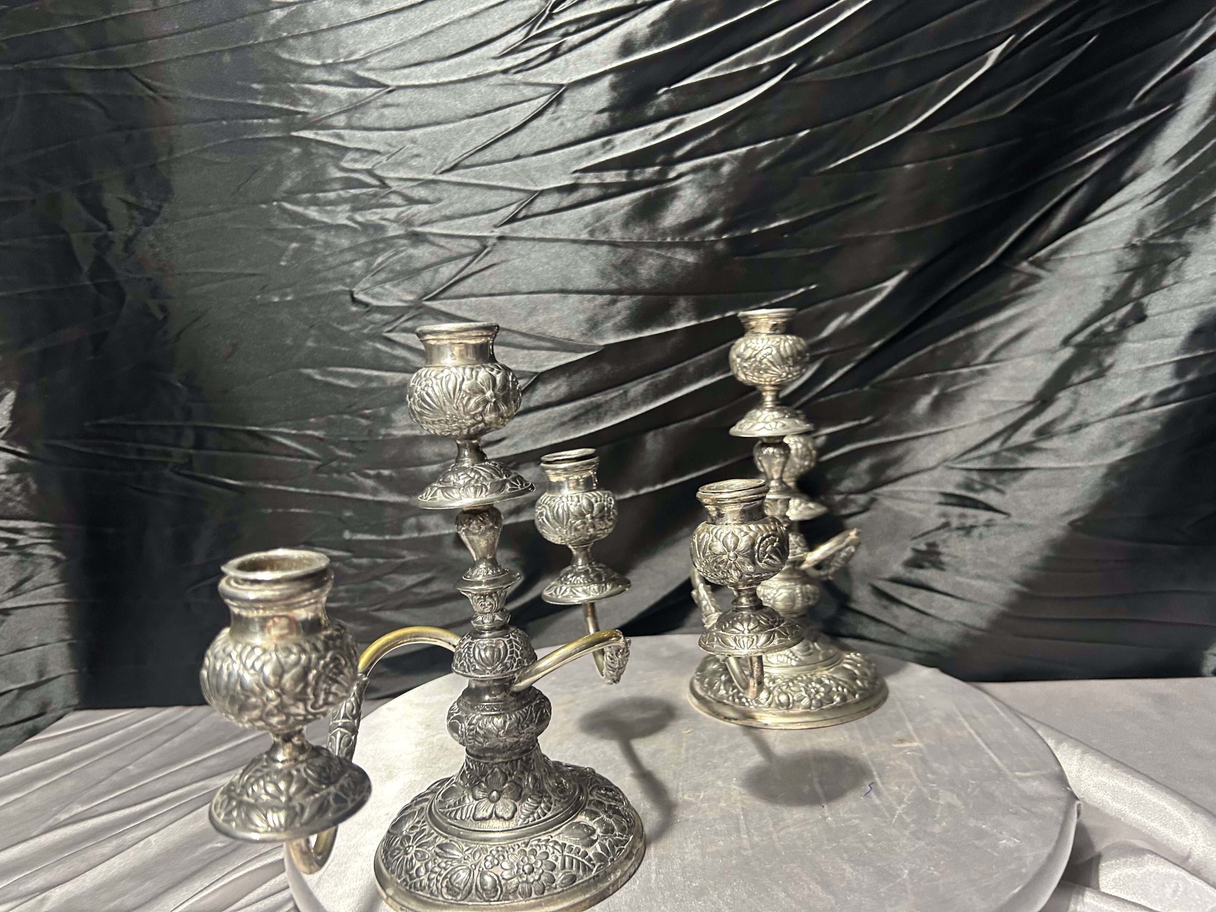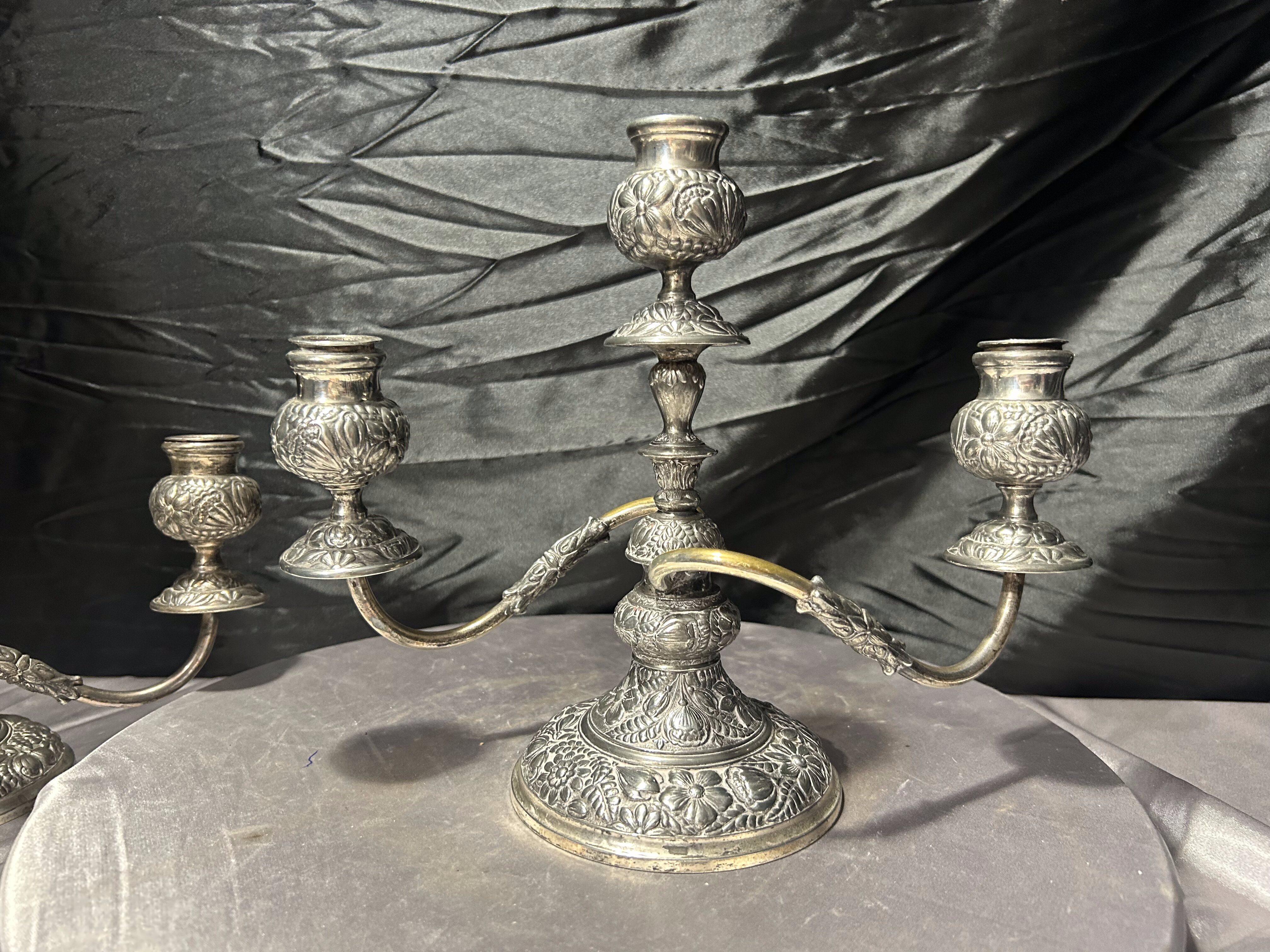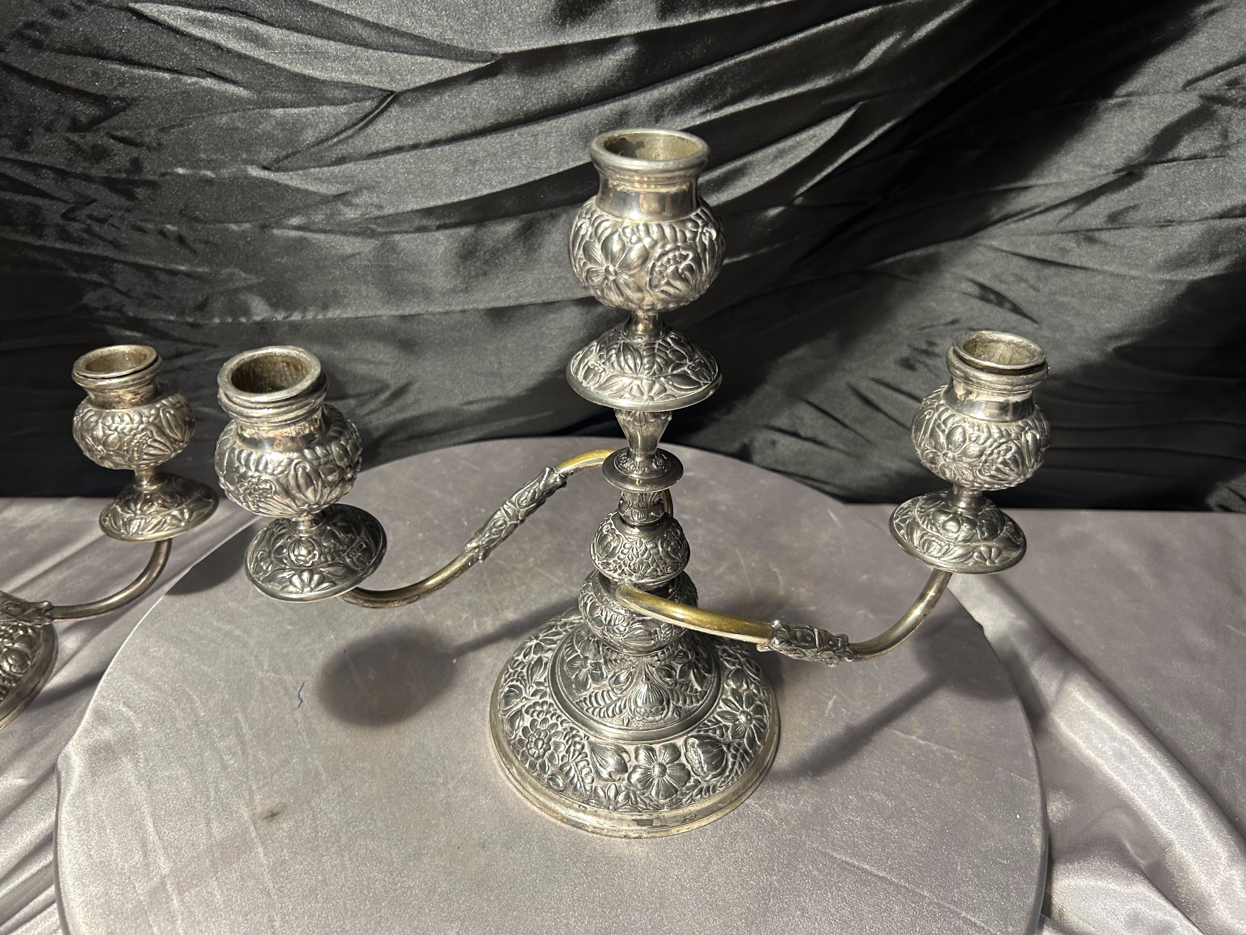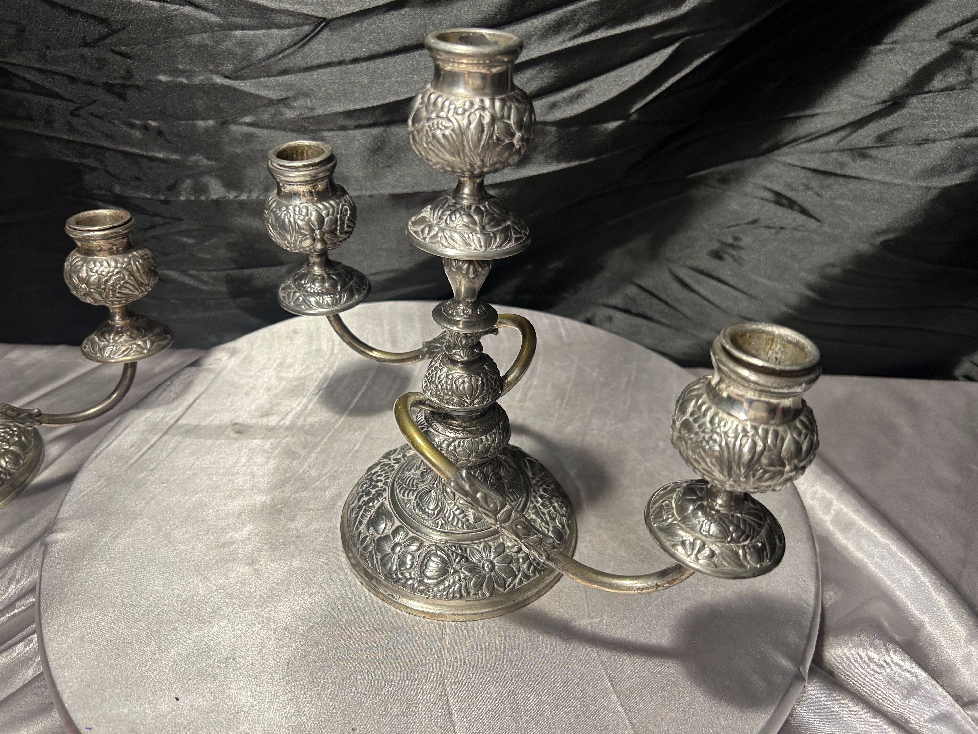 - Zestaw dwóch posrebrzanych świeczników dwuramiennych na trzy świece – bogate zdobienia – klasyczny styl