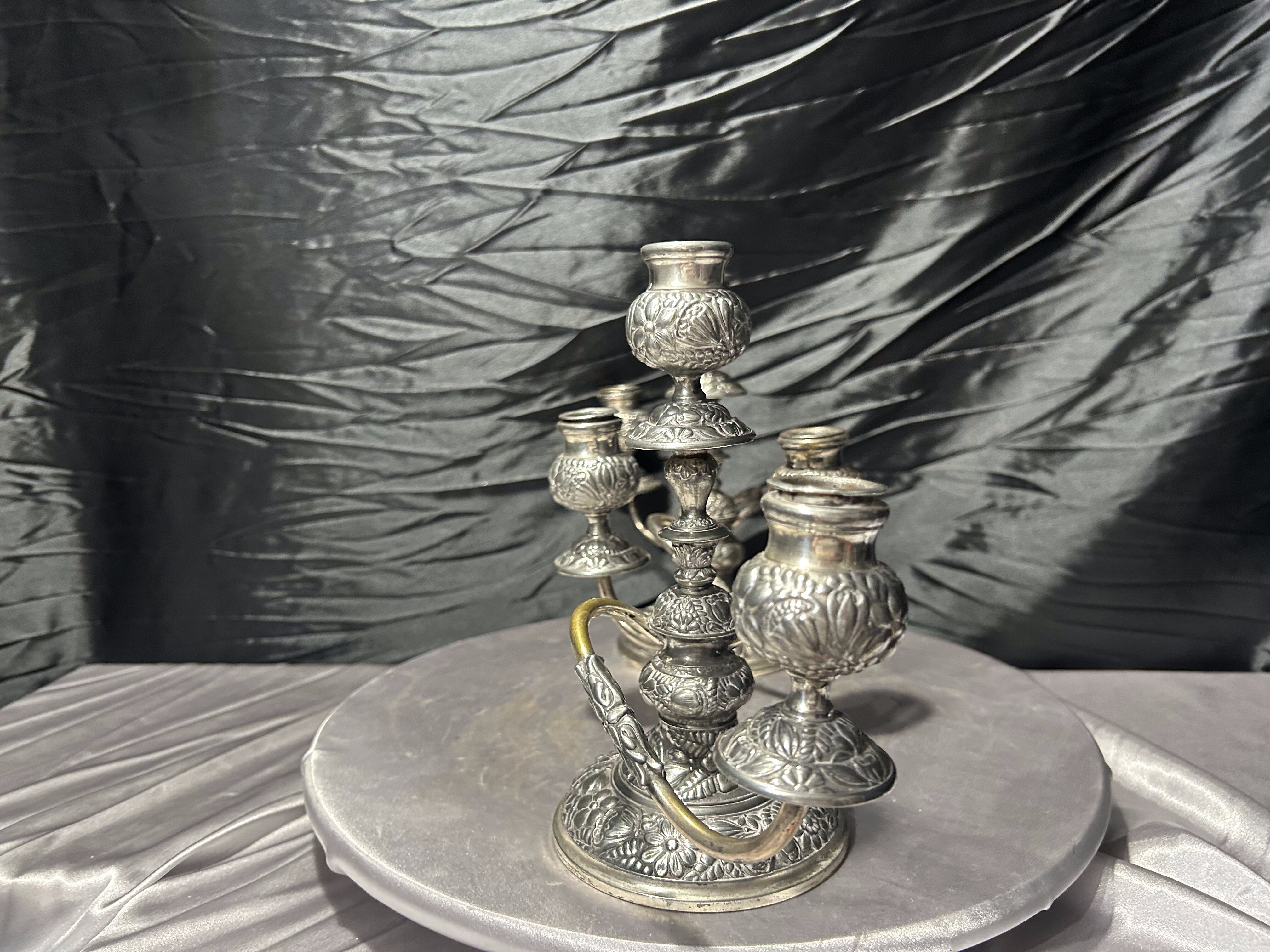 Efektowny zestaw dwóch posrebrzanych świeczników dwuramiennych, każdy przeznaczony na trzy świece – dwie boczne oraz jedną centralną. Świeczniki utrzymane są w klasycznym, dekoracyjnym stylu, z bardzo bogatą ornamentyką roślinną widoczną na podstawach, trzonach oraz czaszach.